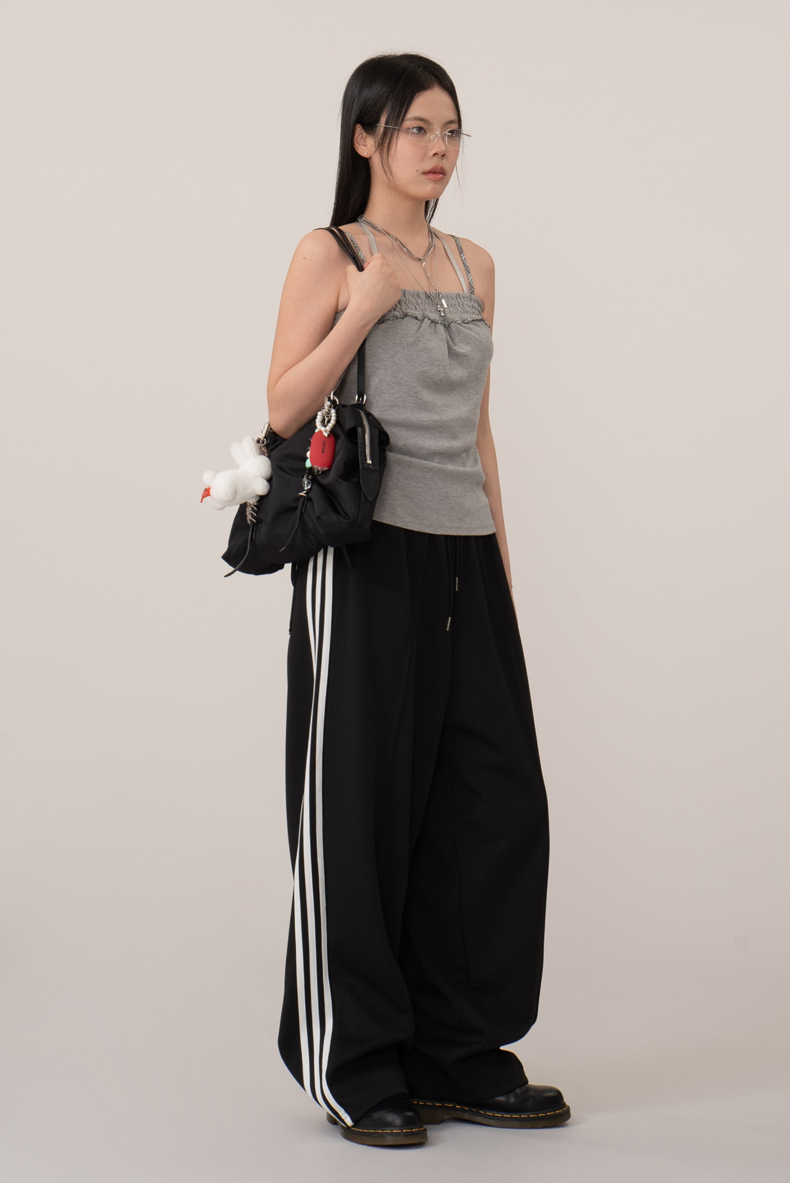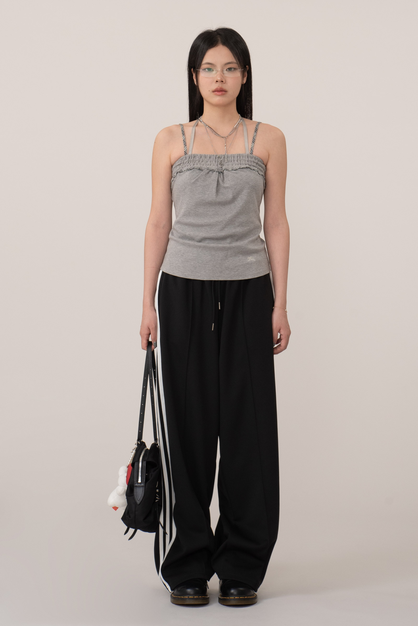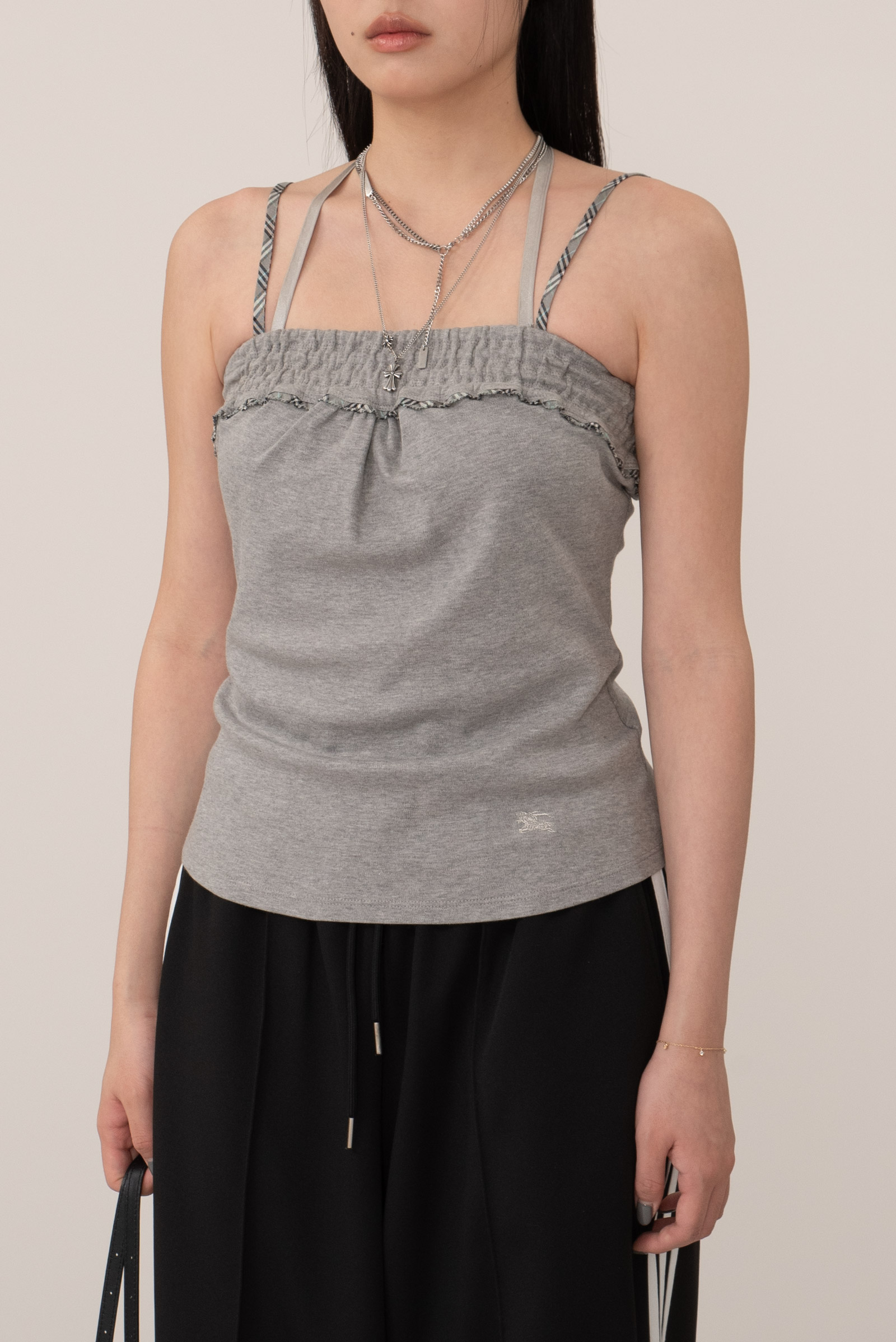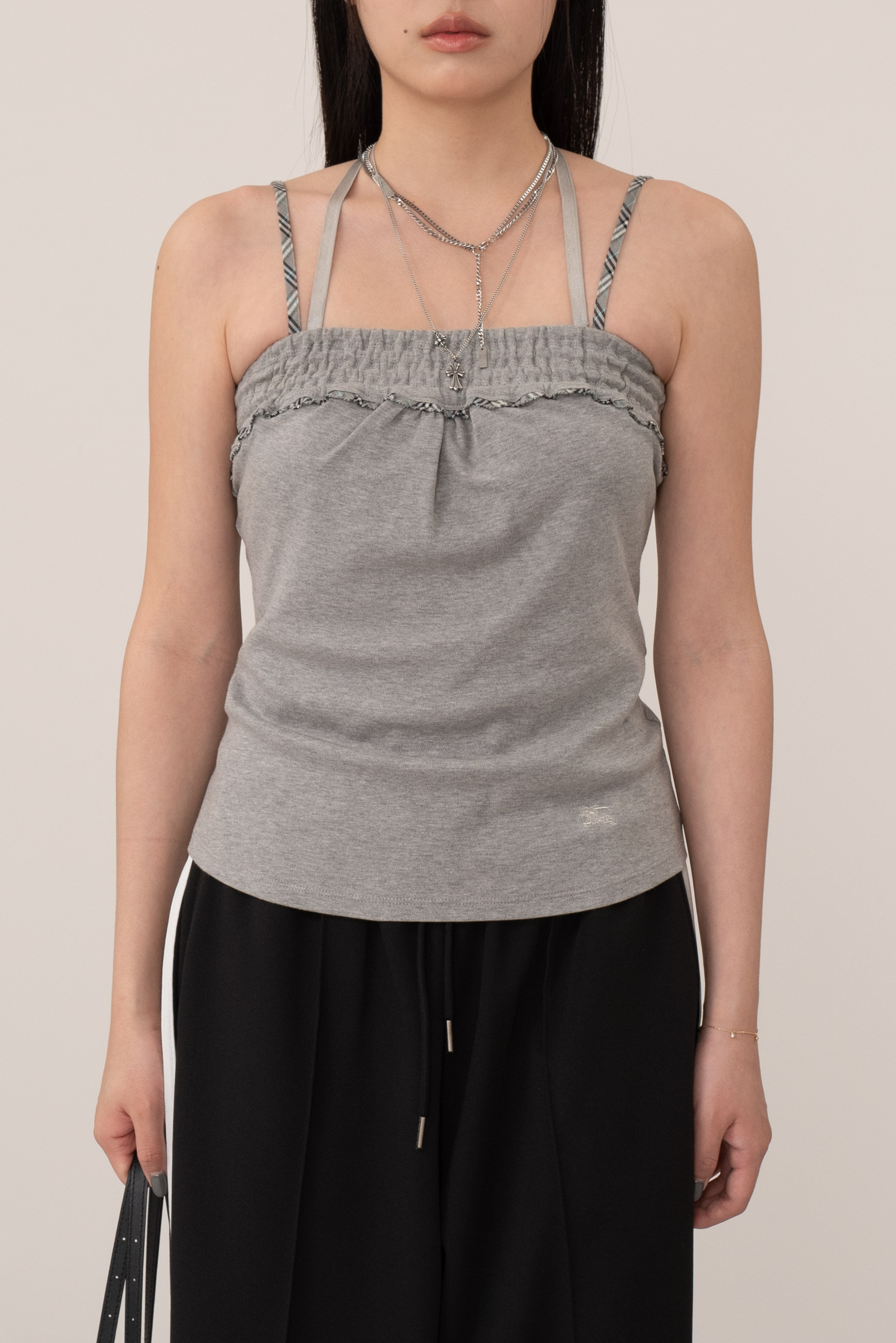 매트한 회색 멜란지 톤으로 데일리 하면서 어깨끈과 상단 밴딩 라인에 버버리 체크가 미니멀한 디자인 속에서도 충분히 포인트 되네요.