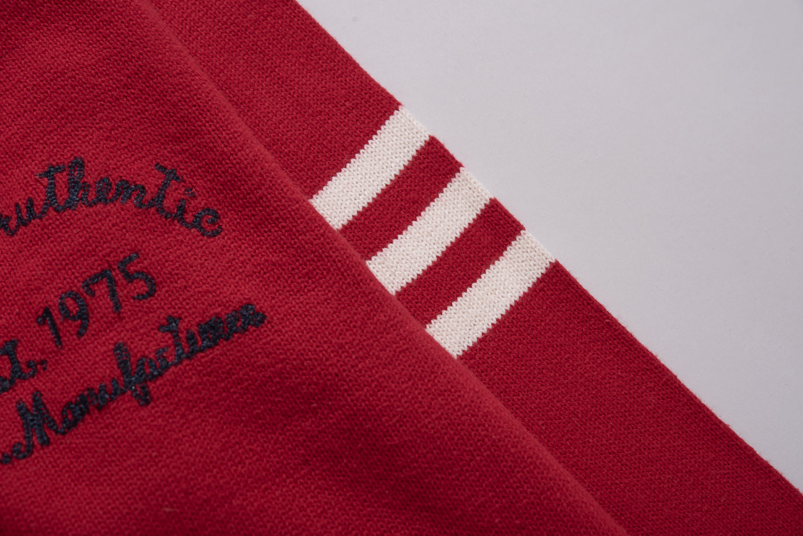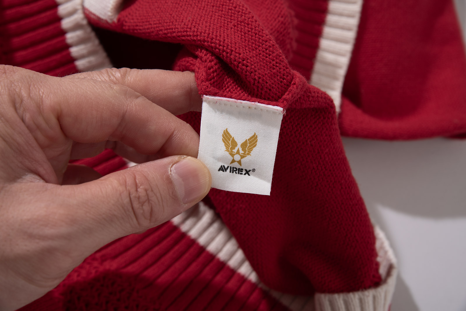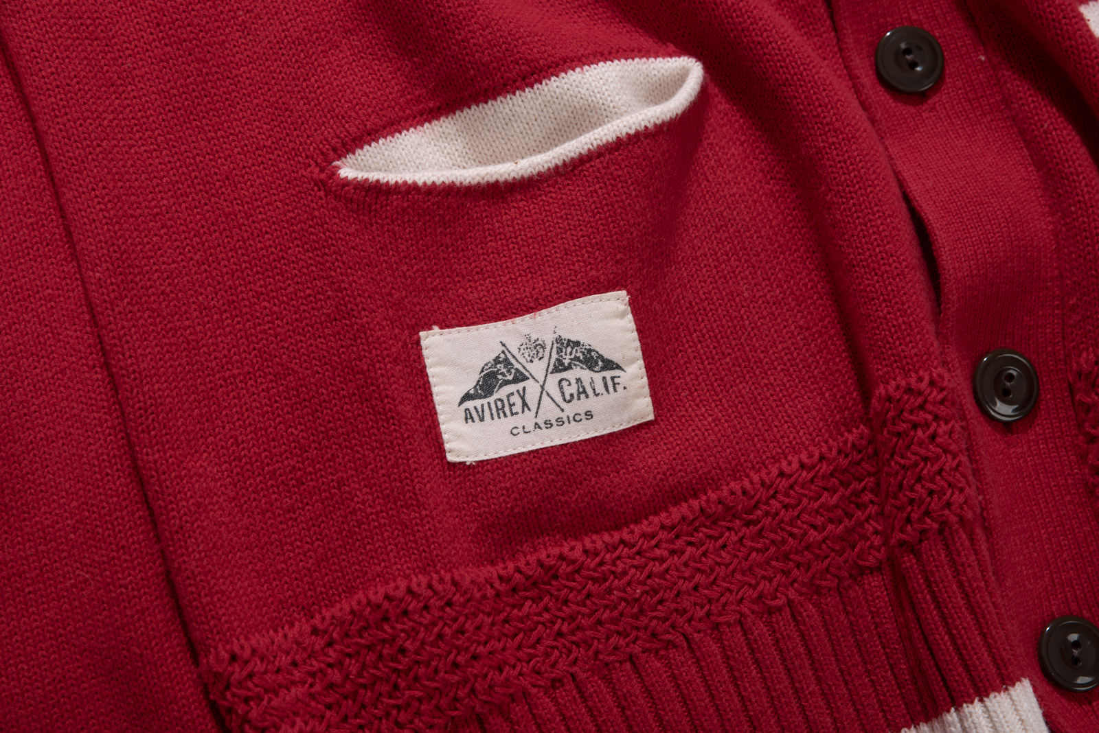 V넥 가디건 실루엣으로 베이직하면서도 클래식한 아이비리그 풍, 가슴에는 아비렉스 어센틱 어쩌구 자수가 브랜드의 헤리티지를 보여주고 있어요.