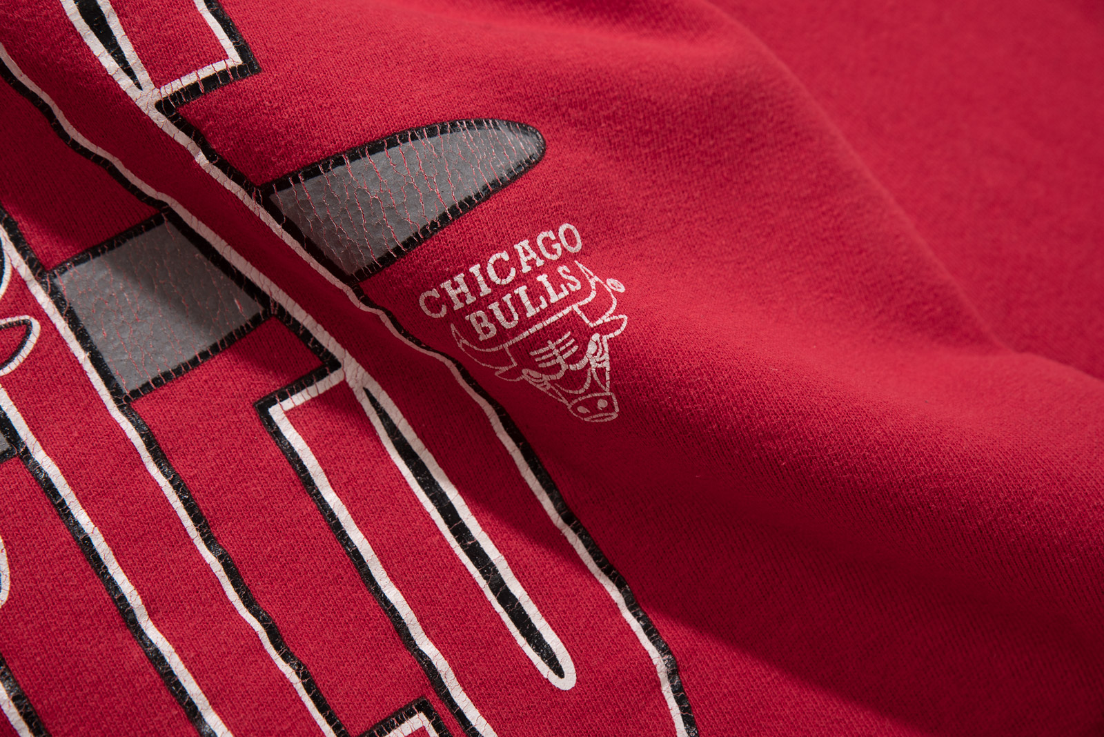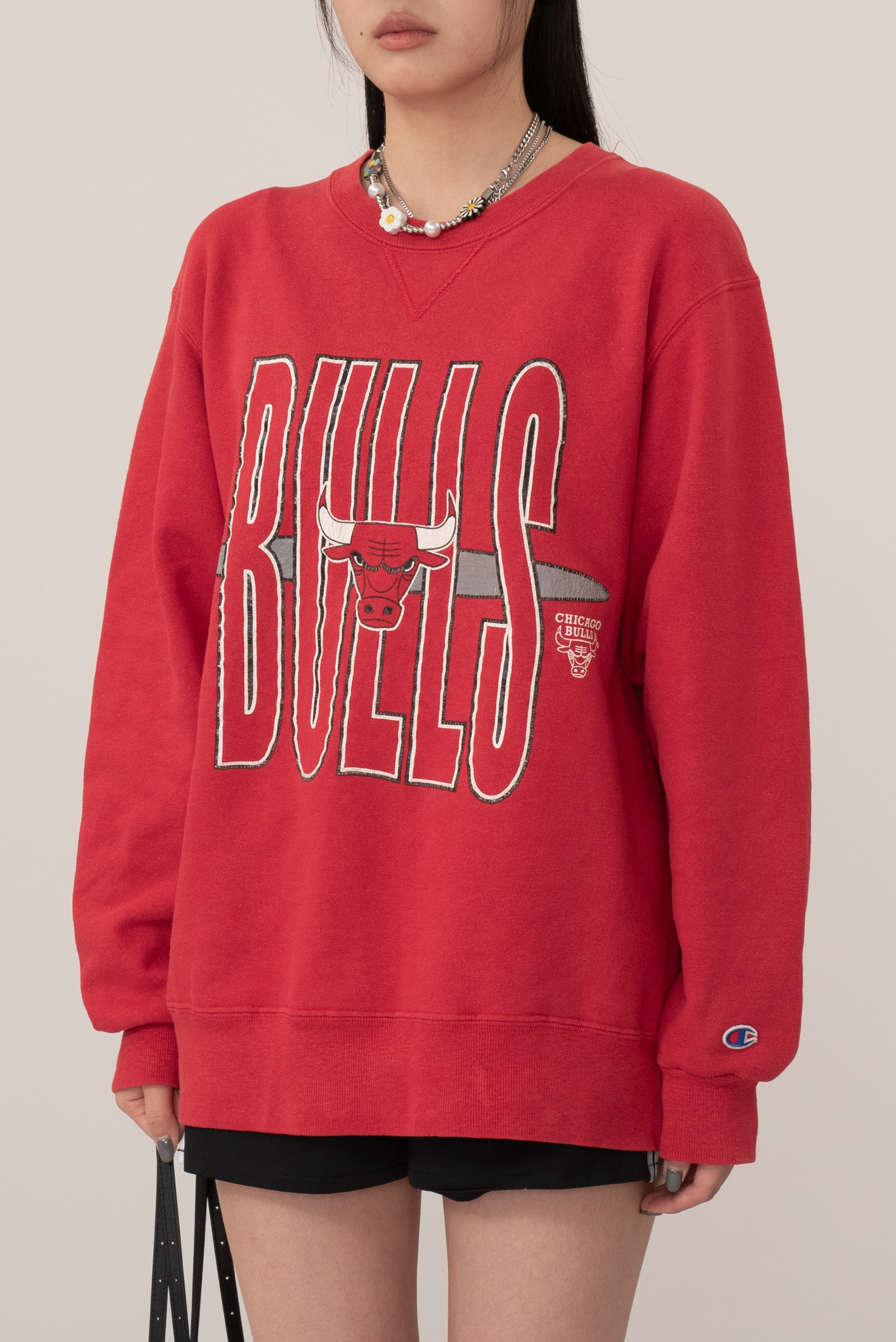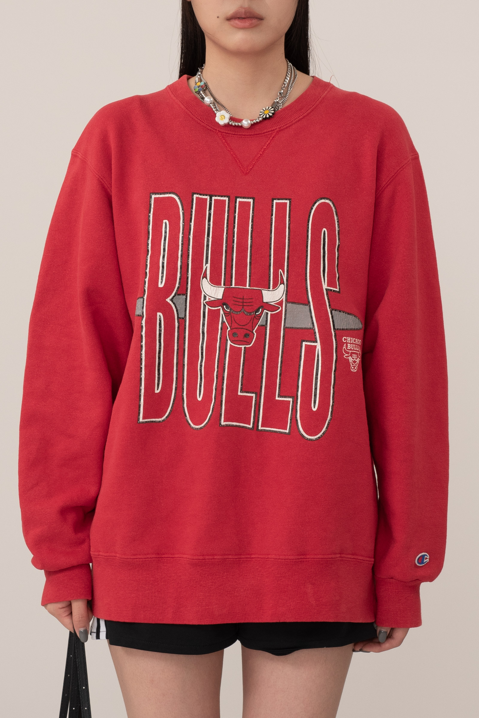 세월이 만들어낸 깊은 무드가 인상적이며 커다란 Bulls 프린트와 빈티지 챔피온의 블루 택,