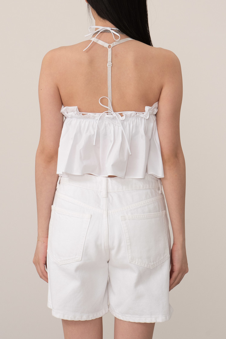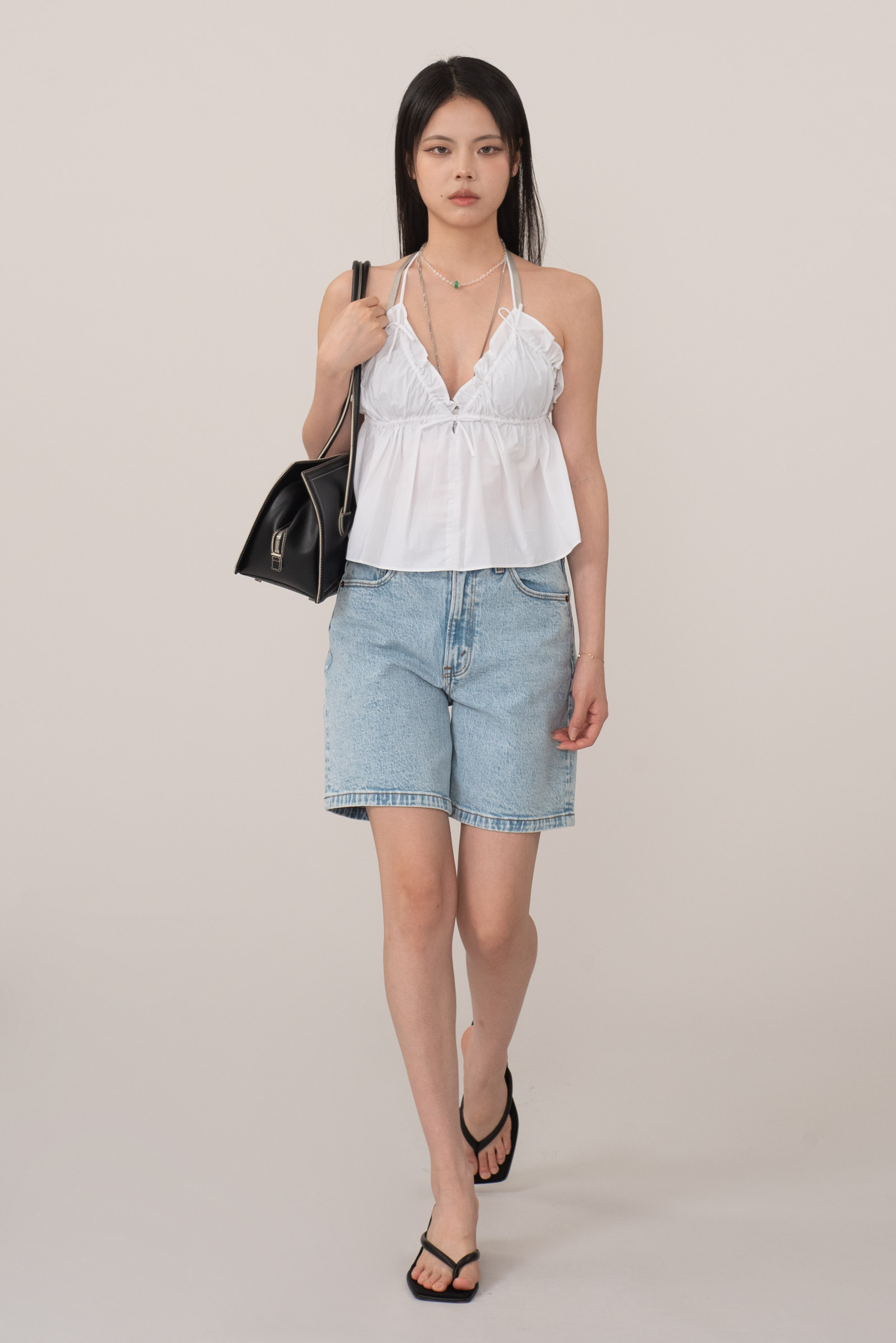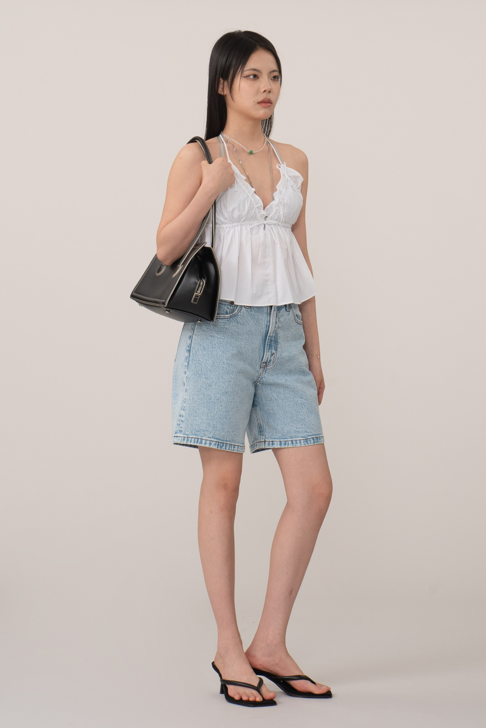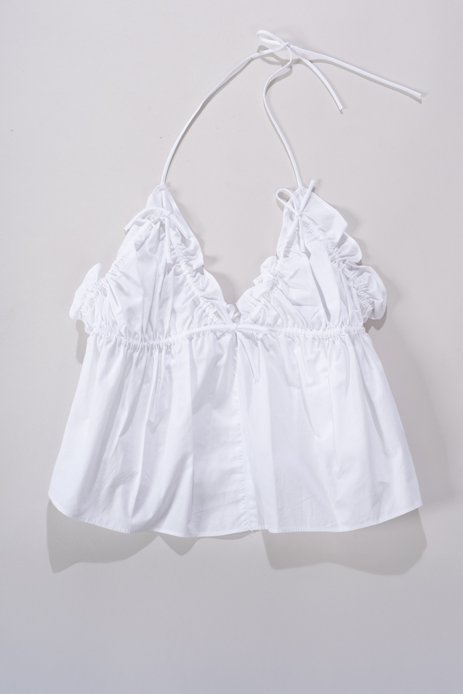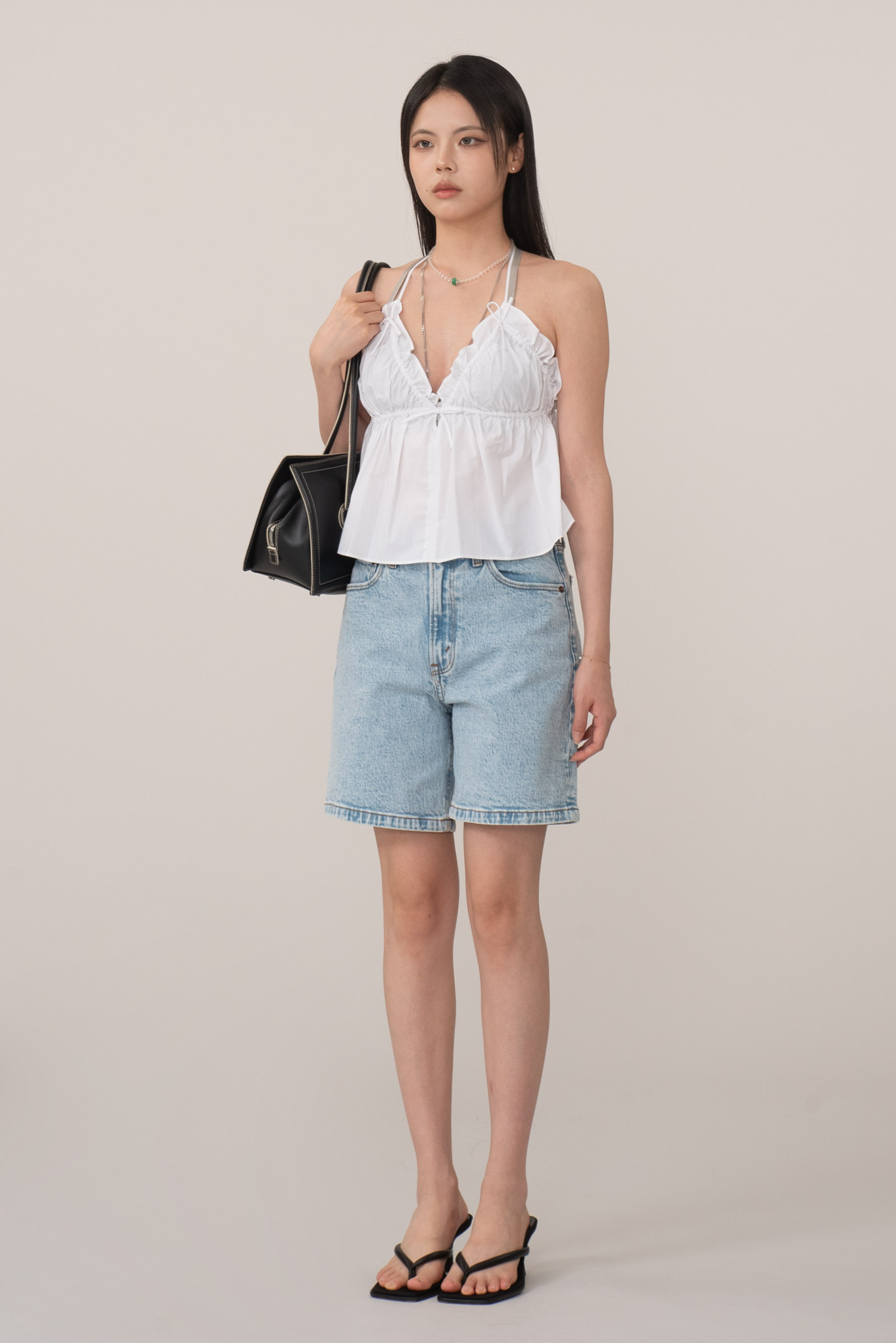 깊은 딥 브이 라인과 사랑스러운 셔링, 레이스 디테일이 눈에 띄며 가볍고 드라이한 코튼 소재라 볼륨감이 살아있는 것이 특징이에요.