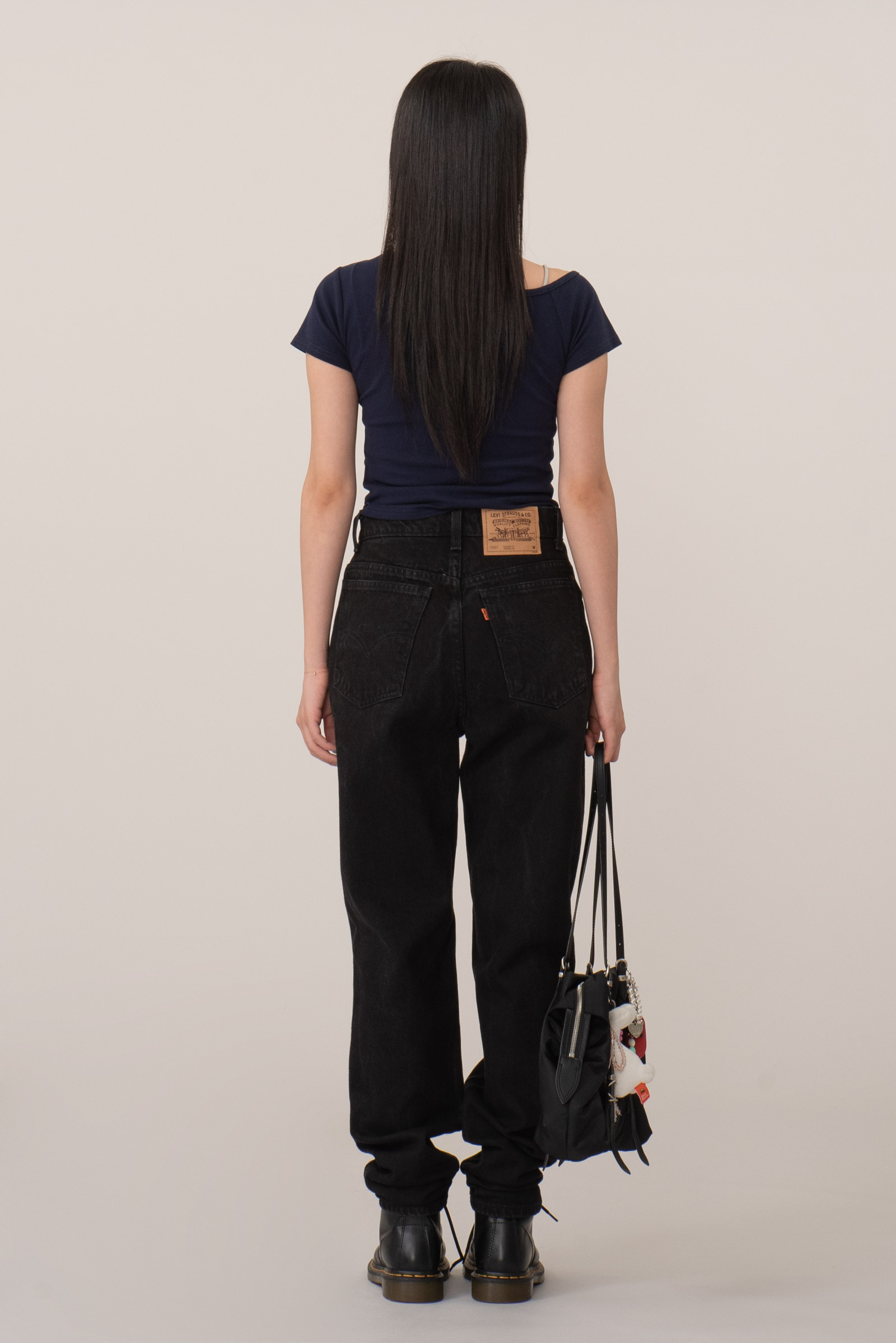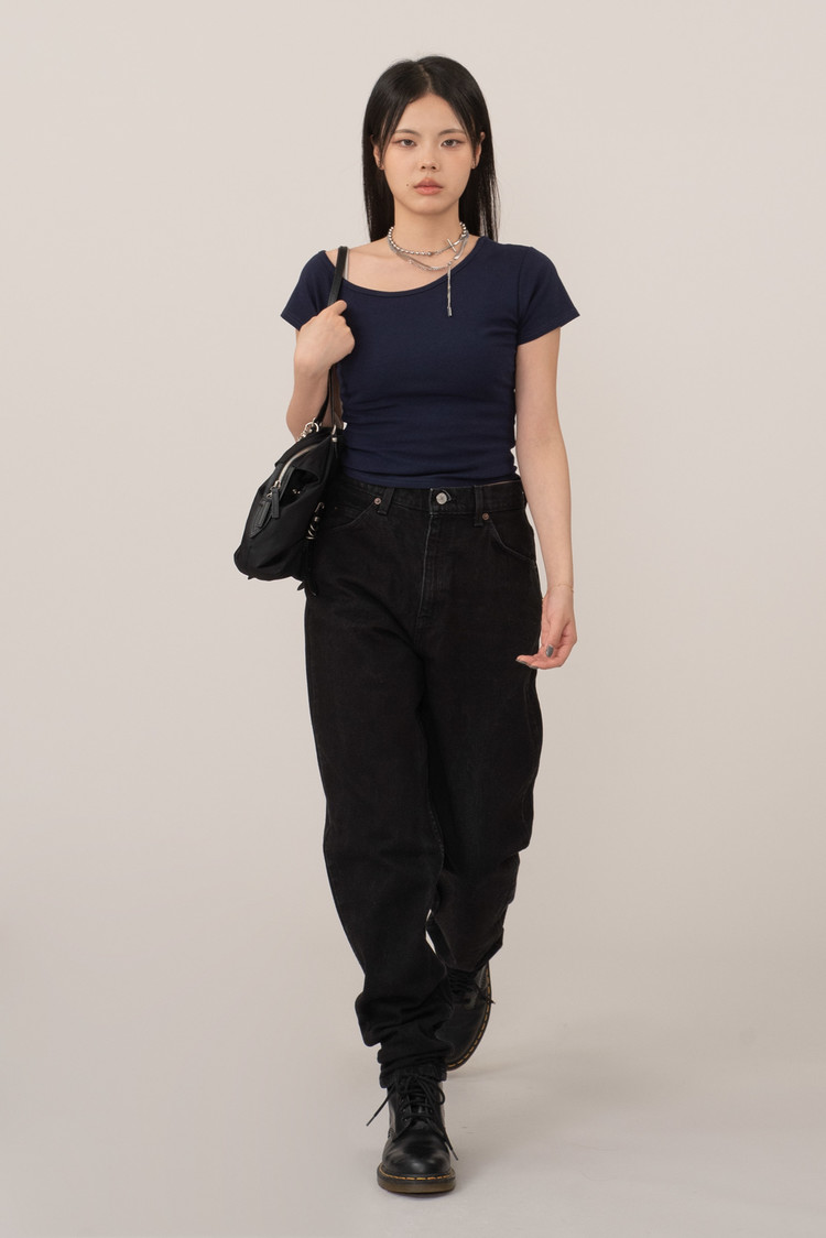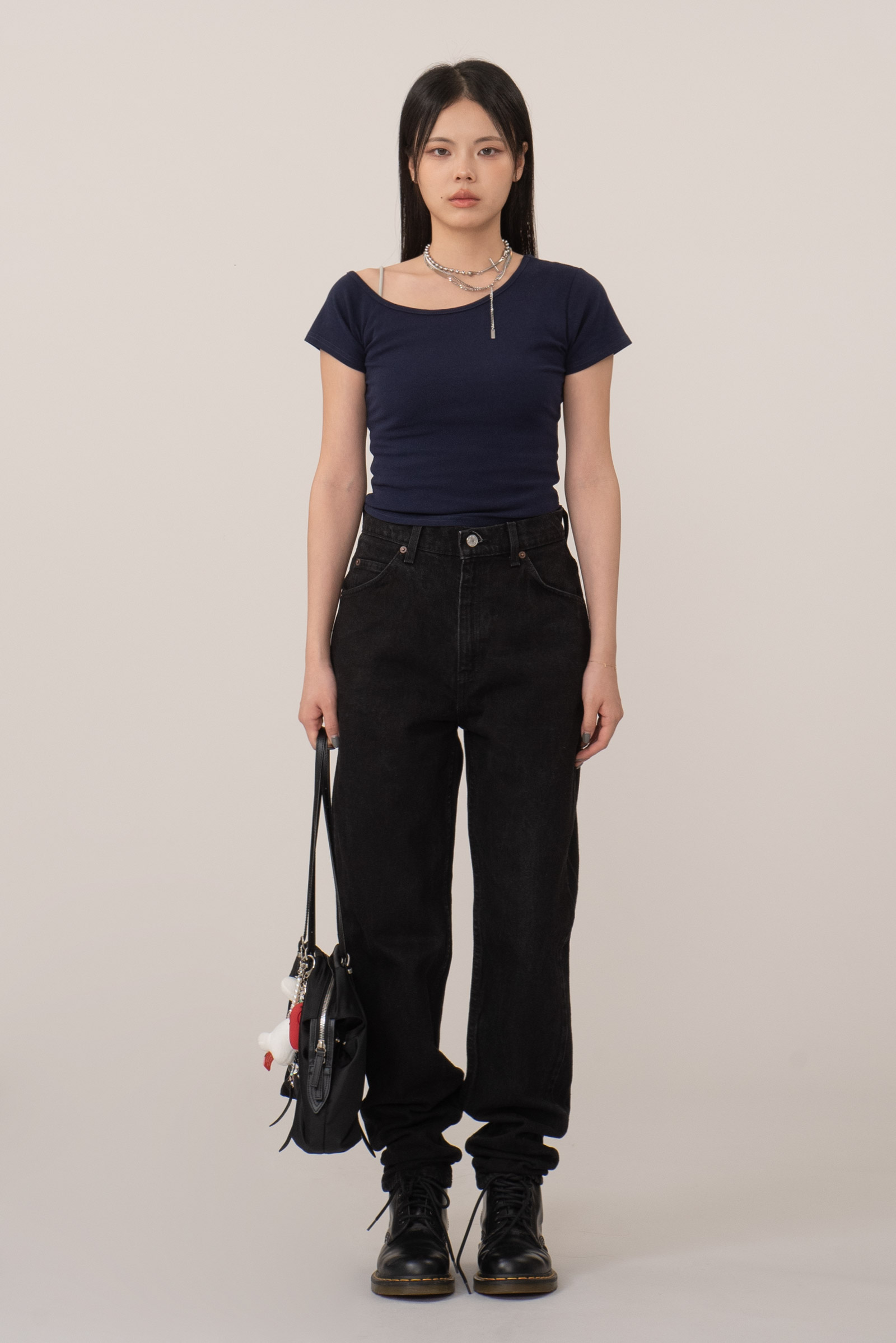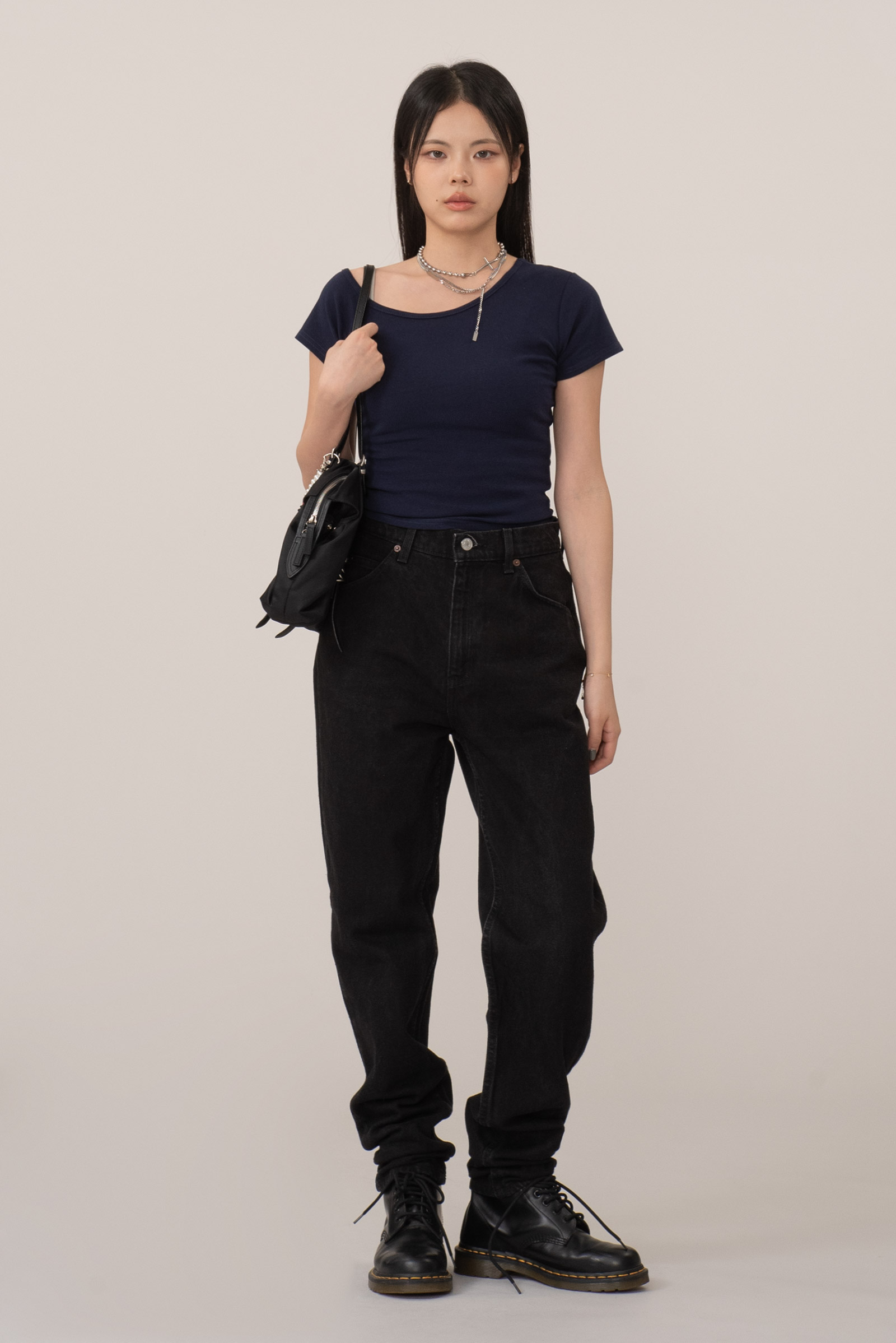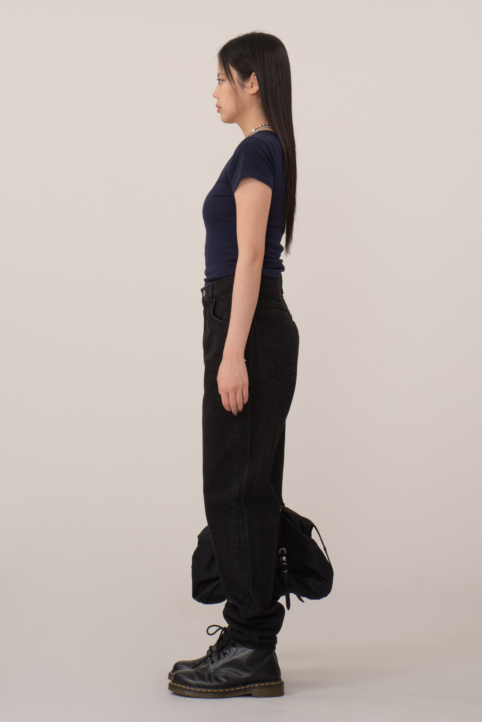 하이웨이스트 실루엣, 허리 라인과 골반 라인을 안정적으로 잡아주며 워크 부츠, 닥터마틴류와 매칭 시 그런지, 유스 감성 연출이 가능해요.