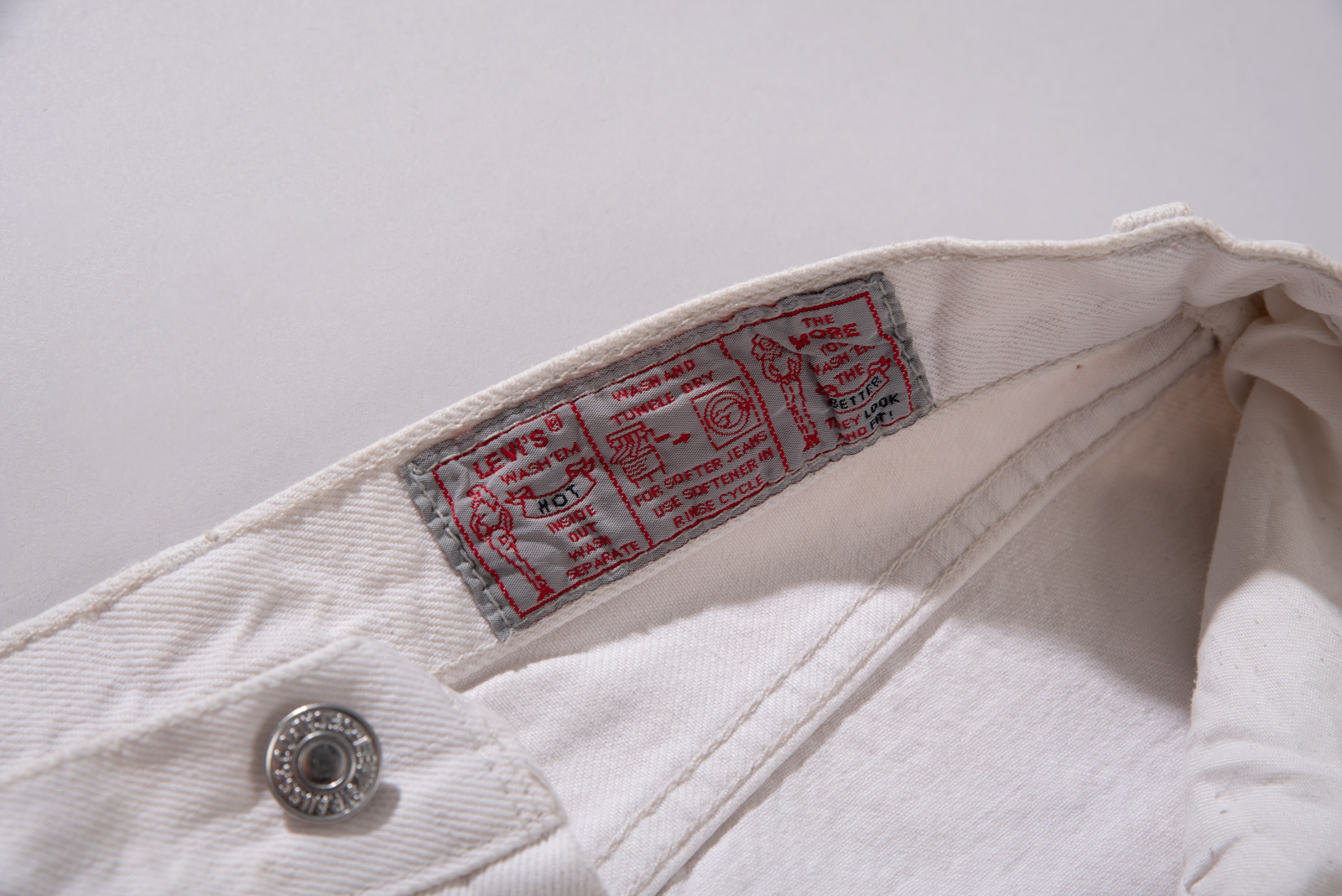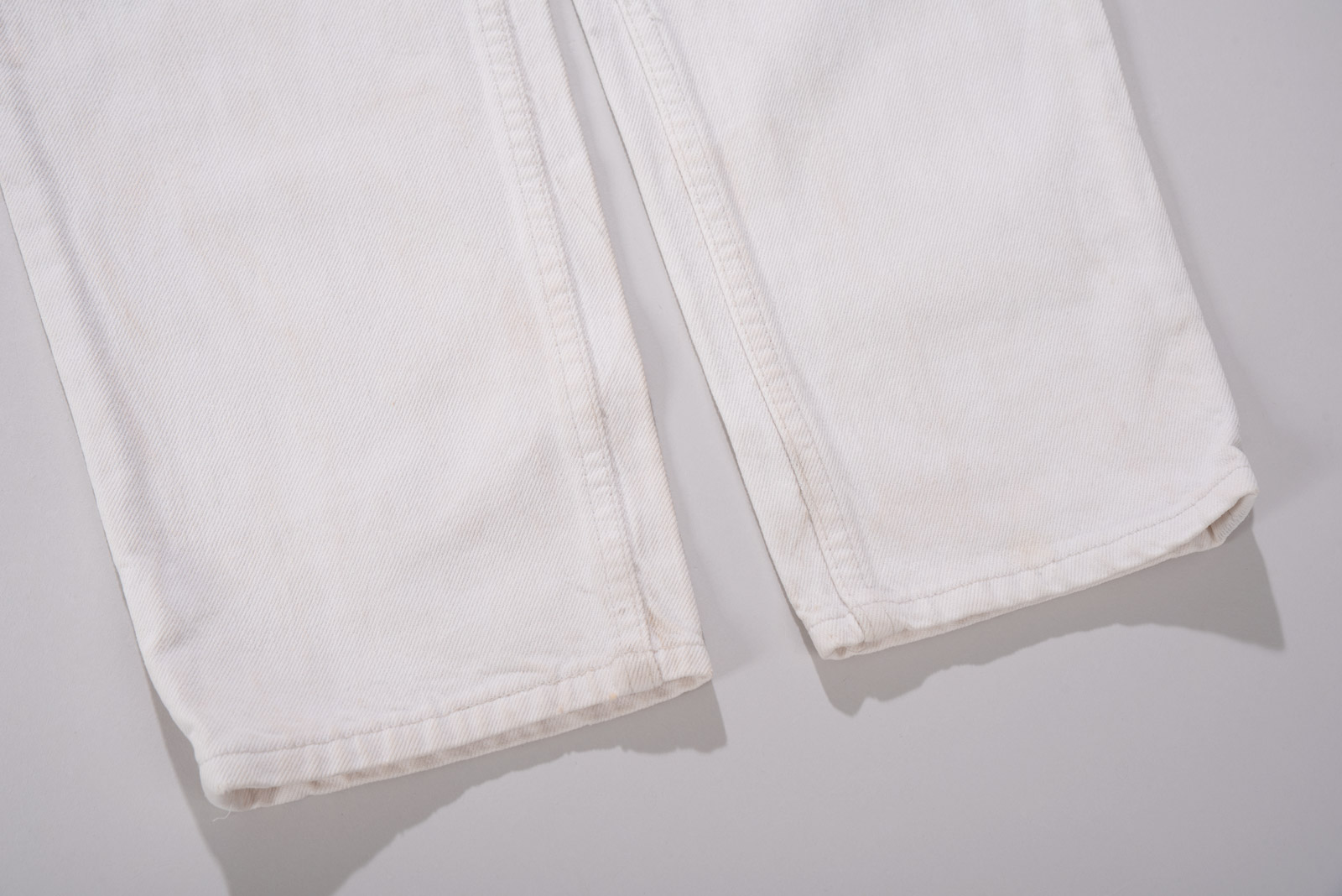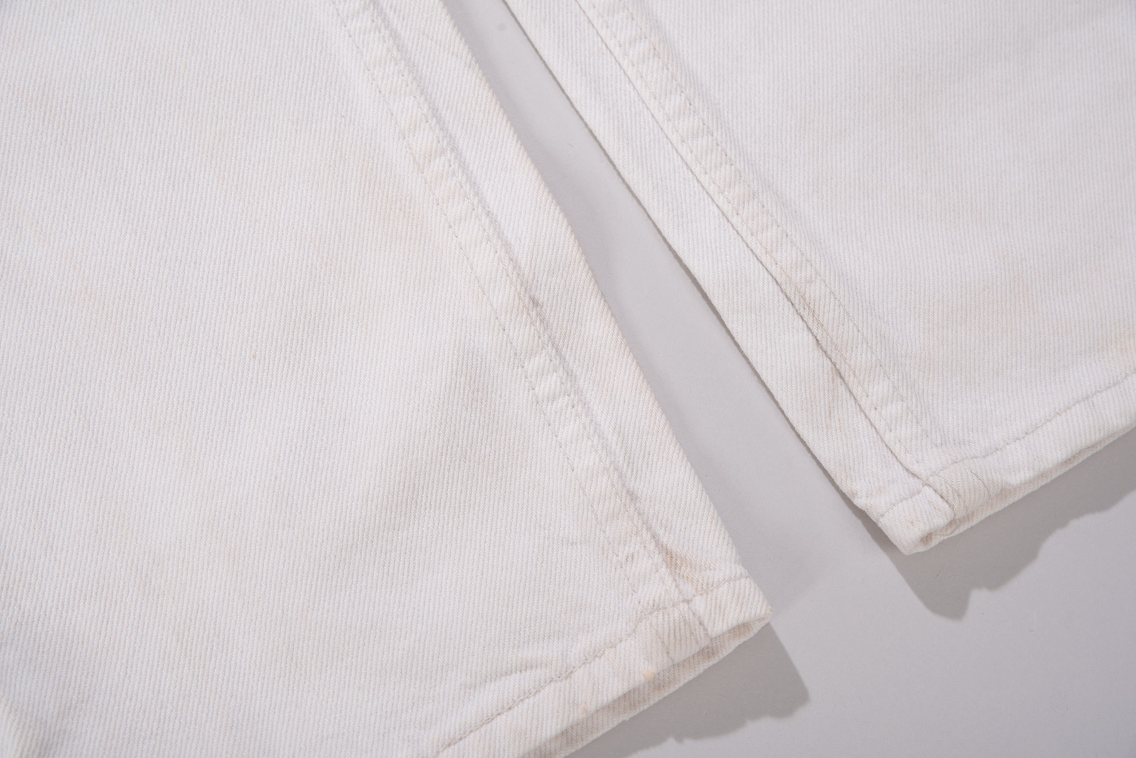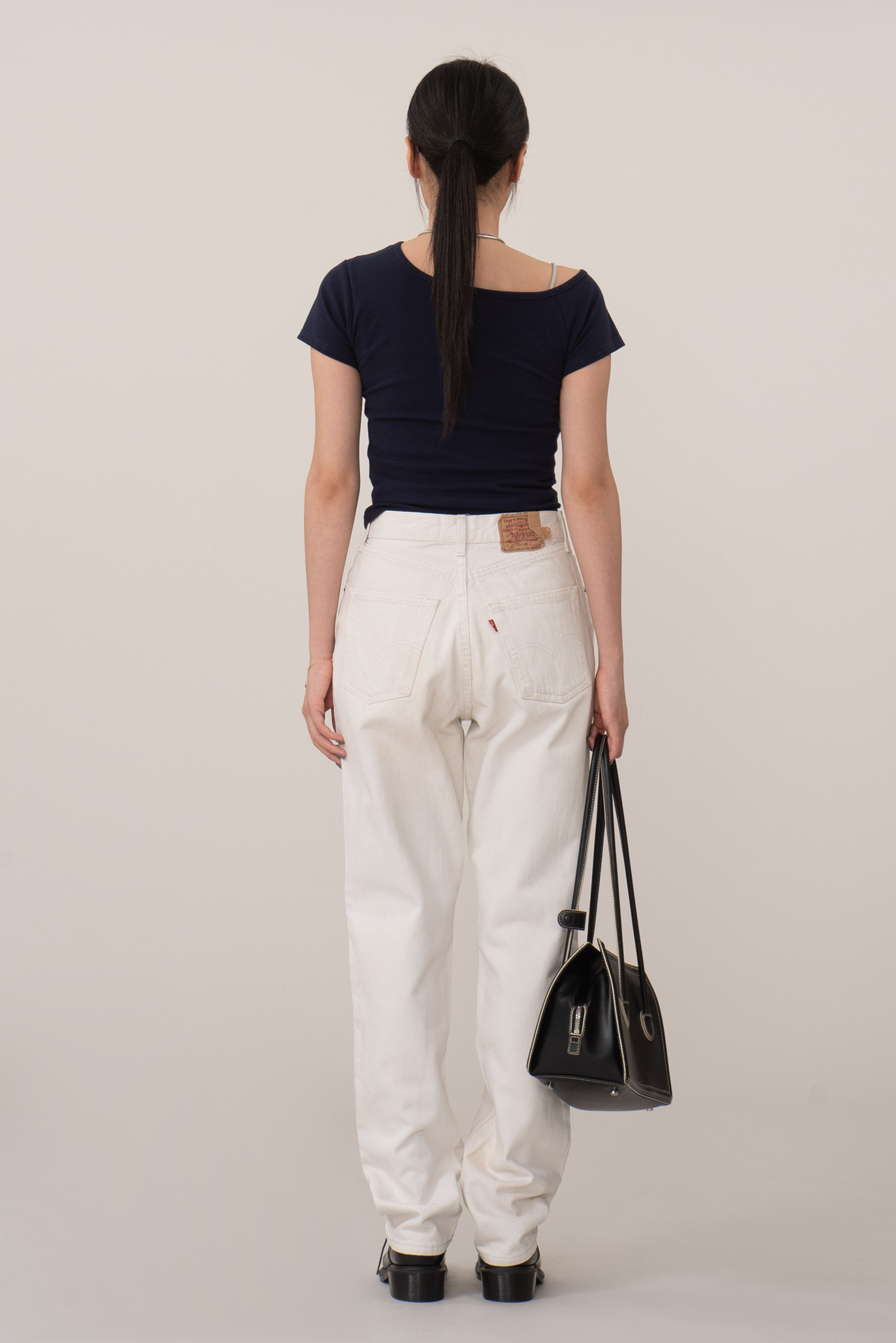 501과 같은 버튼 플라이, 허리 선이 높고 힙이 강조되는 실루엣이라 레그라인 역시 유려해 보이는 효과가 있고 귀합 화이트 컬러 데님이라 희소성까지.