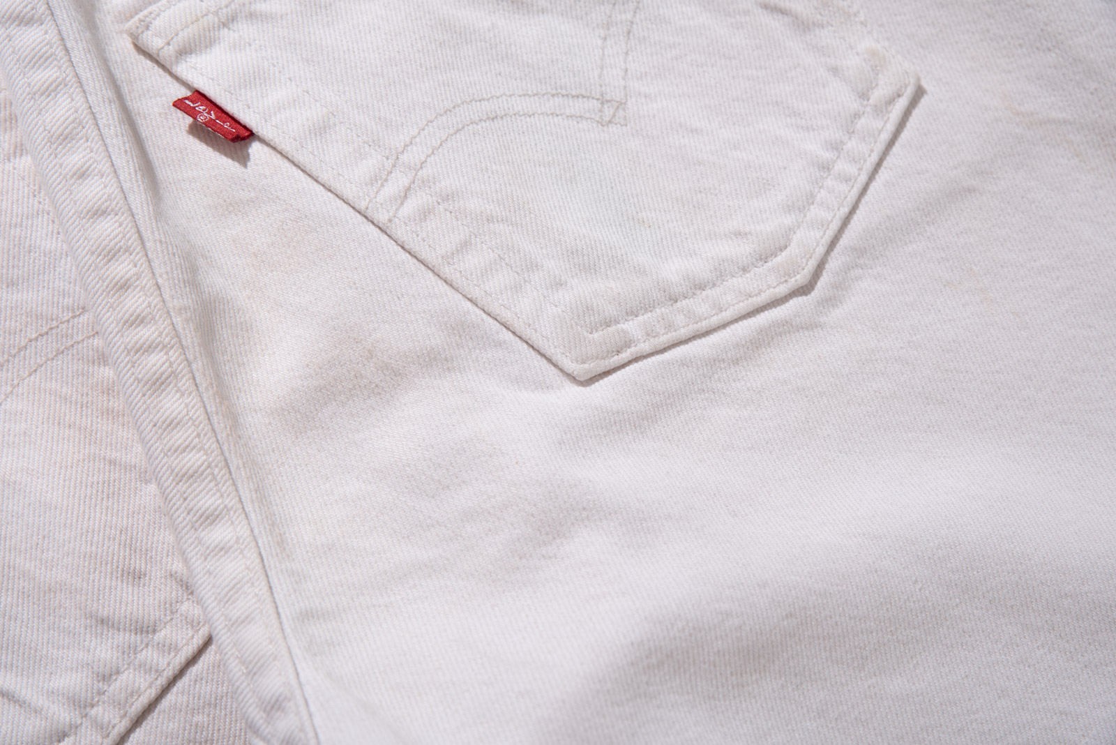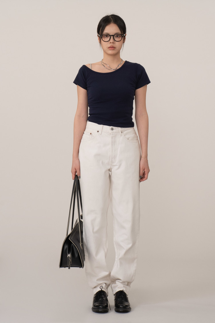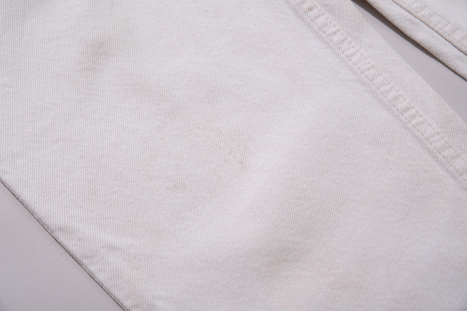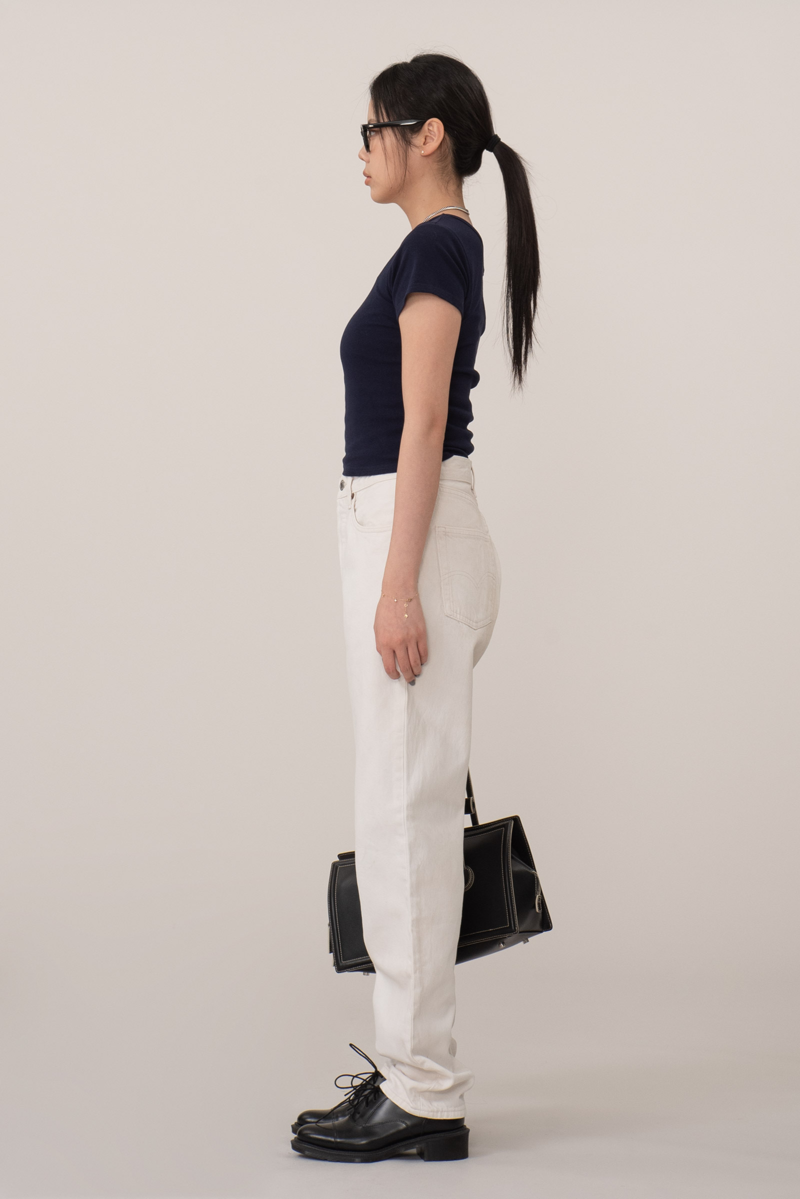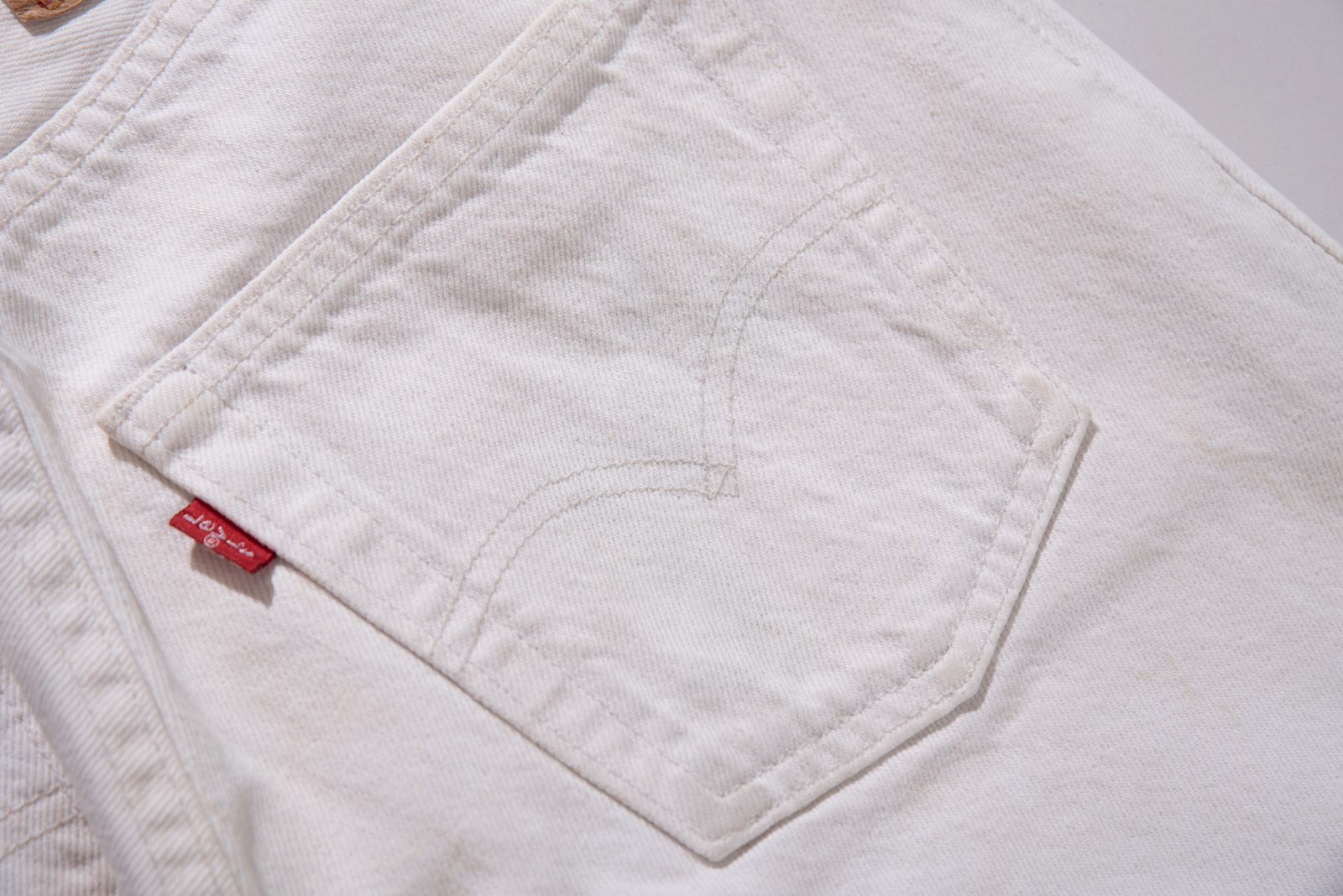 501과 같은 버튼 플라이, 허리 선이 높고 힙이 강조되는 실루엣이라 레그라인 역시 유려해 보이는 효과가 있고 귀합 화이트 컬러 데님이라 희소성까지.