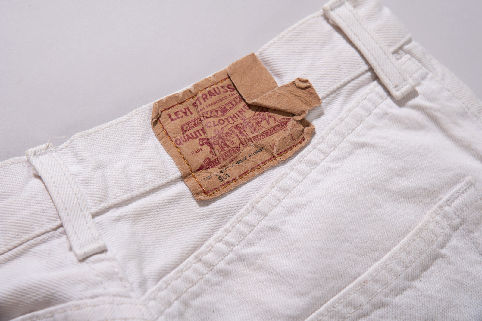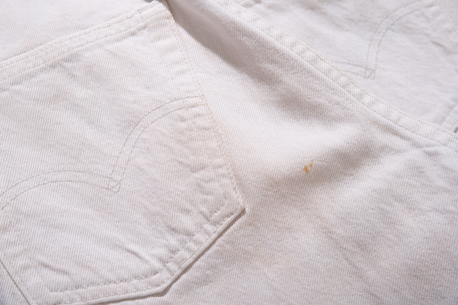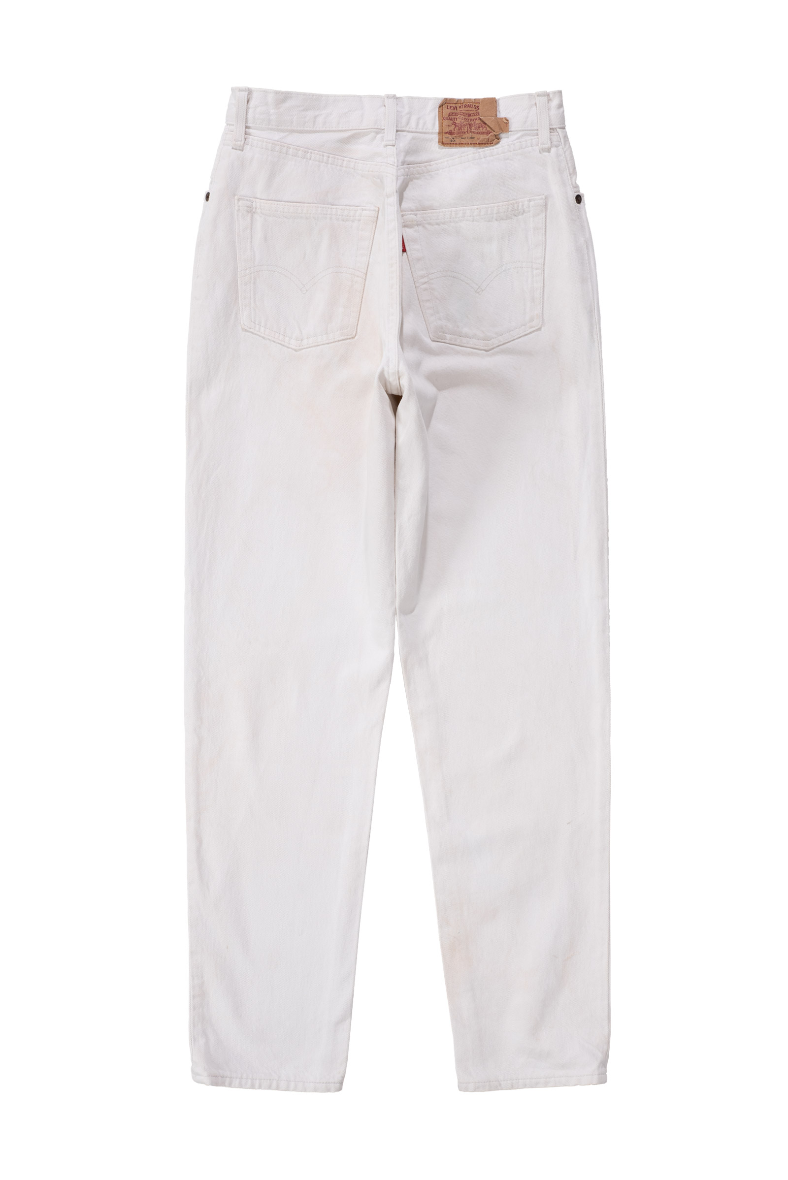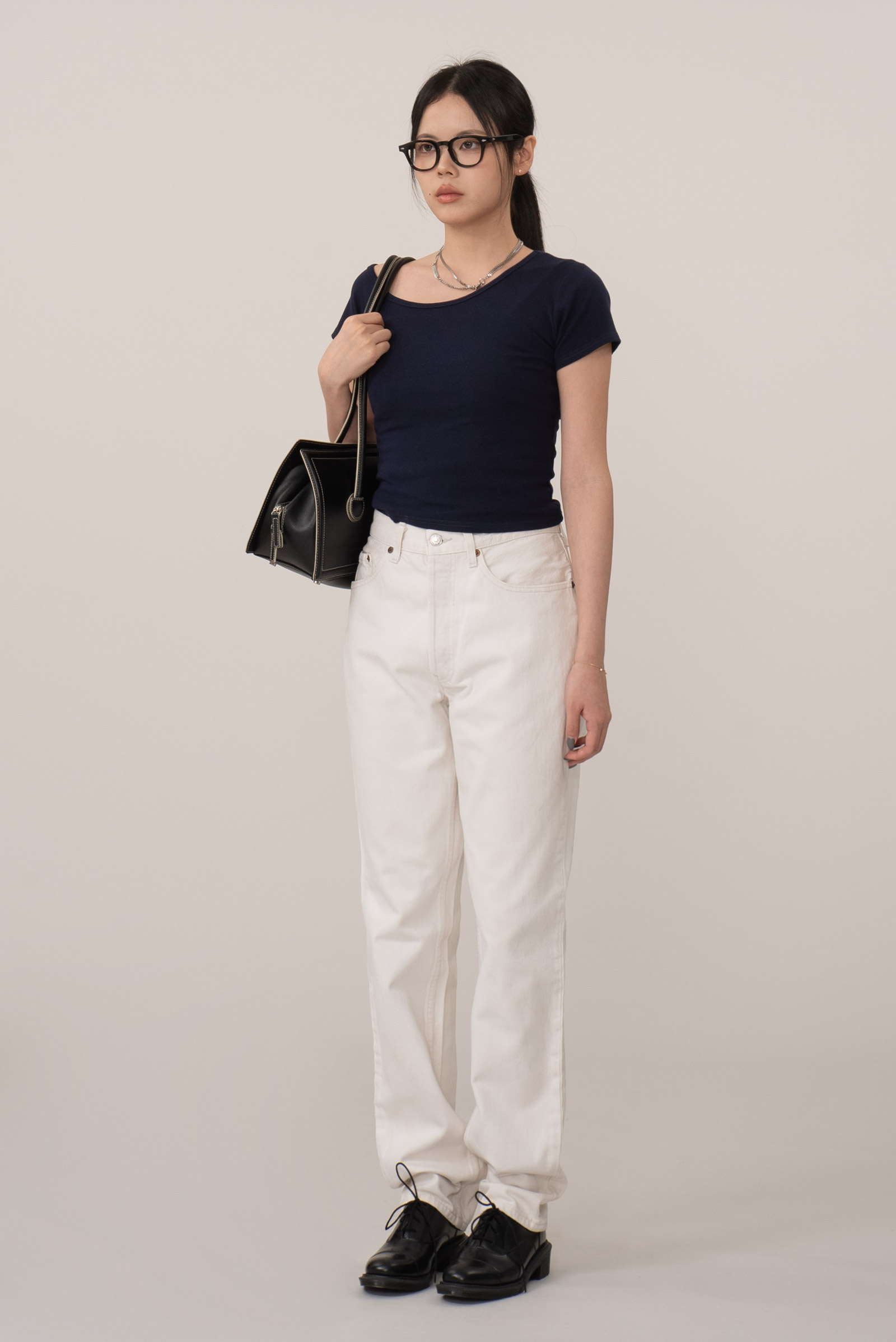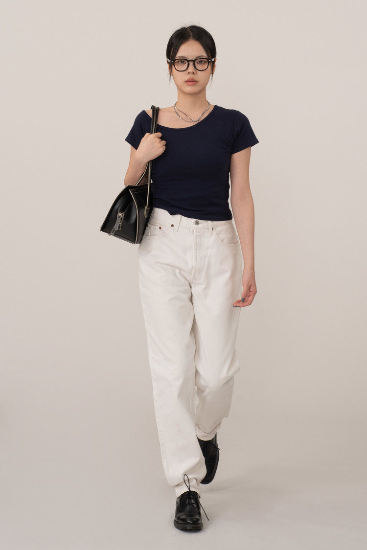 501과 같은 버튼 플라이, 허리 선이 높고 힙이 강조되는 실루엣이라 레그라인 역시 유려해 보이는 효과가 있고 귀합 화이트 컬러 데님이라 희소성까지.