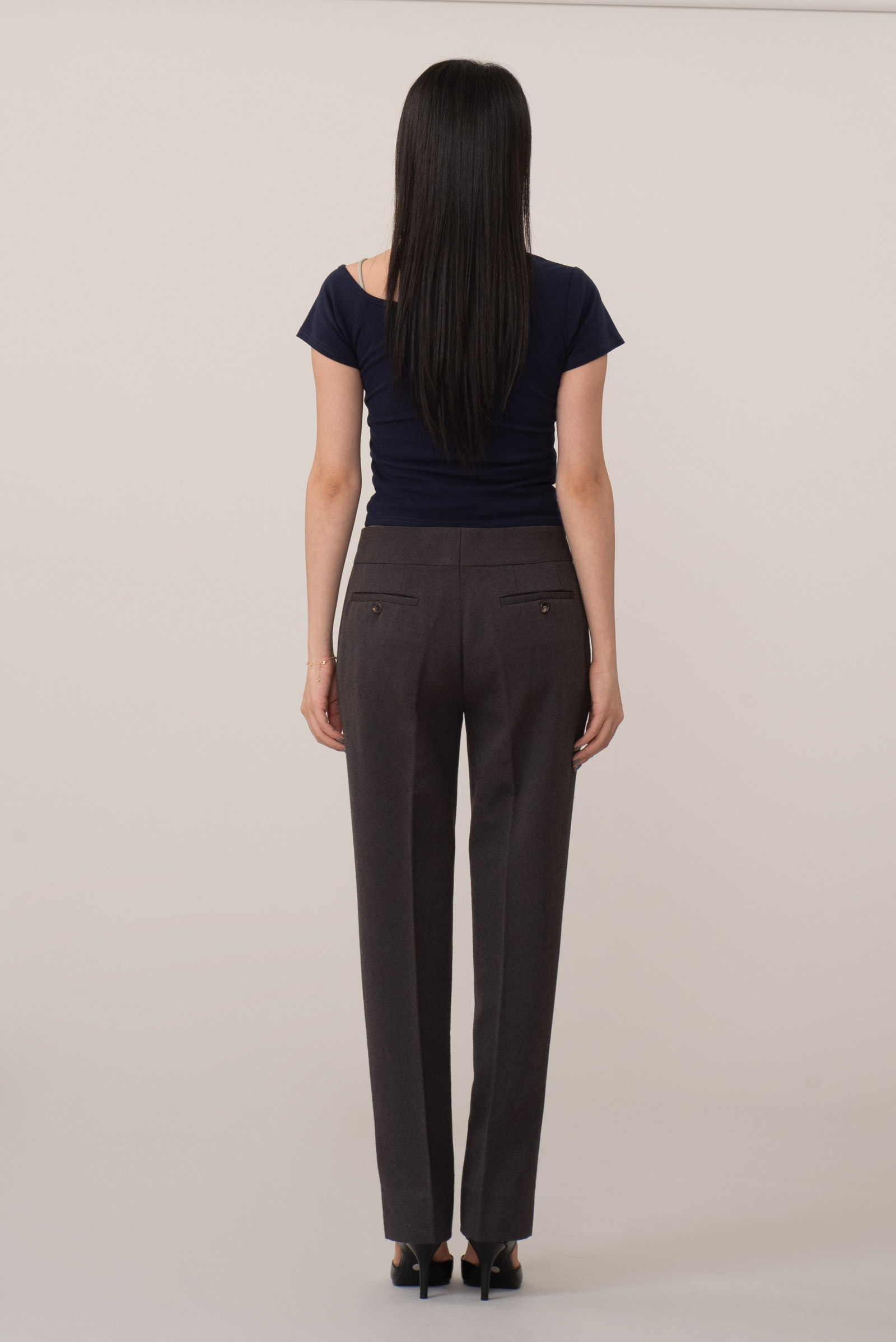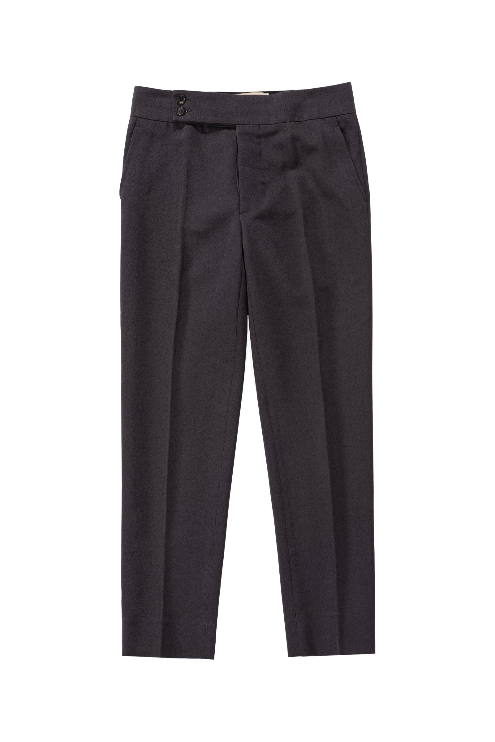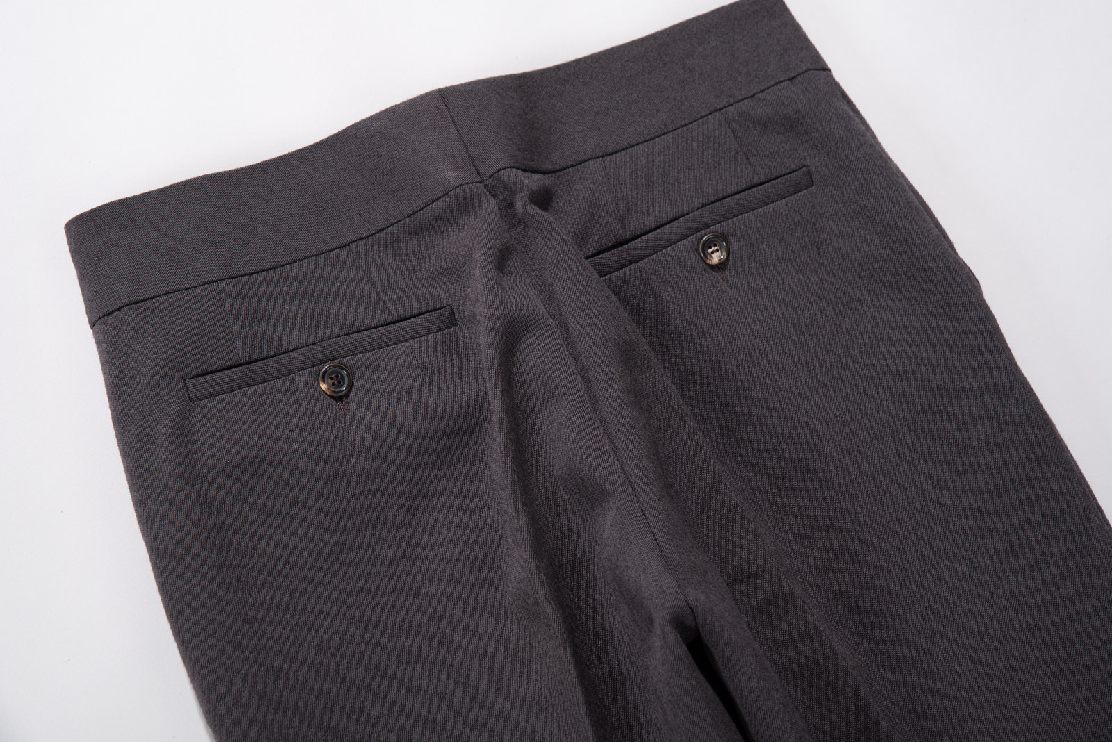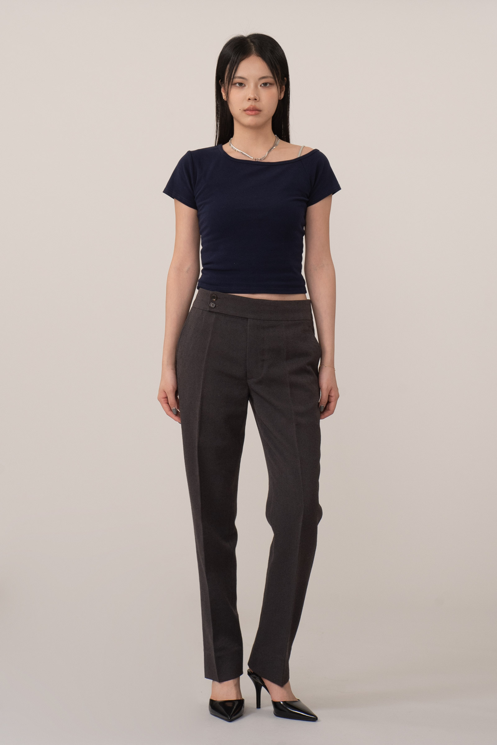 하이 웨이스트-미드 라이즈 중간 정도의 도회적인 허리선, 두 개의 사이드 버튼으로 미니멀한 여밈 디테일, 센터 크리즈가 선명해 즉각적인 슬림 효과까지.