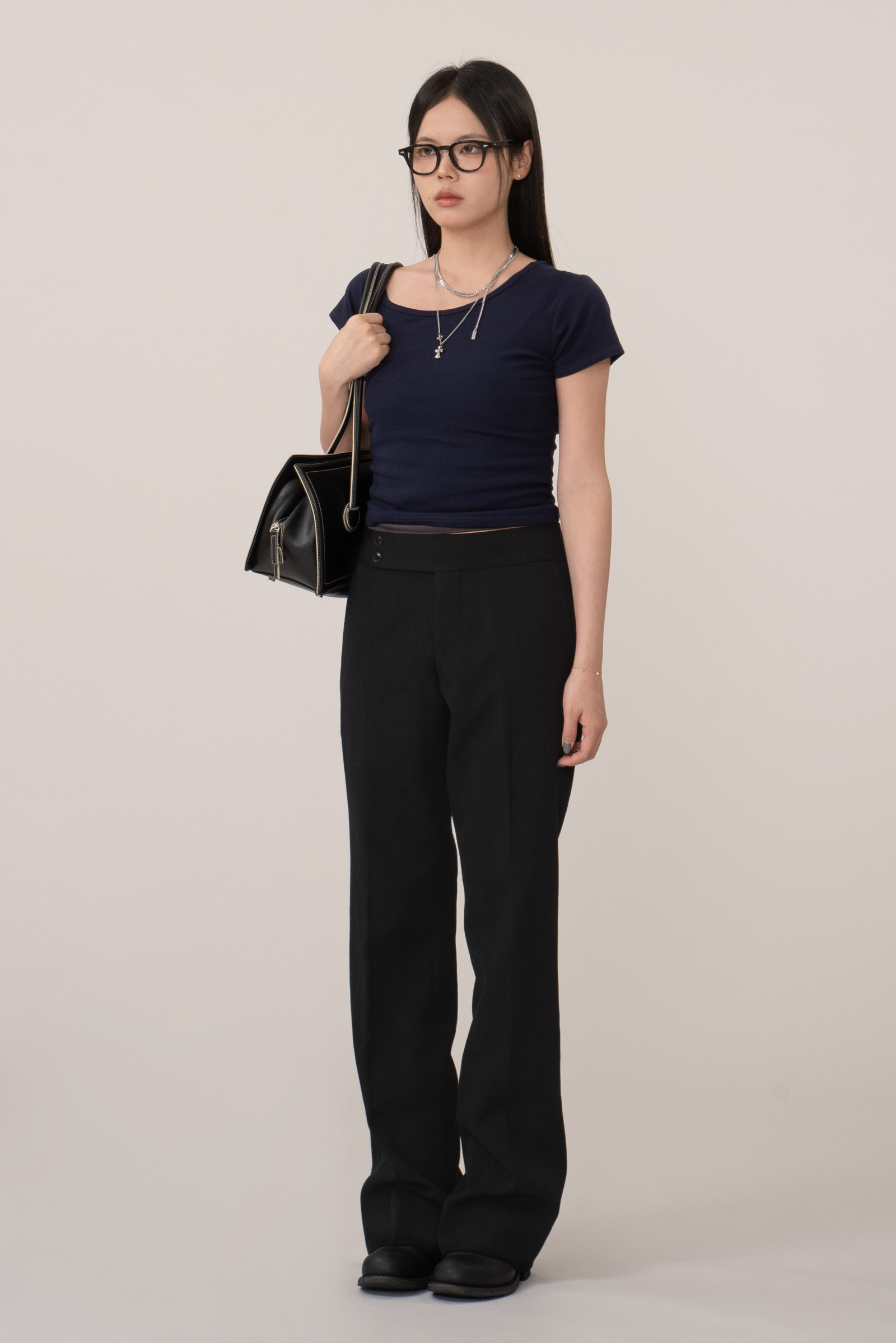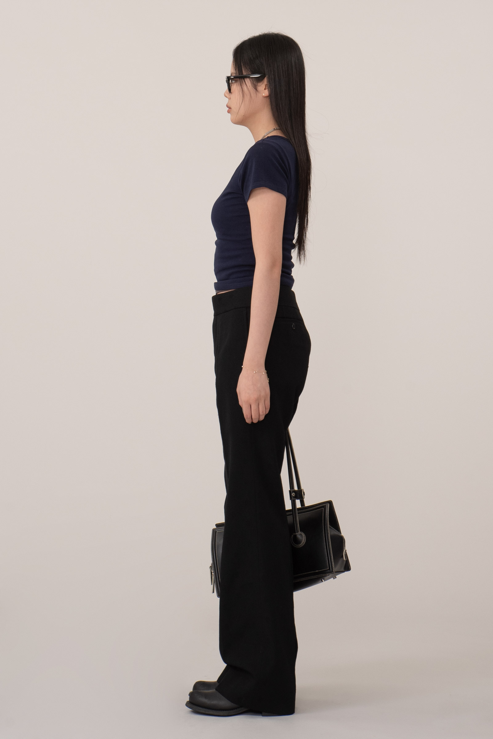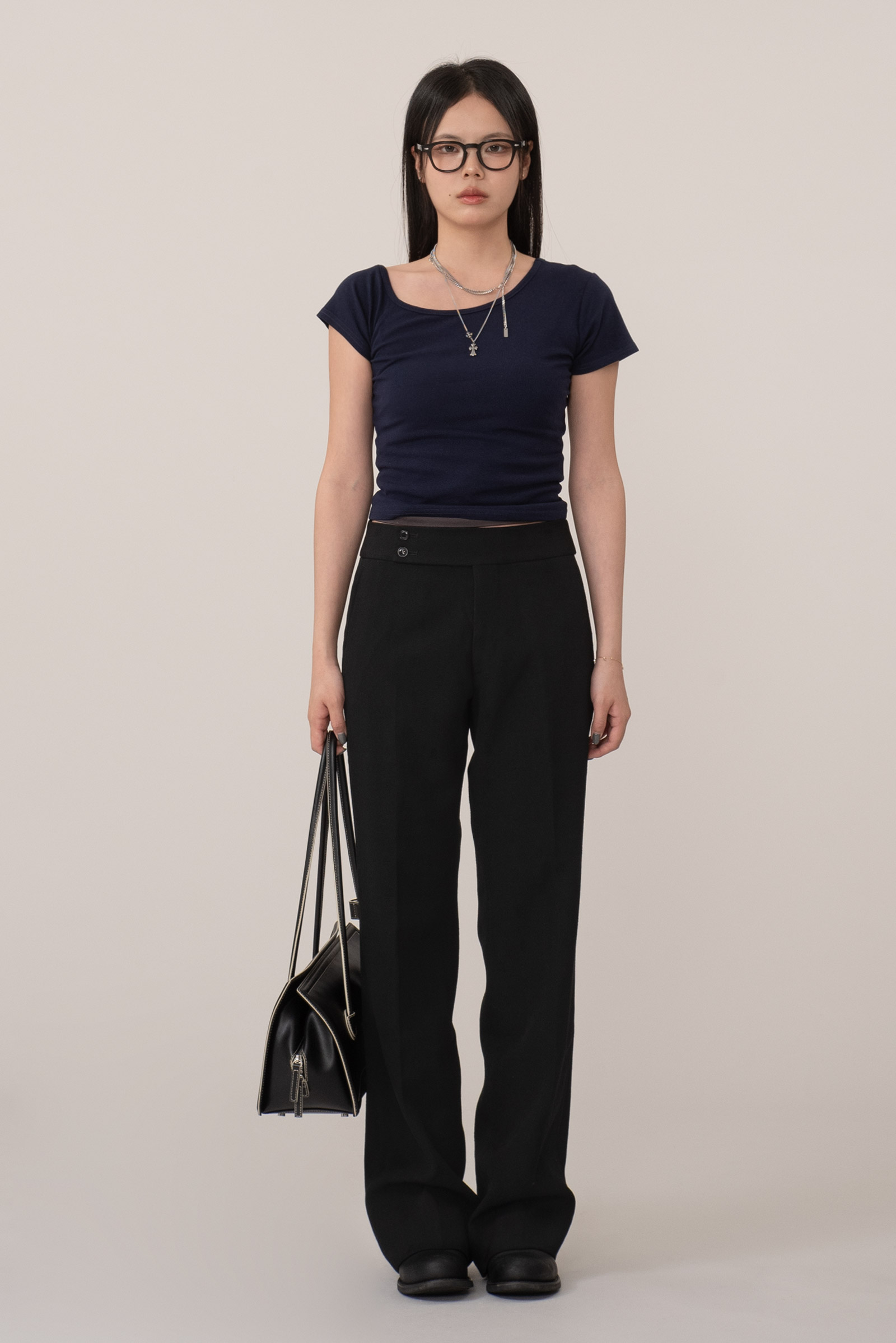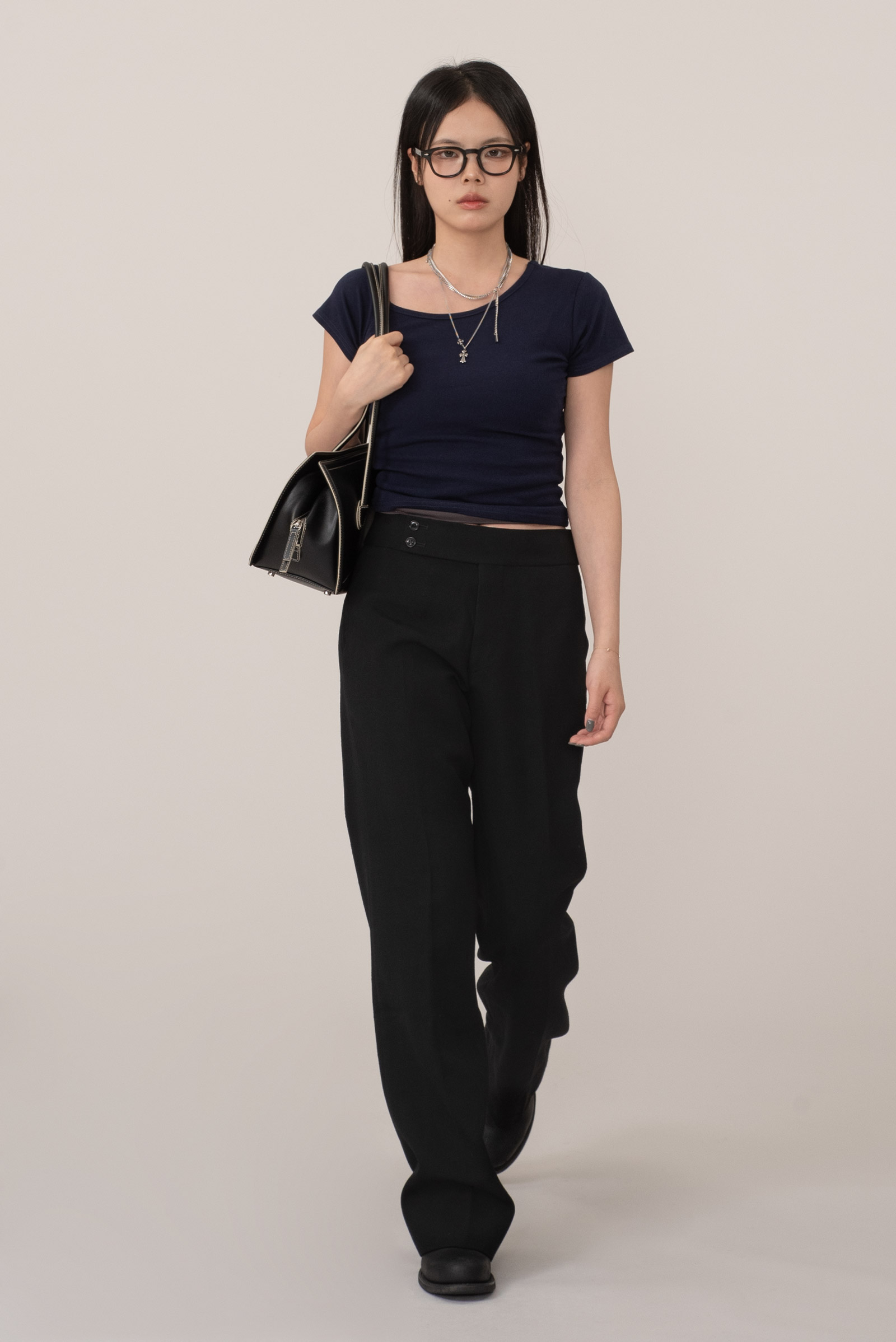 벨트 고리가 없는 클린 웨이스트라인은 미니멀리즘의 정수를 보여주며 허리를 감싸는 듯한 더블 버튼 여밈 역시 고급스러워요.