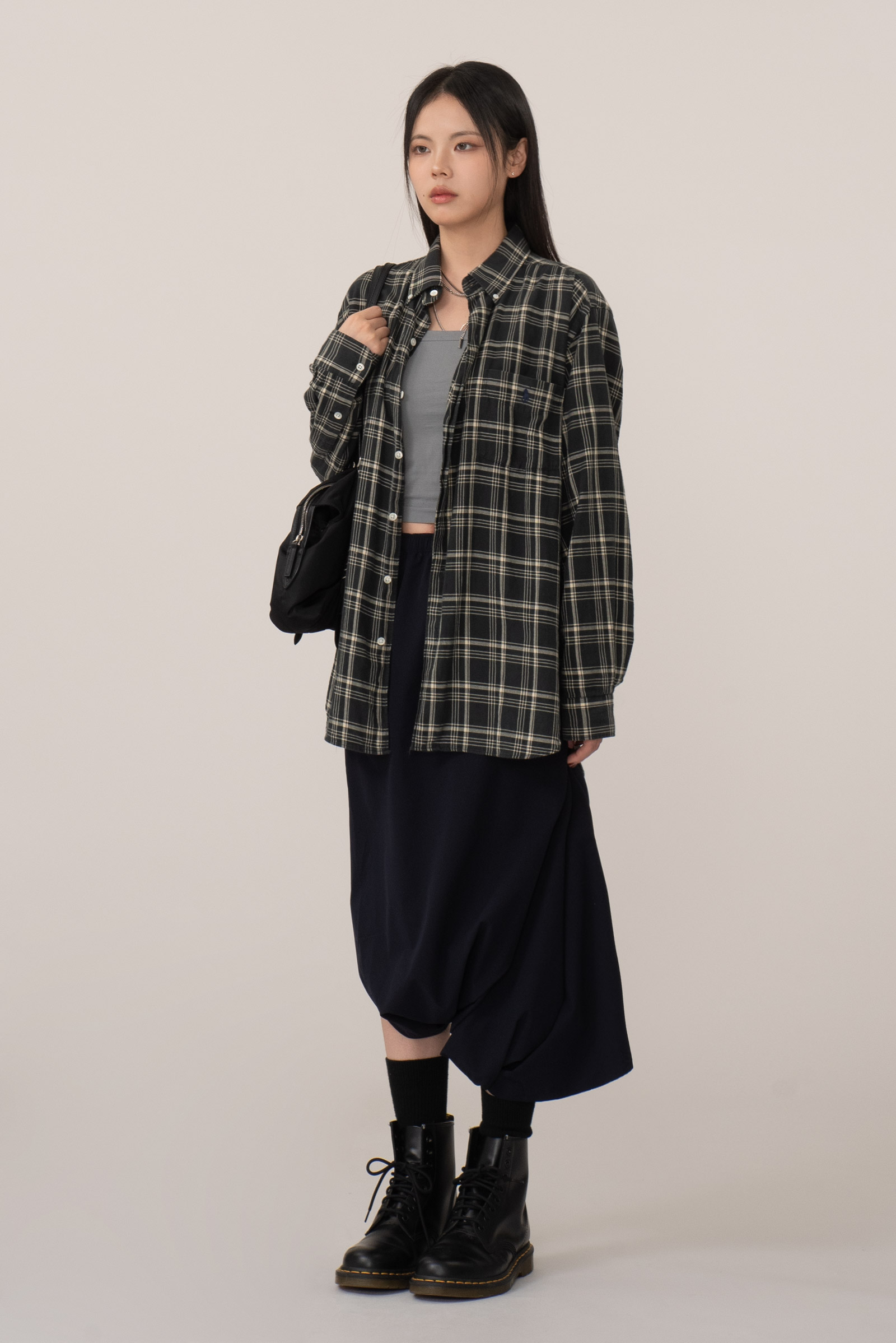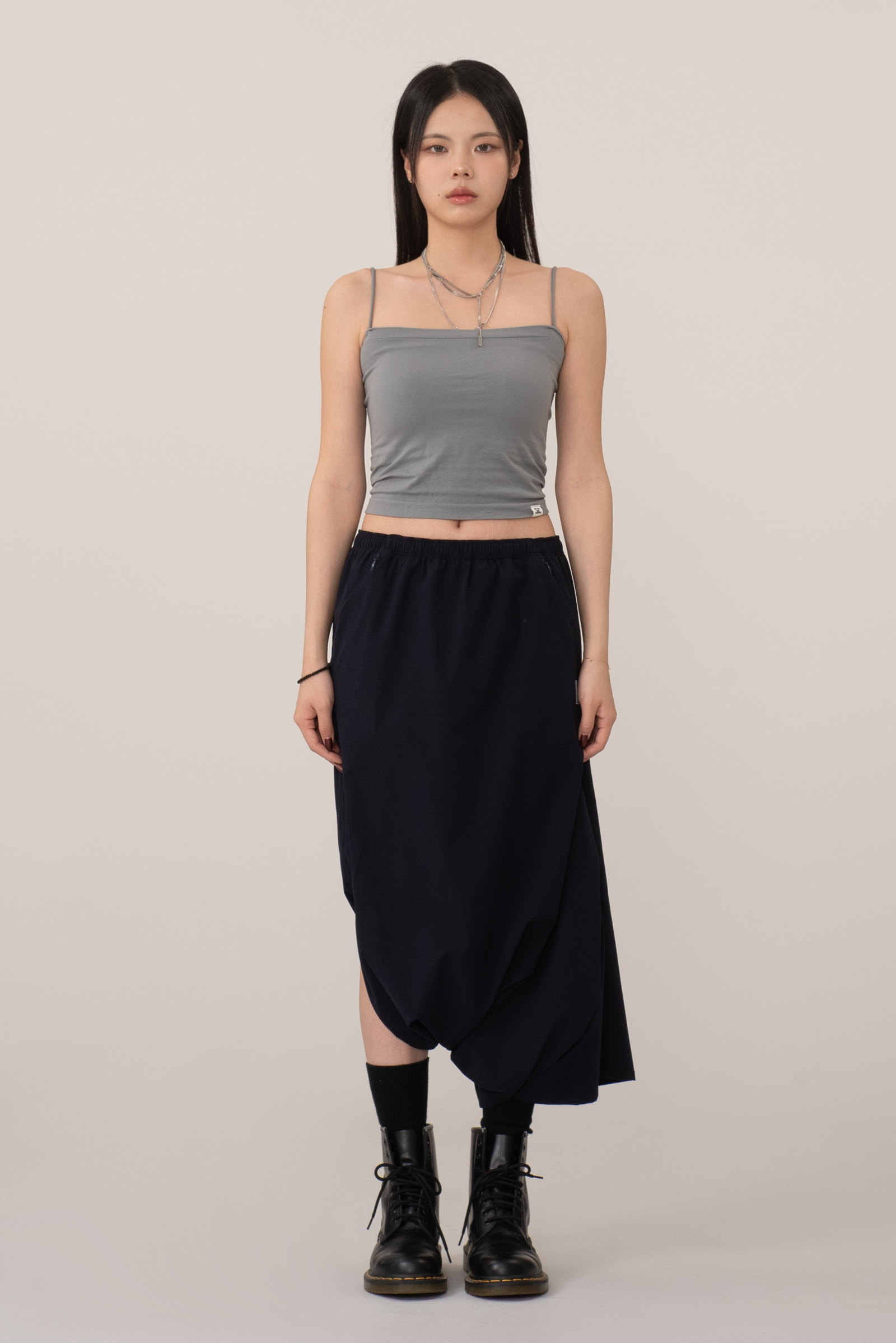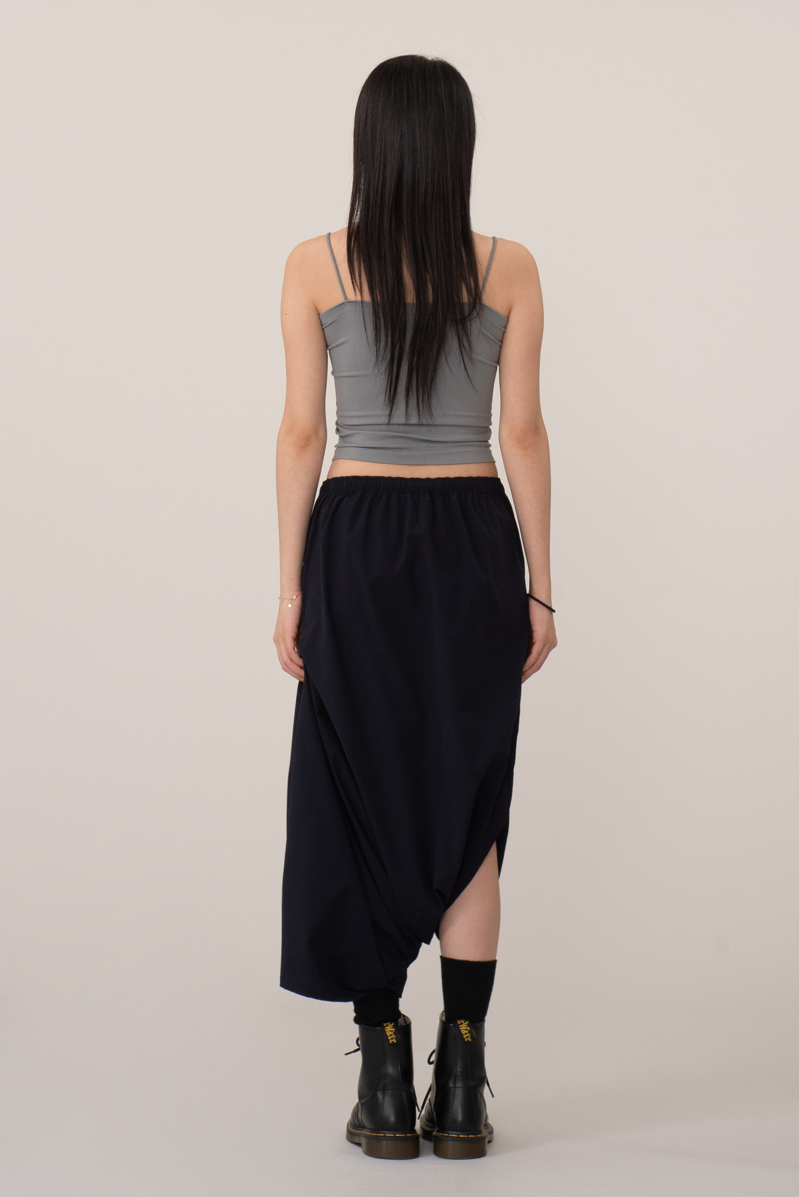 가벼운 폴리 원단으로 움직임에 따라 좌측에 자연스러운 드레이프가 형성되고 밑단은 벌룬스커트처럼 보이지만 사실 알라딘 요술 바지(?) 팬츠 디자인이라 일상 속에서 특별한 느낌으로 입으실 수 있어요.