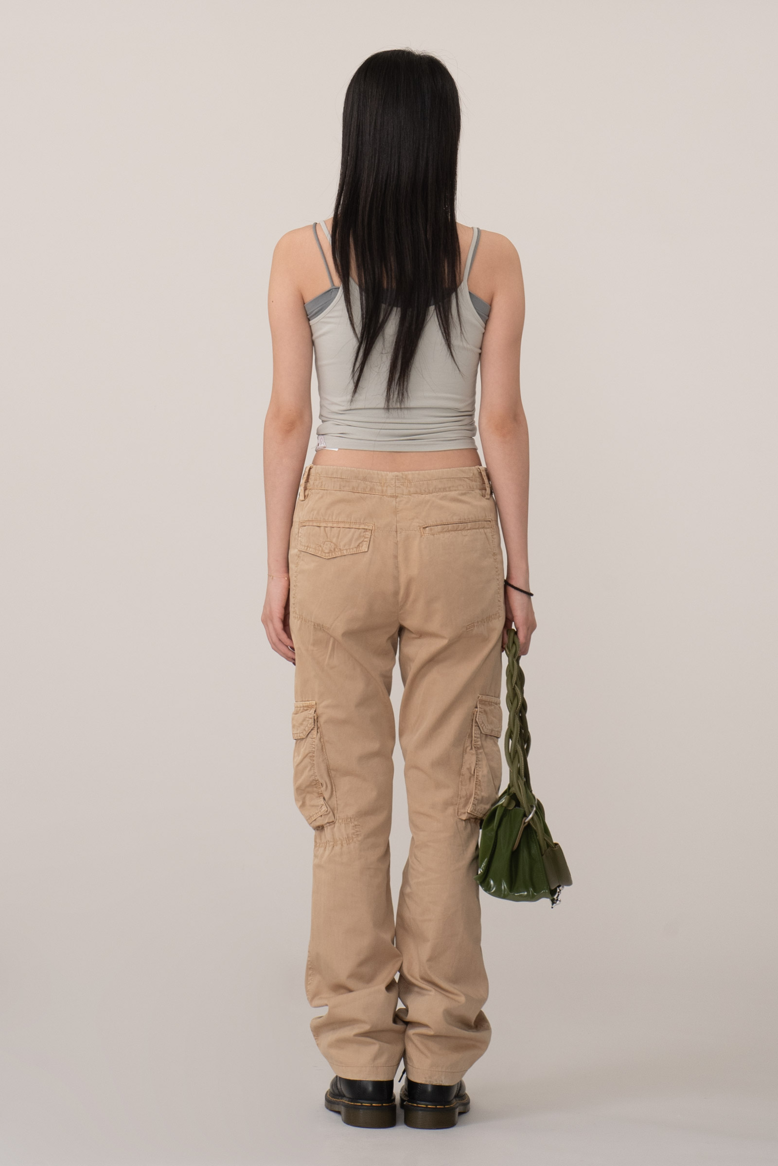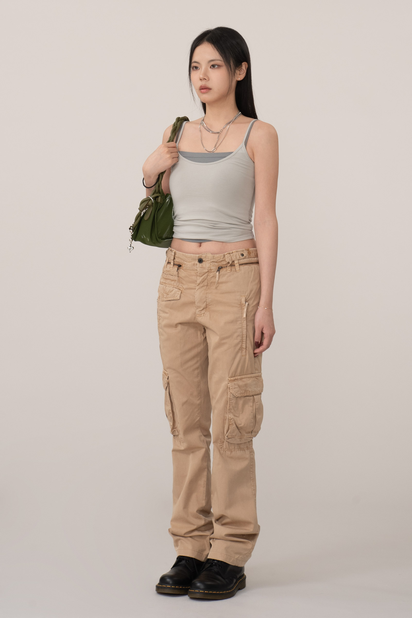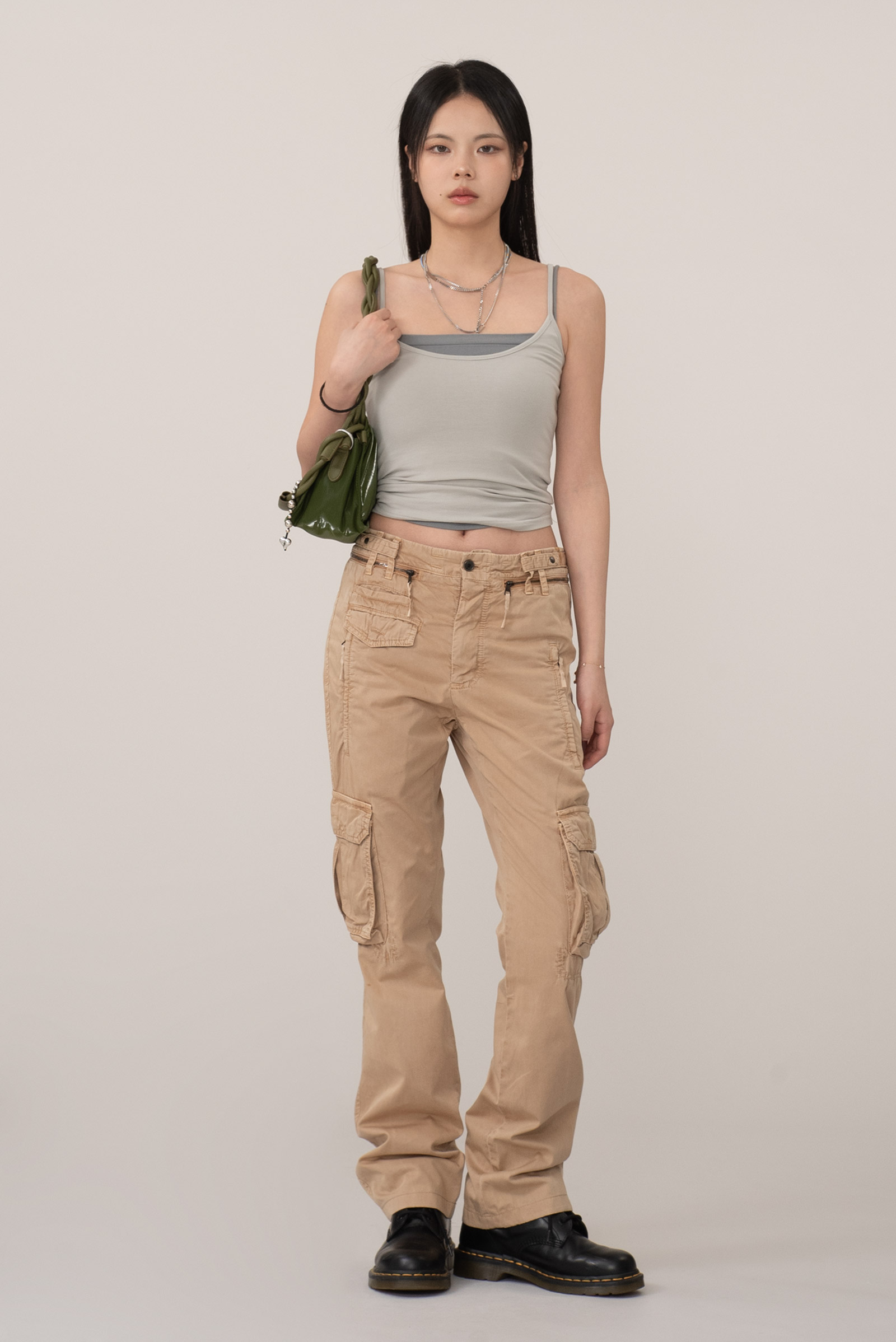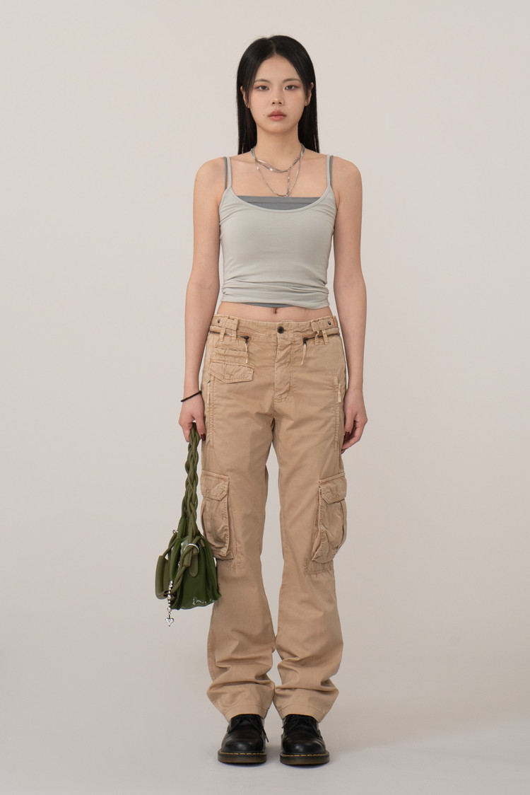 가볍게 워싱된 코튼 원단을 사용해 자연스러운 주름이 살아있으며 허리 선과 포켓 주변의 지퍼, 플랩 디테일이 실용적인 균형을 만들어 주는 아이템인데요.