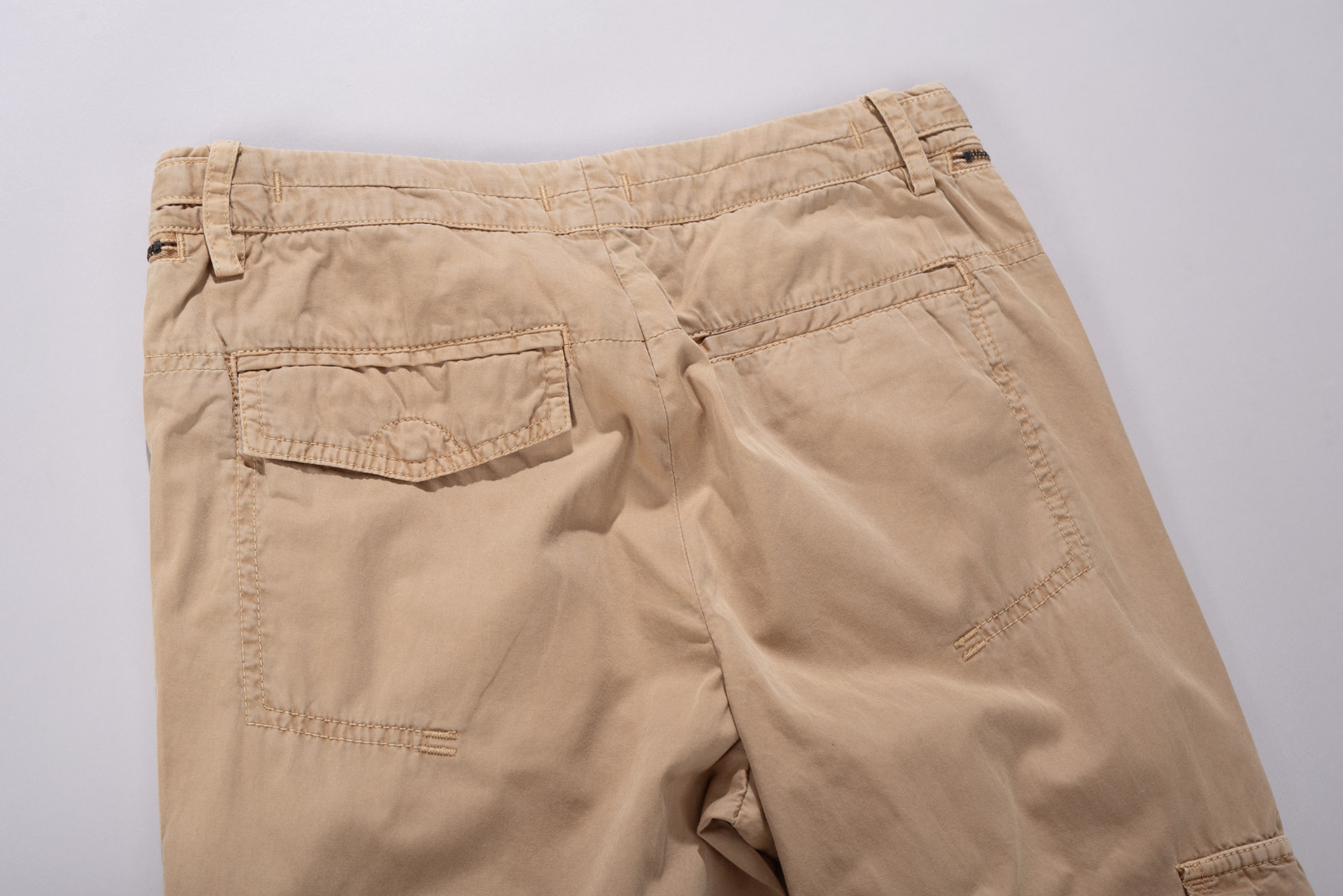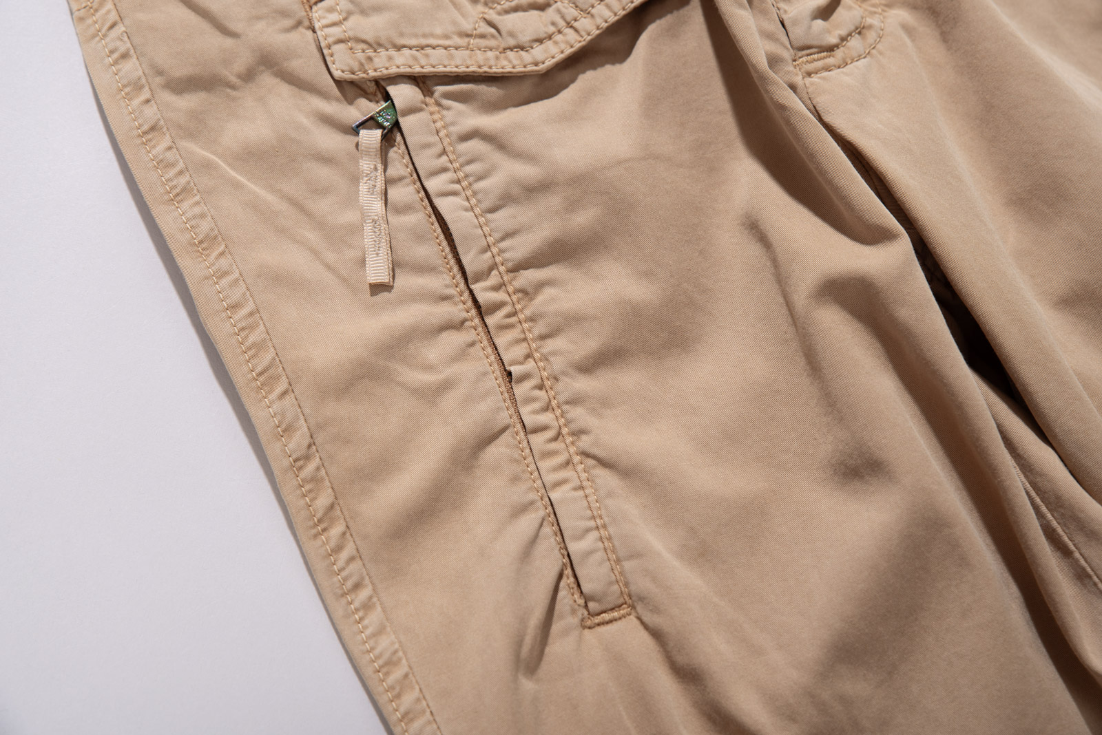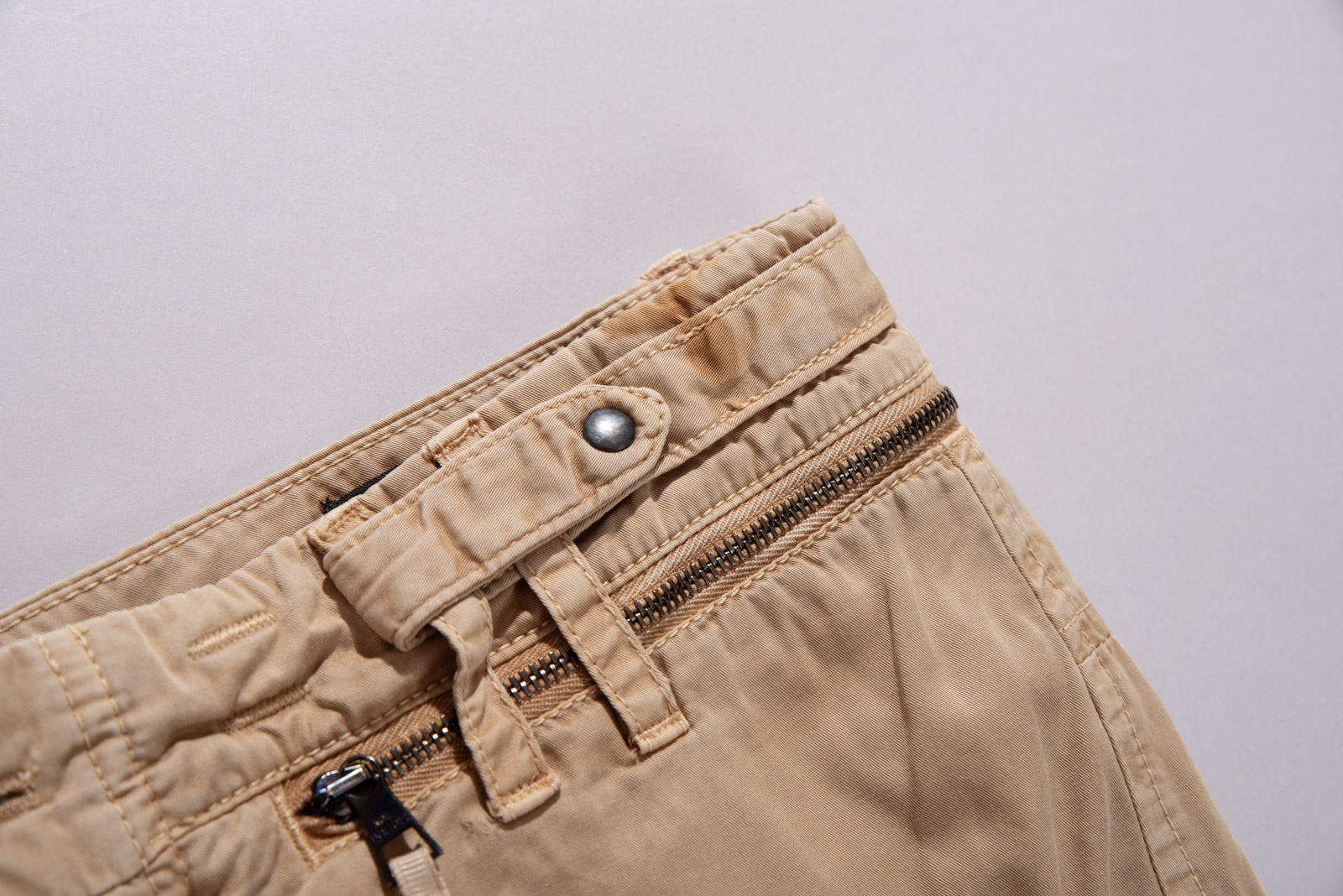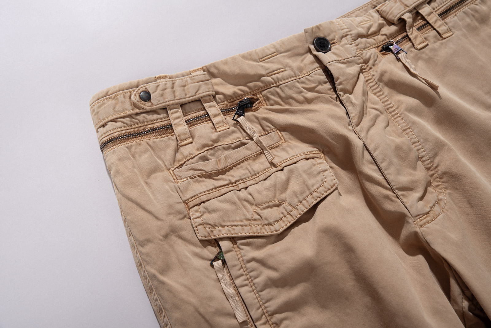 가볍게 워싱된 코튼 원단을 사용해 자연스러운 주름이 살아있으며 허리 선과 포켓 주변의 지퍼, 플랩 디테일이 실용적인 균형을 만들어 주는 아이템인데요.