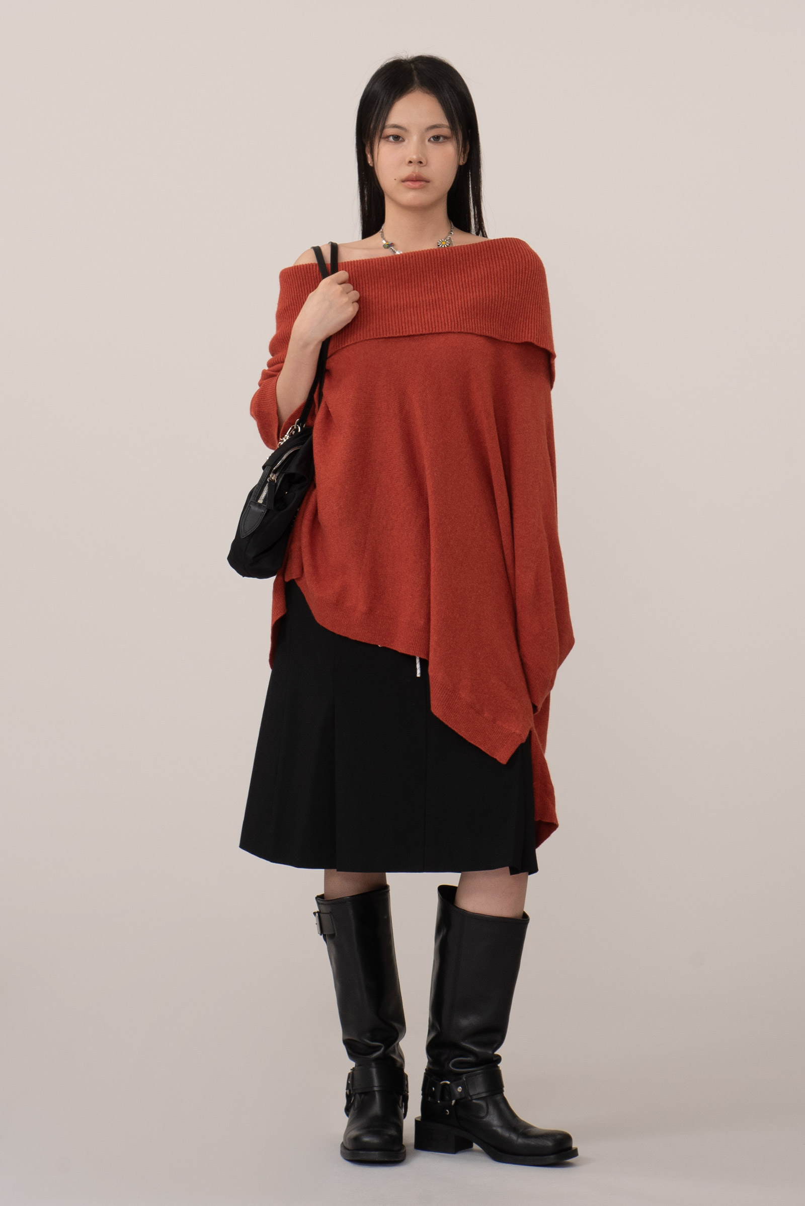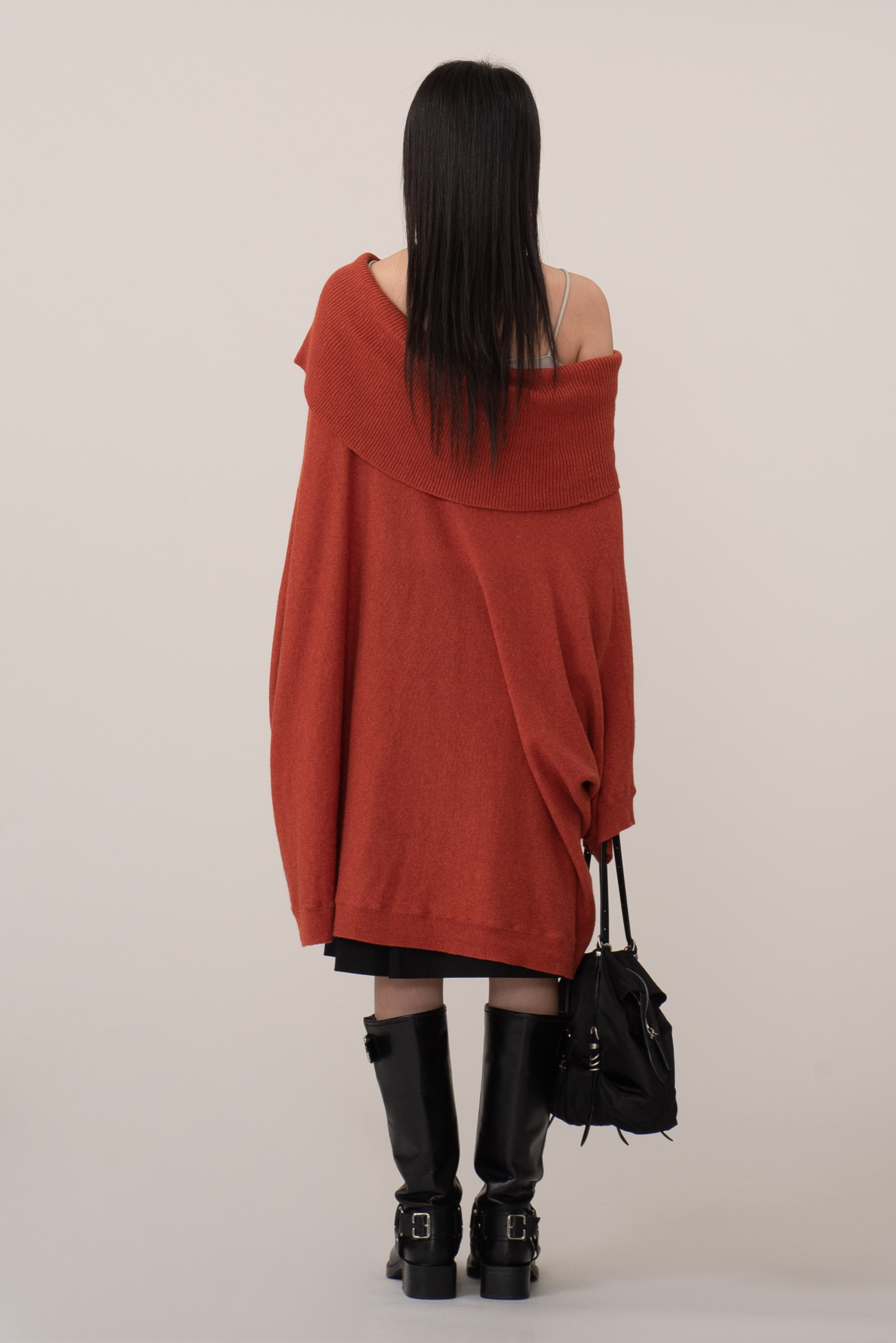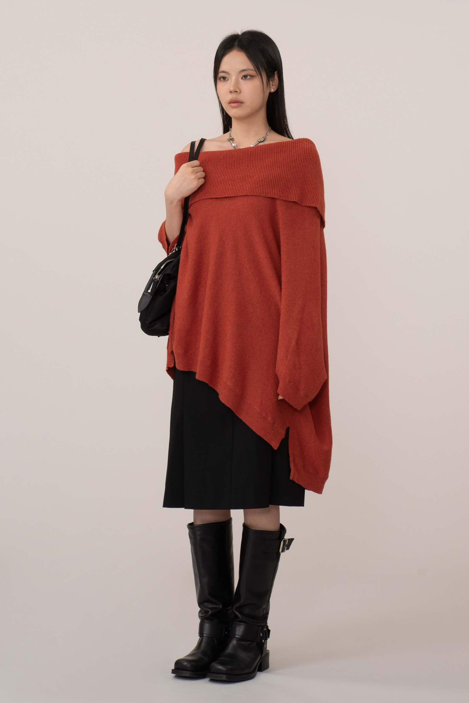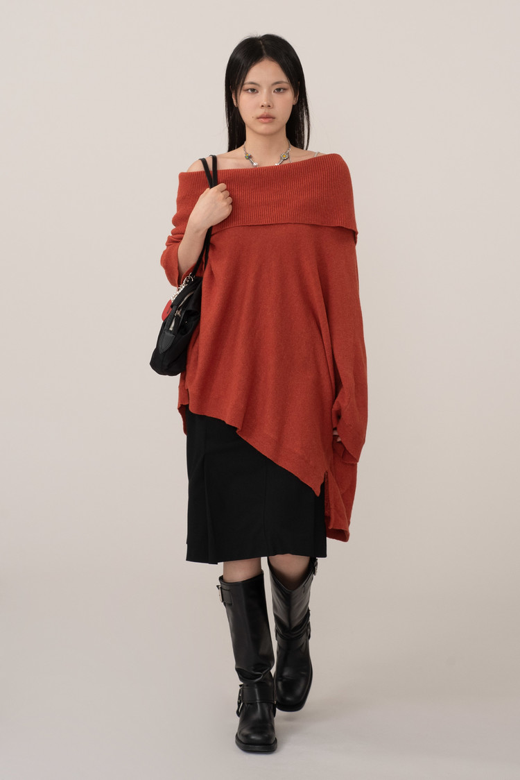 톤 다운된 벽돌빛+당근 컬러인데 강하지 않은 색감이라 단독, 레이어드 모두 편하게 활용되며 와이드 오프 넥으로 돋보이는 어깨 라인, 넓은 골지 조직 마감의 포근한 감성을 느끼실 수 있어요.