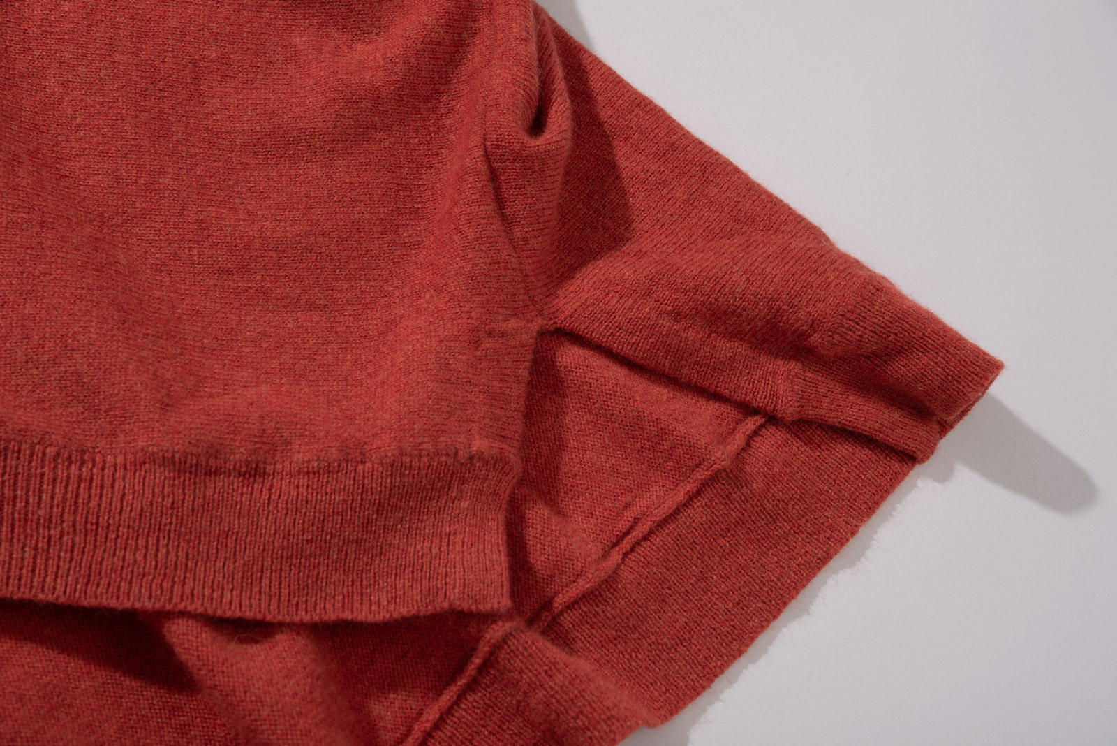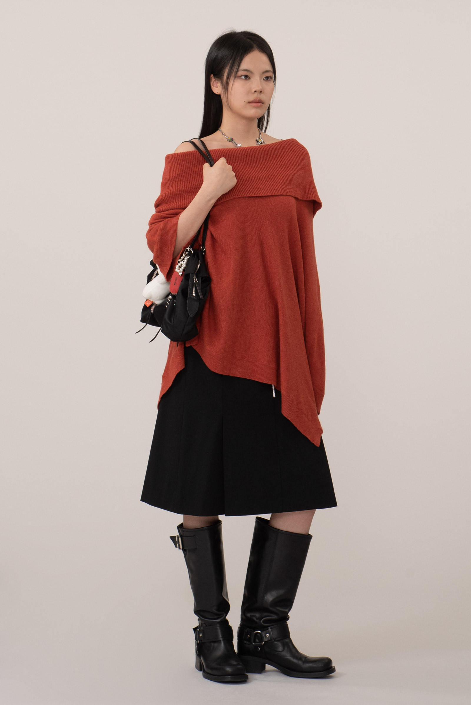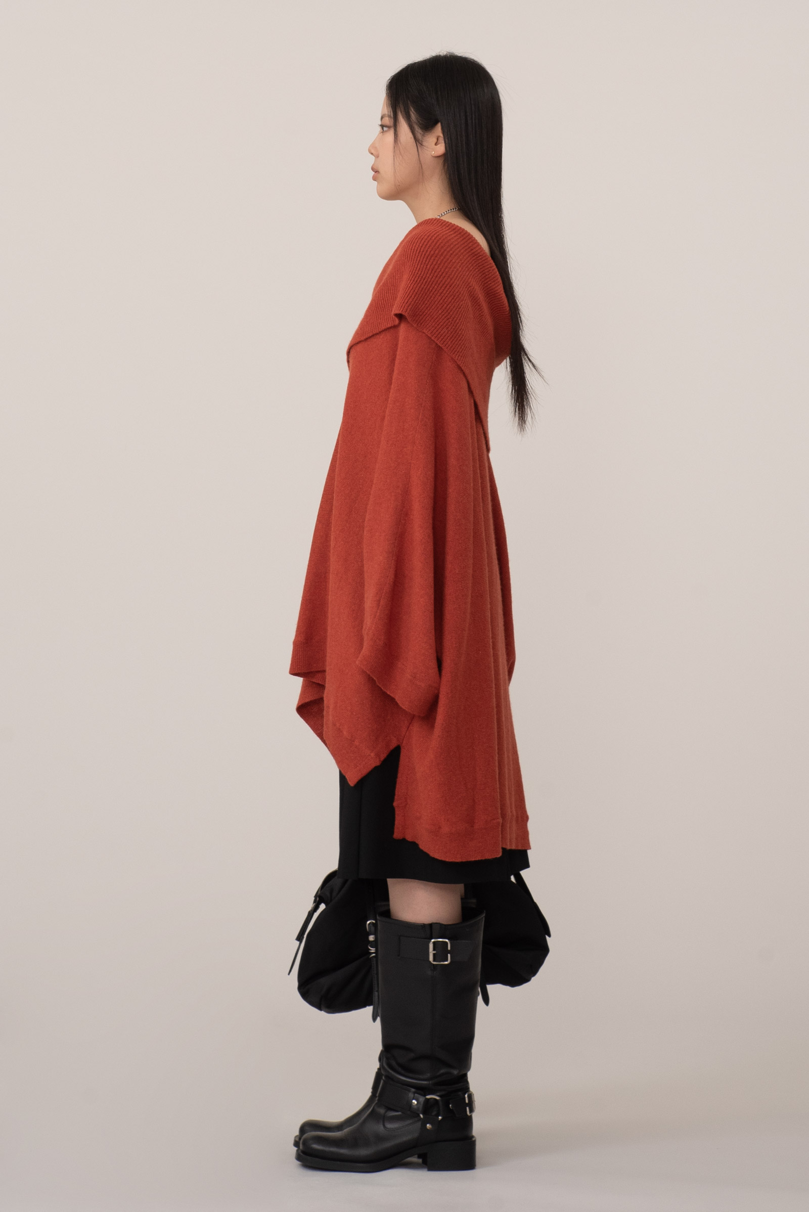 톤 다운된 벽돌빛+당근 컬러인데 강하지 않은 색감이라 단독, 레이어드 모두 편하게 활용되며 와이드 오프 넥으로 돋보이는 어깨 라인, 넓은 골지 조직 마감의 포근한 감성을 느끼실 수 있어요.