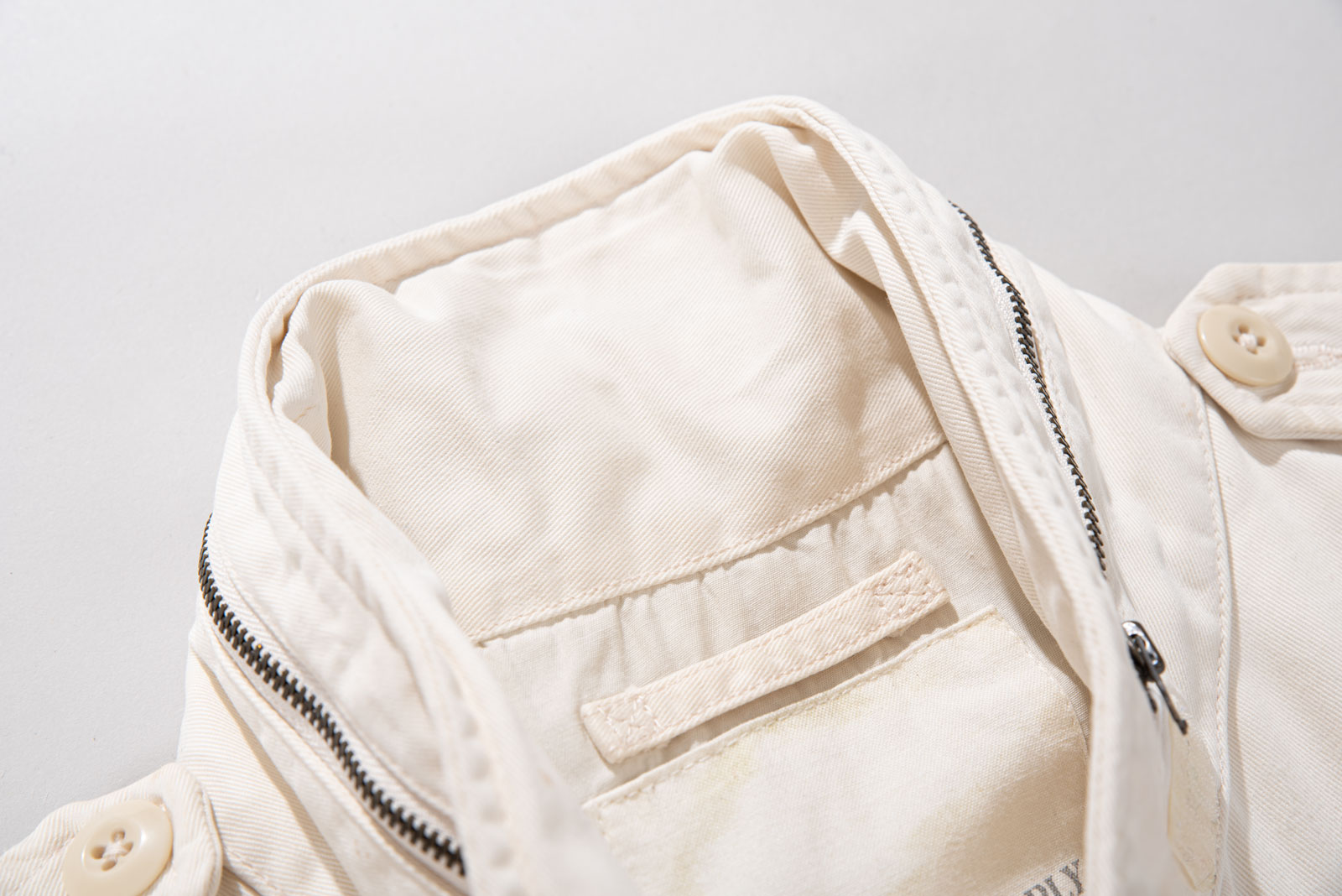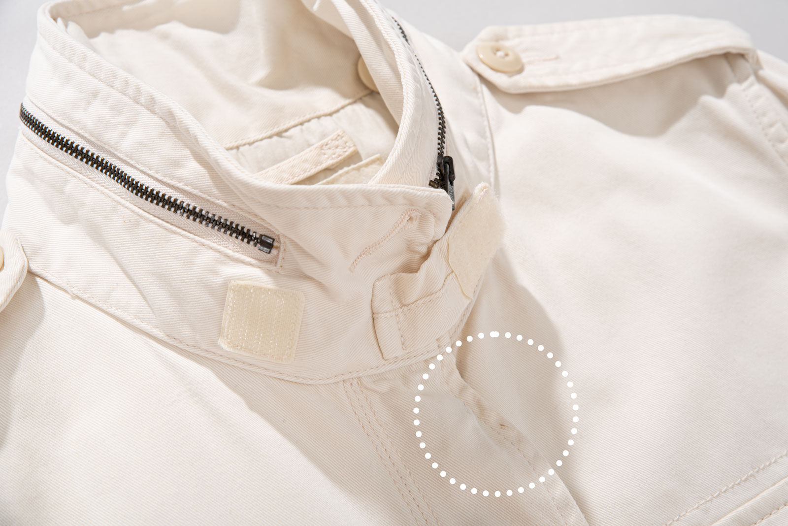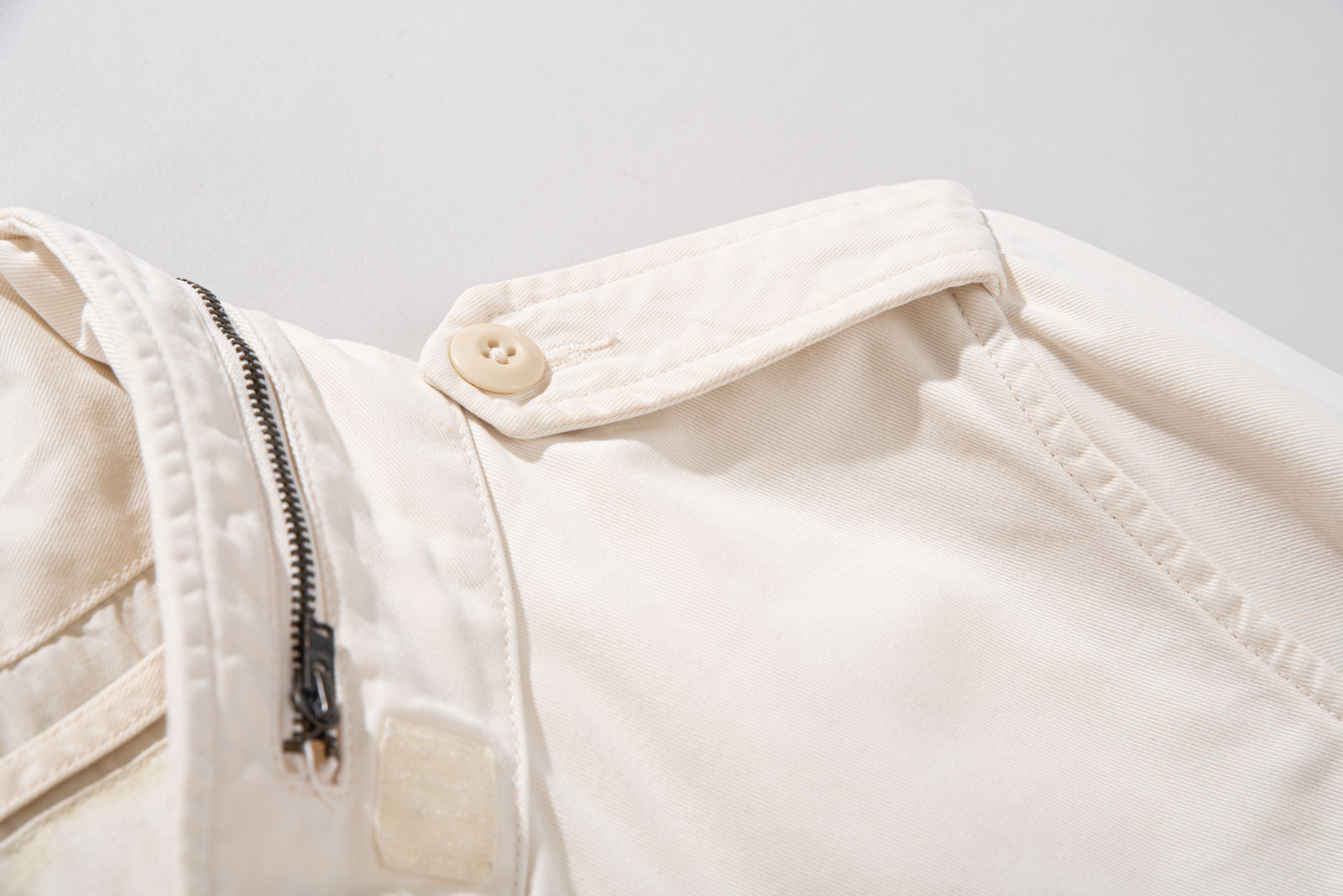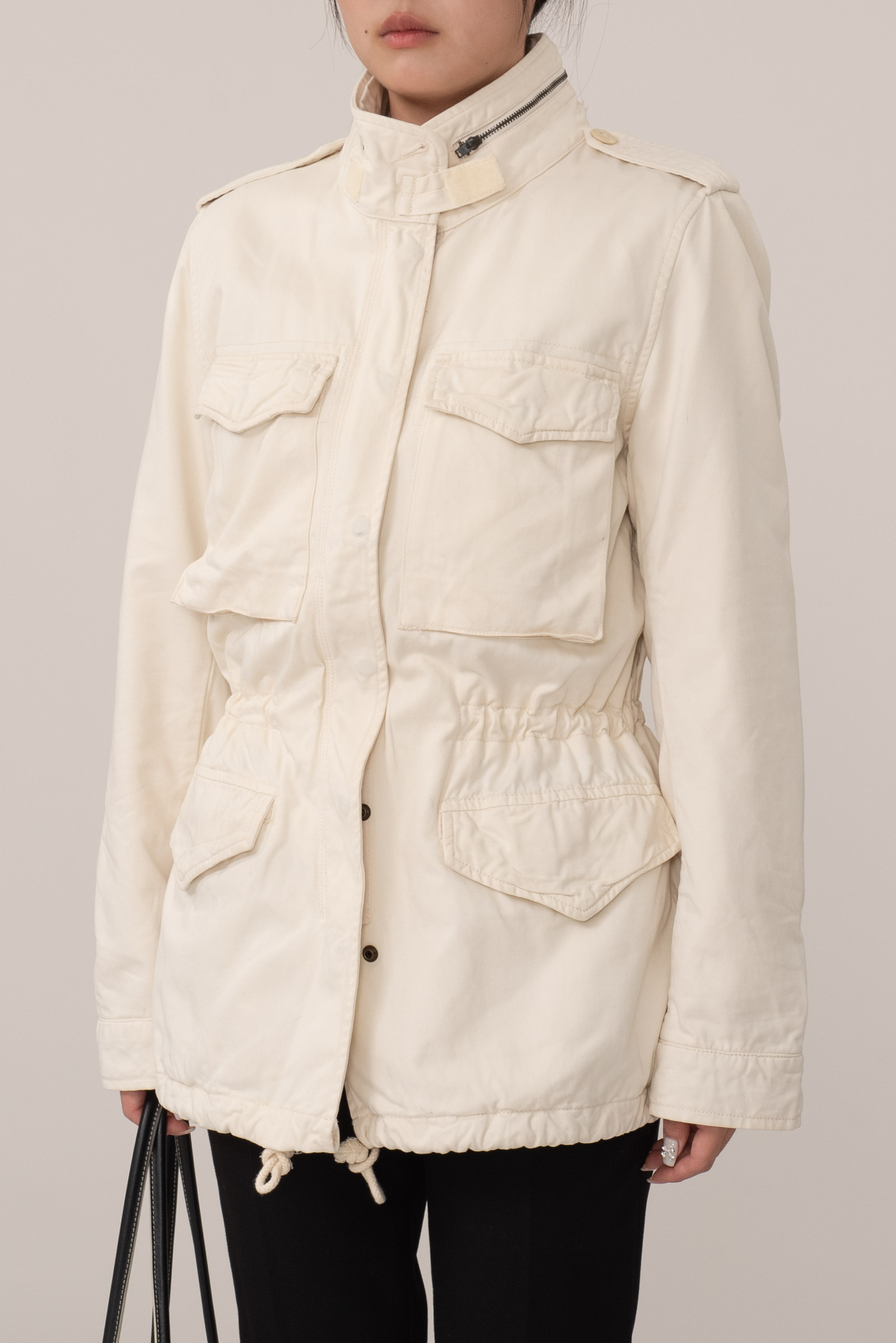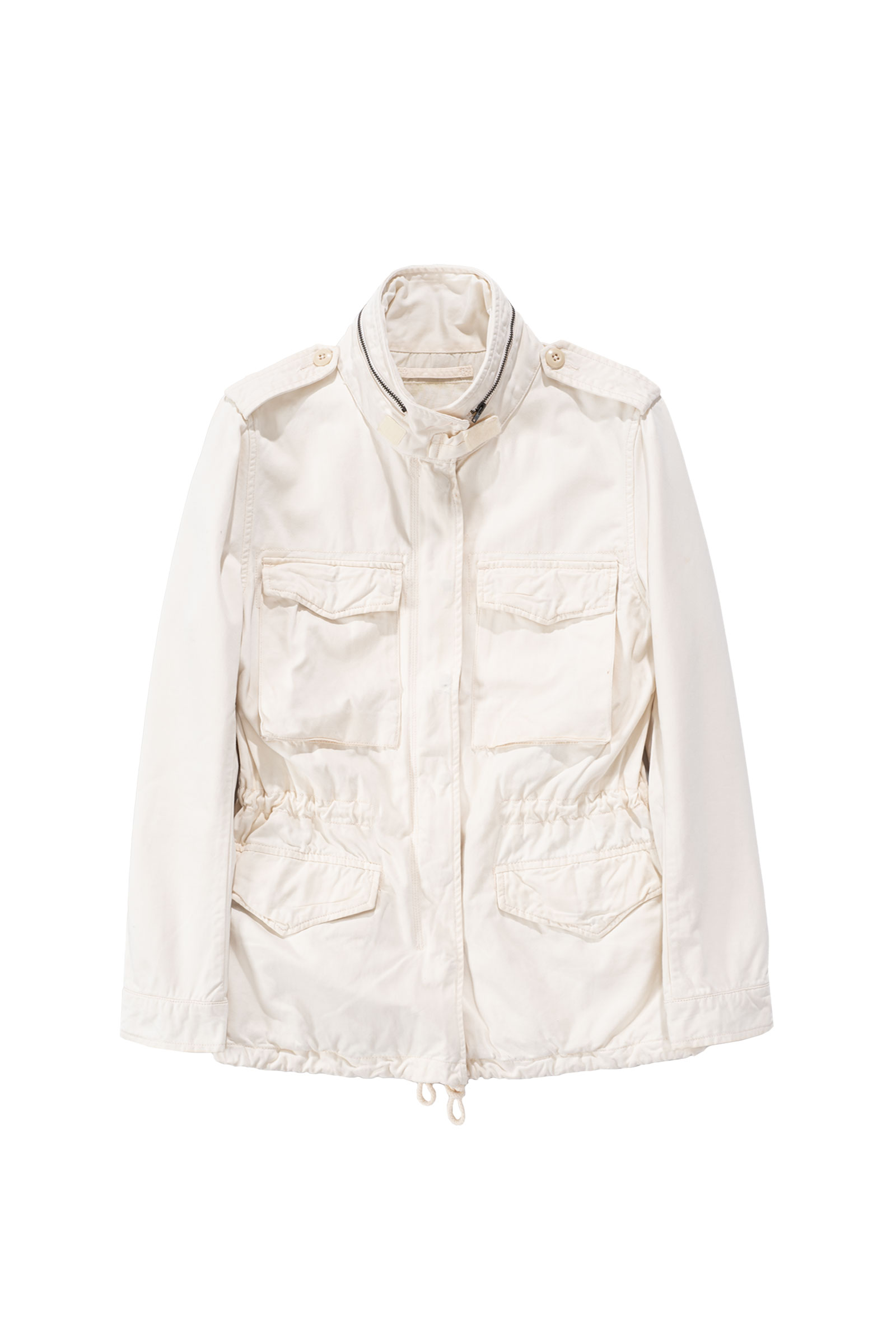 주류인 카키가 아니라 따뜻한 아이보리 컬러에 M65 필드 재킷을 그대로 모방한 전면 멀티 포켓, 견고한 능직 소재와 지퍼 계의 명품인 Ideal 사용되었습니다.