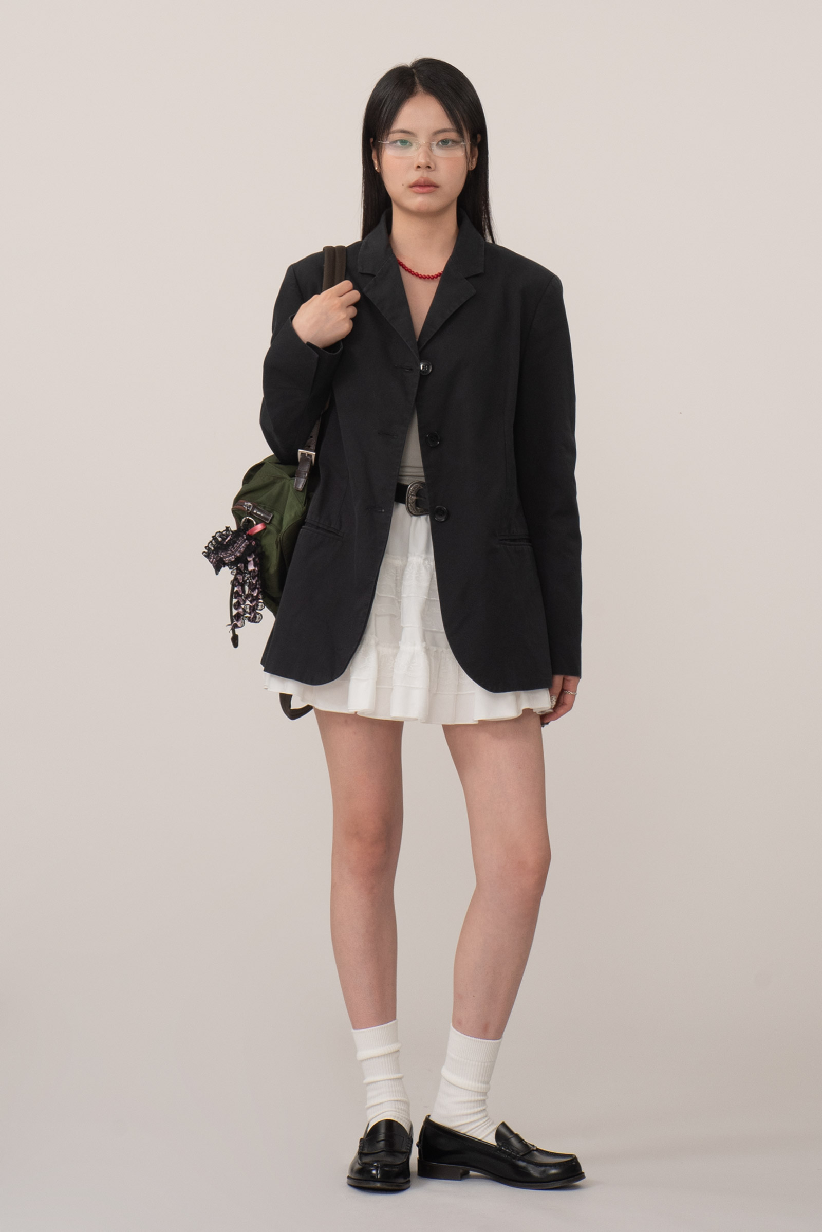 오늘 소개해 드리는 피스 역시 큰 디테일 없이 자연스럽고 빈티지한 감성이 돋보이며 기본에 기본을 더한 쓰리버튼 디자인, 100% 코튼 소재로 봄, 가을 스탠더드 오버핏으로 잘 입어질 제품이네요.