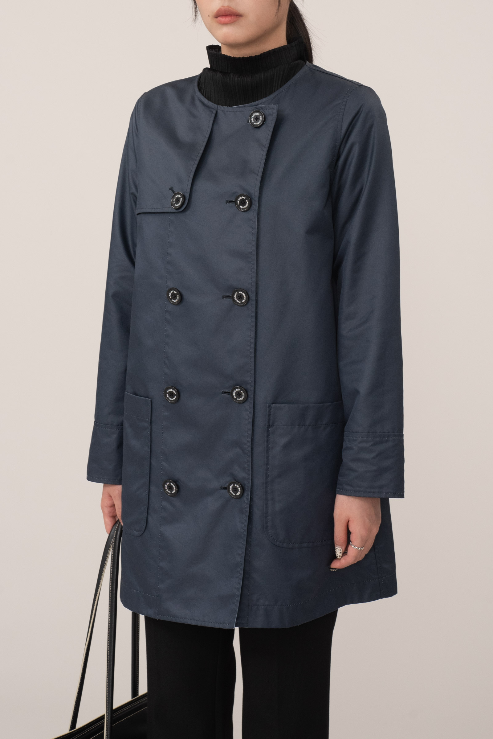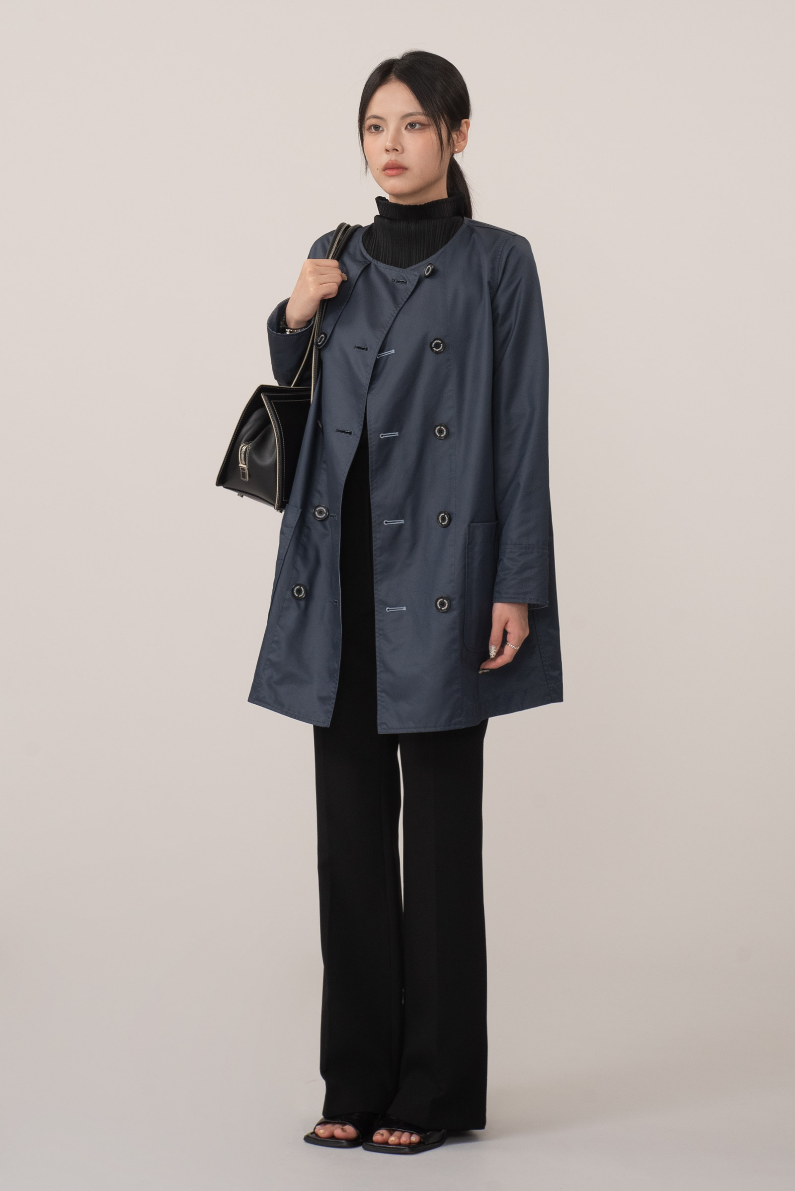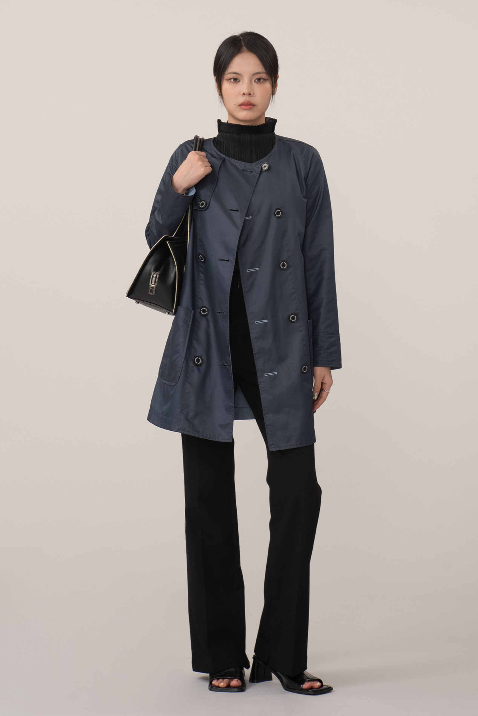 전통적인 트렌치코트 실루엣에 라운드넥과 미니멀한 플랫 플랩으로 정제한 디자인. 목선을 깔끔히 드러내 클래식 트렌치의 도회적인 실루엣과 젠더리스 무드를 느낄 수 있는 제품입니다.