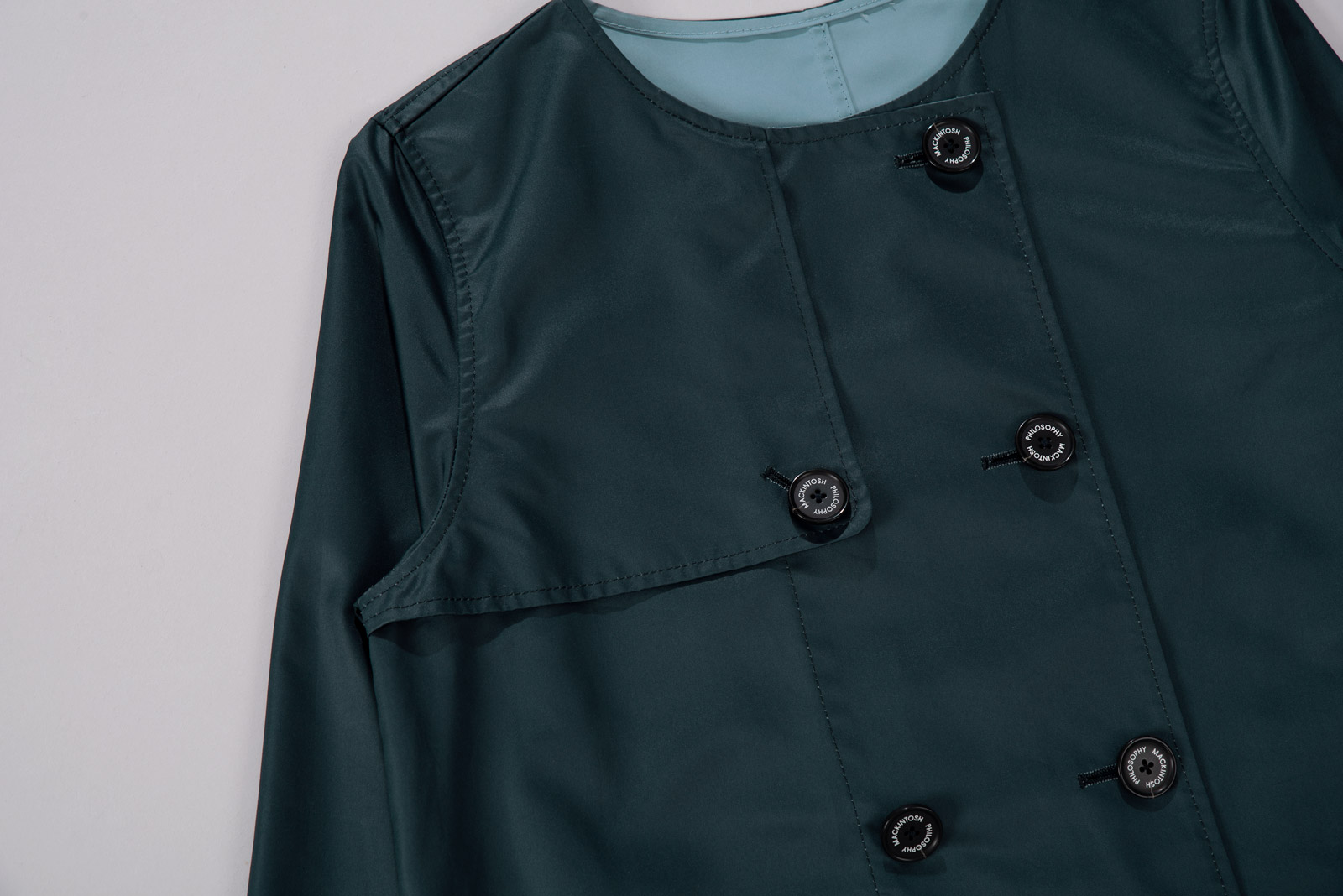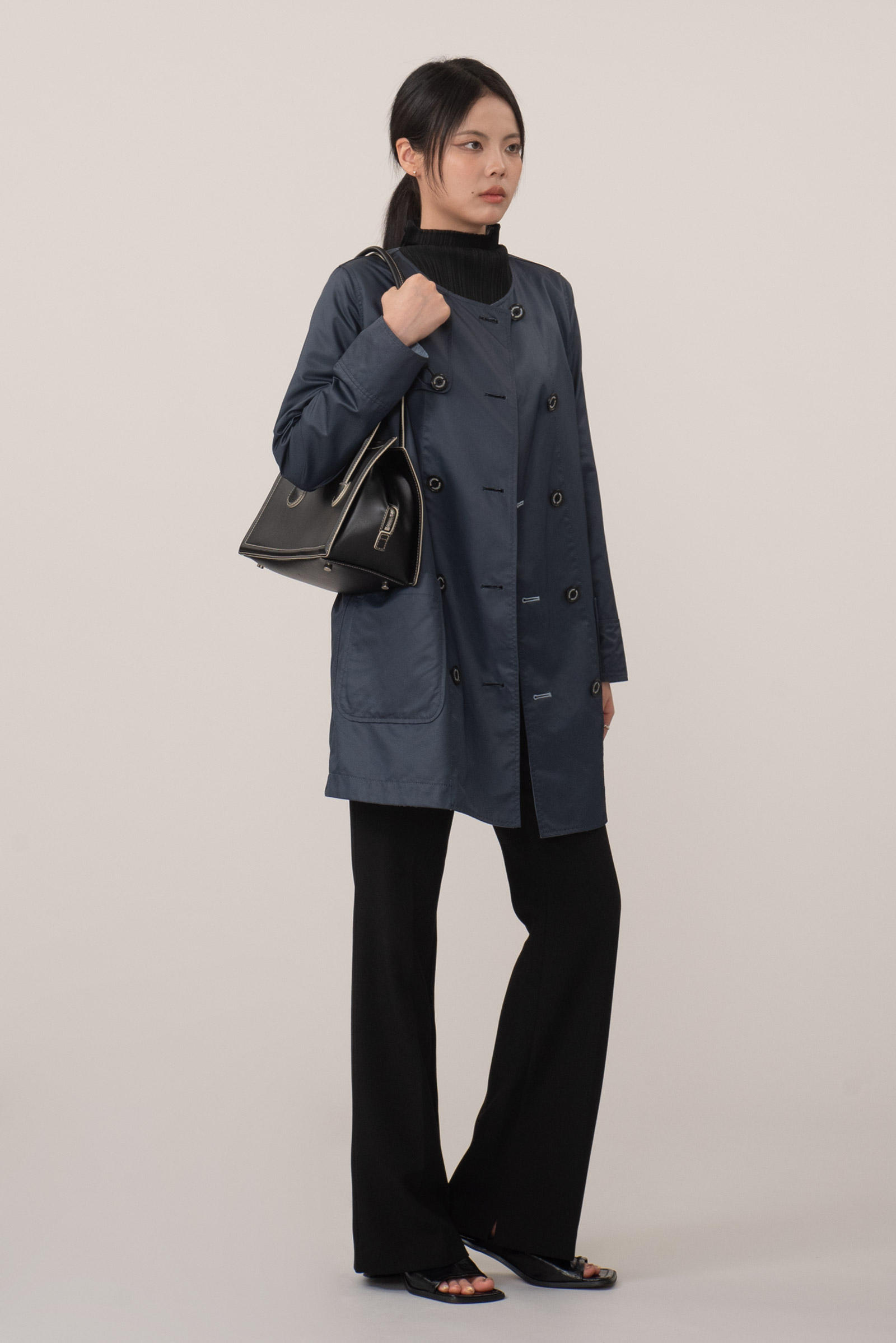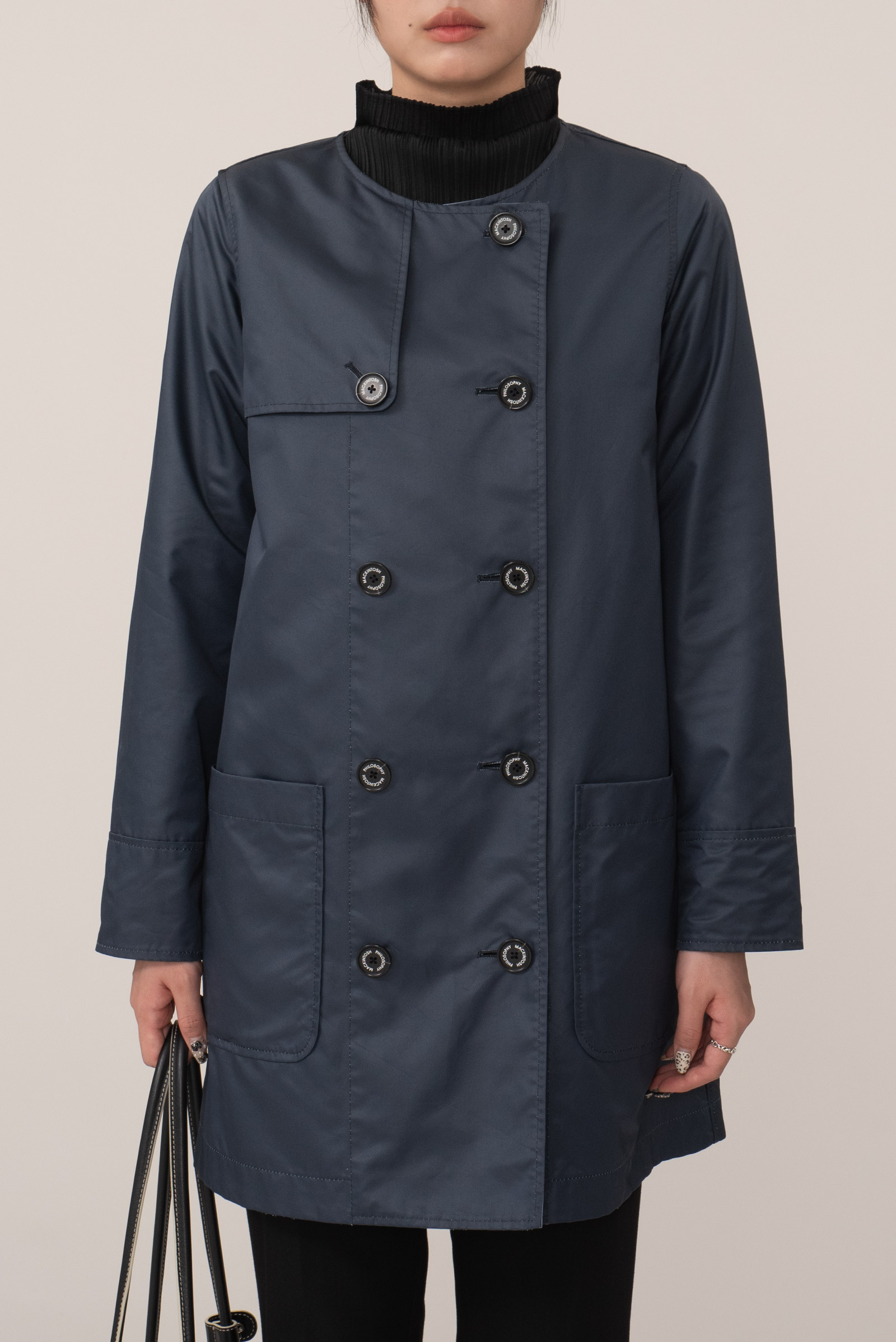 전통적인 트렌치코트 실루엣에 라운드넥과 미니멀한 플랫 플랩으로 정제한 디자인. 목선을 깔끔히 드러내 클래식 트렌치의 도회적인 실루엣과 젠더리스 무드를 느낄 수 있는 제품입니다.