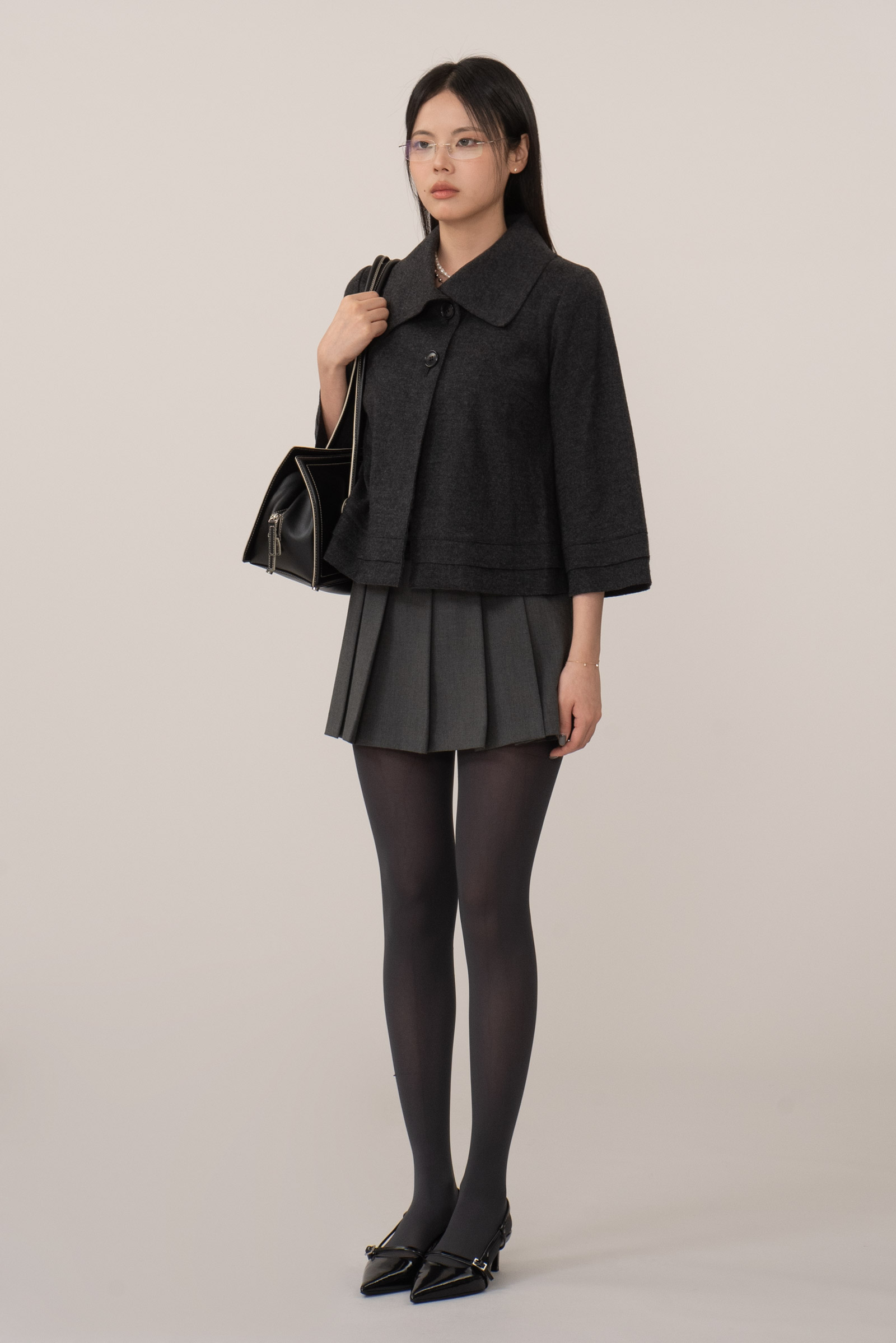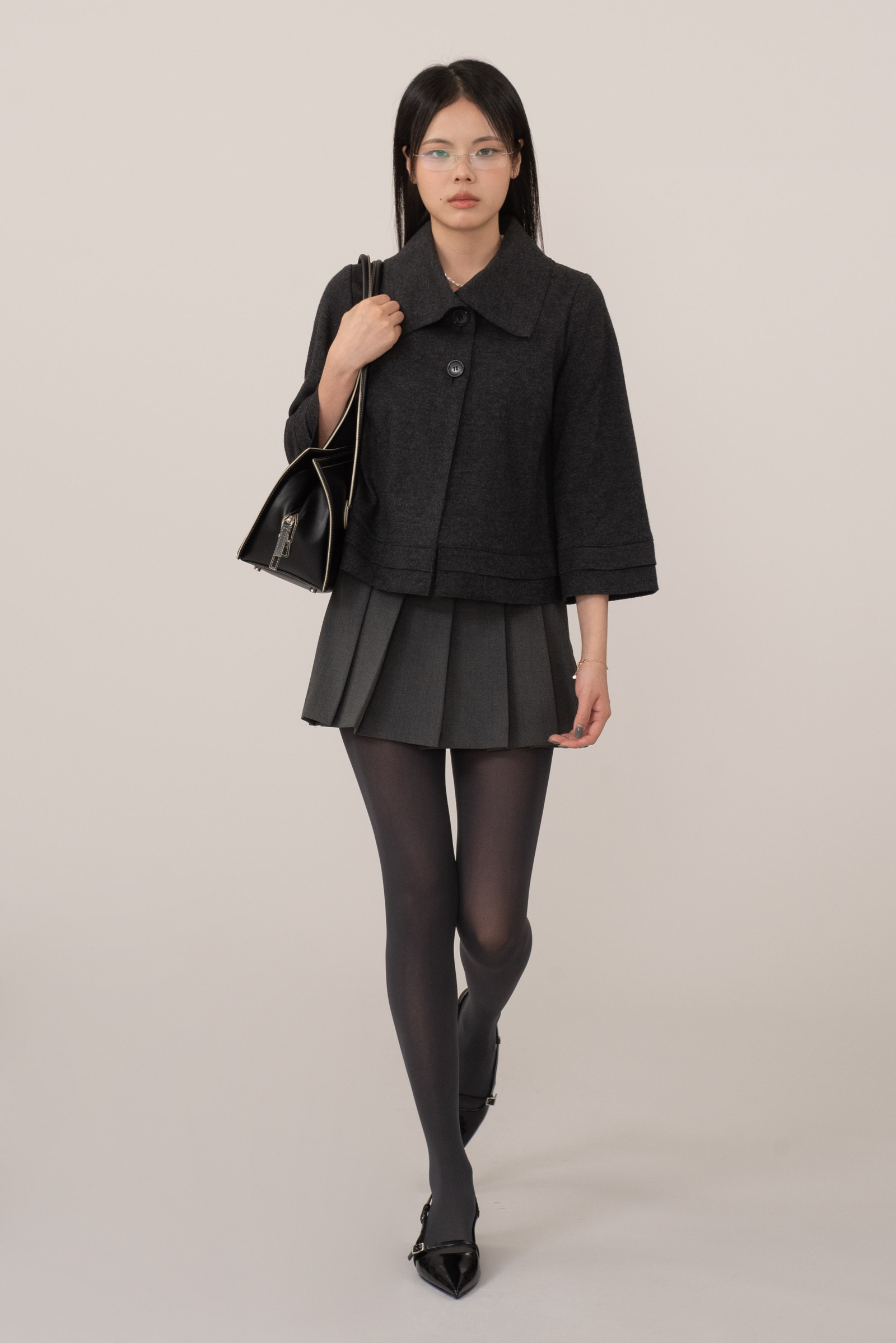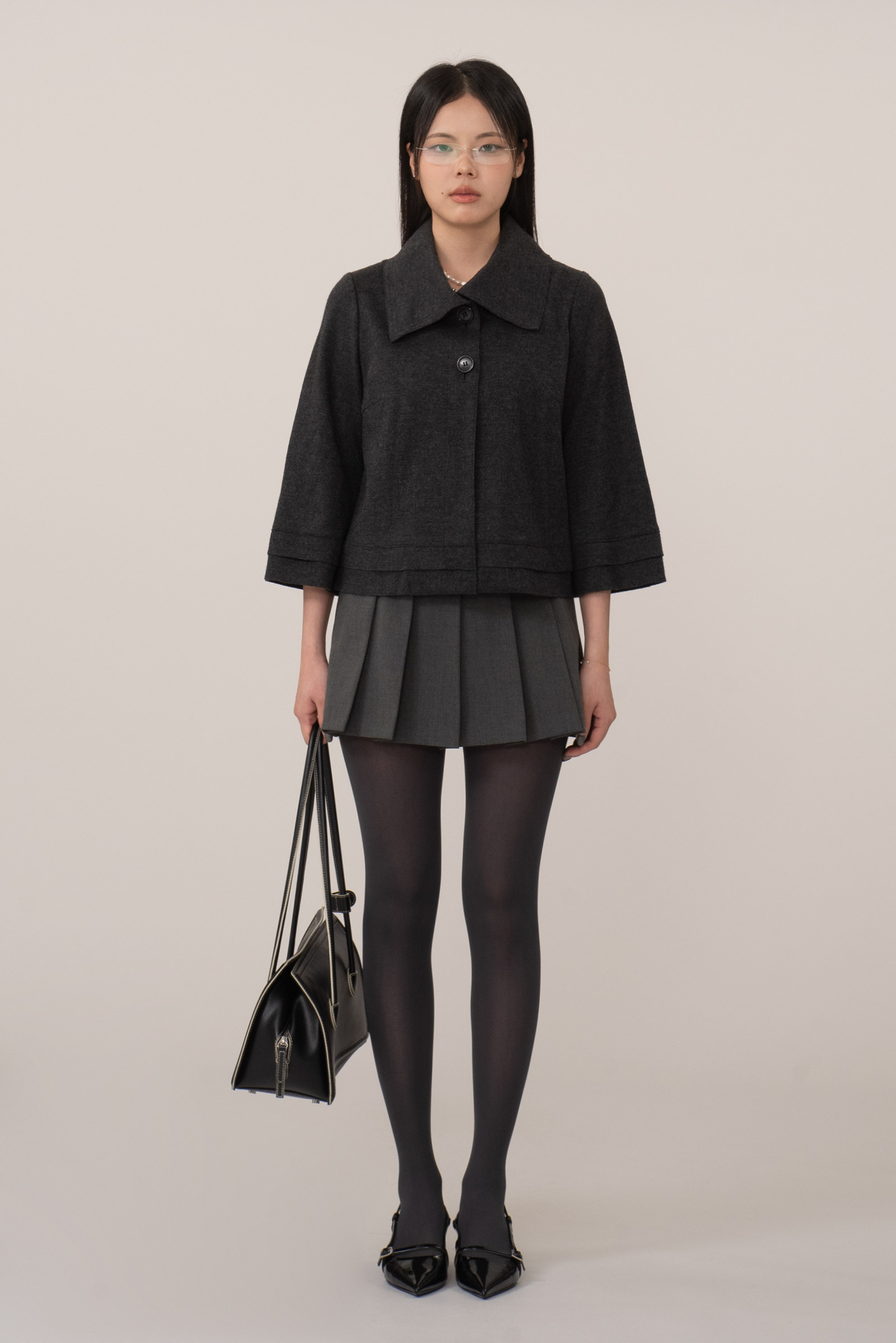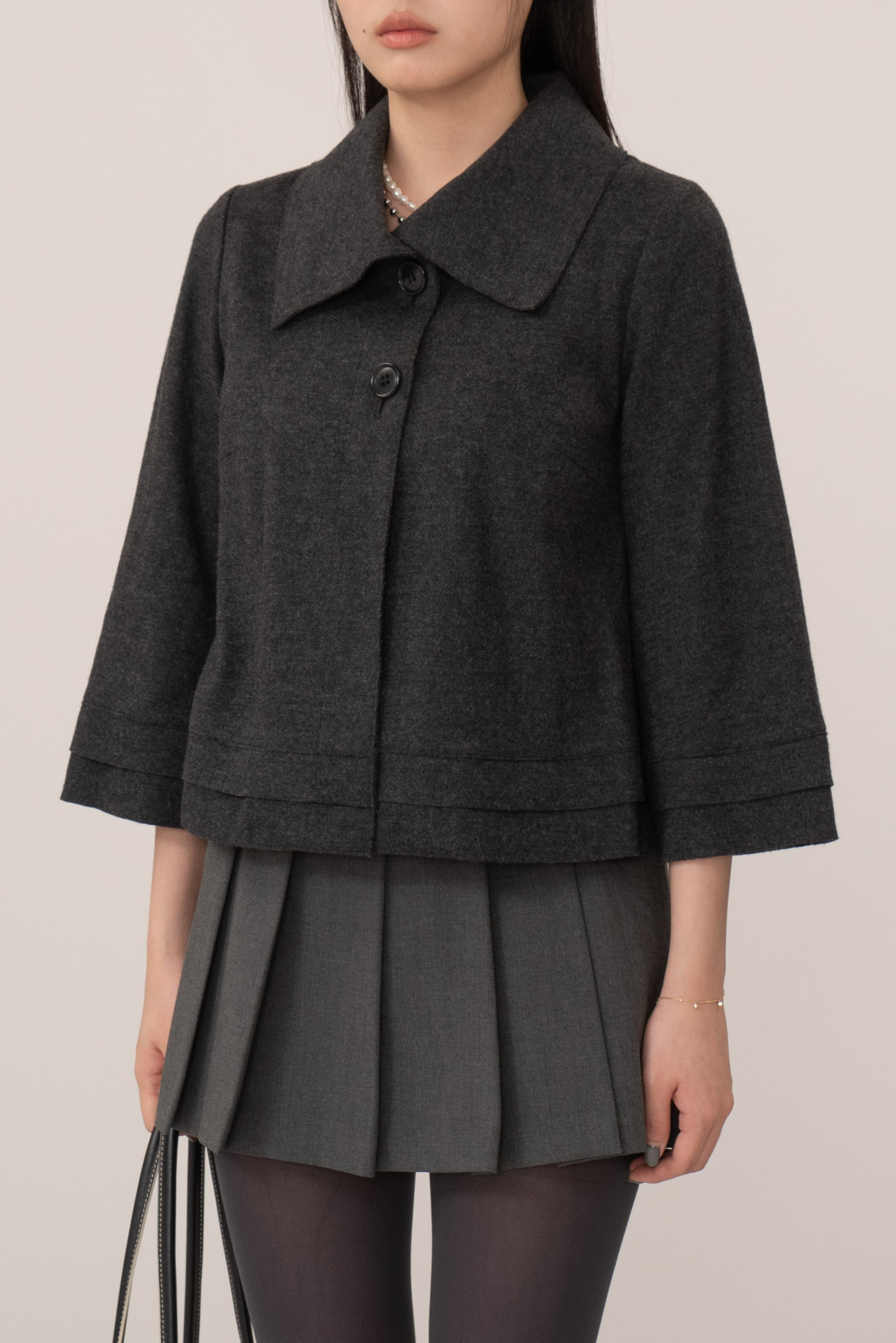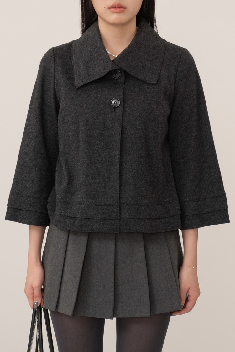 넓은 카라와 단정한 버튼, A 라인 소매와 허리선, 살짝 여유 있게 둔 숏한 길이감이 특징이에요.