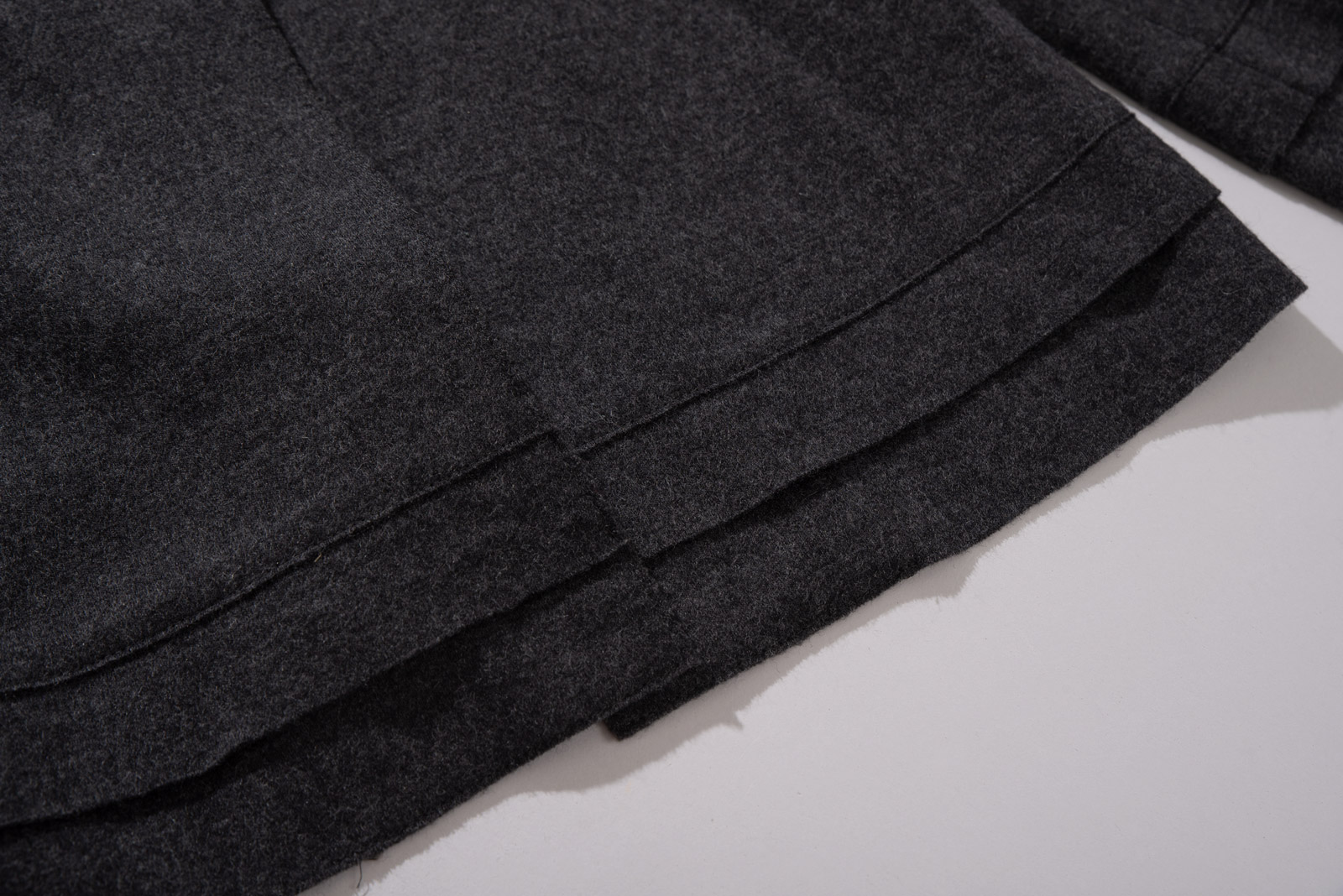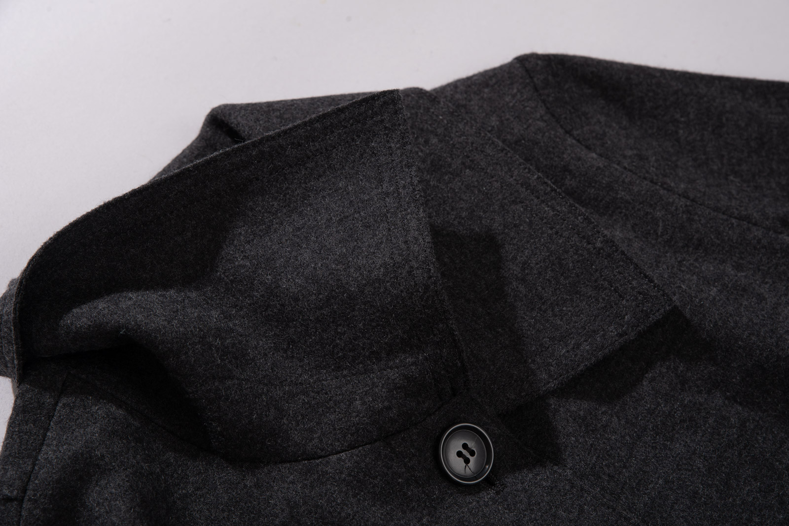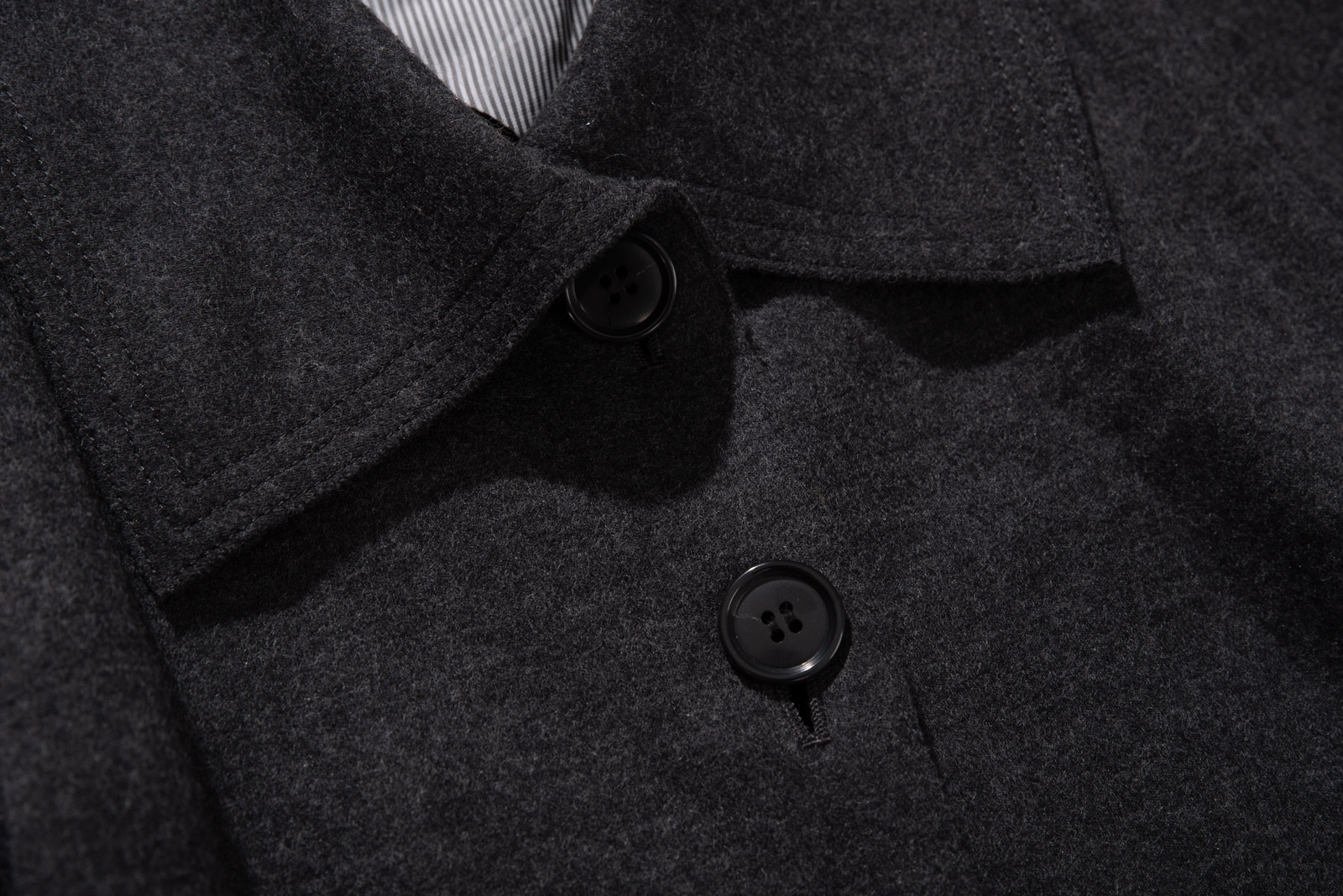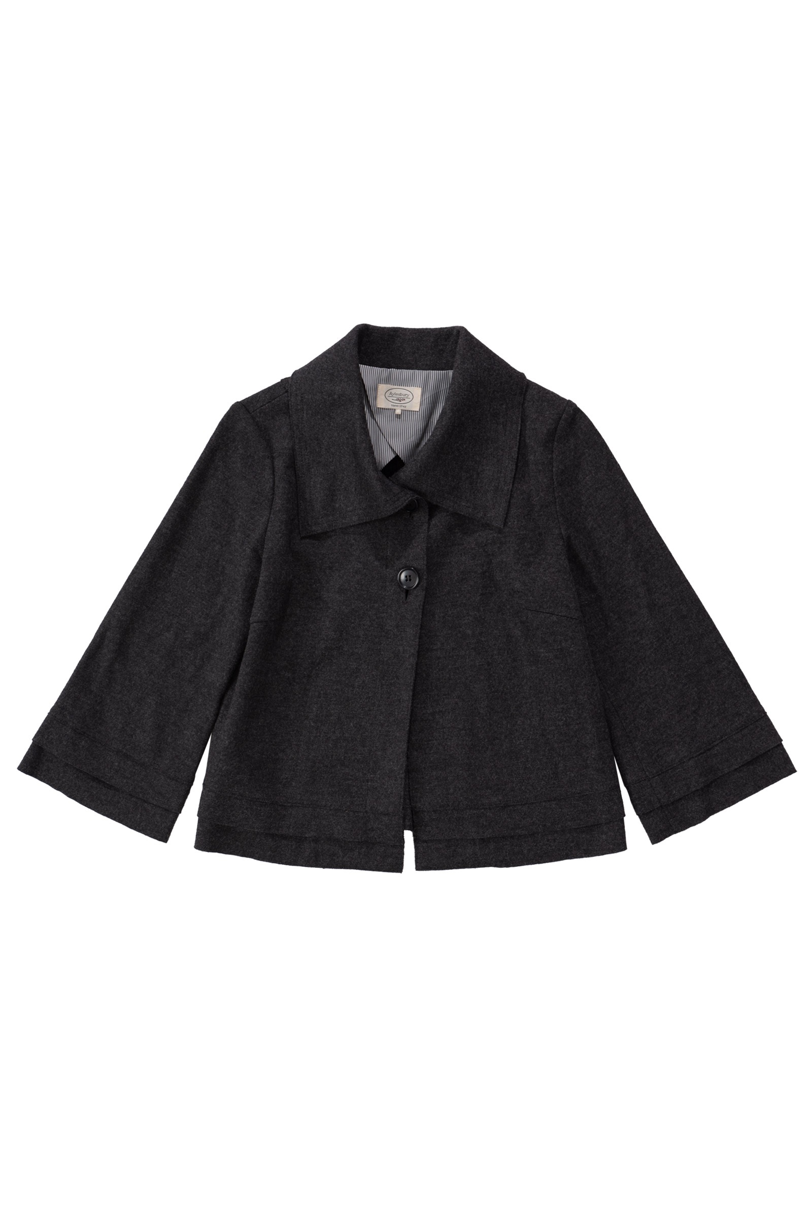 넓은 카라와 단정한 버튼, A 라인 소매와 허리선, 살짝 여유 있게 둔 숏한 길이감이 특징이에요.