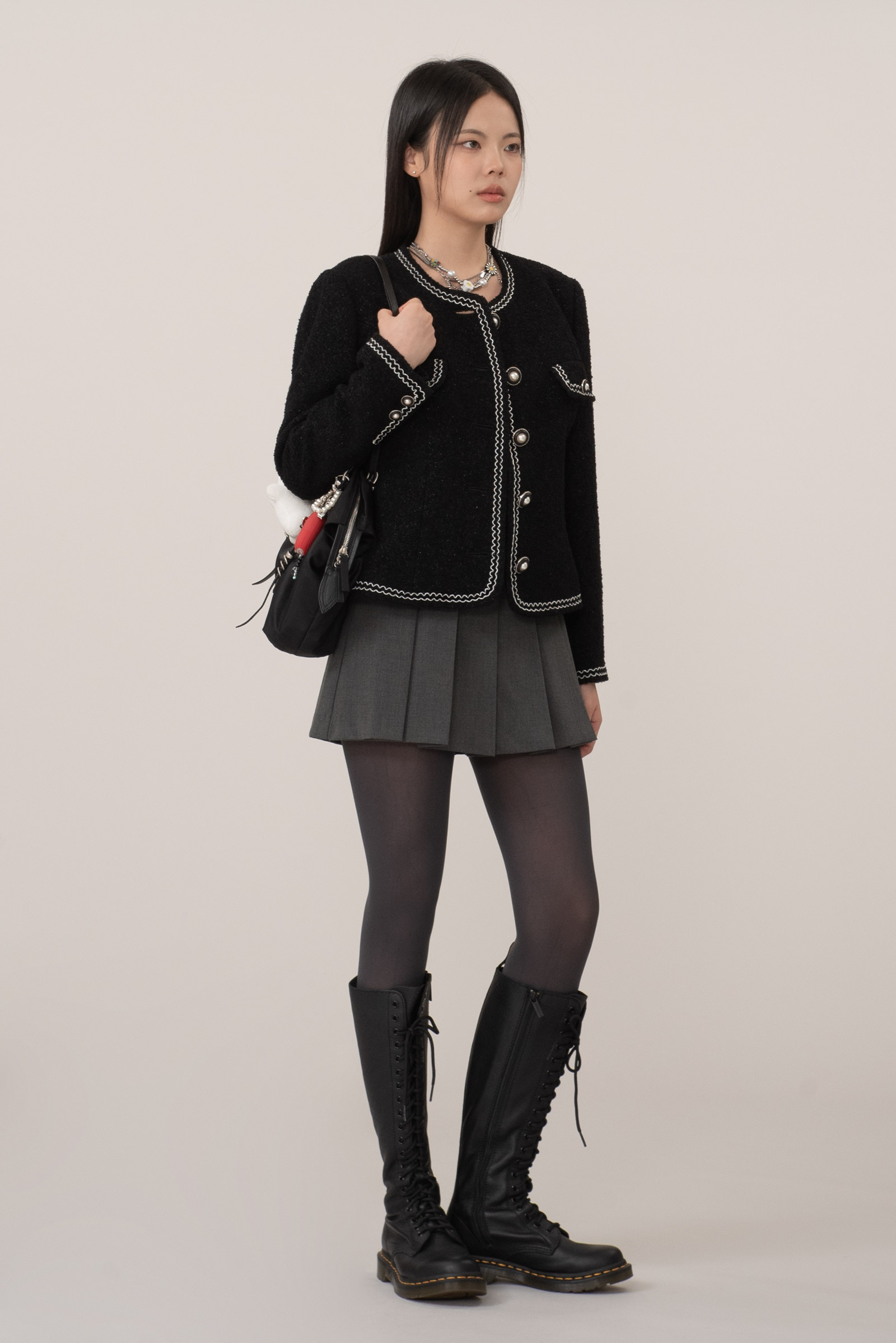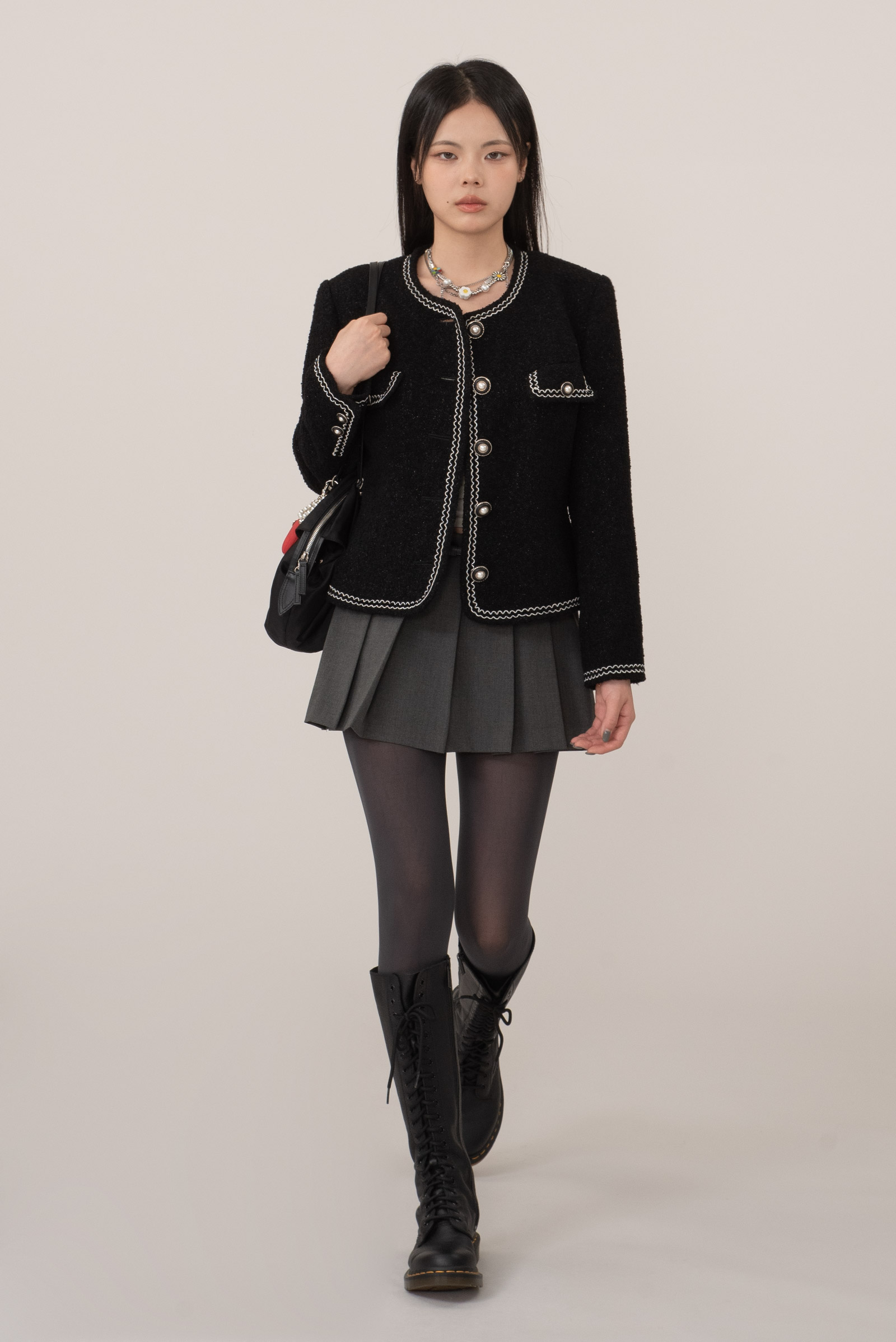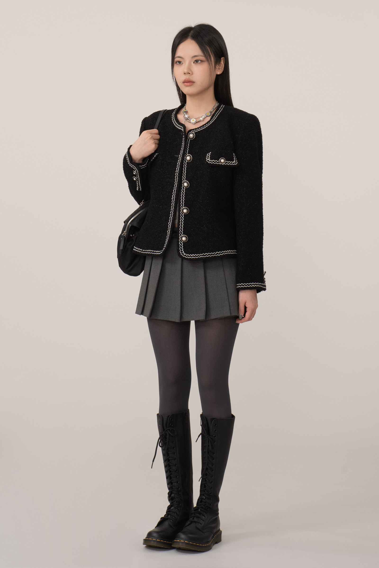 부드러운 세틴 안감으로 소재 마찰 없이 쾌적하게 착용되며 카라가 없는 크루넥이라 깔끔+시원해 보이는 효과, 진주 버튼 장식으로 포인트 되며 실버 트리밍 디테일로 캐주얼한 느낌까지 공존하기에 가용 범위가 넓어 쓰임이 다양하답니다.
