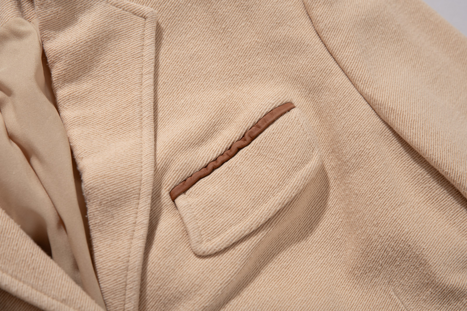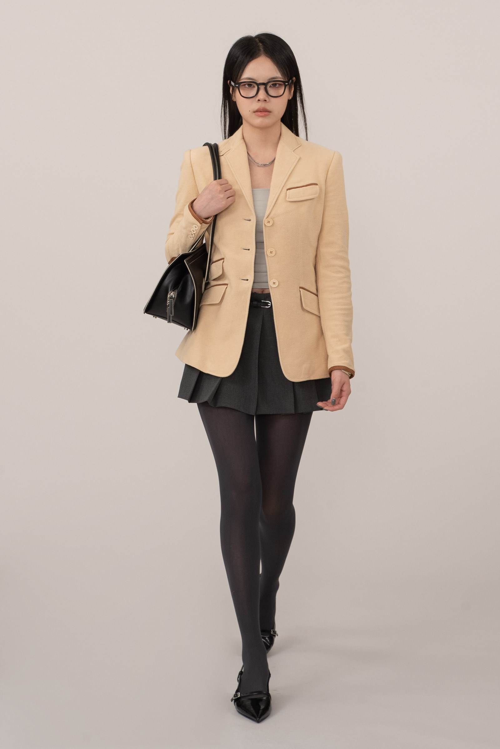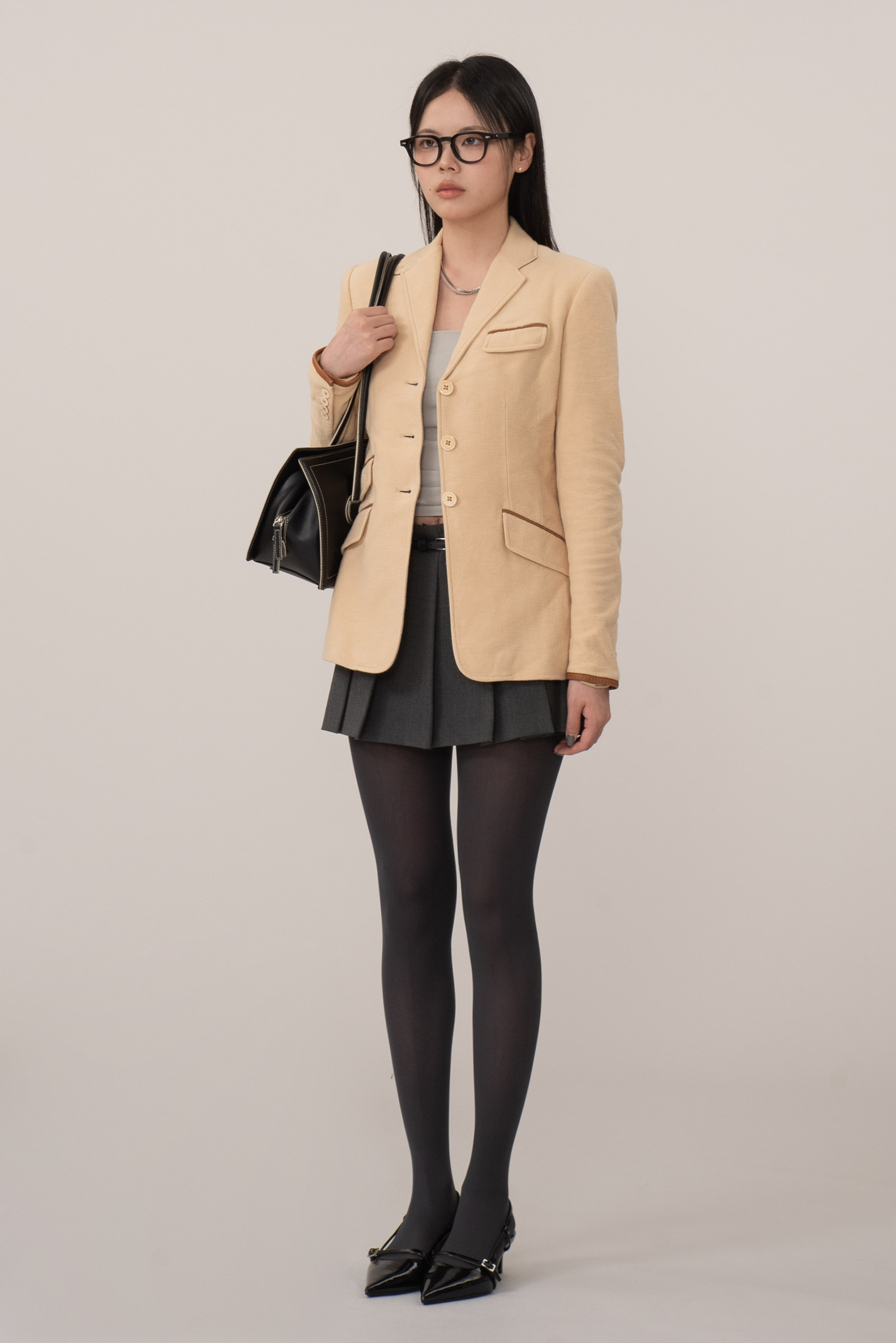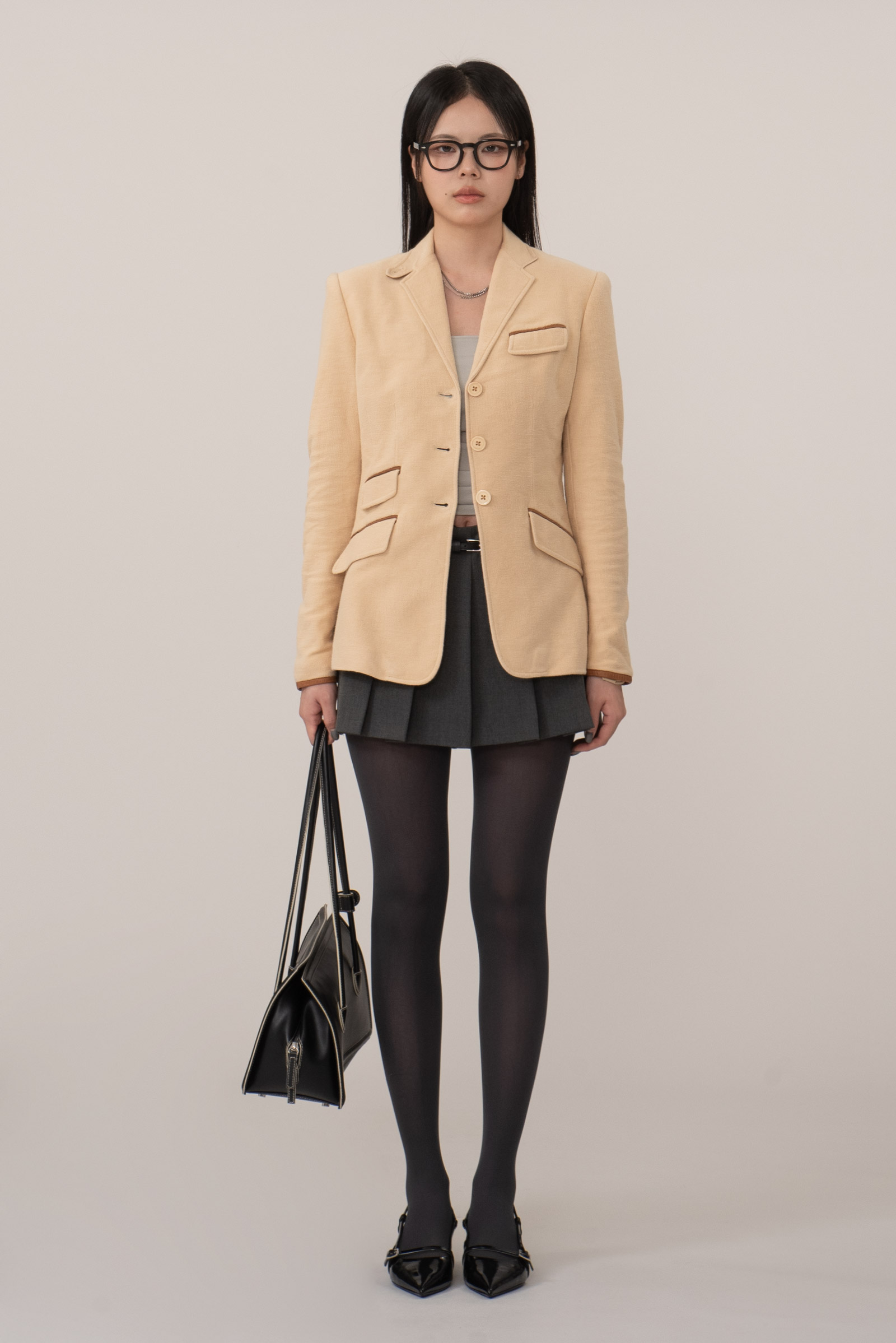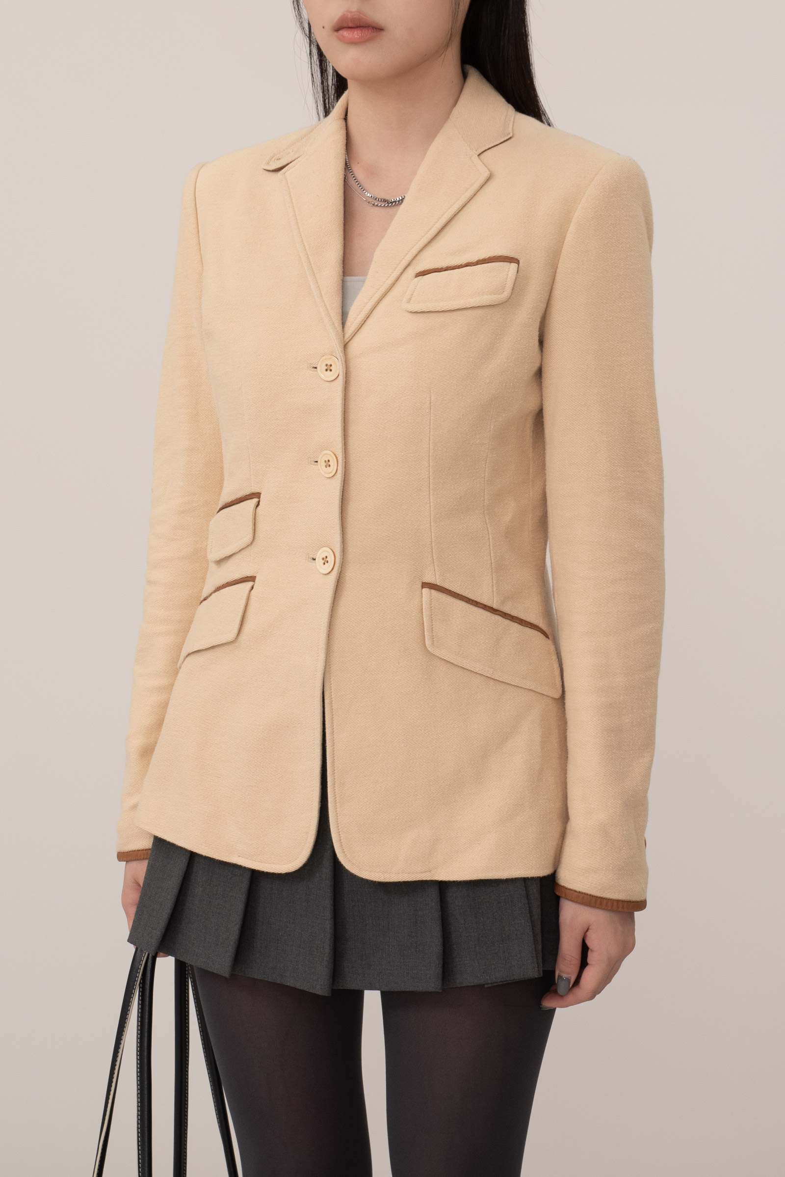 전면의 플랩 포켓 3개와 체스트 웰트 포켓, 다트 라인을 따라 떨어지는 테일러링은 여성스러운 실루엣을 살리면서도 구조적인 균형을 제공하며 매끄러운 폴리 안감으로 마무리되어 착용감 역시 부드럽고 안정적이네요.