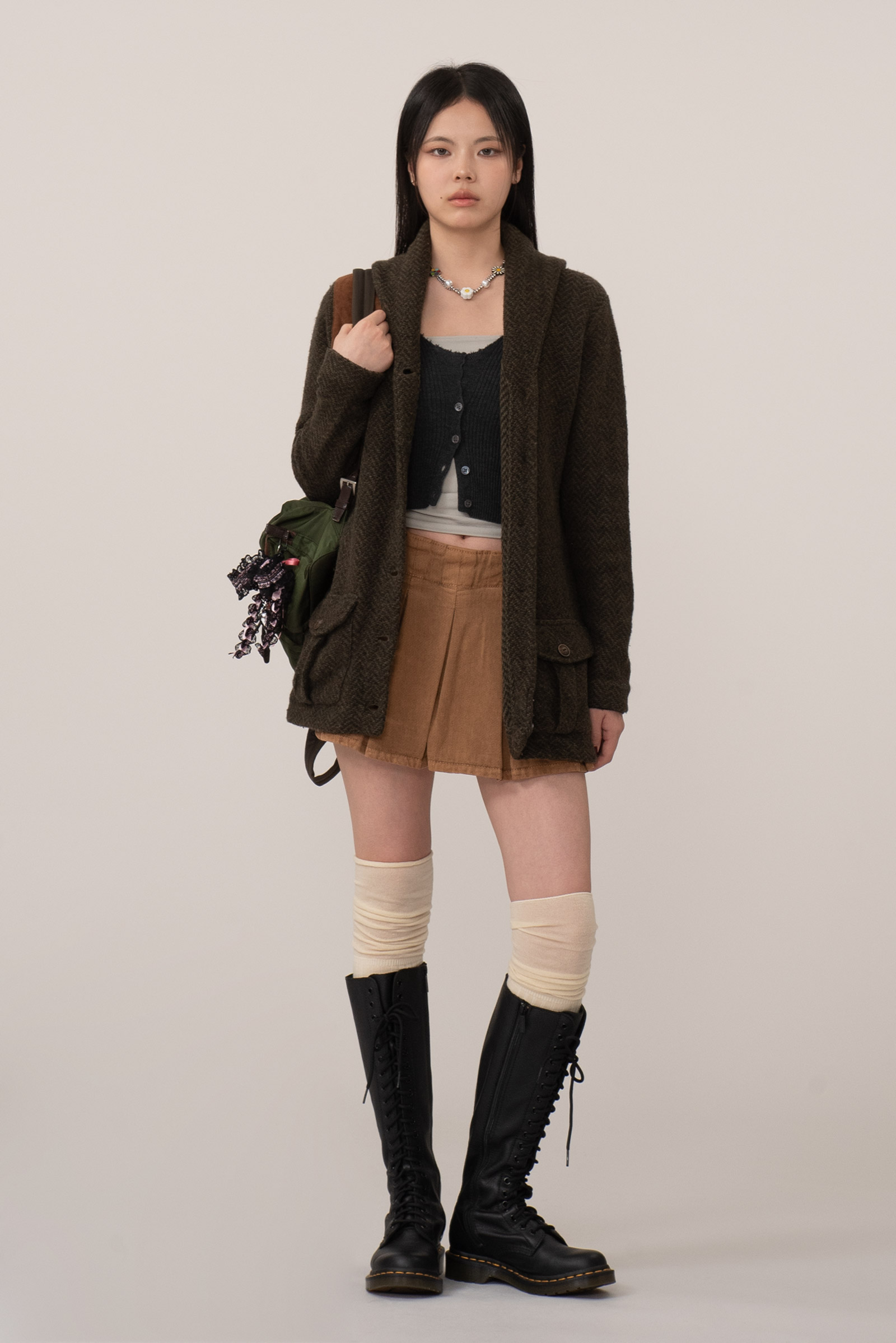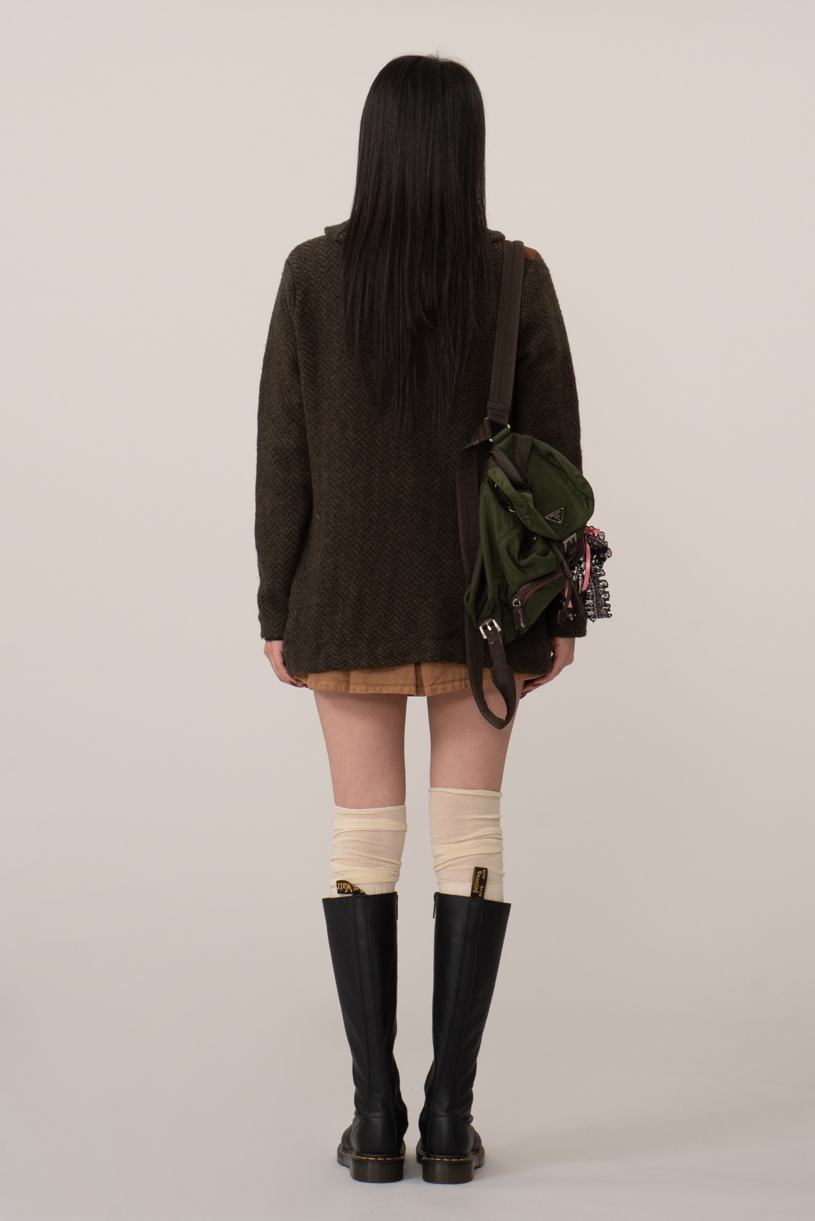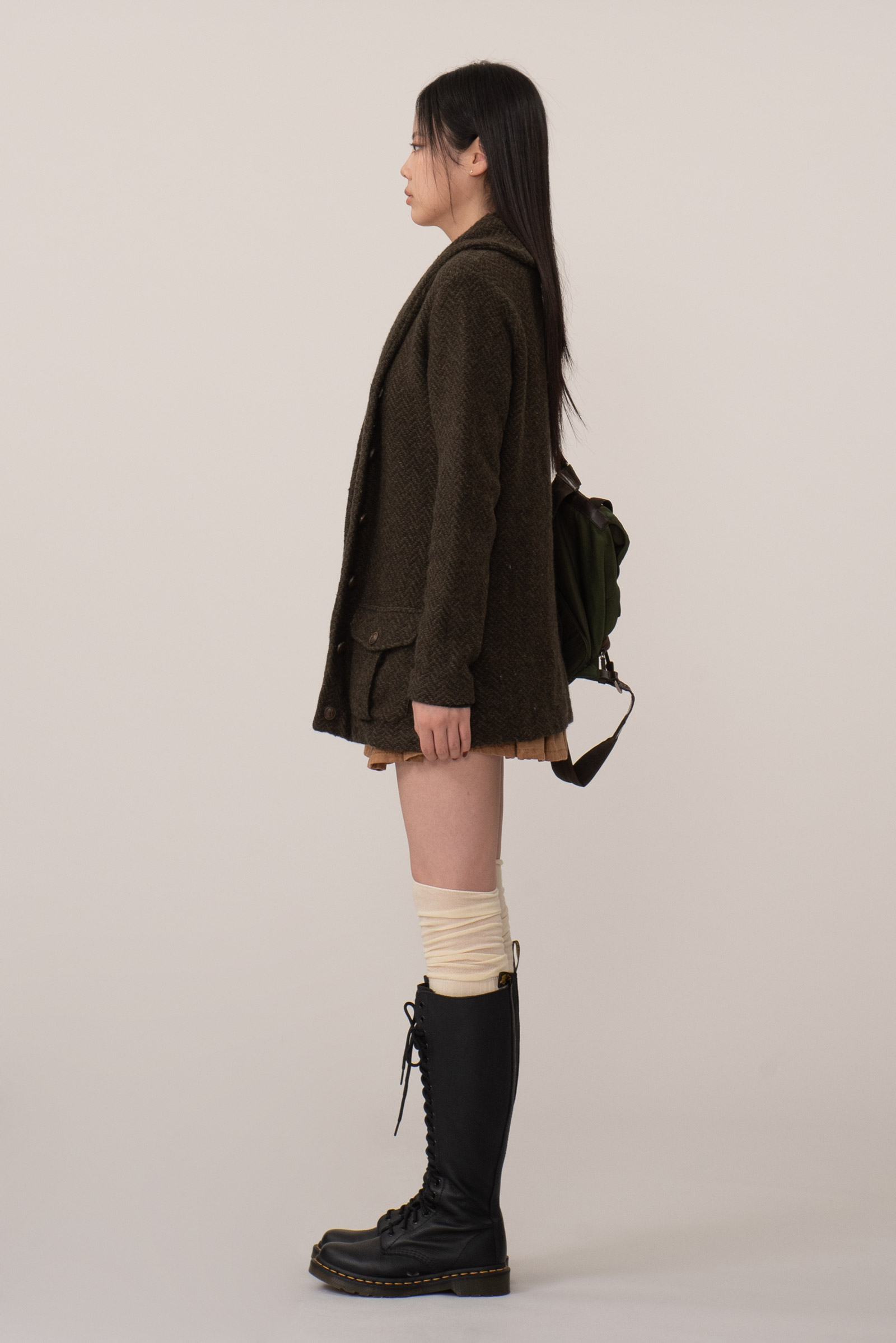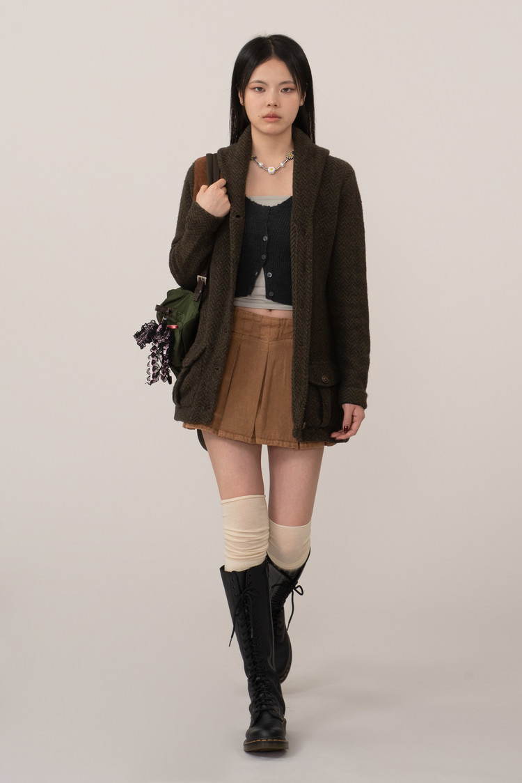 짙은 올리브 브라운 컬러에 fw 상징적인 헤링본 울 소재, 자연광에서 은은하게 결이 드러나는 고급스러운 질감을 지녔는데요.
