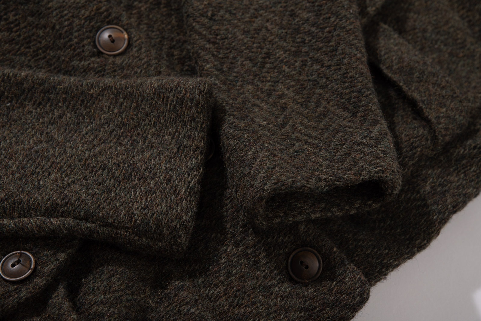 남성 스몰 사이즈라 여유 있는 실루엣, 목재 버튼과 플랩 포켓 디테일이 정통 브리티시 헌팅 자켓의 구조를 충실히 따르고 있네요.