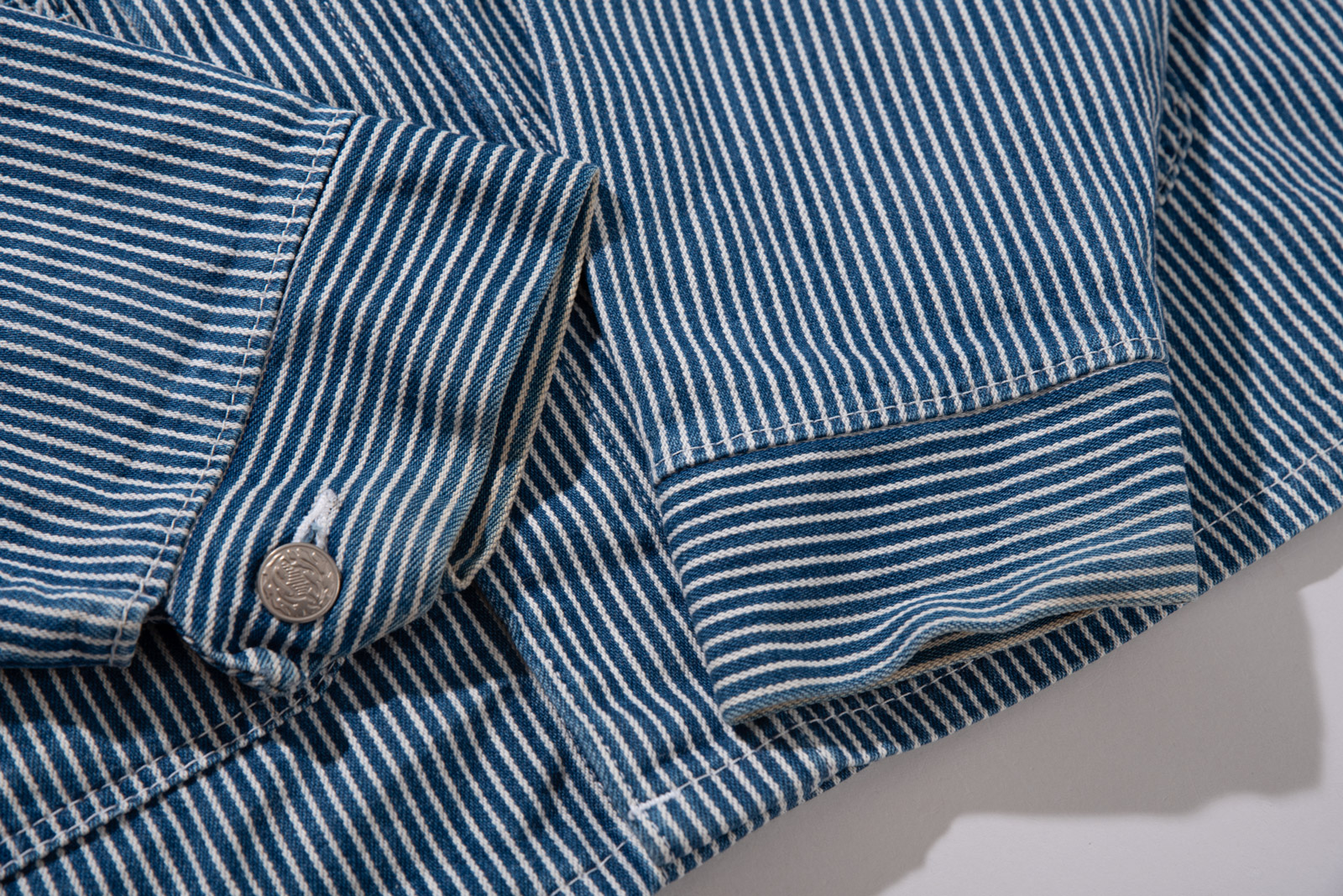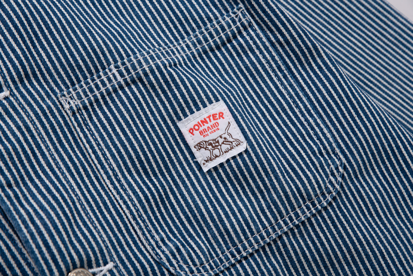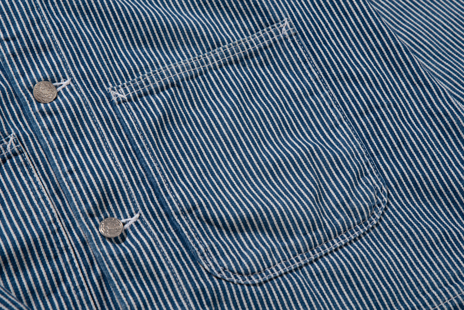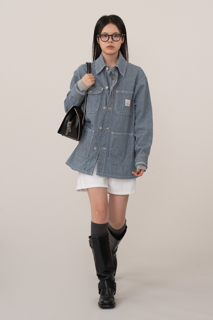 100% 코튼 히커리 스트라이프 특유의 블루, 화이트 스트라이프 패턴으로 데님과 캔버스 사이 밀도의 워크웨어 전용 원단으로 제작, 내구성이 좋고 형태가 쉽게 무너지지 않아 오랫동안 변형 없이 착용된답니다.