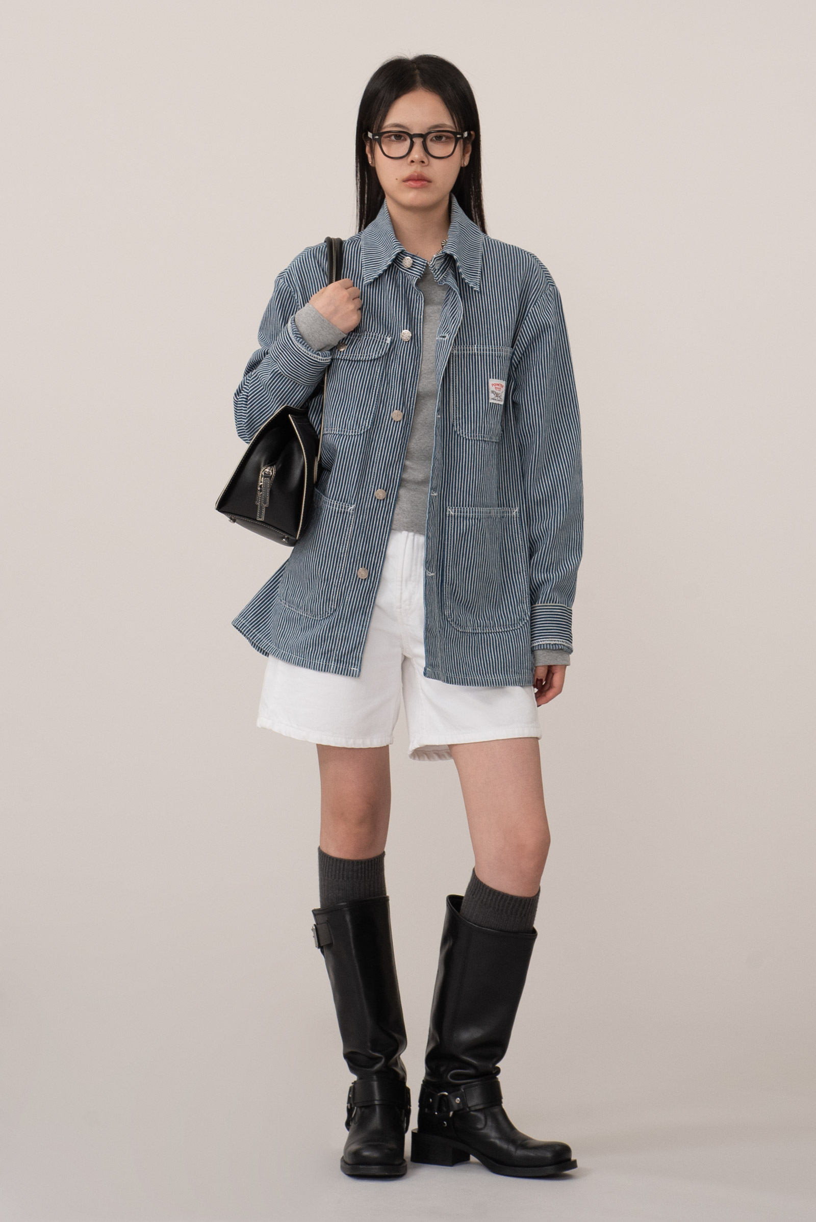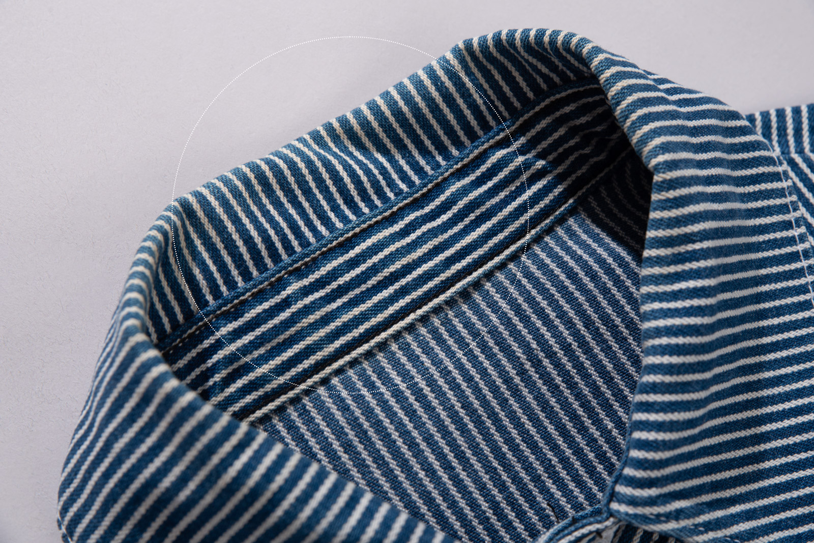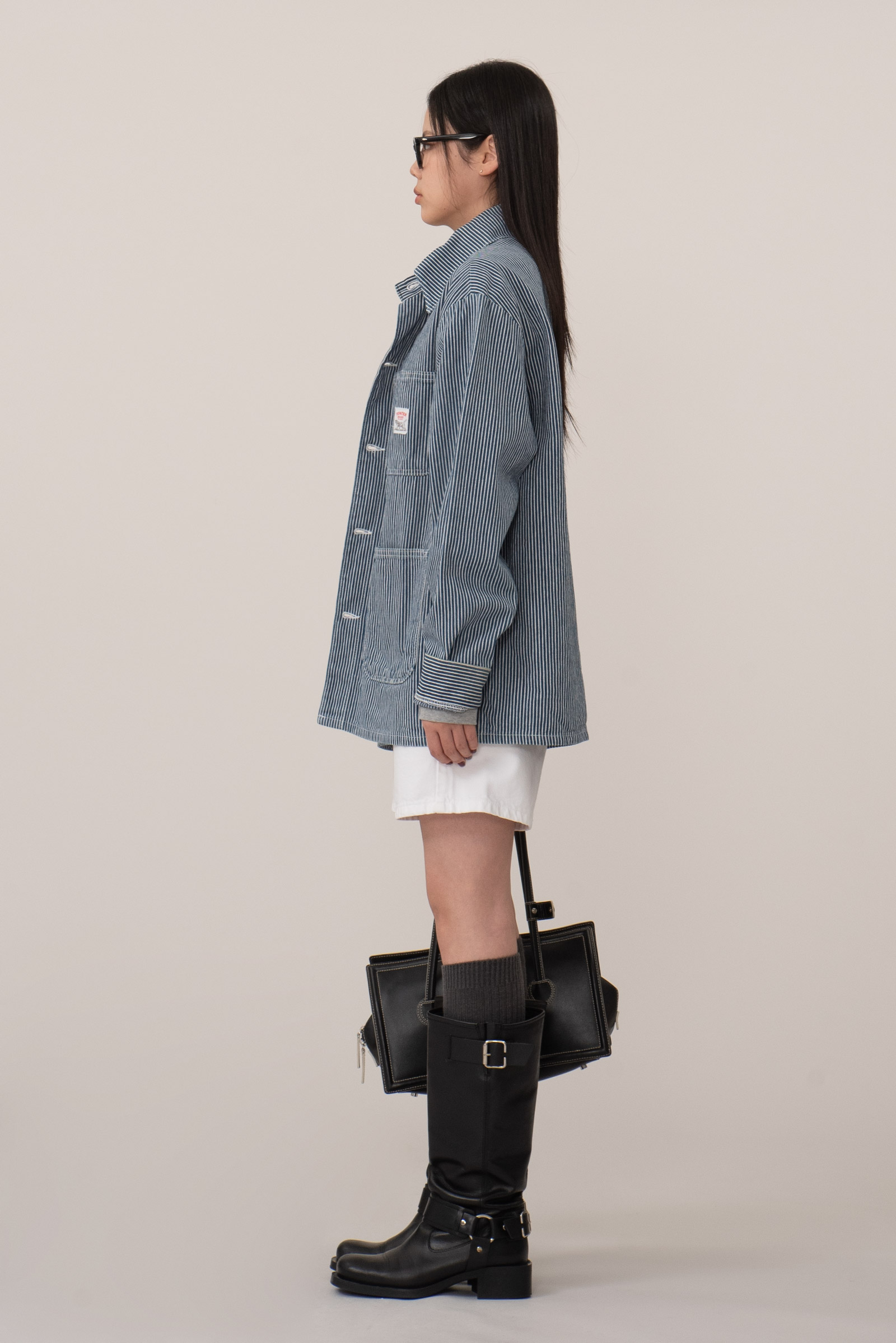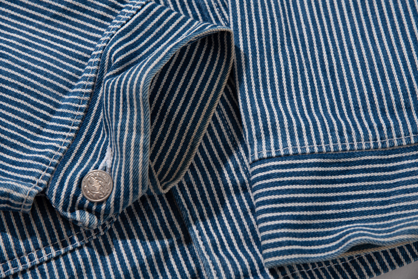 100% 코튼 히커리 스트라이프 특유의 블루, 화이트 스트라이프 패턴으로 데님과 캔버스 사이 밀도의 워크웨어 전용 원단으로 제작, 내구성이 좋고 형태가 쉽게 무너지지 않아 오랫동안 변형 없이 착용된답니다.