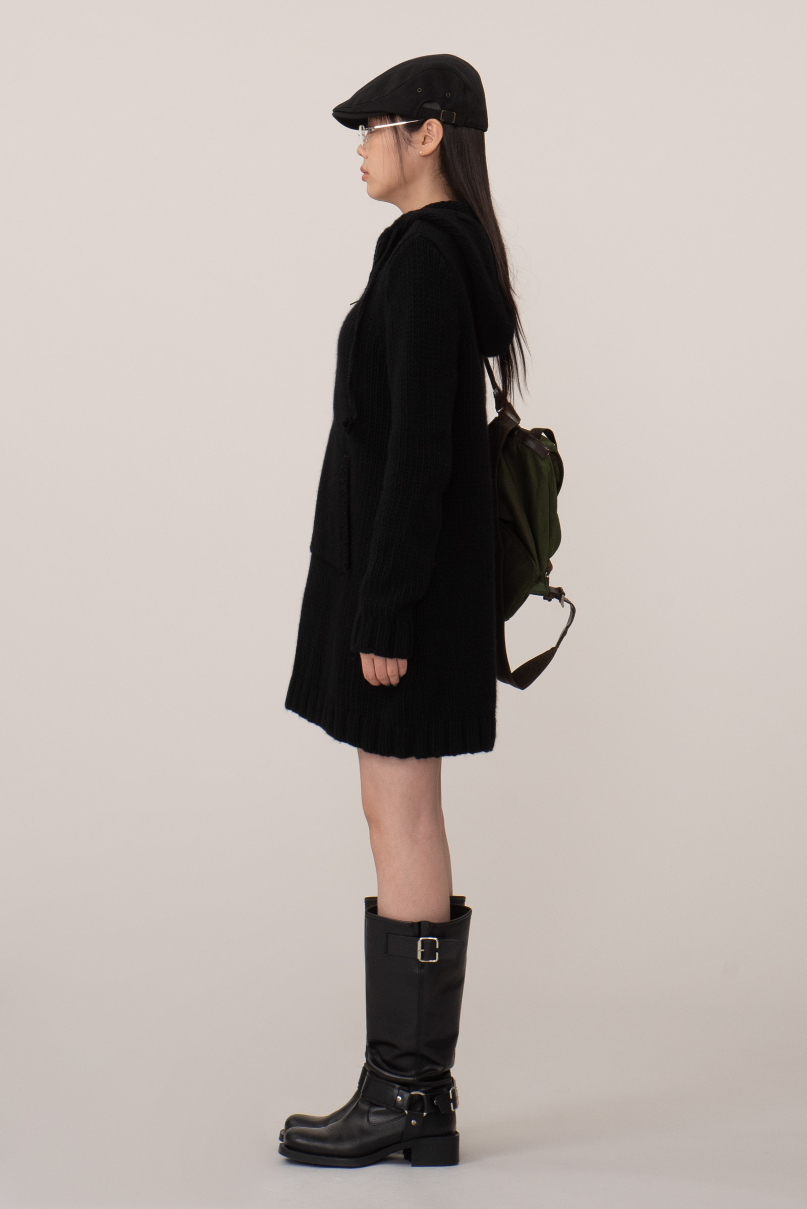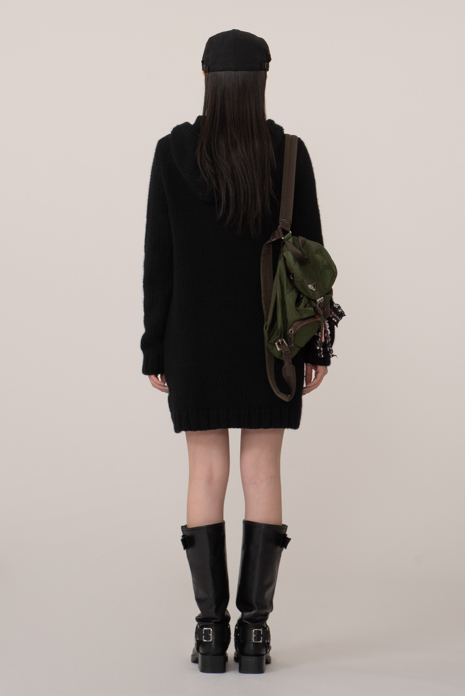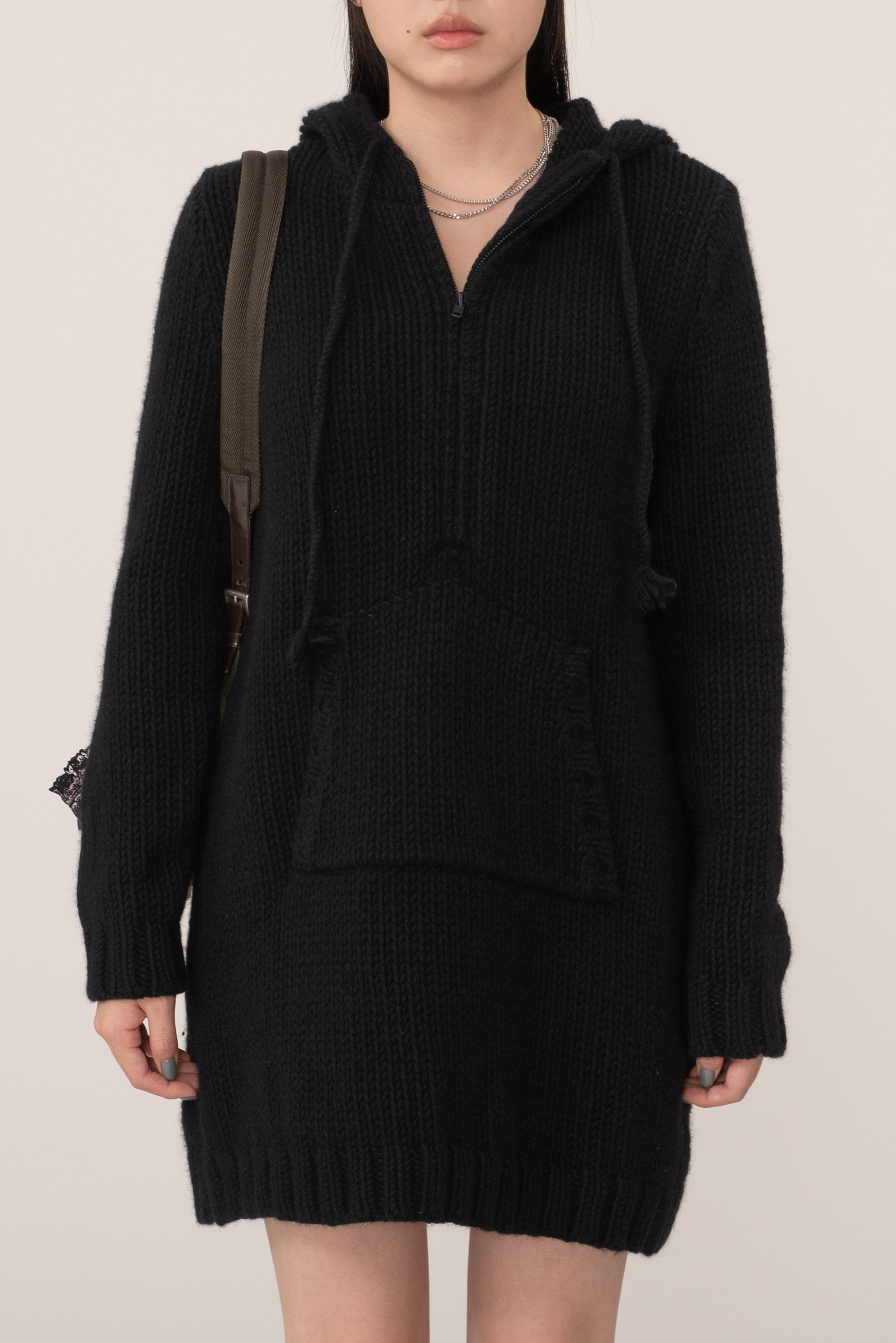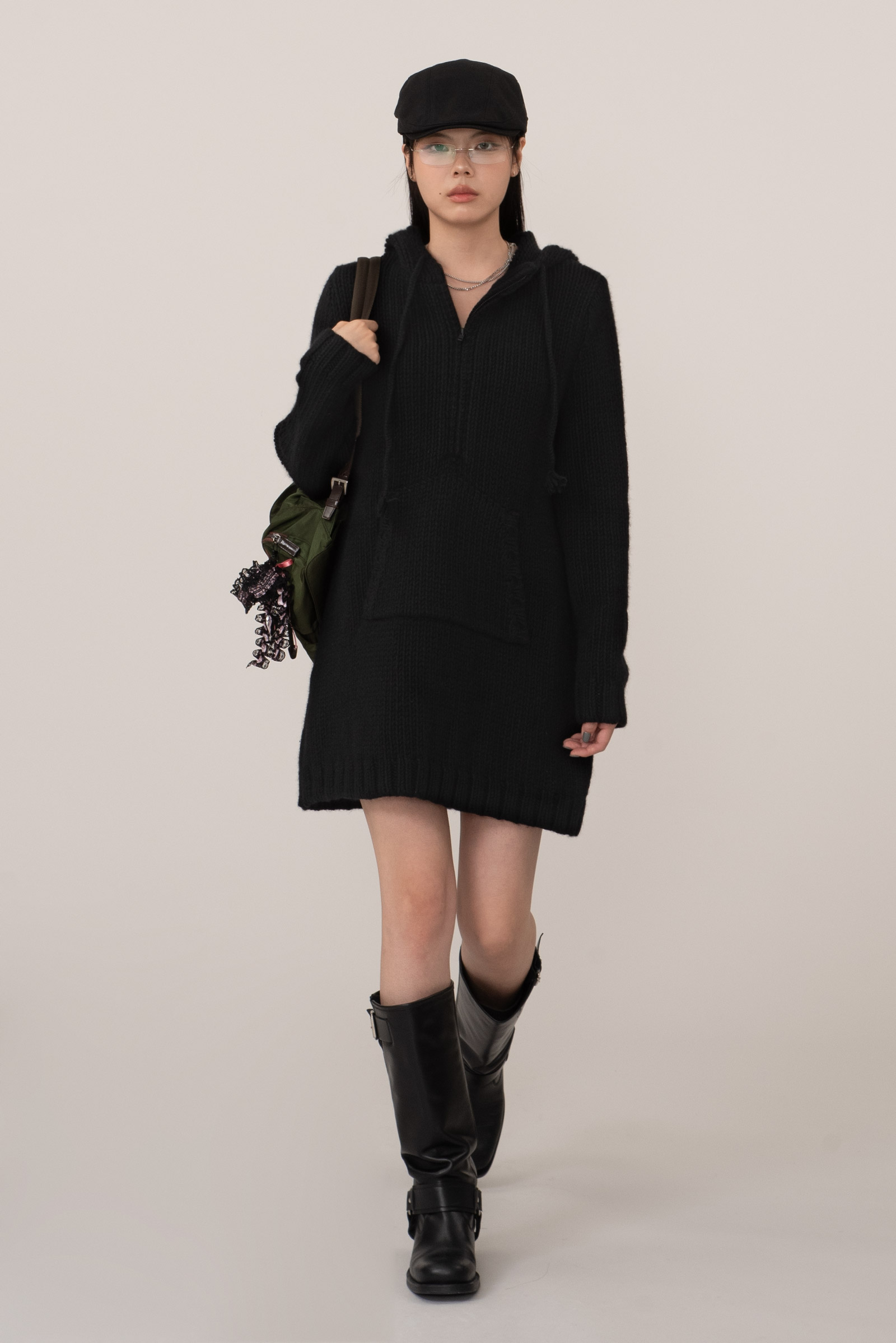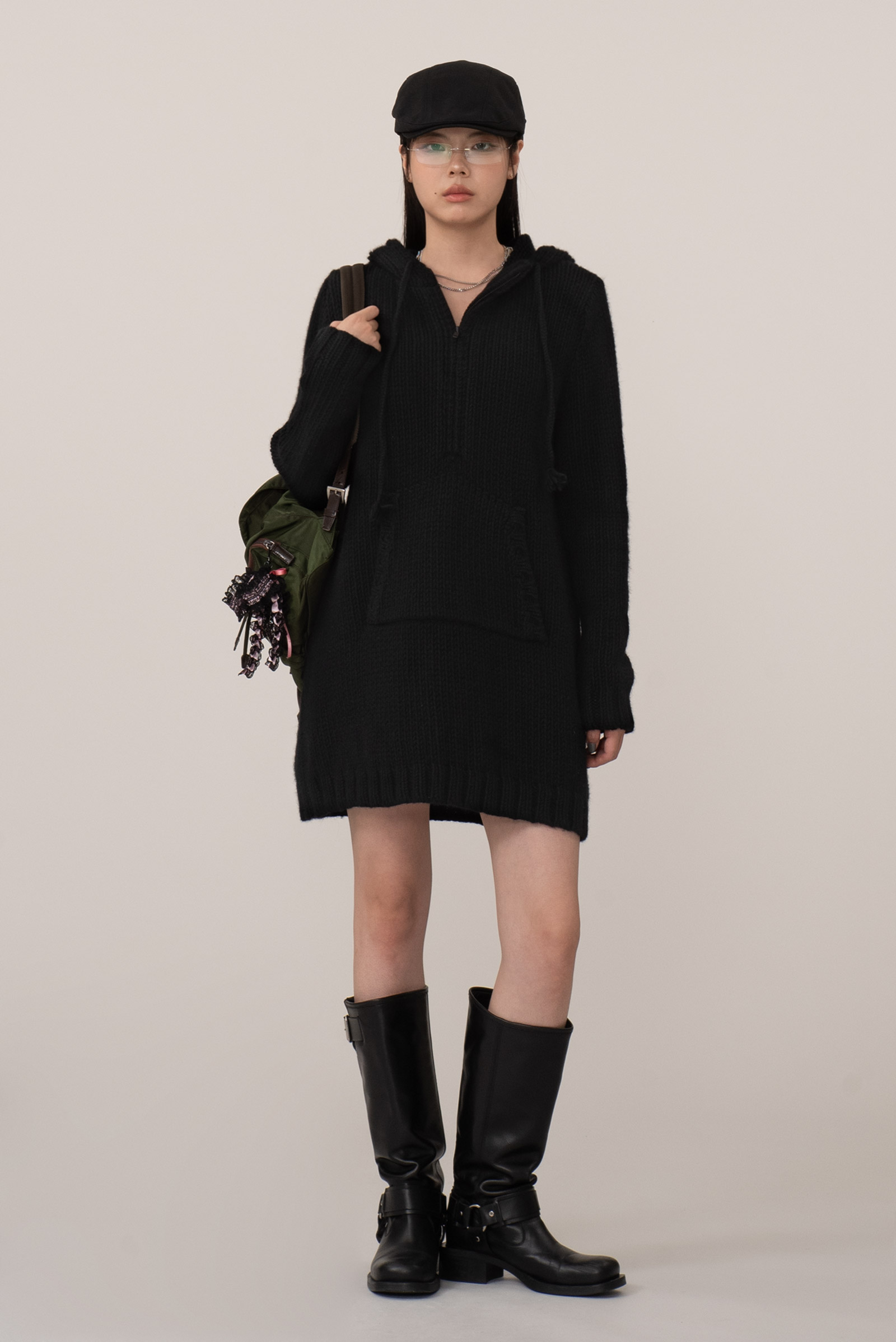 앞쪽에는 캥거루 포켓과 하프 집업 디테일이 적용되어 실용성과 함께 후드 스웨터의 편안함을 강조하며 기장이 일반 후디보다 길어 원피스 실루엣으로 착용됩니다.