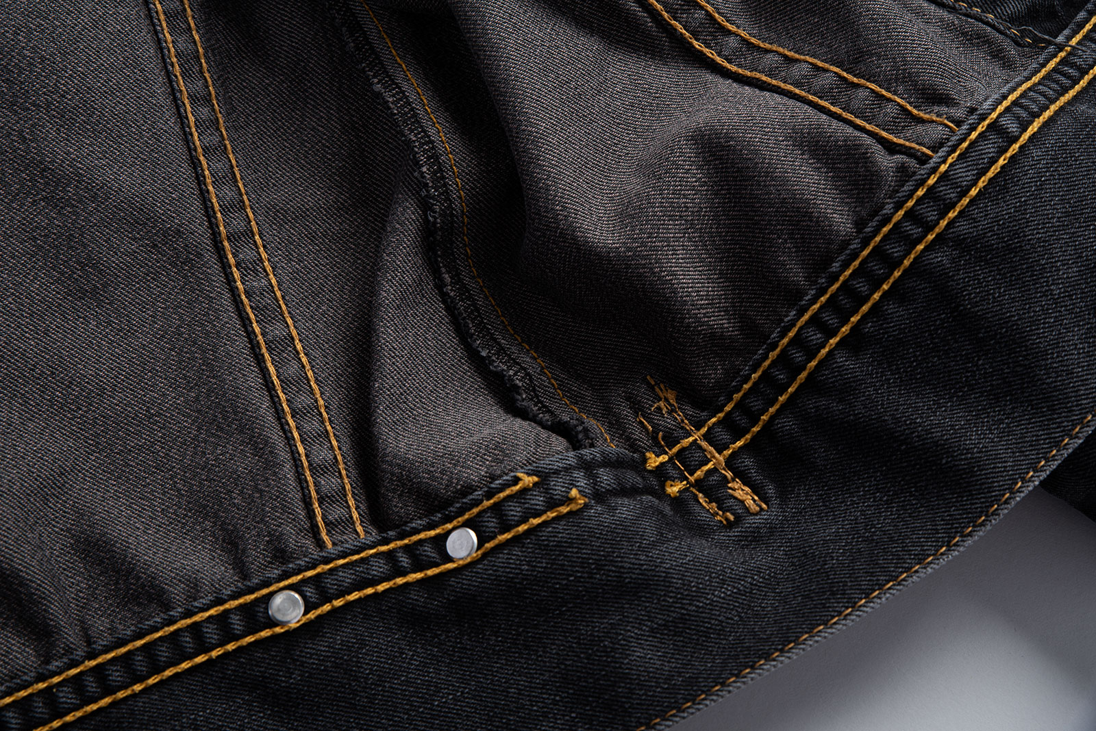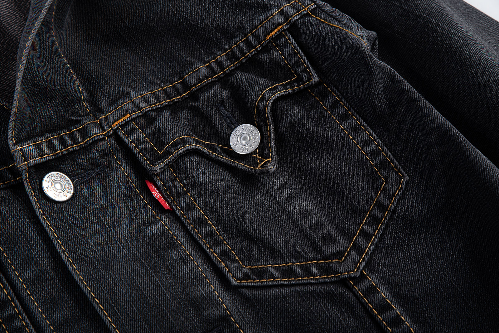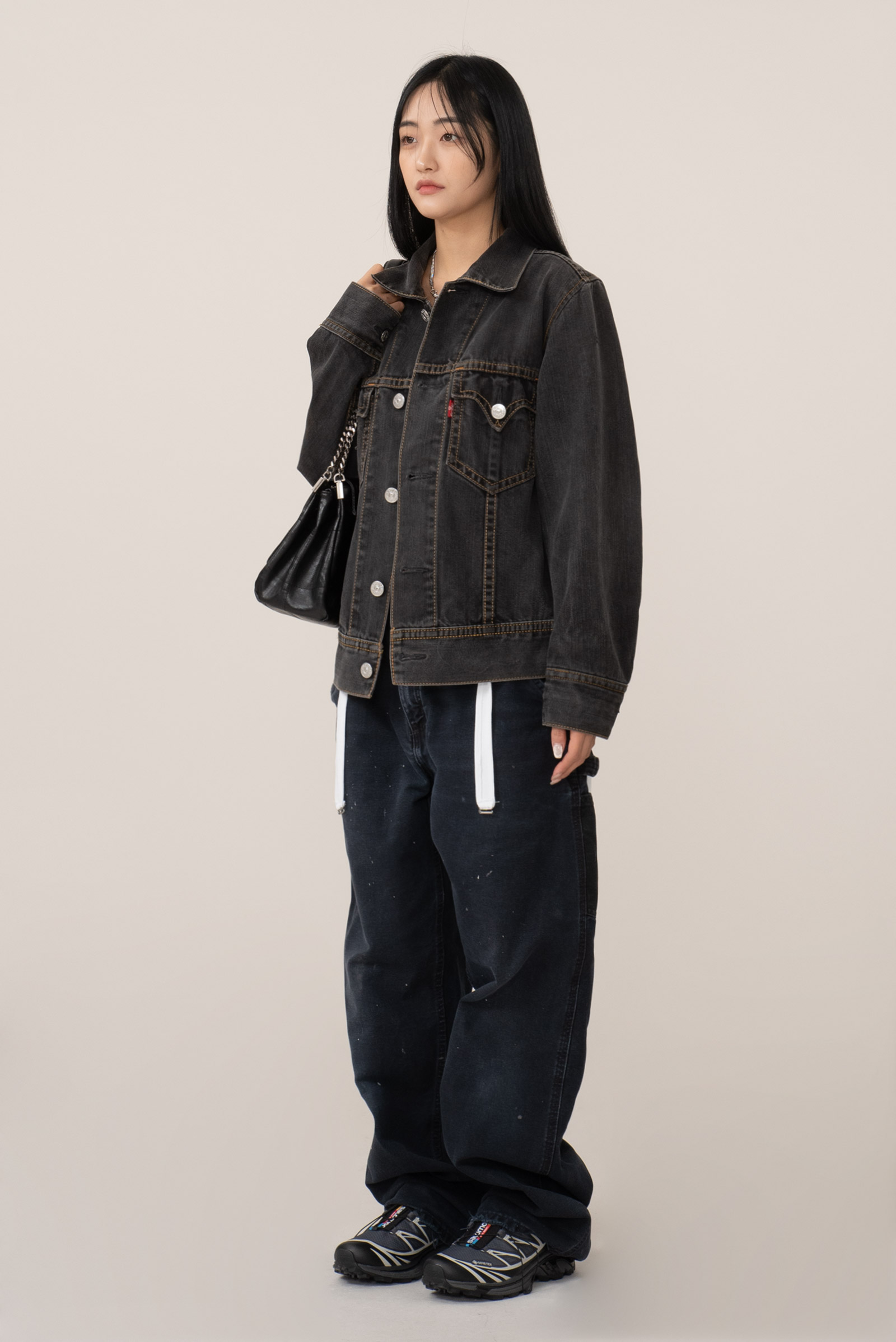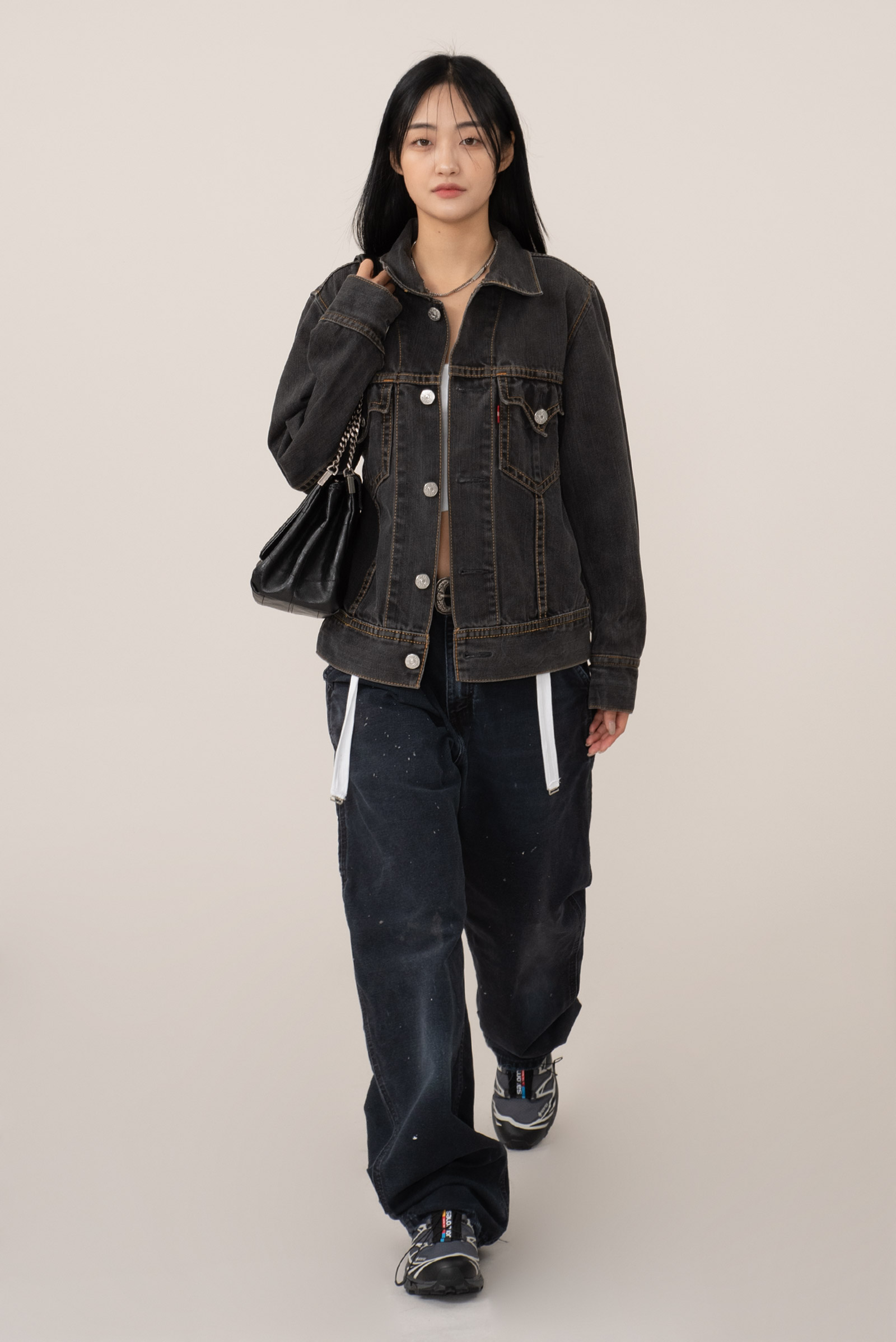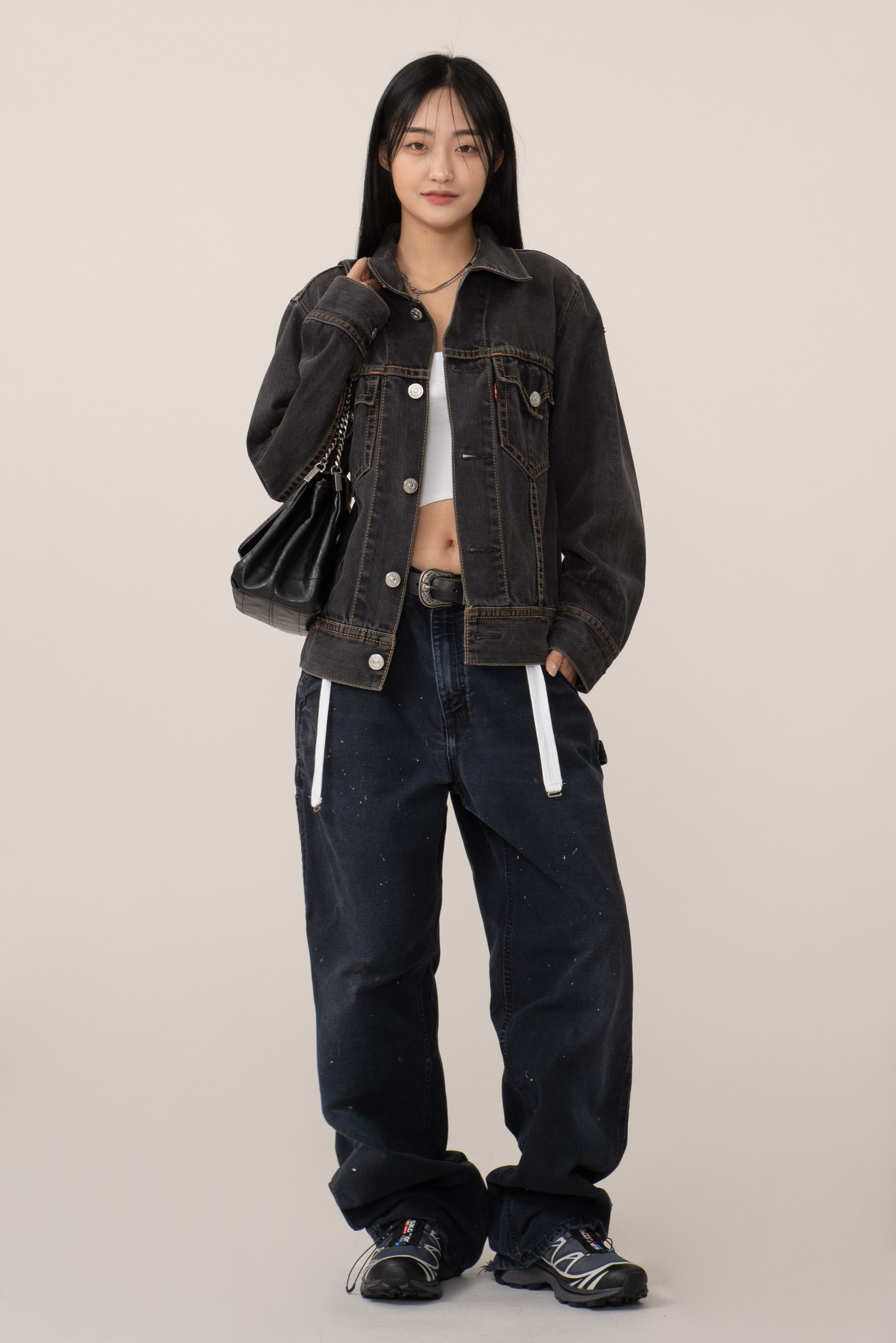 꽹과리(?) 같은 과한 버튼과 포켓 크기, 덮개 모양 등 즐길 거리도 많고 노란 스티치와 잘 어울리는 물 날린 흑청 컬러라 쉽고 편하게 스타일링하기 좋은 제품이에요.