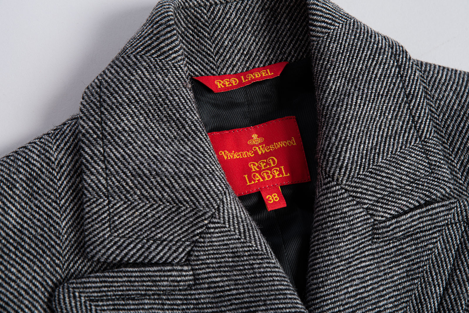 다양한 상징적 디자인 요소 중 하나인 커다란 라펠, 비비안웨스트우드스러운 브라운 컬러의 빅 버튼 디테일과 체스트 라인으로 굉장히 고급스럽고 우아하며 유려한 실루엣 연출되어요.