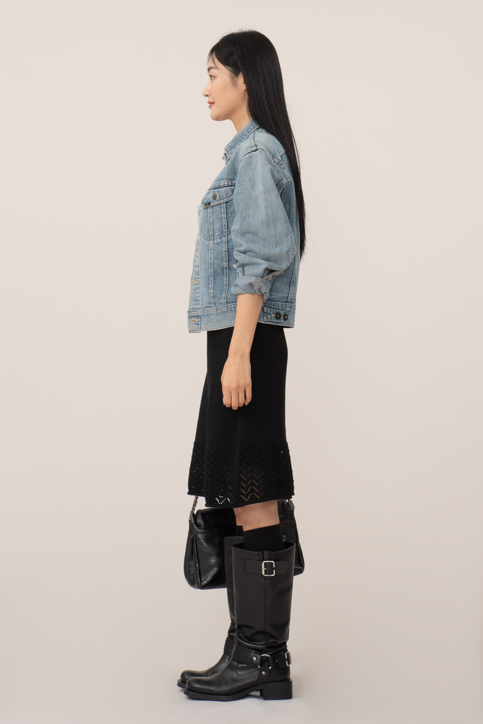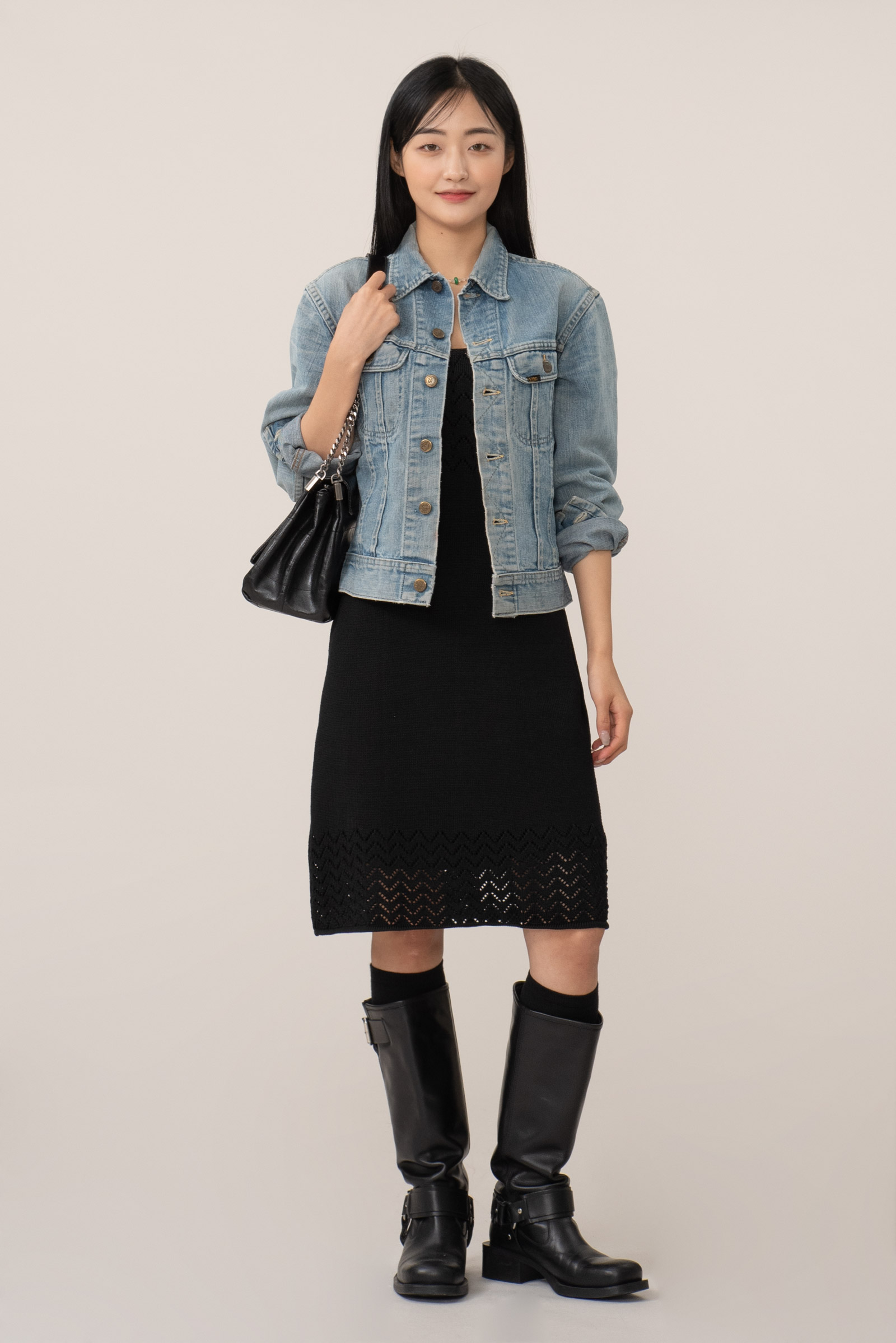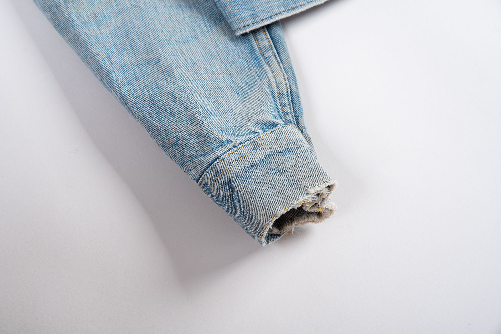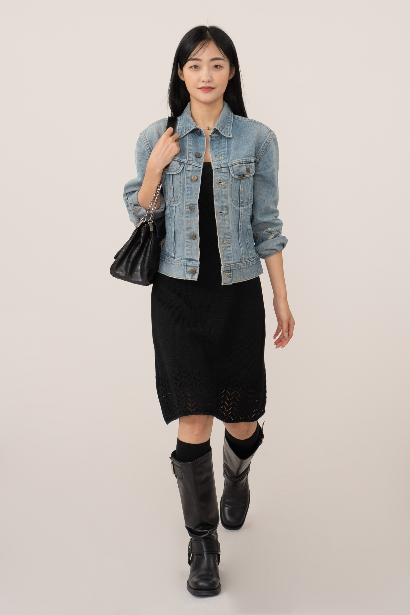 55 착용하시면 여유 있게 맞으며 빈티지 리 데님 재킷만의 숏한 기장감과 실루엣이 매력적입니다.