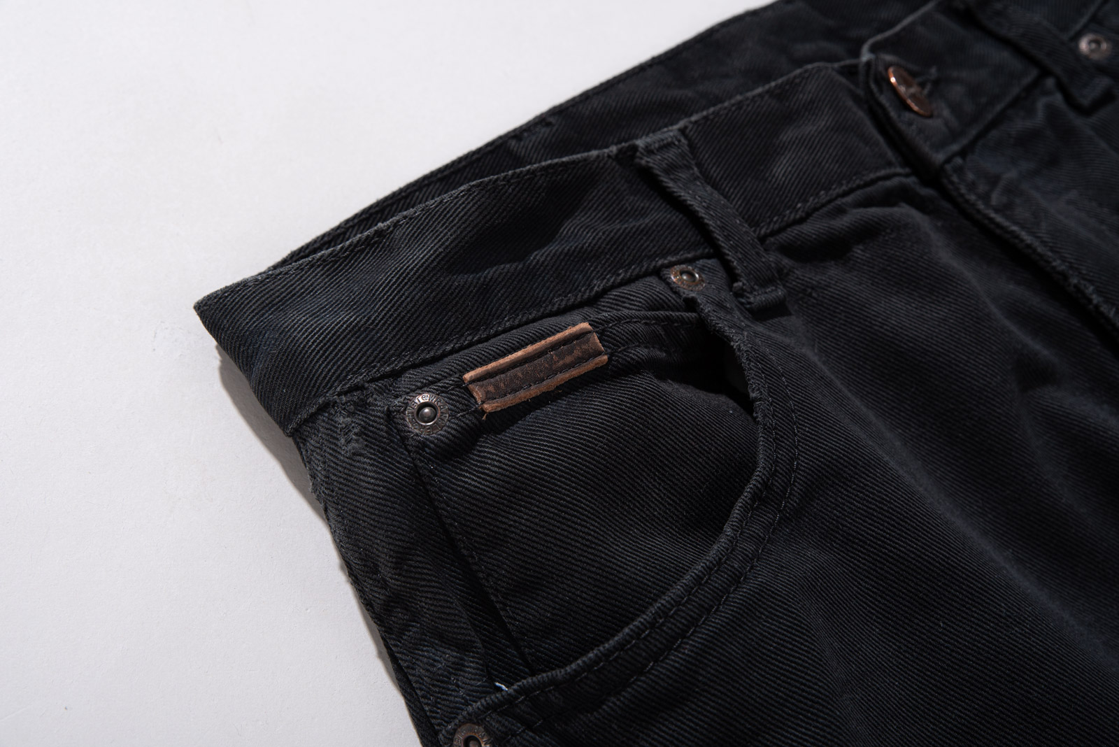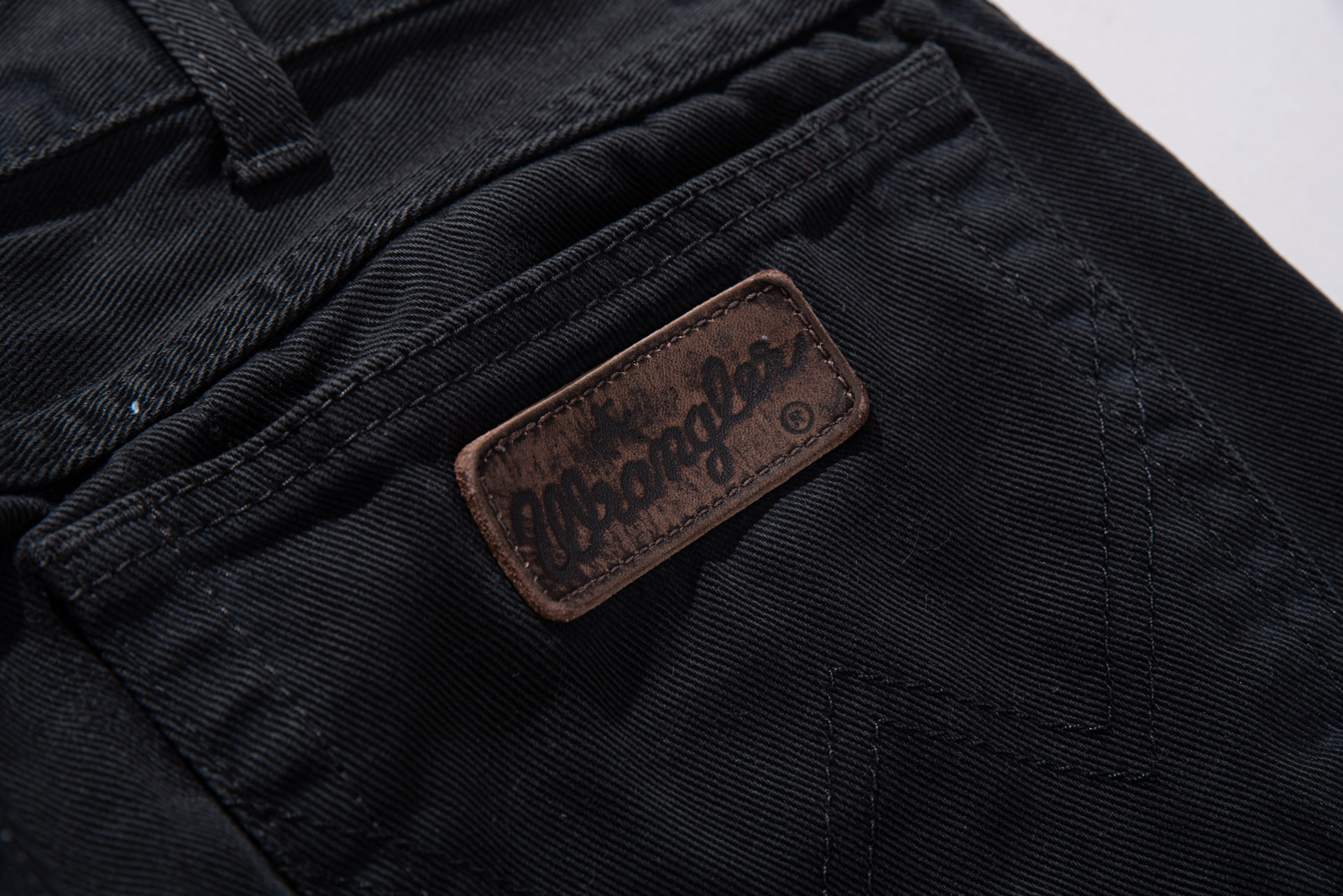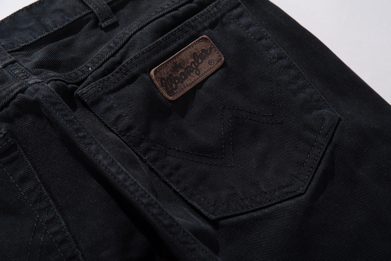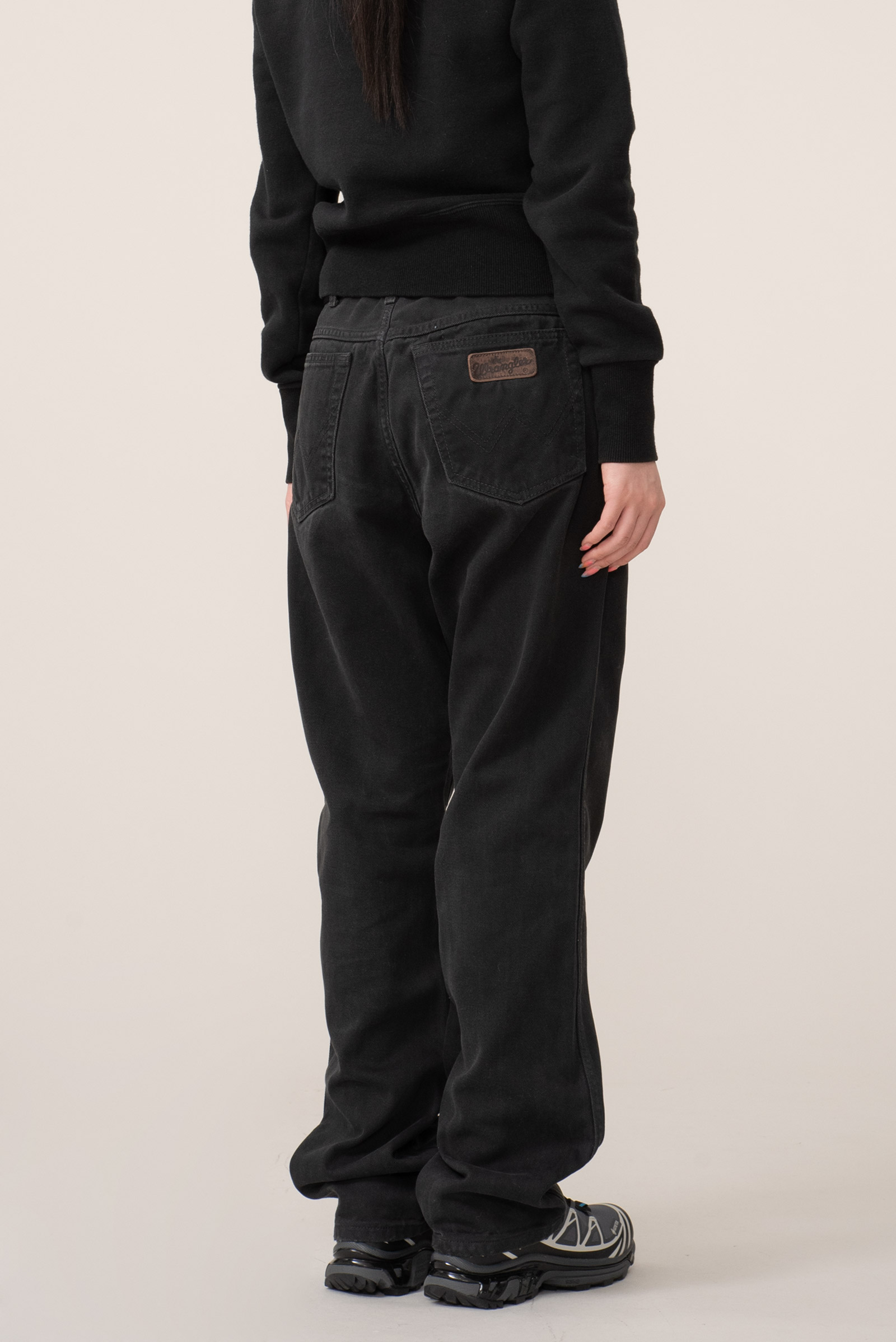 편안하게 착용되기 좋은 넉넉한 사이즈, 백 포켓의 랭글러 가죽 탭이 눈에 띕니다.
