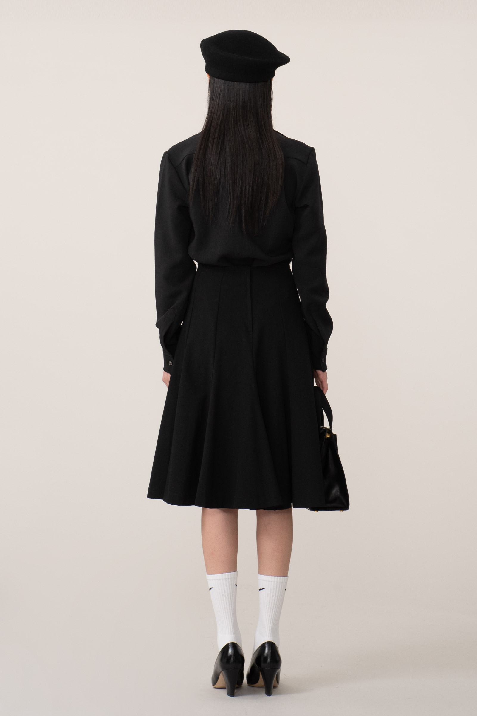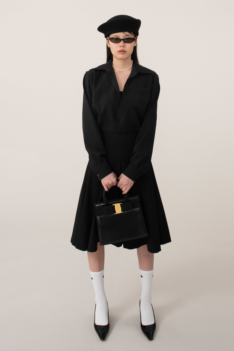 전면 절개 디자인 들어가 있으며 밑단이 양옆으로 좀 더 짧은 라운드 스타일이라 고급스러우면서도 귀엽고 발랄한 느낌이 공존하는 아이템입니다.