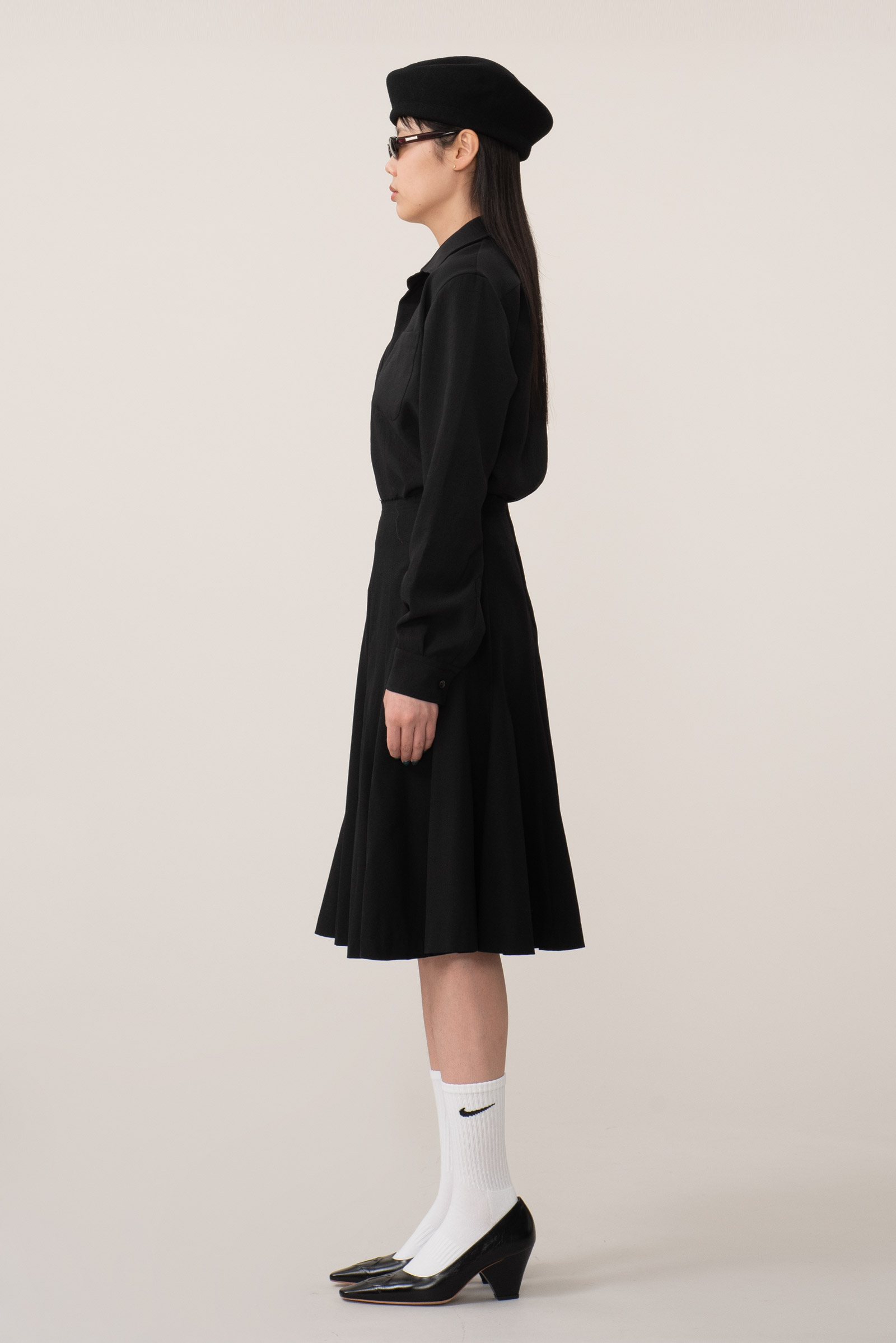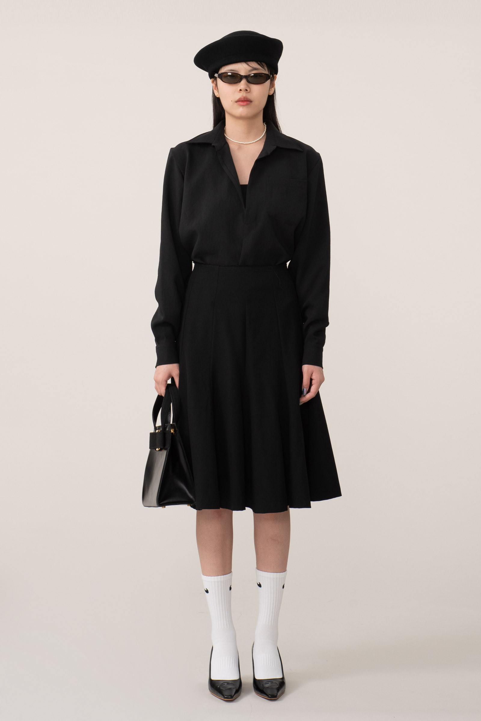 찰랑거리는 무거운 폴리 소재로 만들어져 아래로 차르르 떨어지는 실루엣이 고급스러우며 은은한 광택이 돌아요.