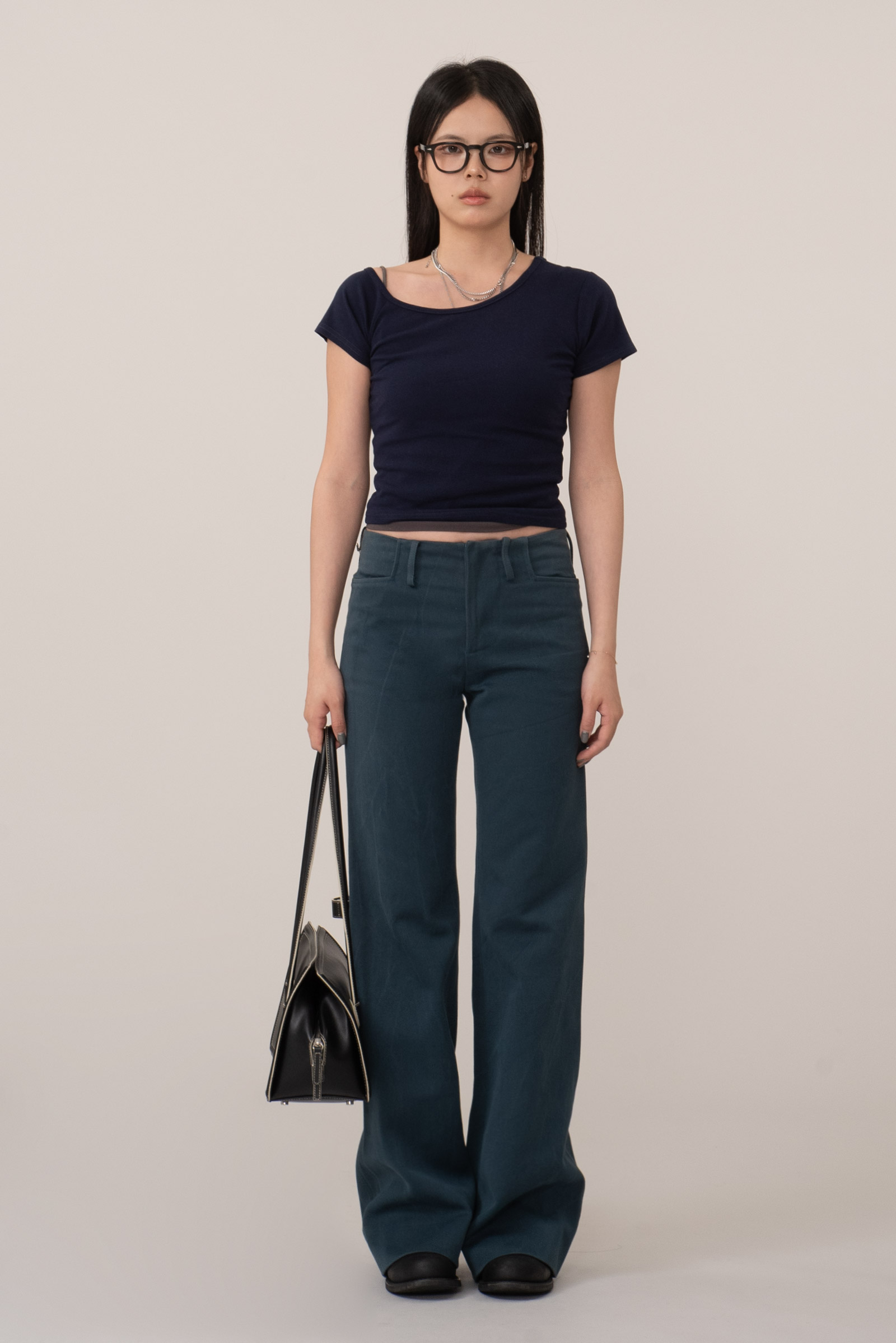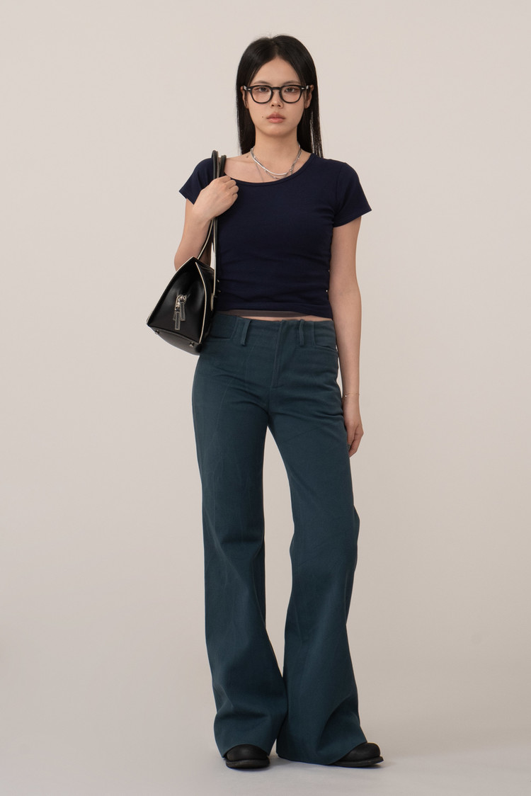리드미컬하고 도회적인 느낌의 미드 라이즈, 상 하체의 밸런스를 안정적으로 잡아주며 고정 프론트 플랫 구조의 깔끔한 마감, 미니멀한 웰트 포켓 등 마르니만의 아방가르드한 감성이 느껴지는 디자인이에요.