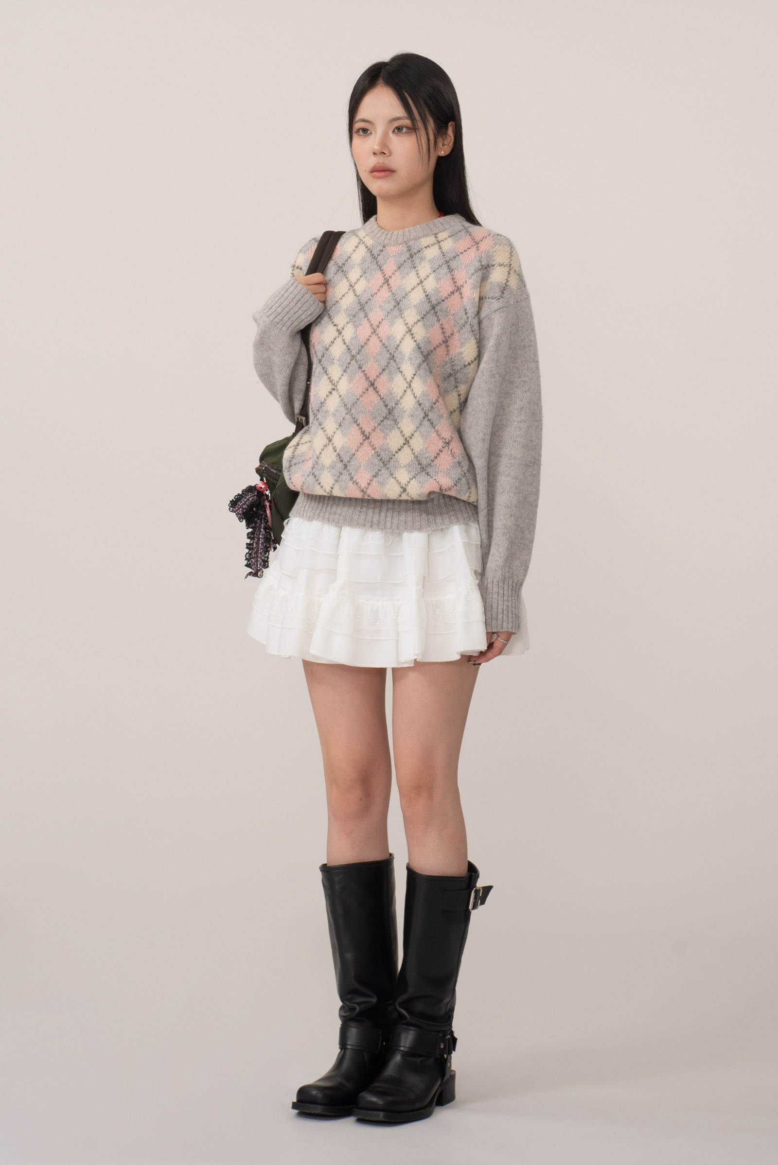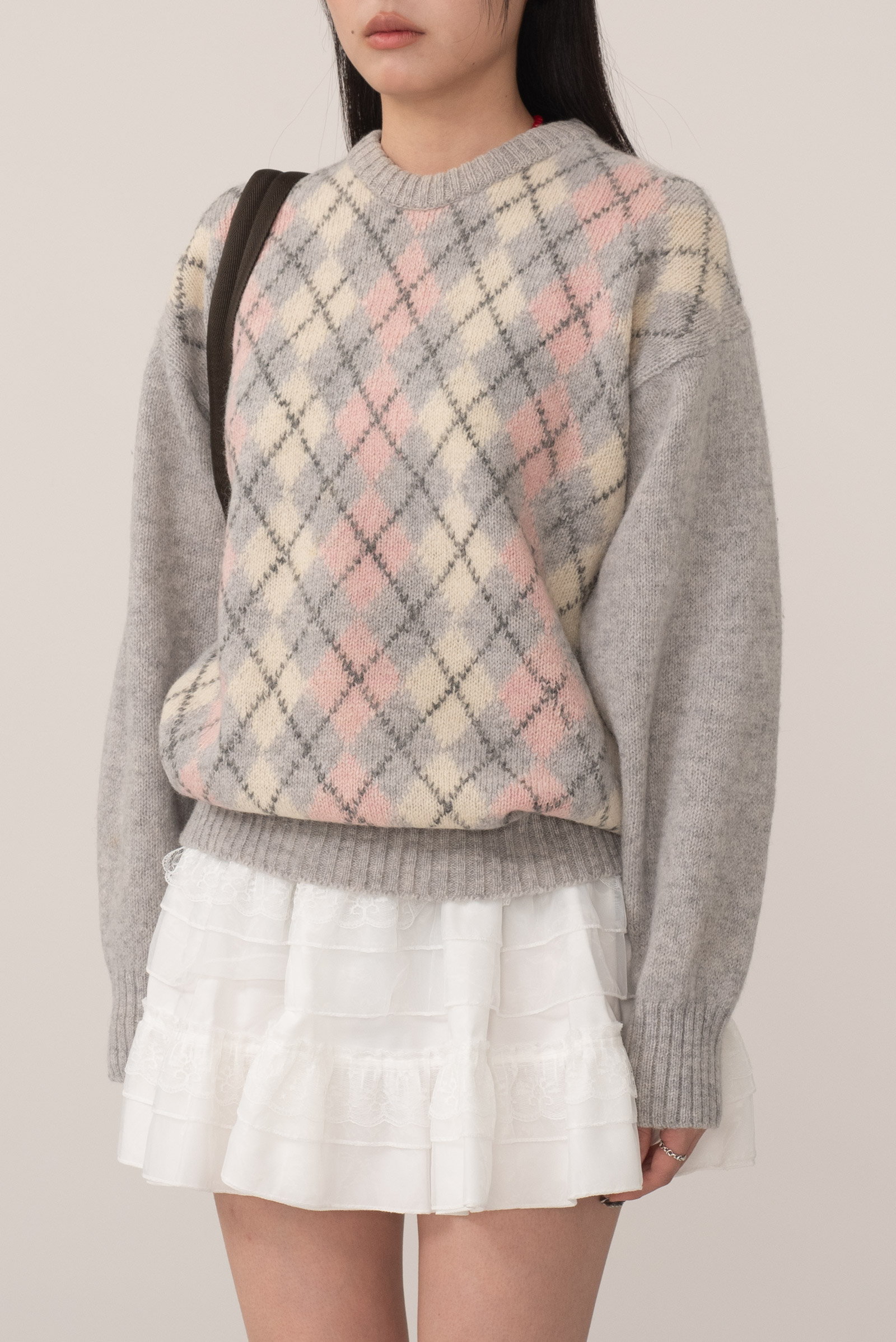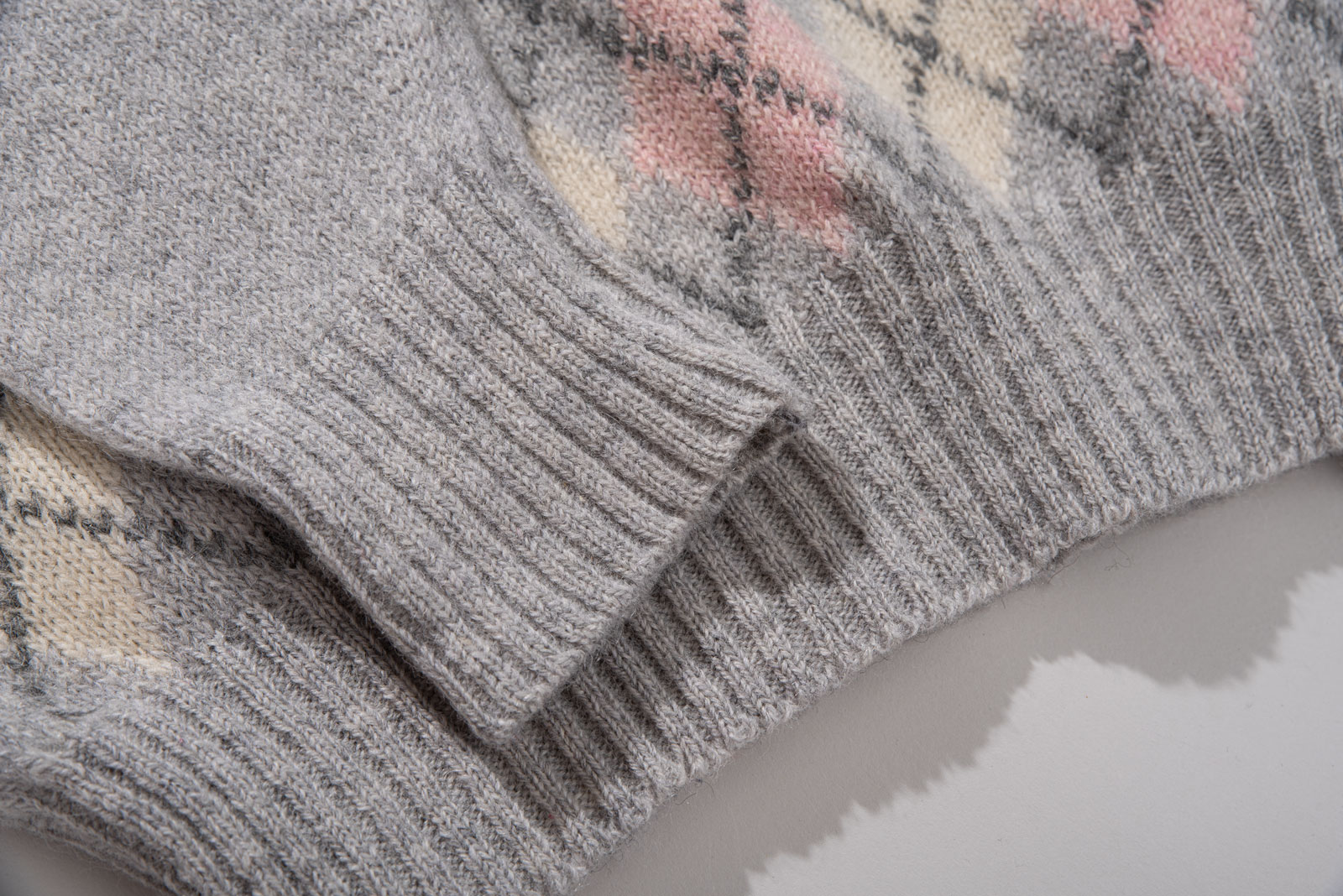 부드러운 색감의 그레이 바탕에 아가일 패턴으로 기본이 되는 실루엣이라 유행 없이 착용되고요.