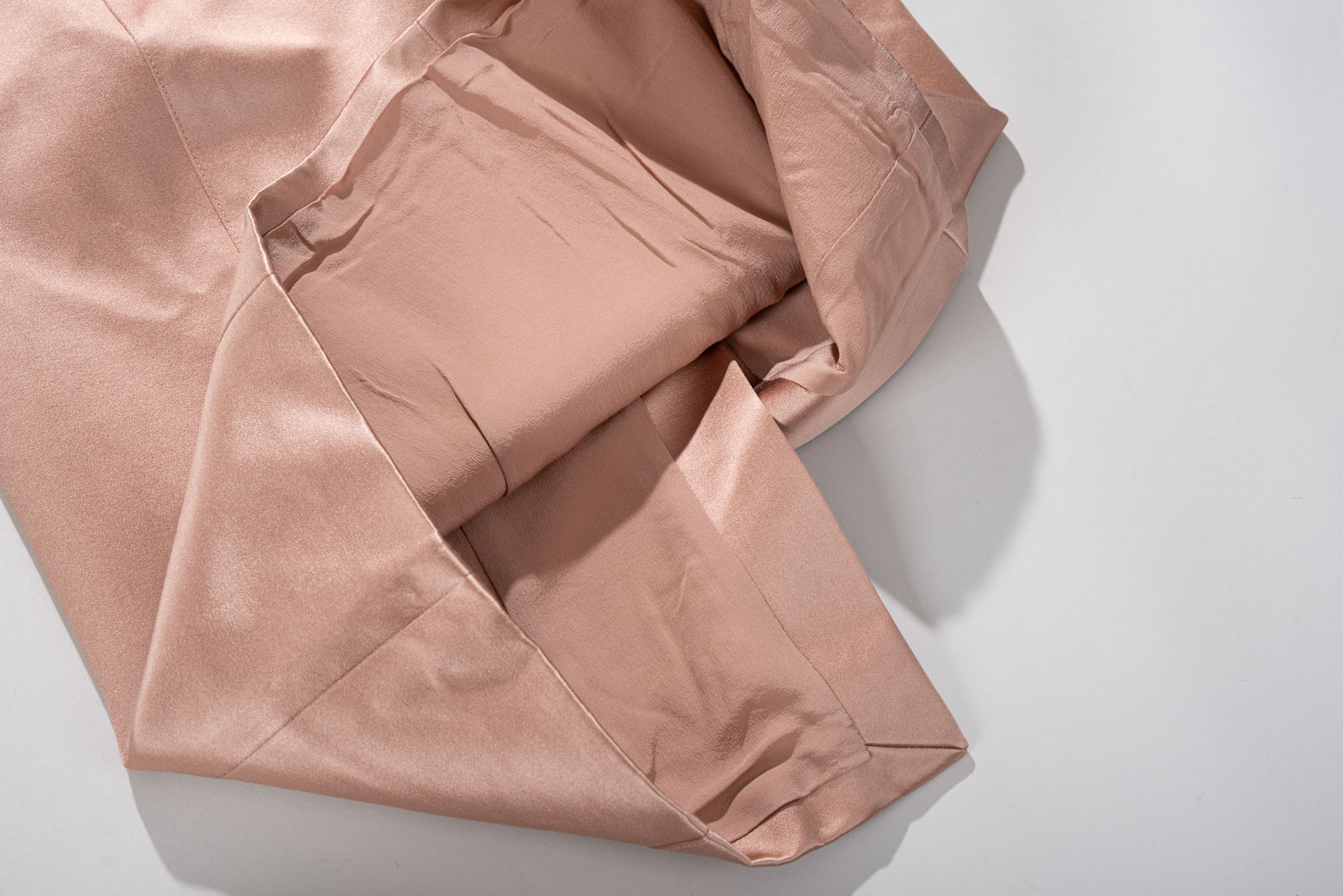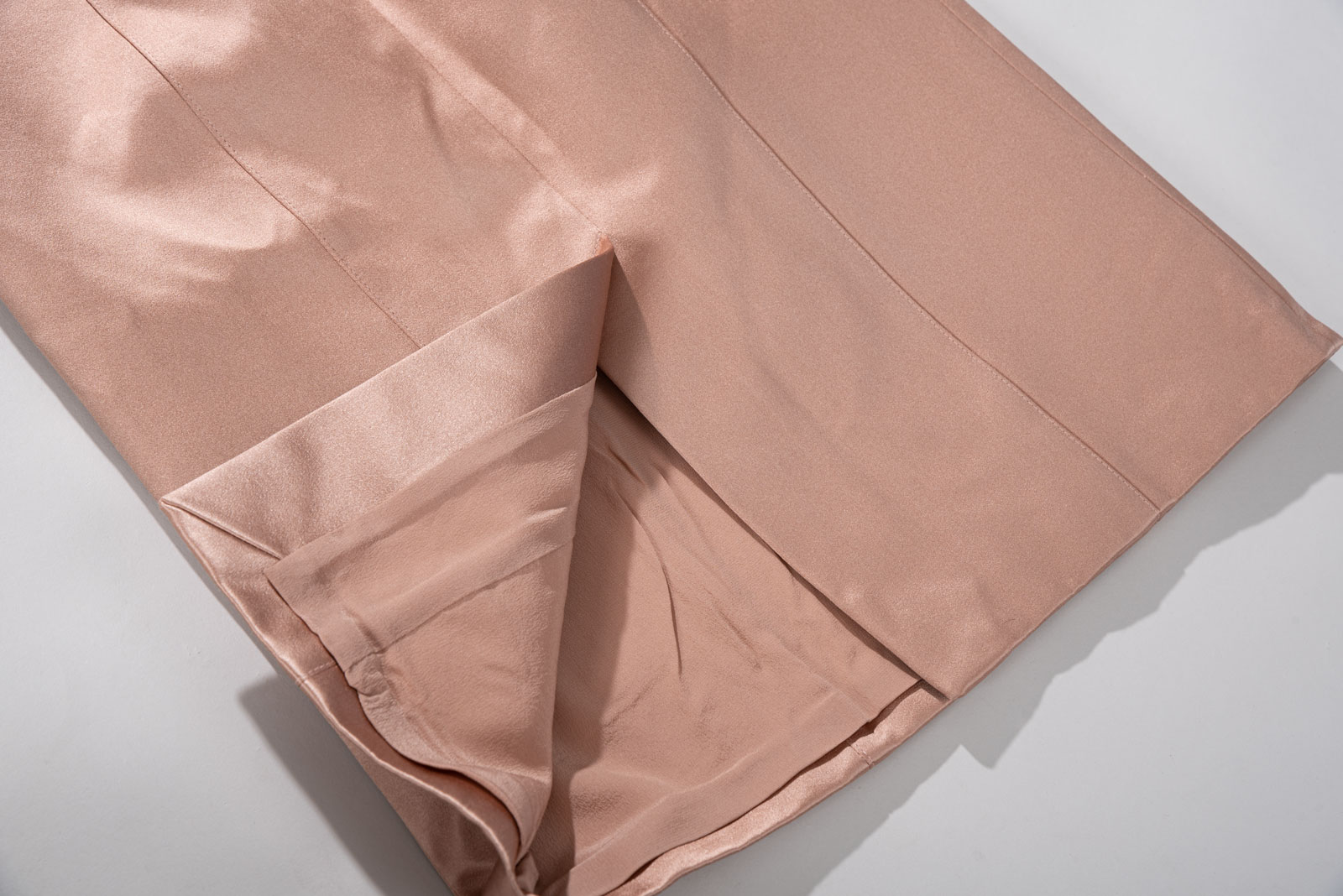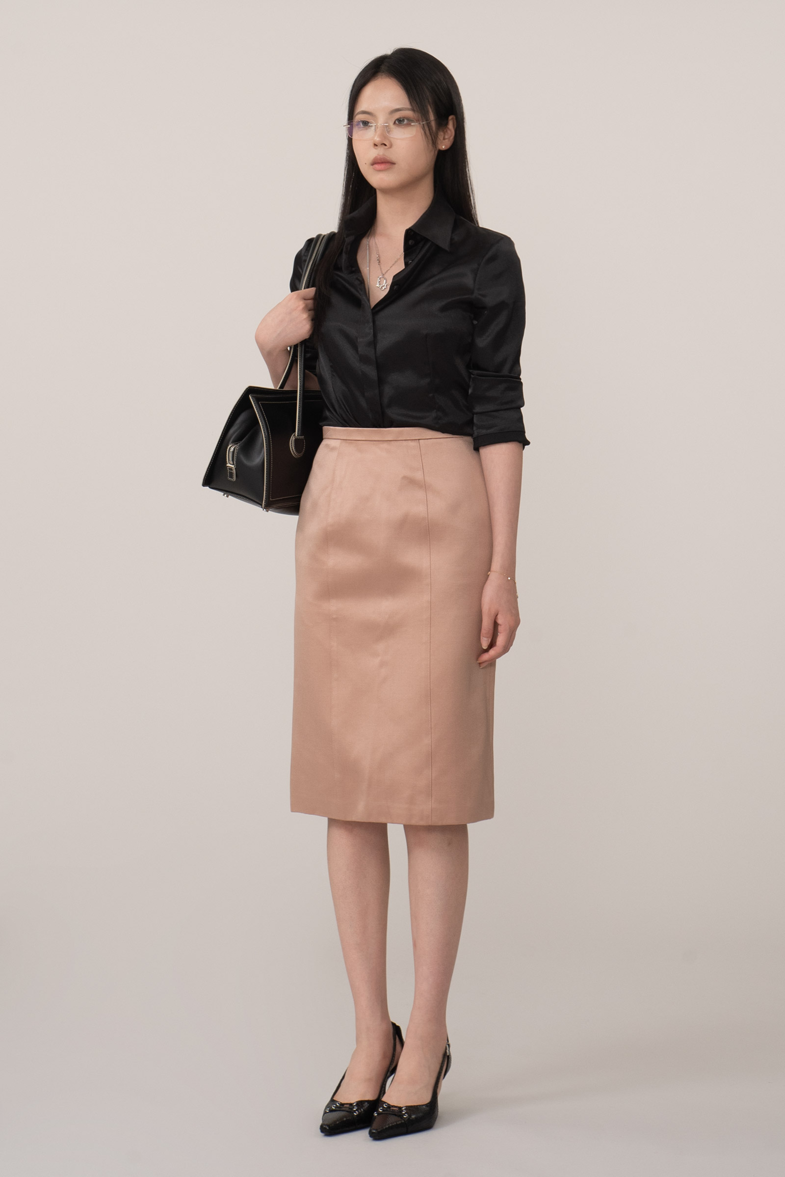 겉감은 실키하면서도 가볍고 고밀도여서 고급스러운 윤기가 도는 편이고 안감 전체가 100% 실크로 되어 있어 착용 시 바디에 부드럽게 감기는 텍스처와 쾌적함을 동시에 제공하며 허리선이 높고 무릎 기장이라 오피스룩이나 격식 있는 자리에 잘 어울려요.