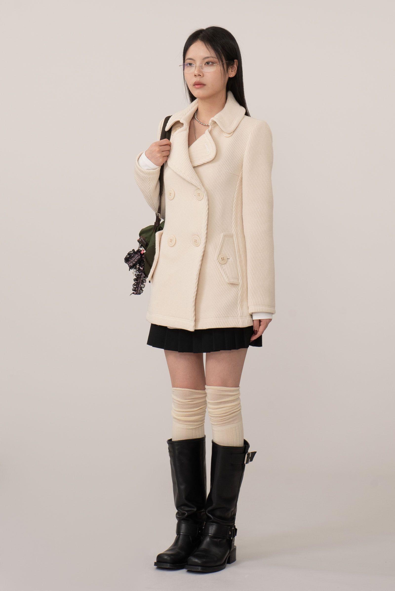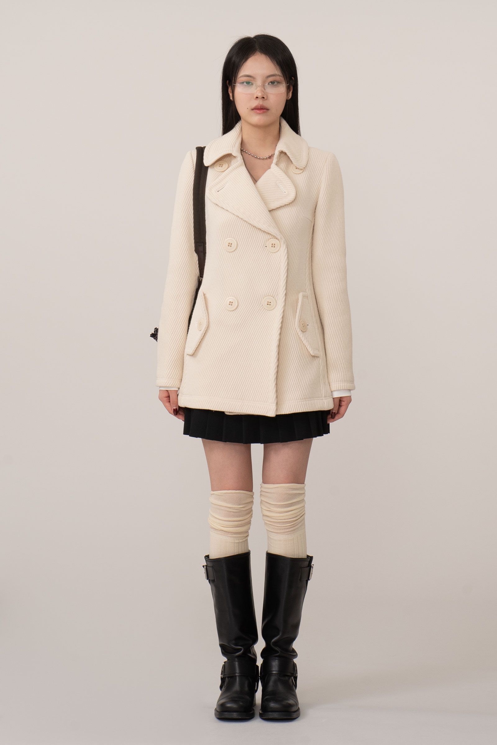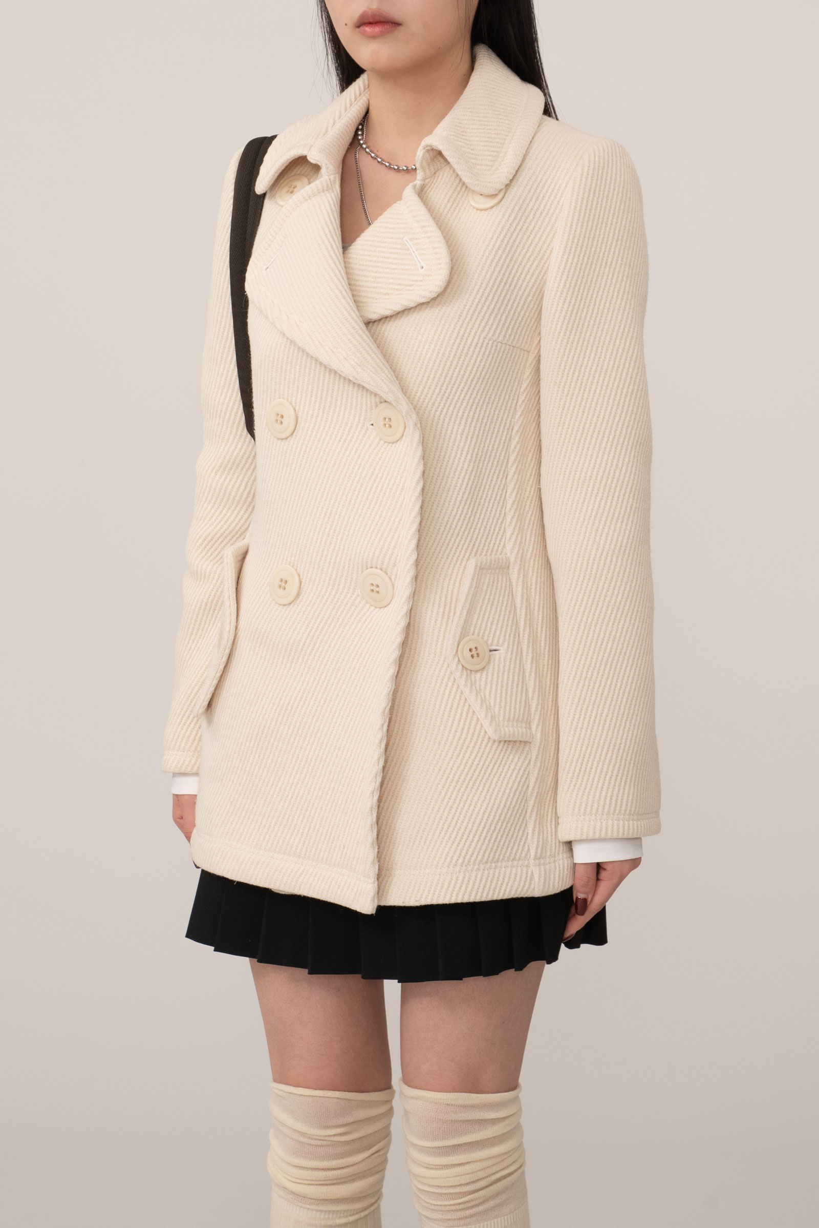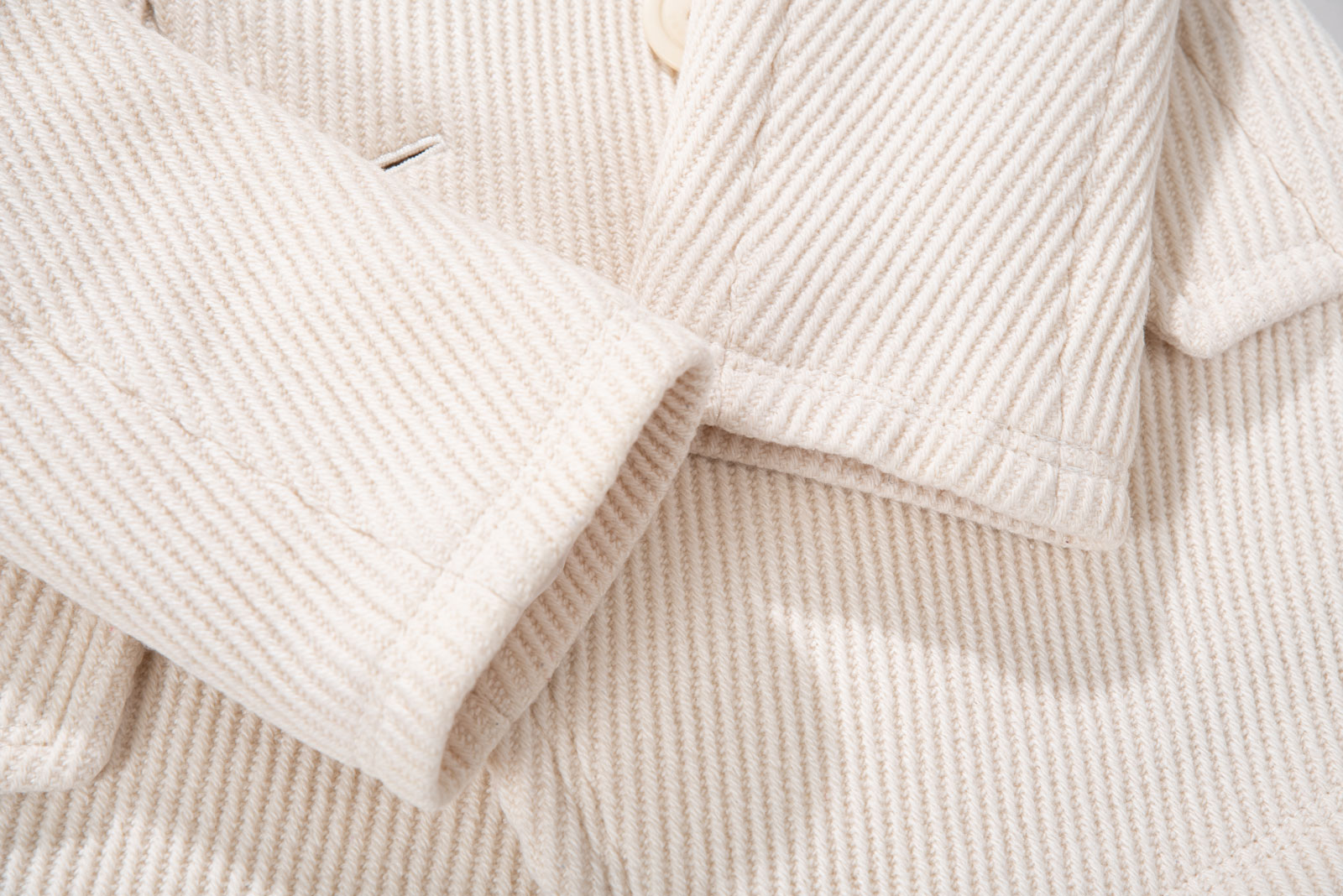 크림 아이보리 톤의 결이 또렷한 능직 텍스처가 먼저 보이는 원단, 표면이 매끈하게 번들거리기보다 울의 포근한 두께감이 결을 따라 은은하게 드러나는 것이 특징인데요.