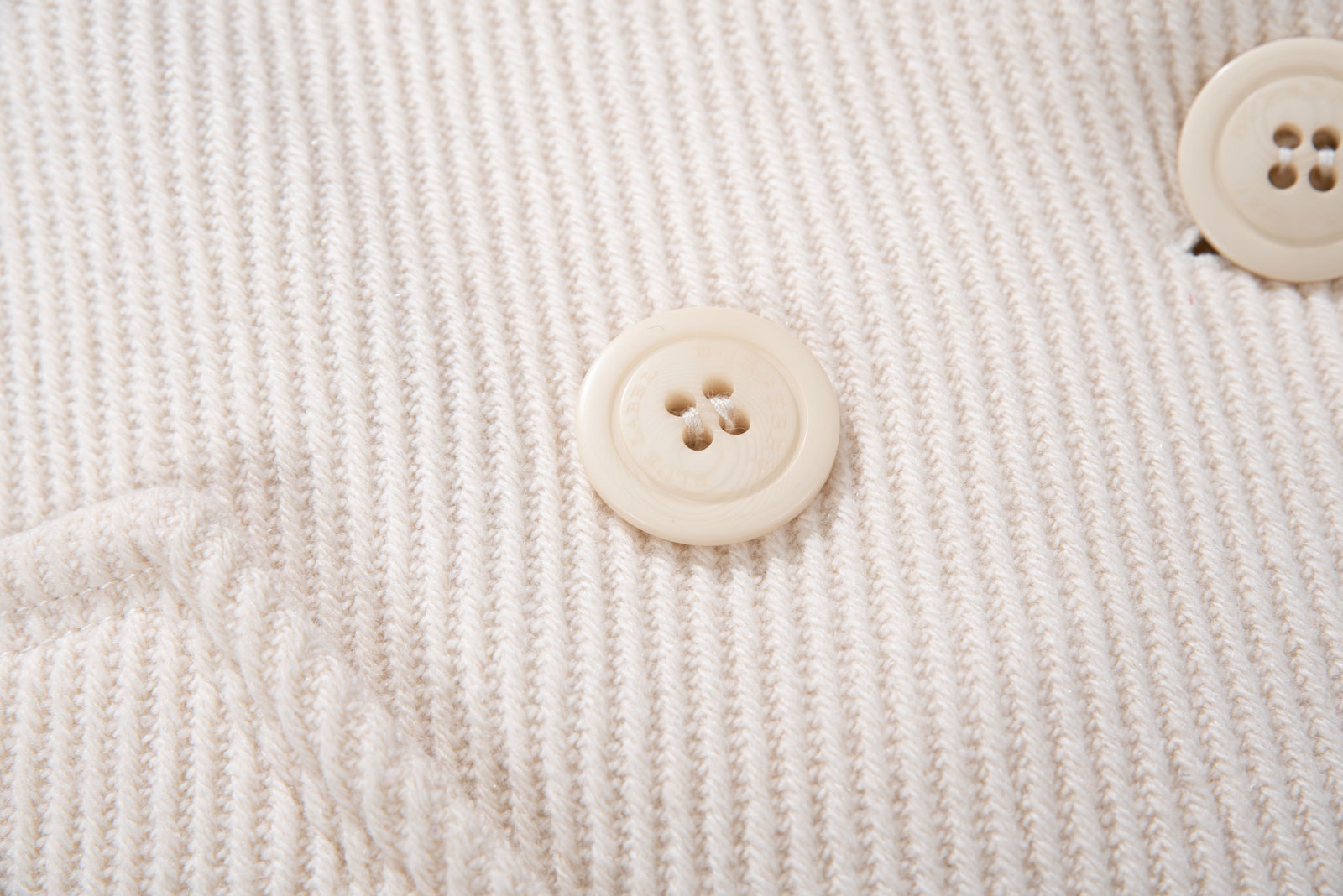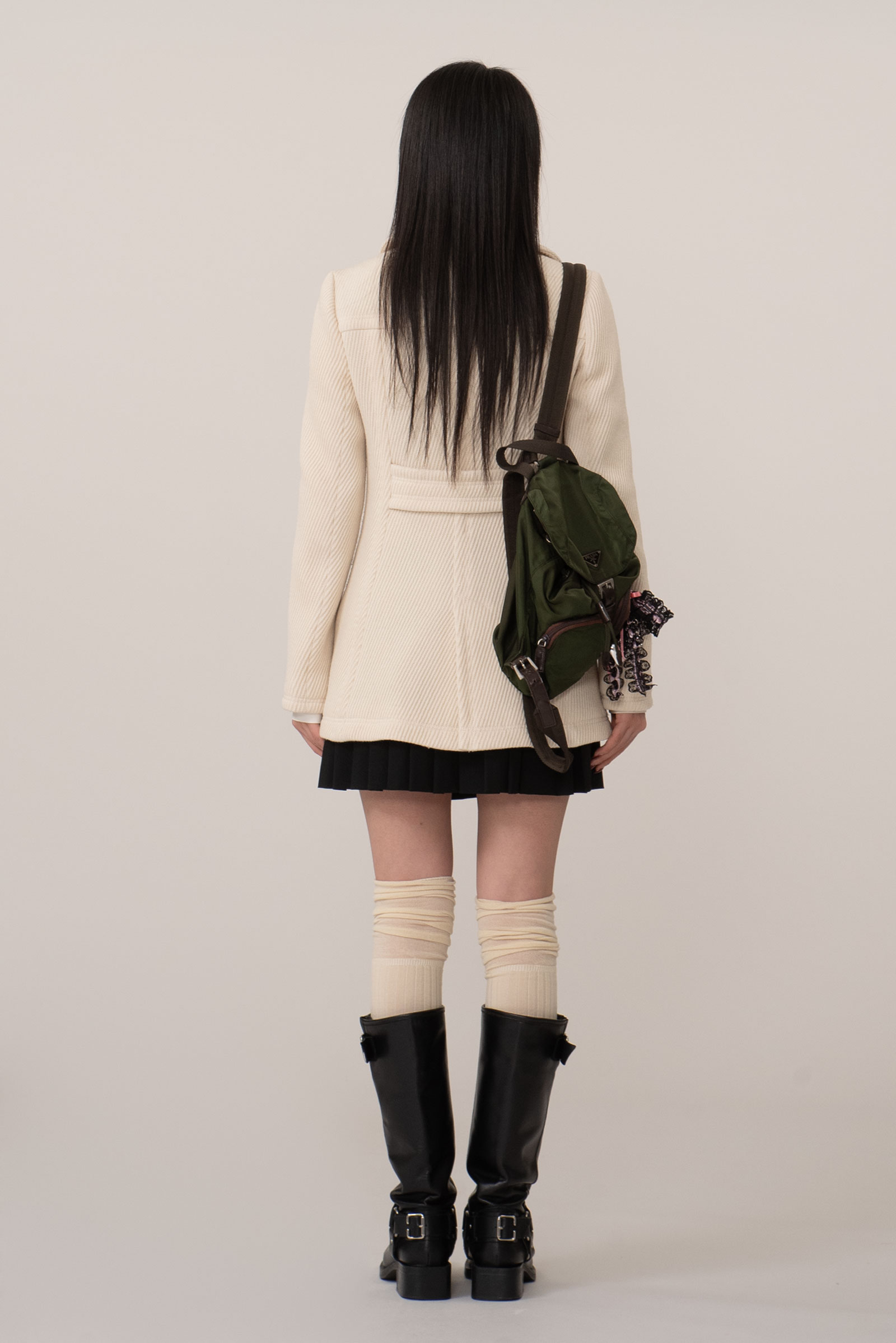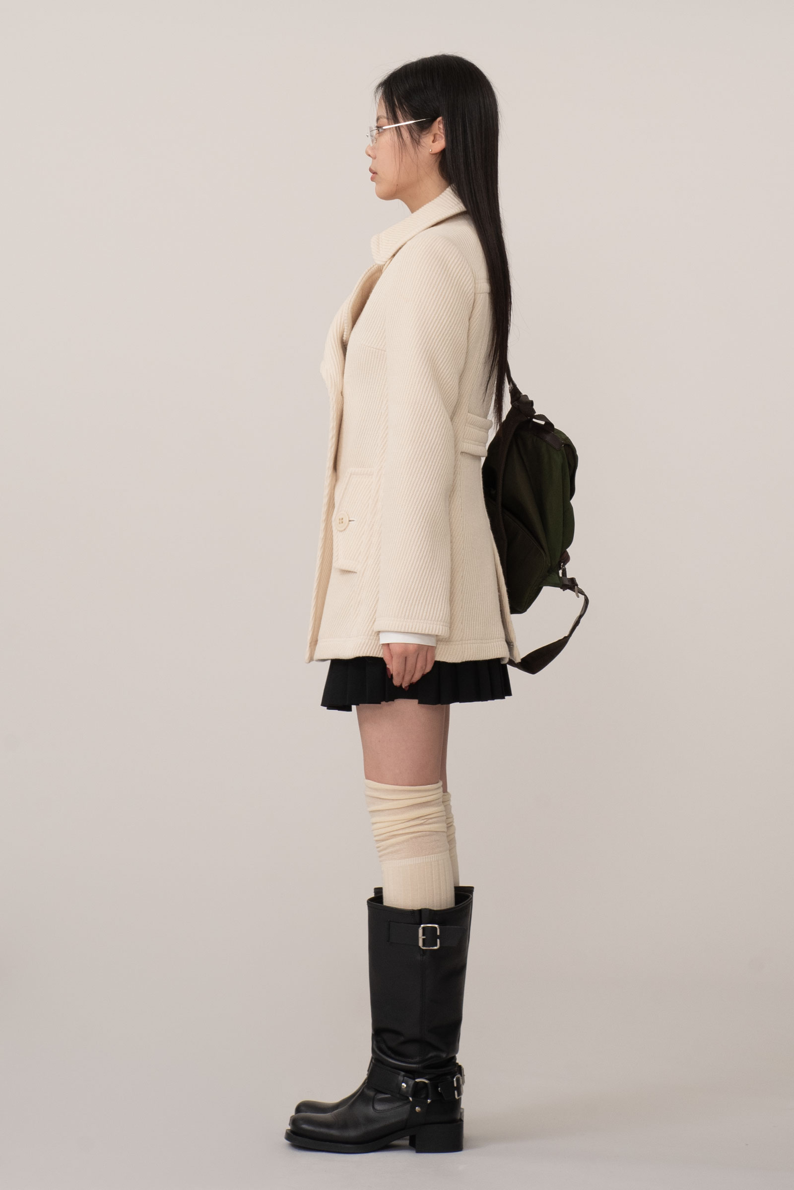 크림 아이보리 톤의 결이 또렷한 능직 텍스처가 먼저 보이는 원단, 표면이 매끈하게 번들거리기보다 울의 포근한 두께감이 결을 따라 은은하게 드러나는 것이 특징인데요.