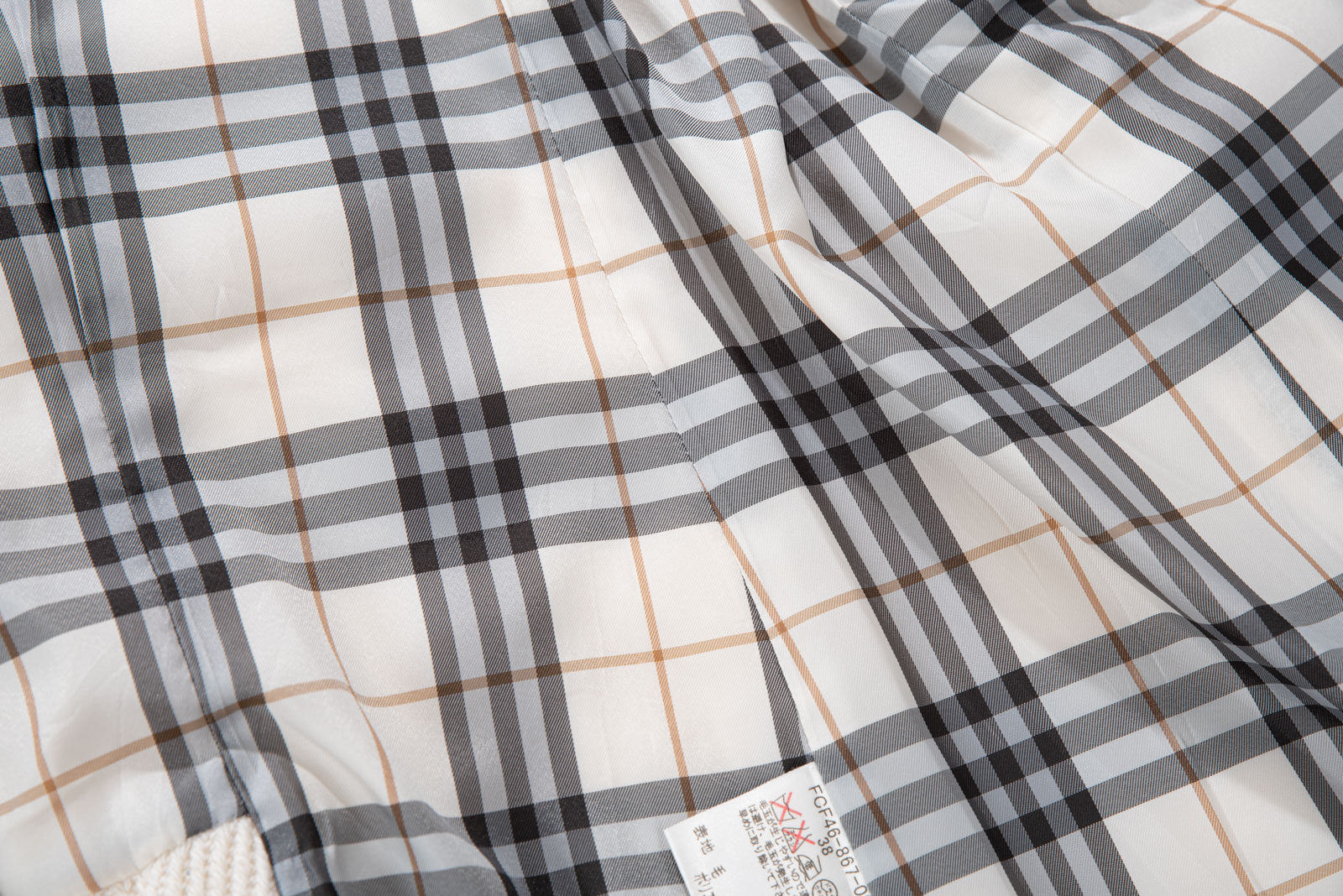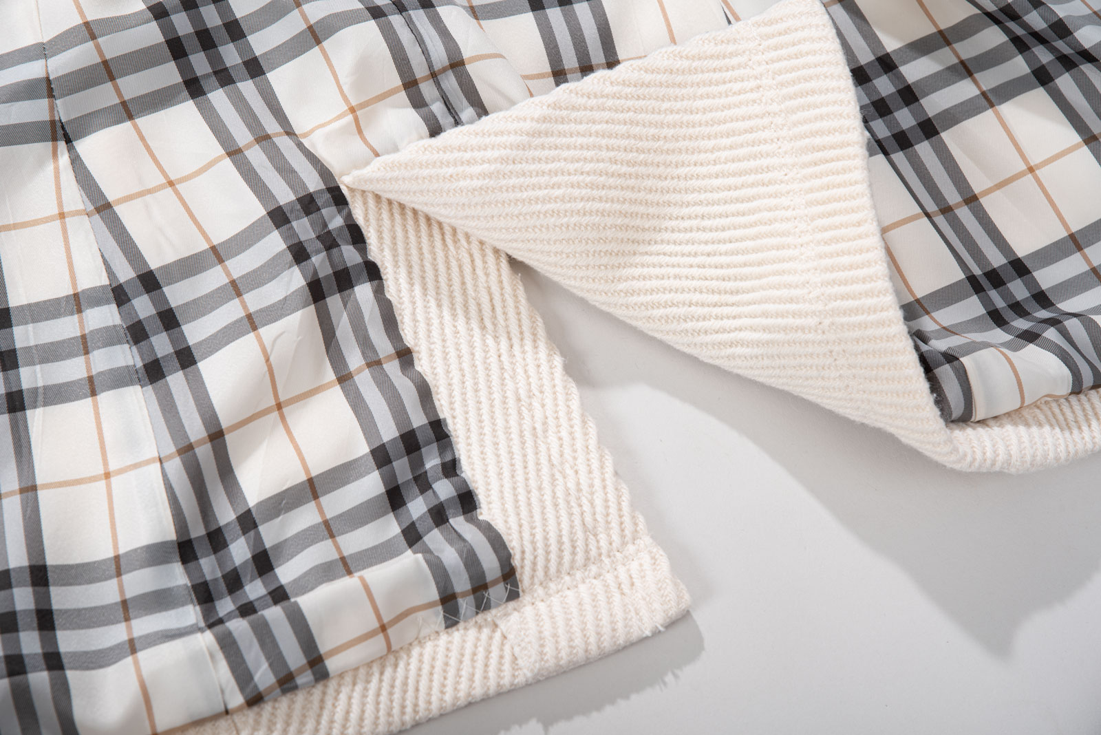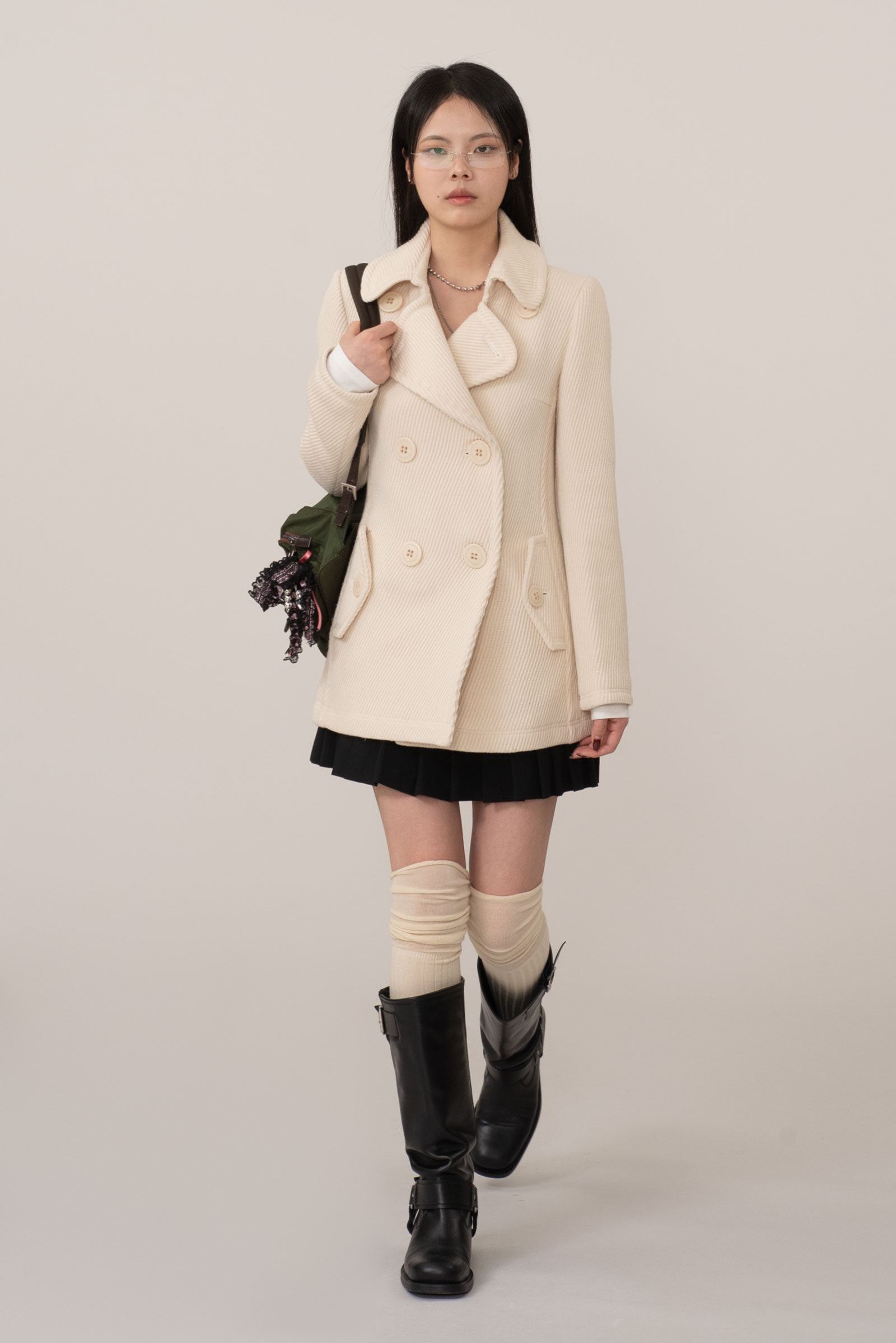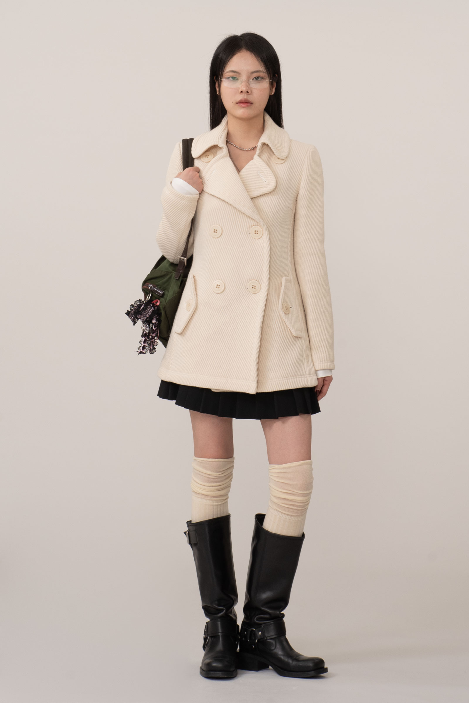 크림 아이보리 톤의 결이 또렷한 능직 텍스처가 먼저 보이는 원단, 표면이 매끈하게 번들거리기보다 울의 포근한 두께감이 결을 따라 은은하게 드러나는 것이 특징인데요.