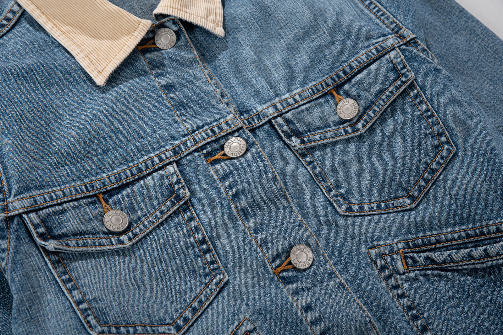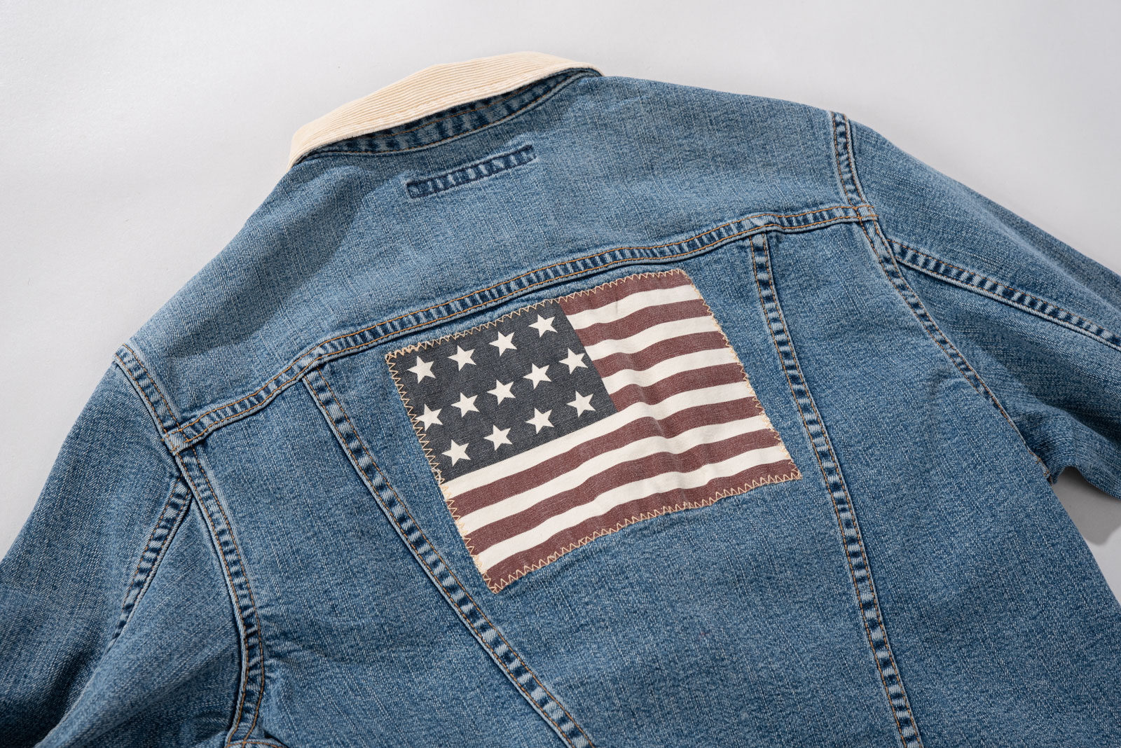 연청 컬러에 코듀로이 소재 카라, 여러 개의 전면 포켓과 후면의 커다란 성조기가 포인트 되는 아이템이랍니다.