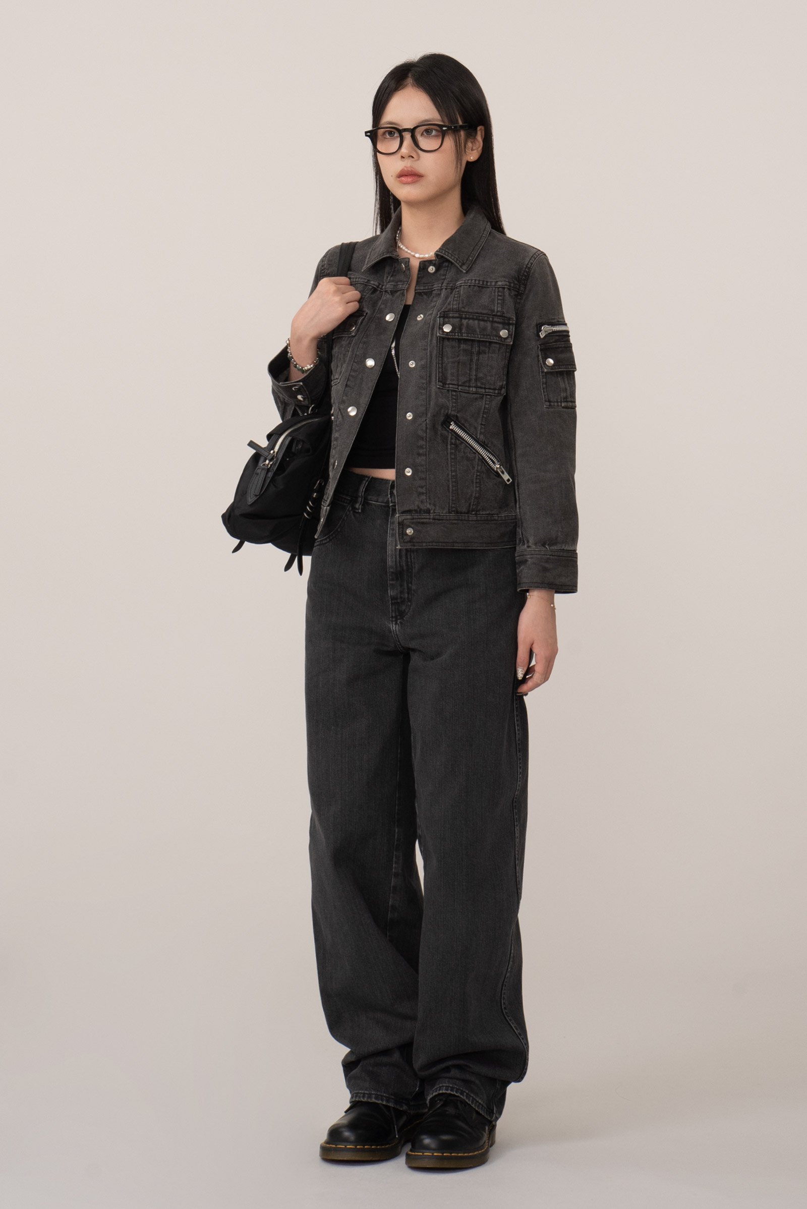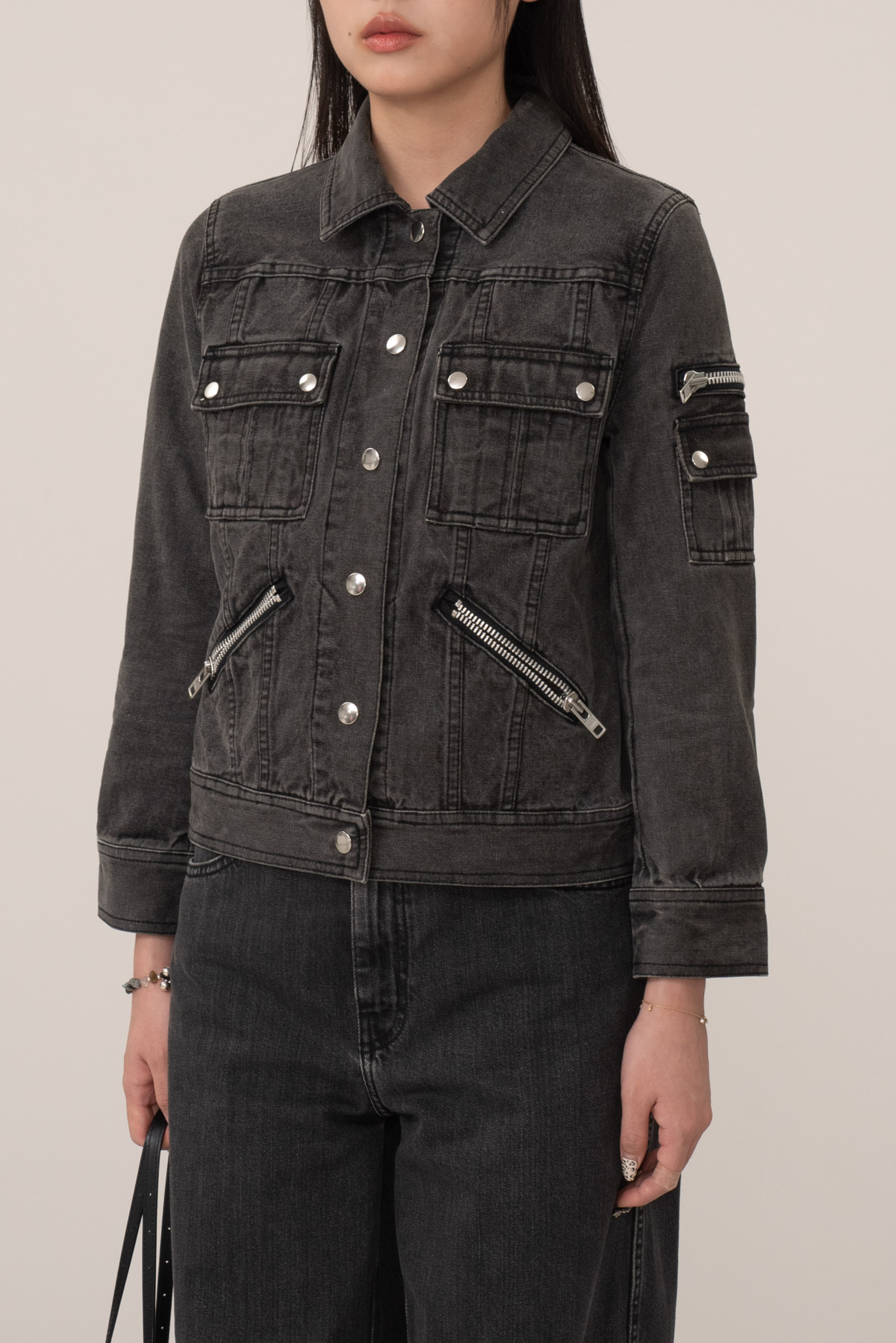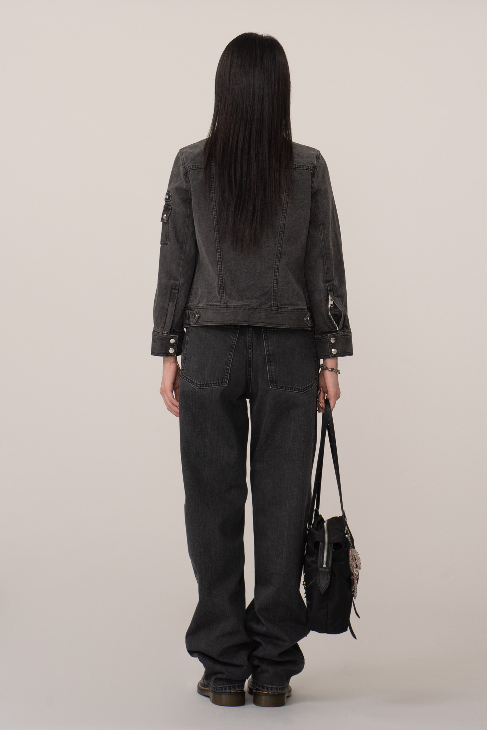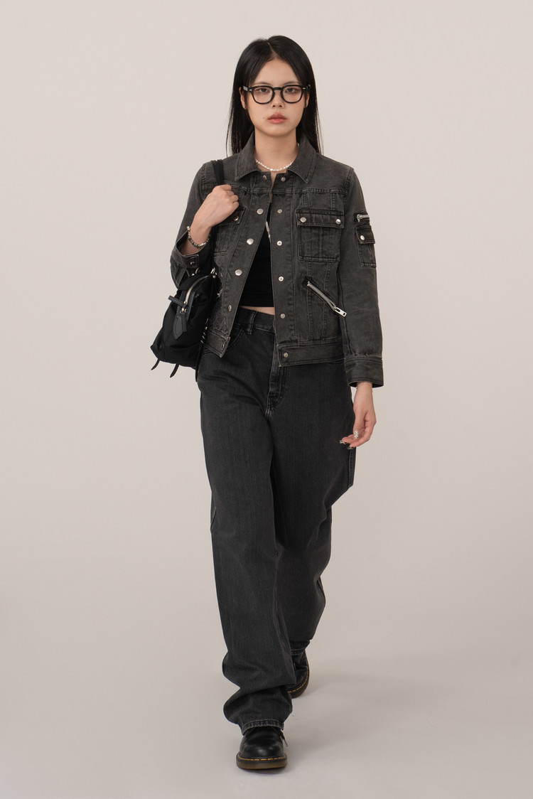 블랙 데님 특유의 자연스러운 워싱, 탄탄한 소재감으로 실루엣을 살리며 크롭 소매와 기장감이 답답하지 않아 보여 좋네요.