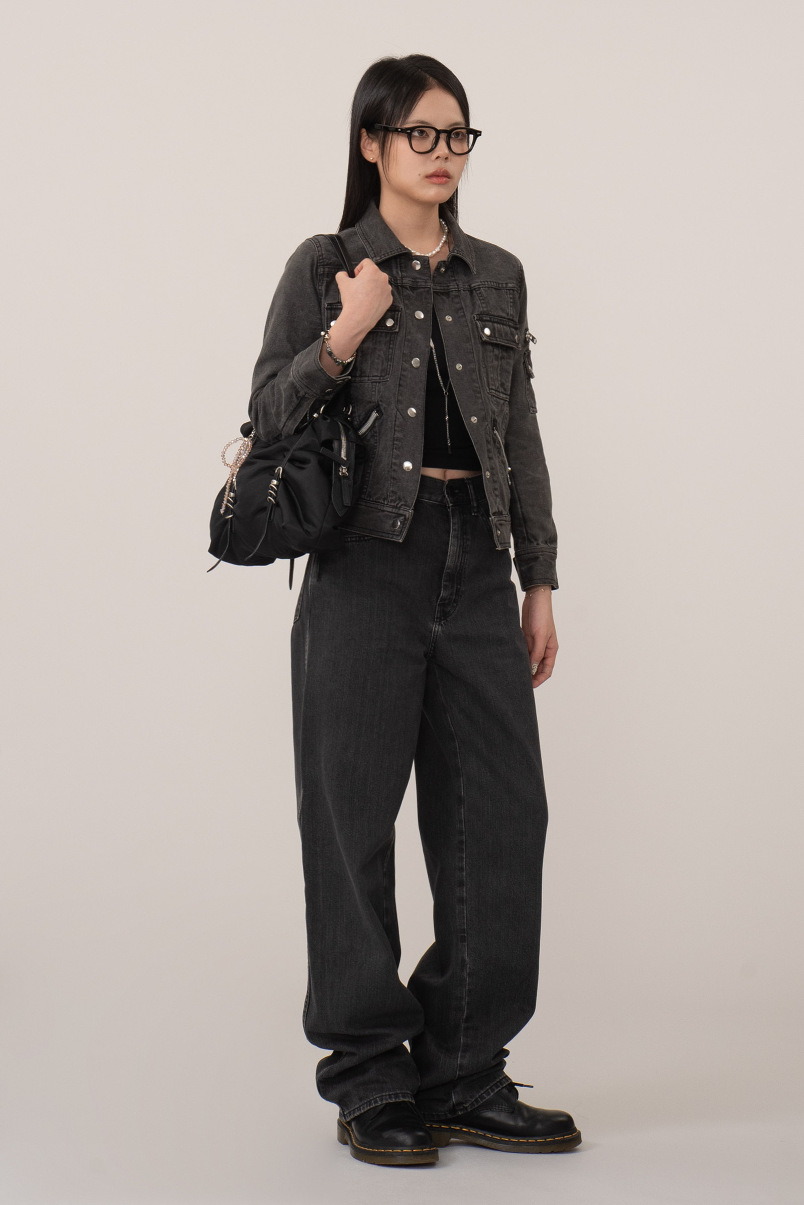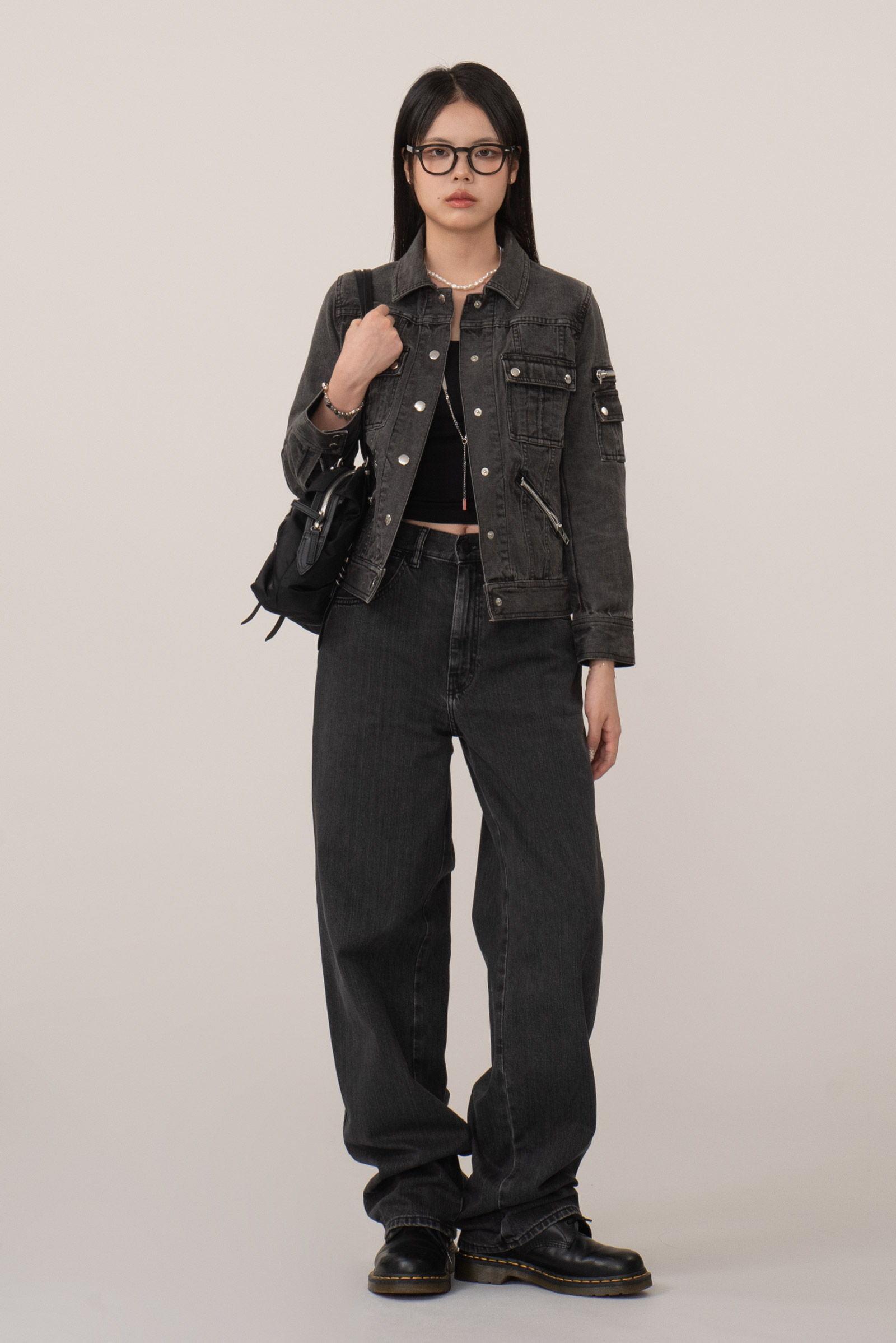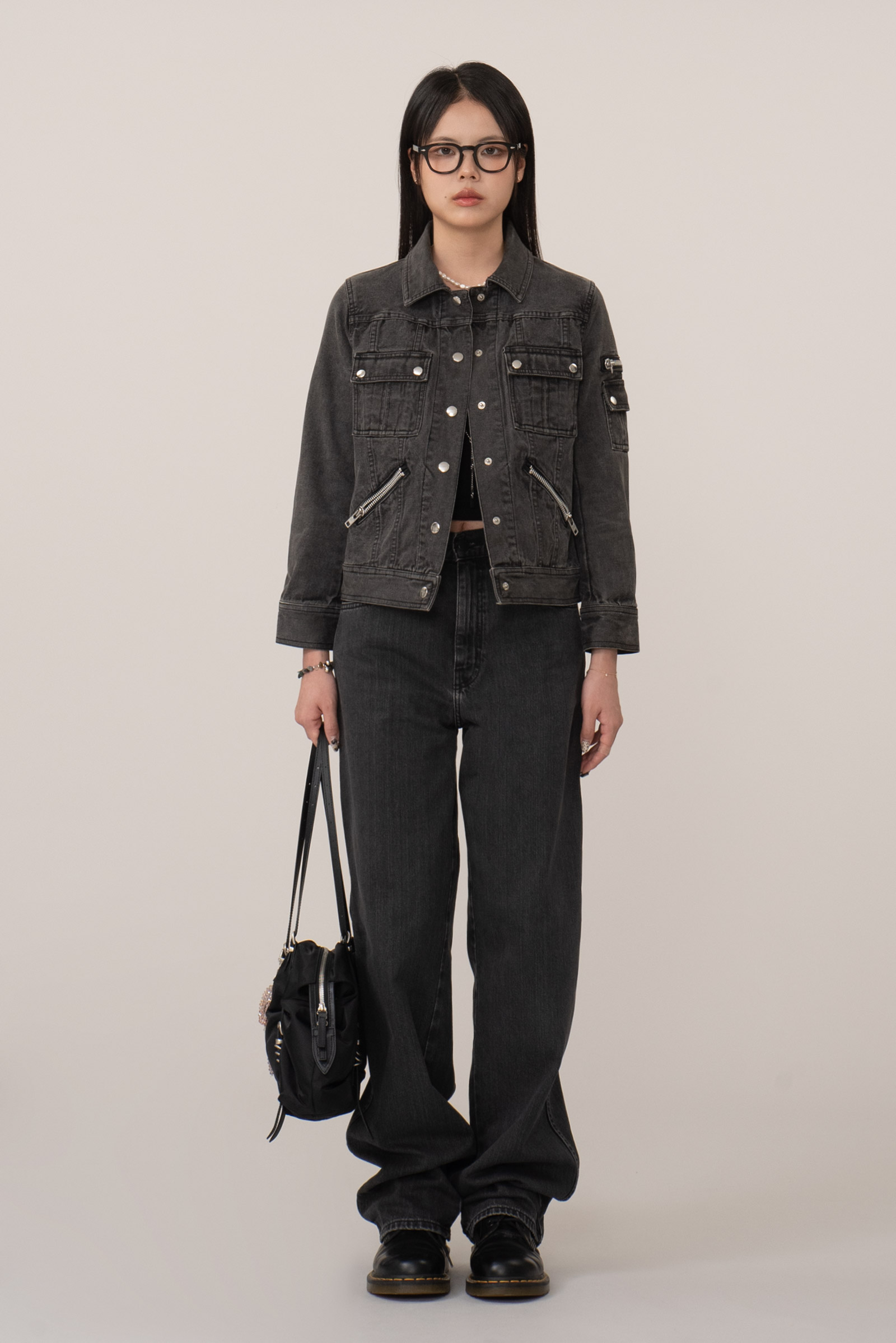 블랙 데님 특유의 자연스러운 워싱, 탄탄한 소재감으로 실루엣을 살리며 크롭 소매와 기장감이 답답하지 않아 보여 좋네요.
