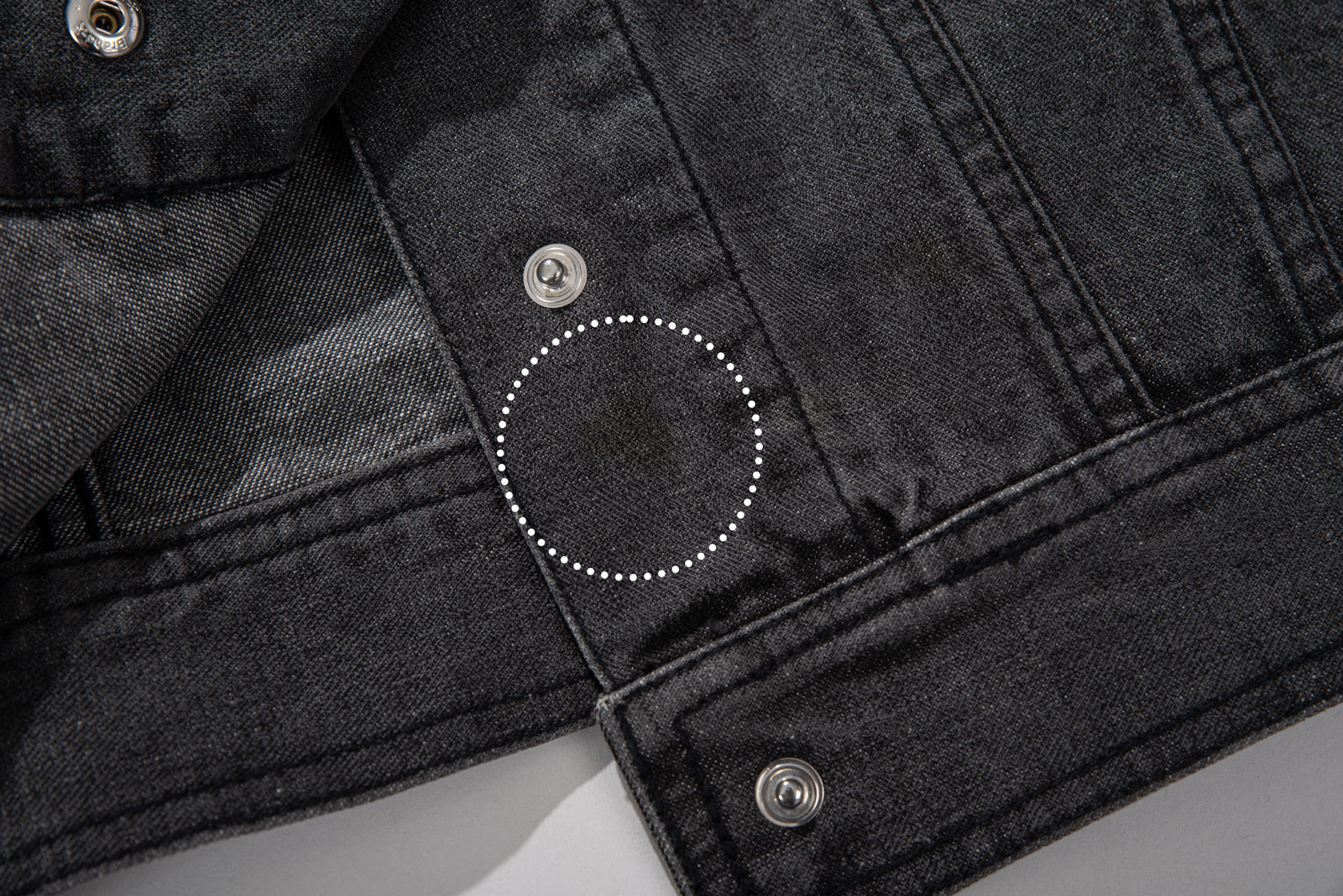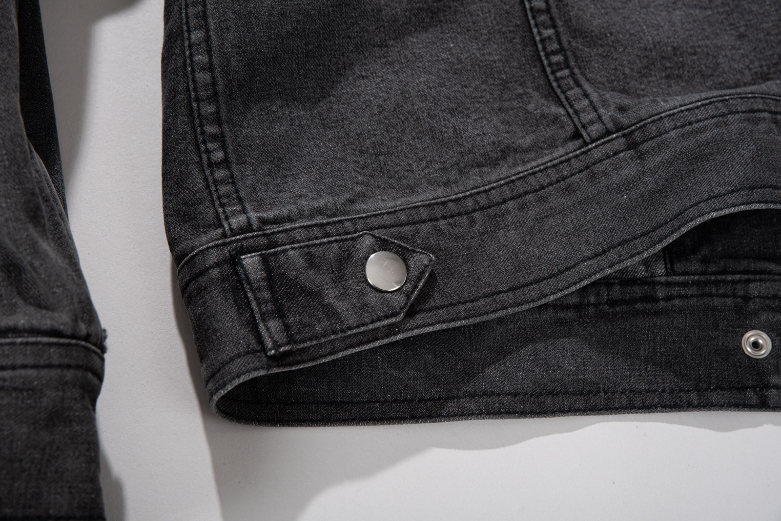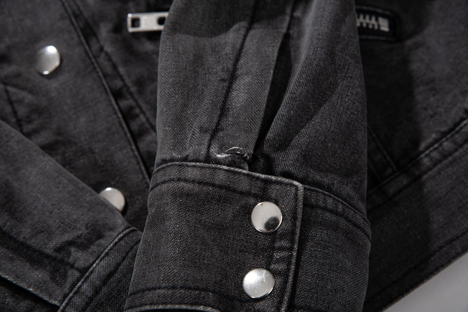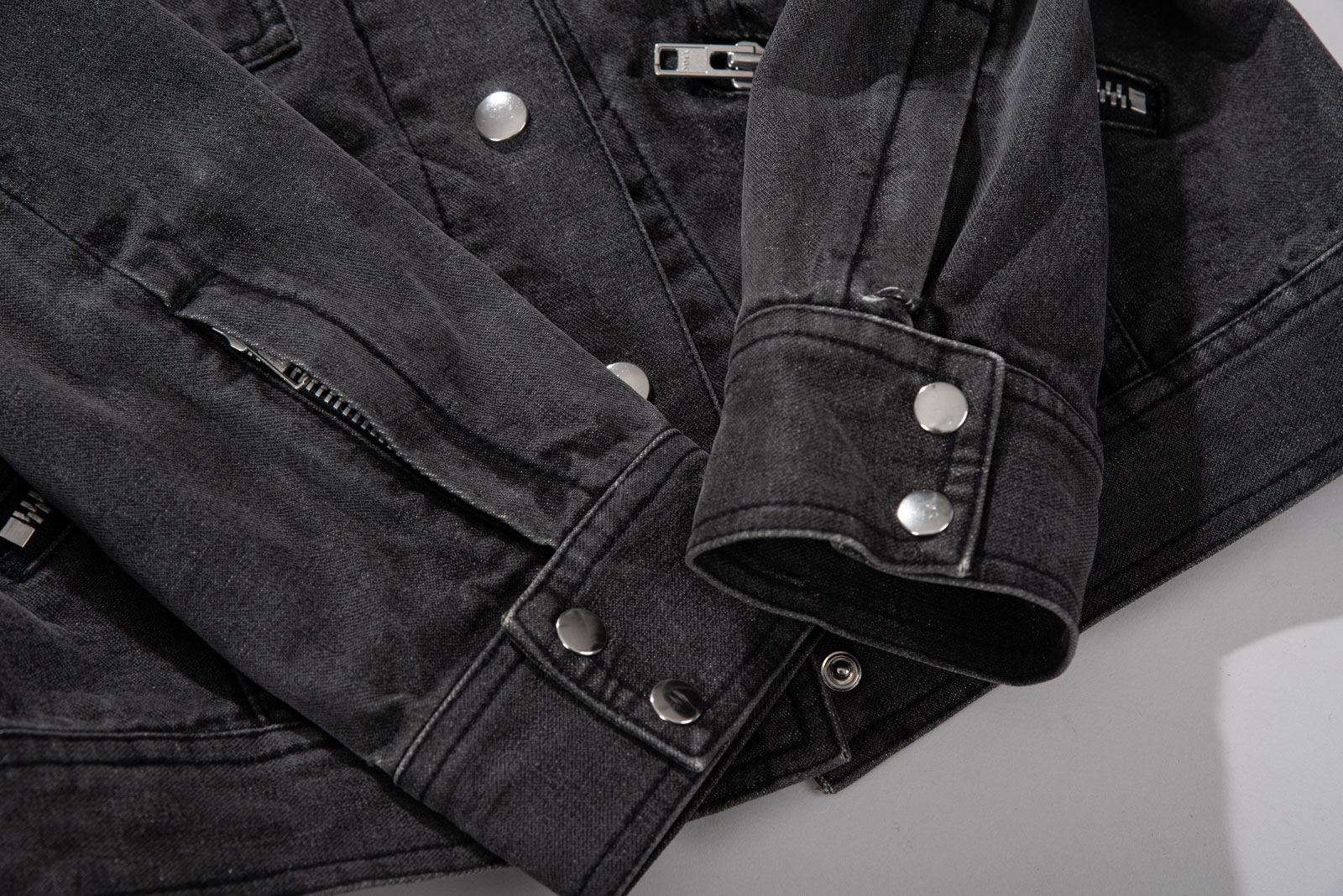 블랙 데님 특유의 자연스러운 워싱, 탄탄한 소재감으로 실루엣을 살리며 크롭 소매와 기장감이 답답하지 않아 보여 좋네요.