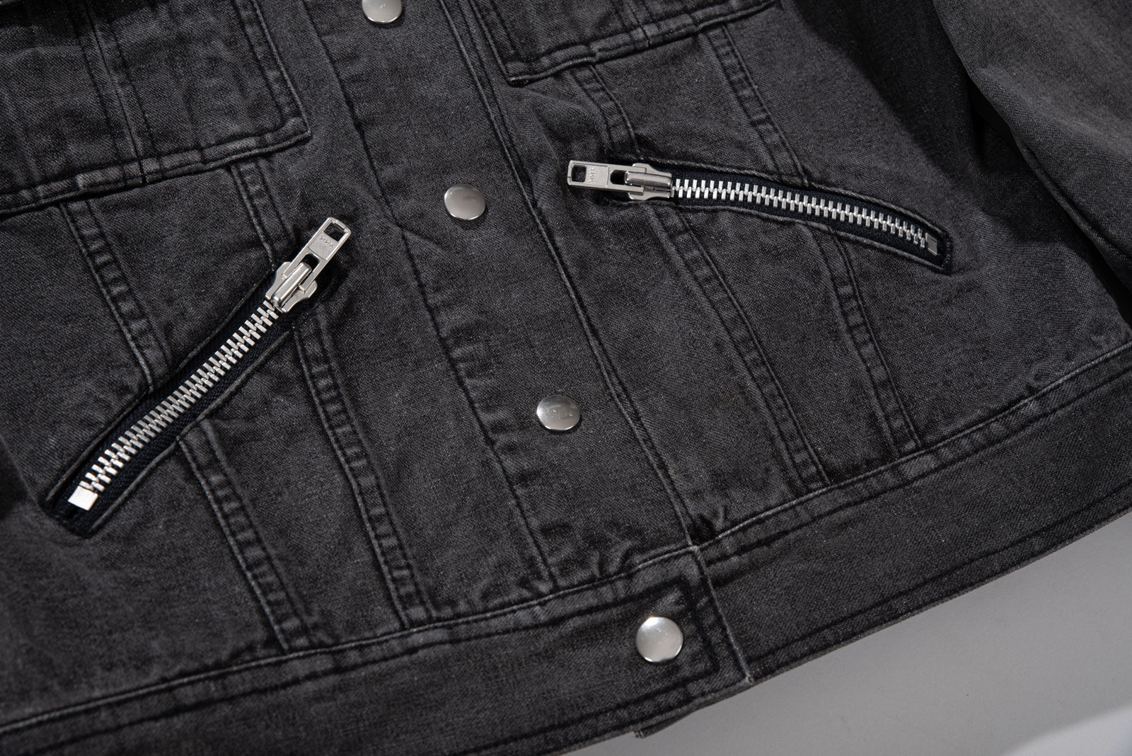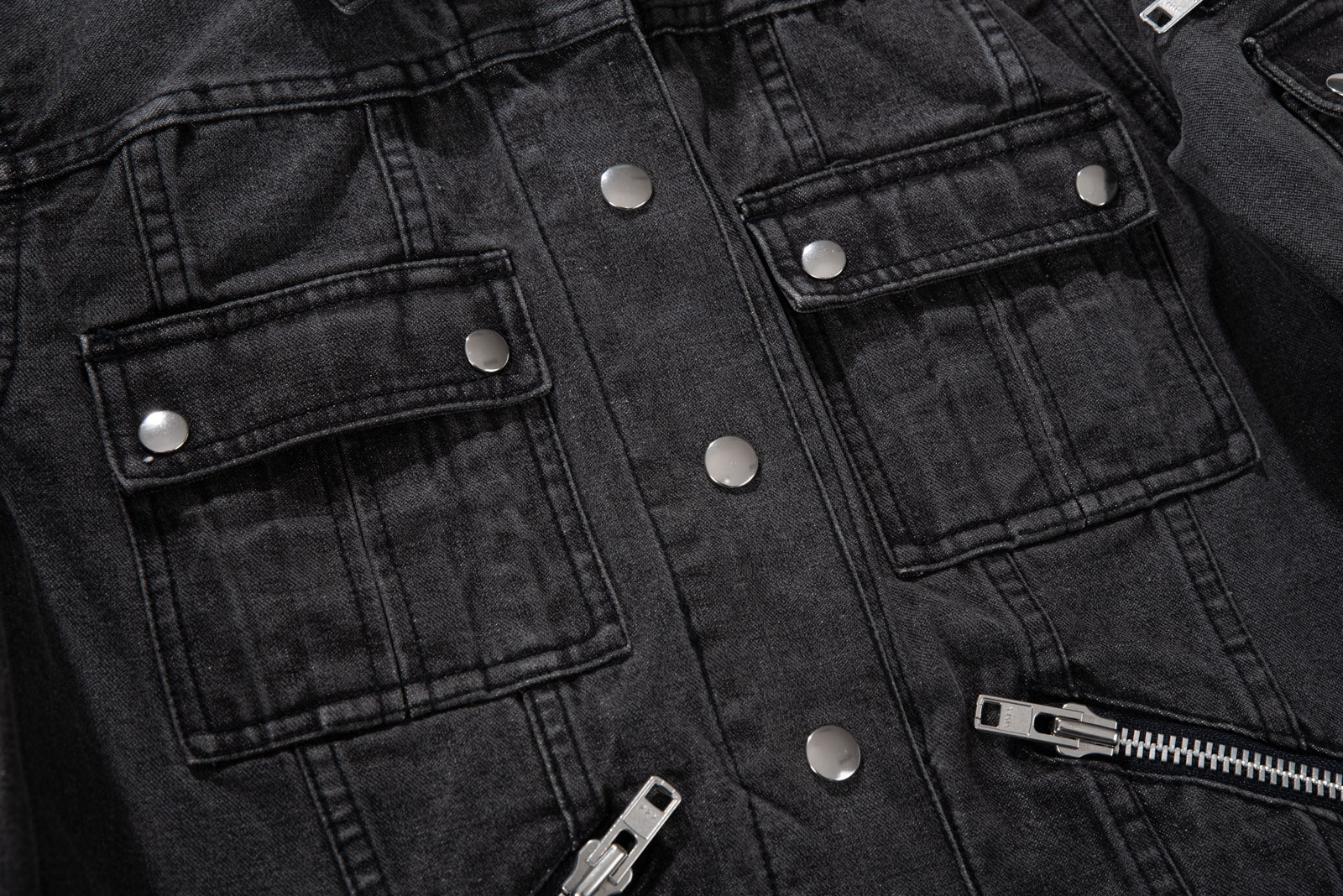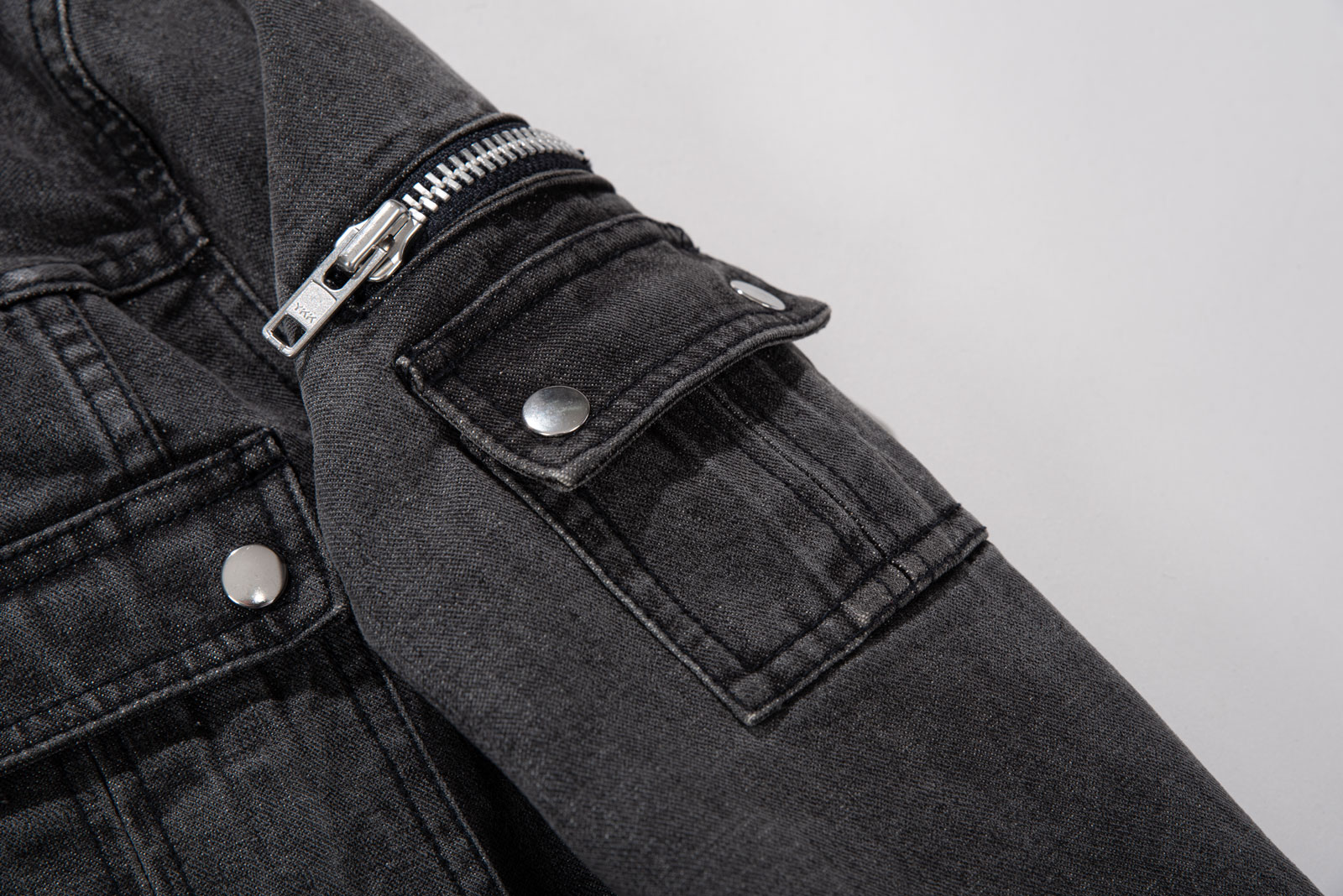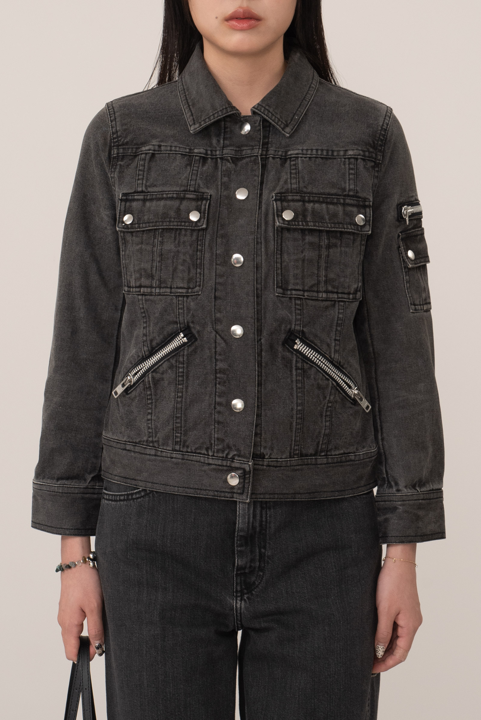 클래식한 트러커 자켓을 기반으로 더블 포켓과 실버 버튼이 현대적인 감성을 더하며 포켓이나 소매 지퍼 디테일로 보아 밀리터리, 락시크, 펑크를 모티브로 제작된 제품인 것 같아요.