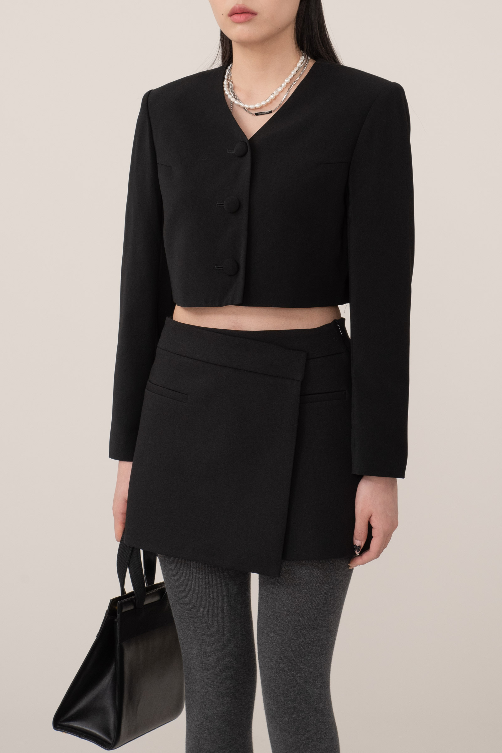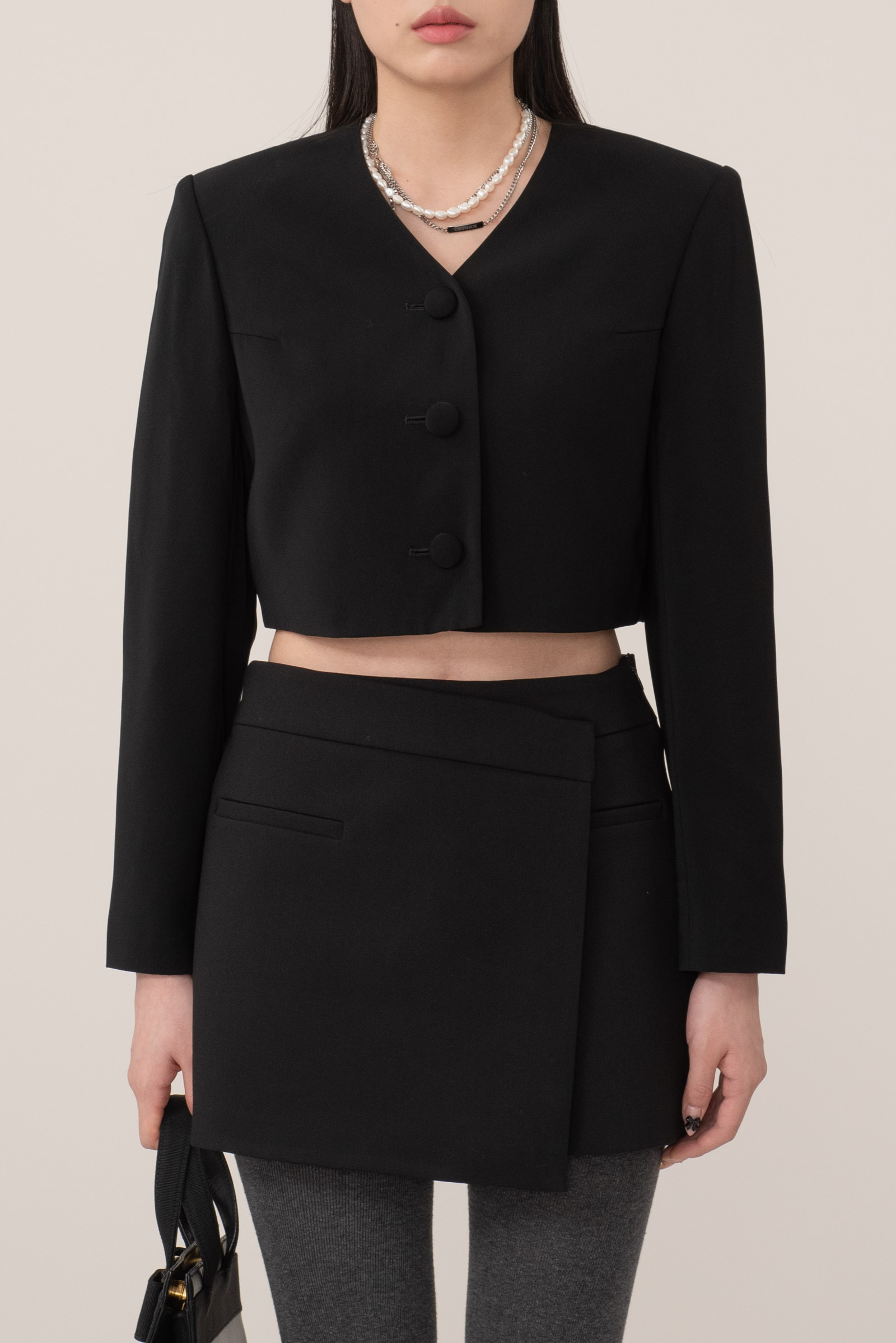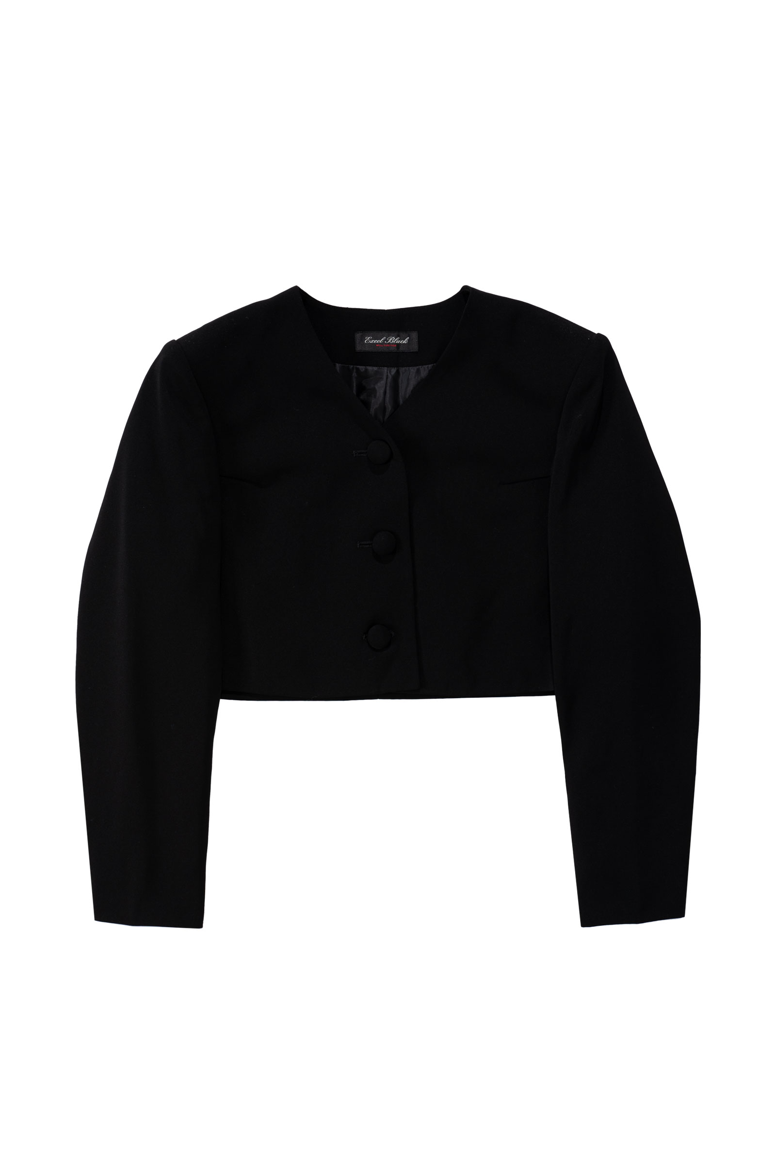 폴리로 된 정장 느낌의 원단 텍스쳐, 짧은 기장감과 노카라 디자인, 실루엣이 무너지지 않게 잡아주는 숄더패드 그리고 전면의 커다란 쓰리버튼까지.