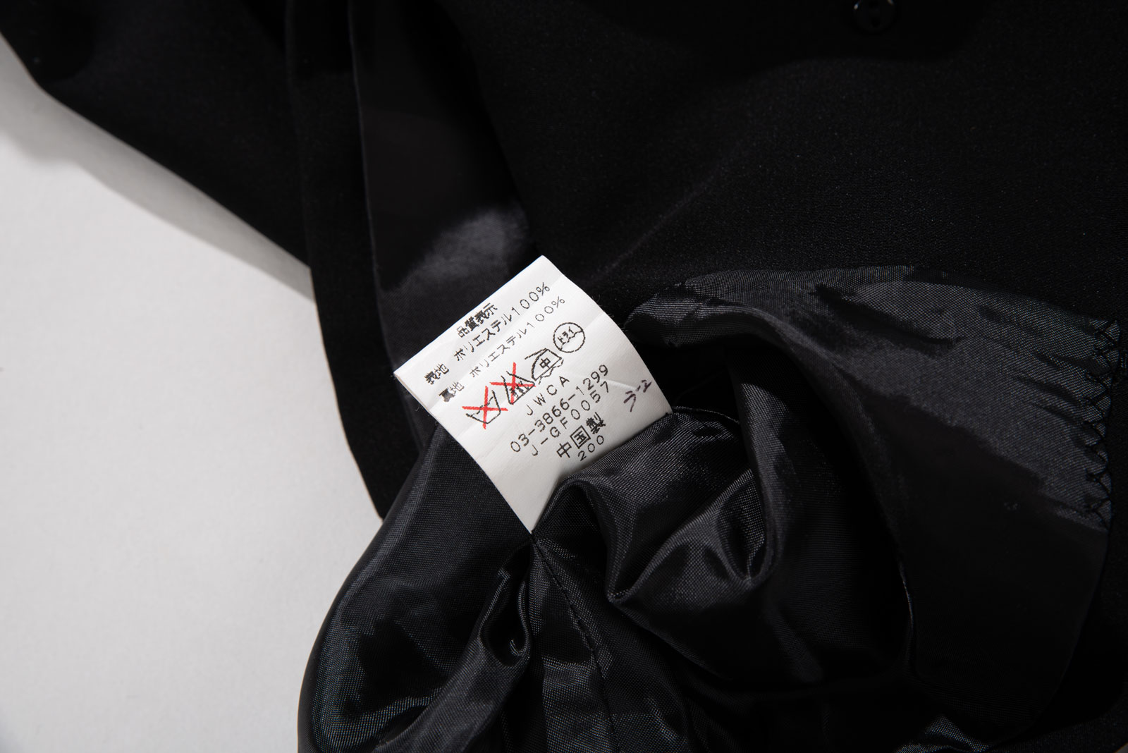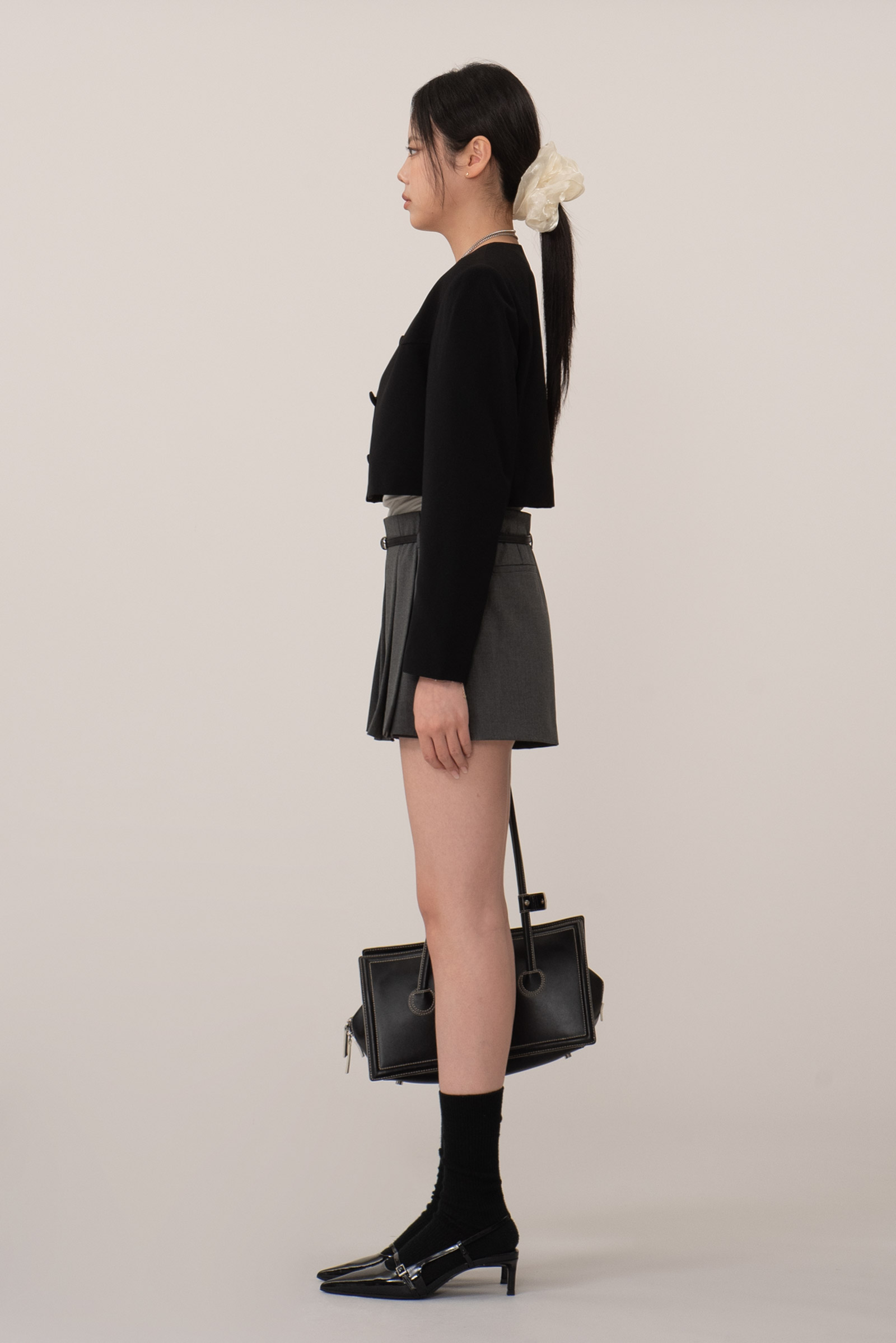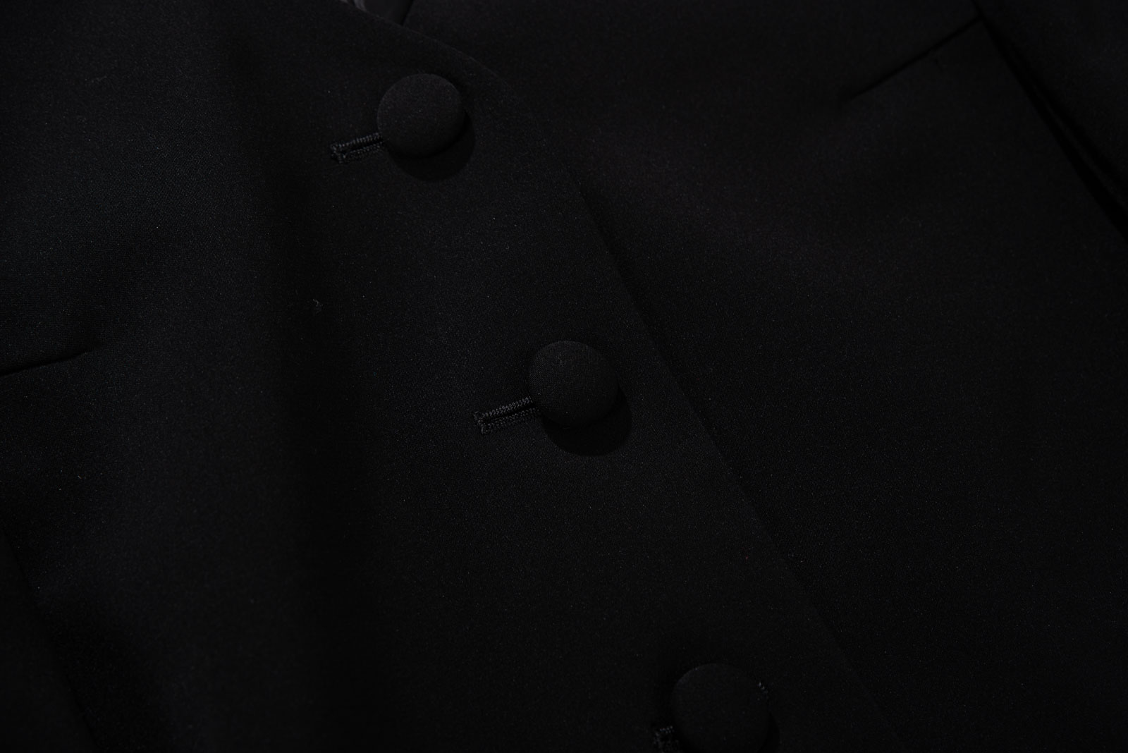 폴리로 된 정장 느낌의 원단 텍스쳐, 짧은 기장감과 노카라 디자인, 실루엣이 무너지지 않게 잡아주는 숄더패드 그리고 전면의 커다란 쓰리버튼까지.
