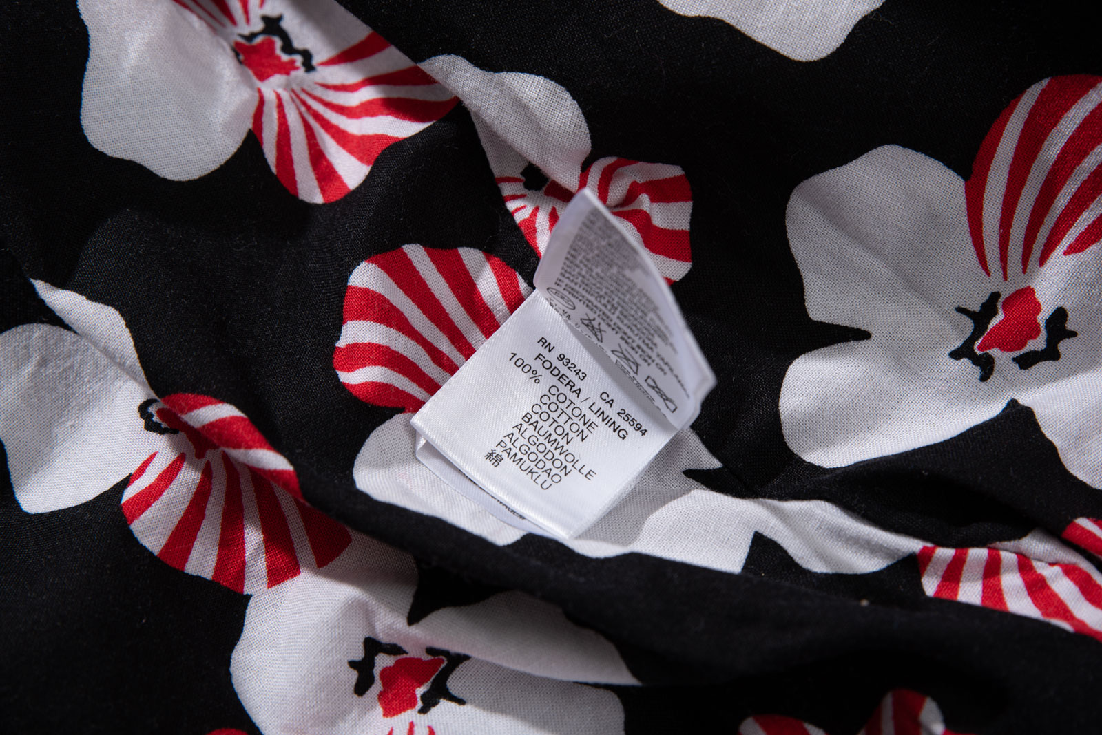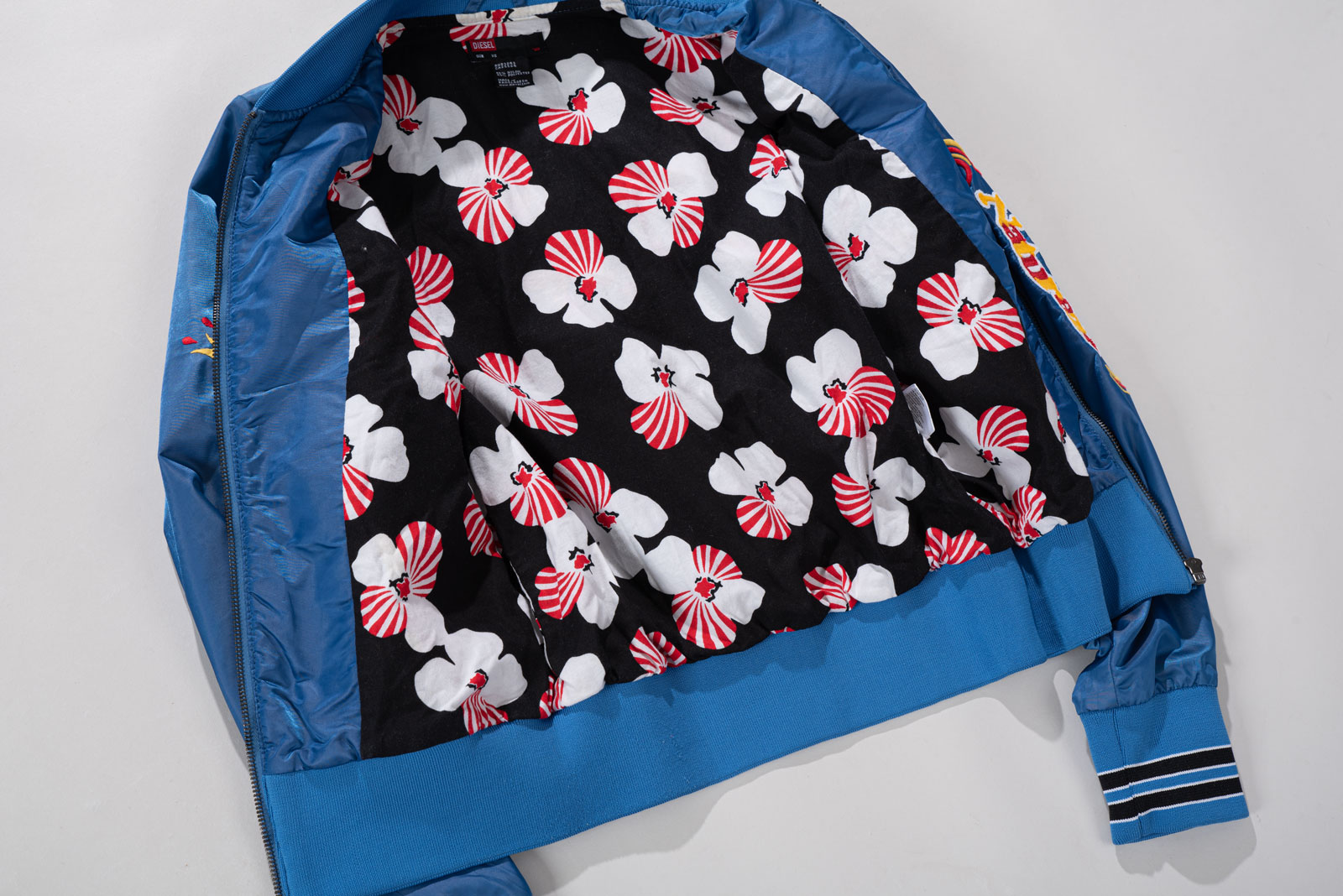 광택이 도는 얇은 겉감과 그 위에 화려한 자수가 눈에 띄며 안감도 플라워 패턴이라 그 부분도 굉장히 포인트 되고요.