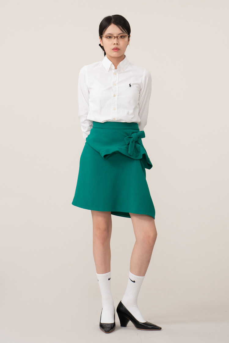 안쪽에서 바깥으로 관통하는 두 개의 끈으로 연출된 리본 디테일과 눈에 띄는 차분한 네온 컬러, 볼륨감이 느껴지는 실루엣에서 마르니의 러블리한 감성이 묻어나네요.
