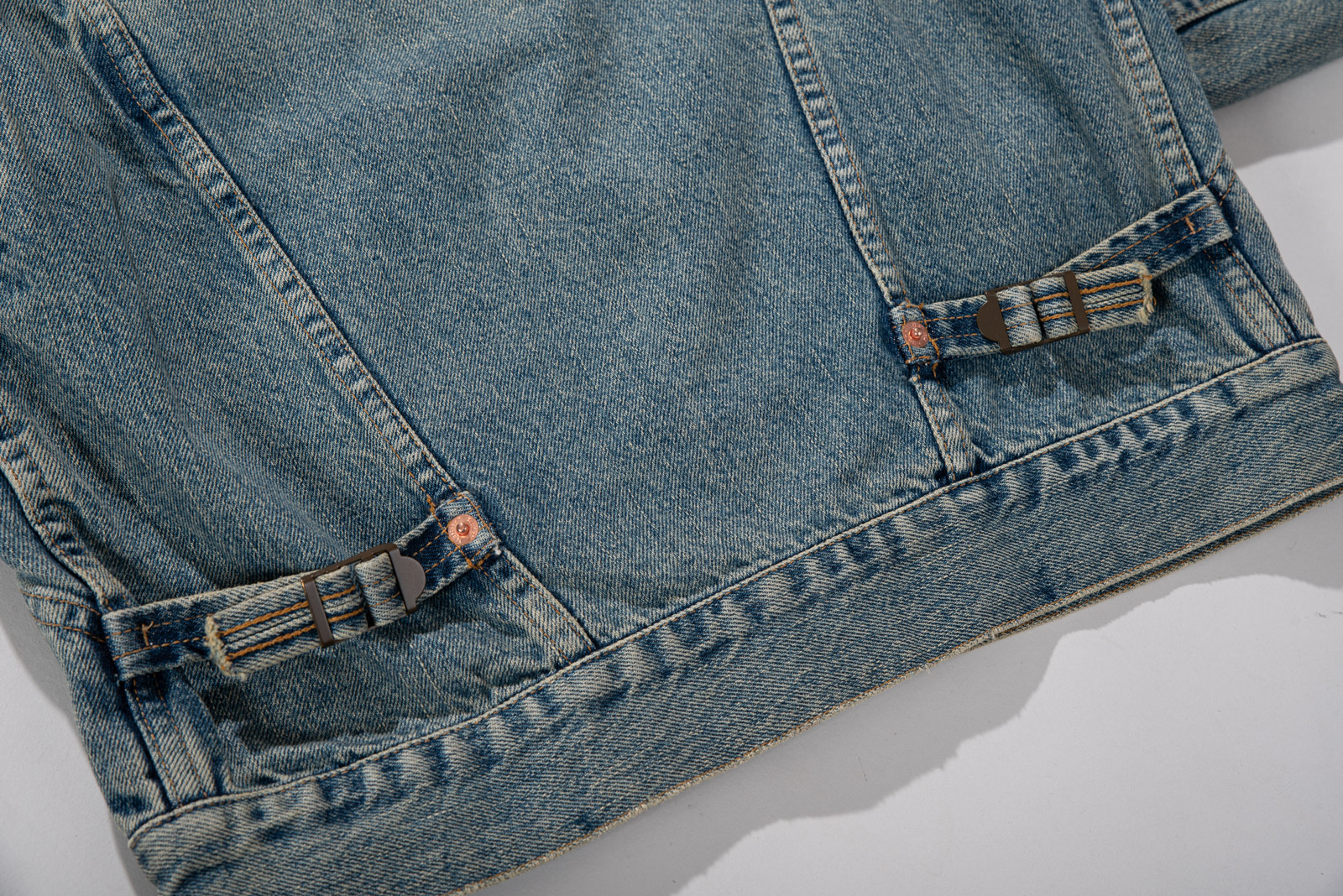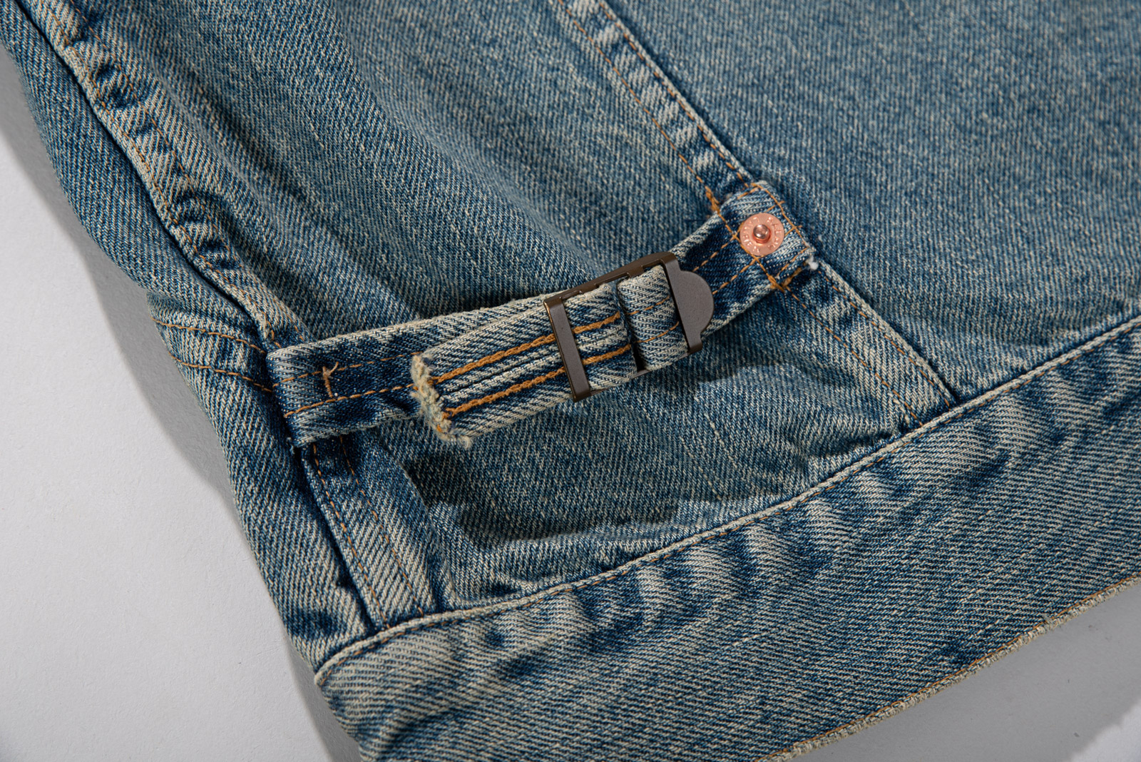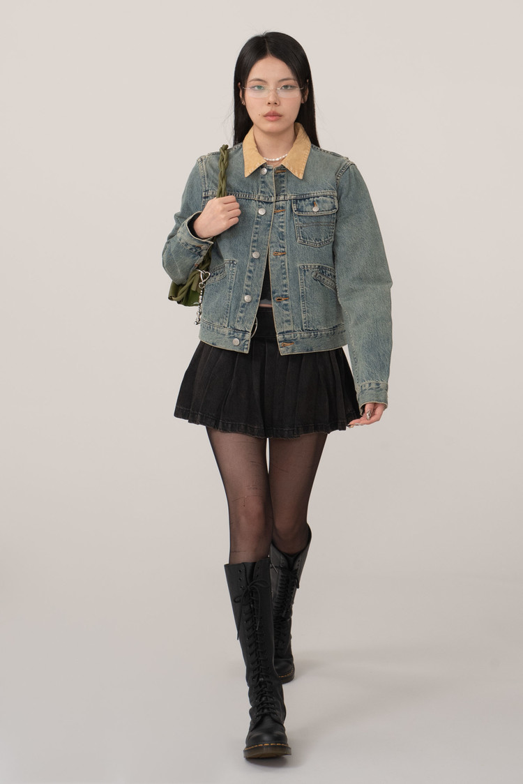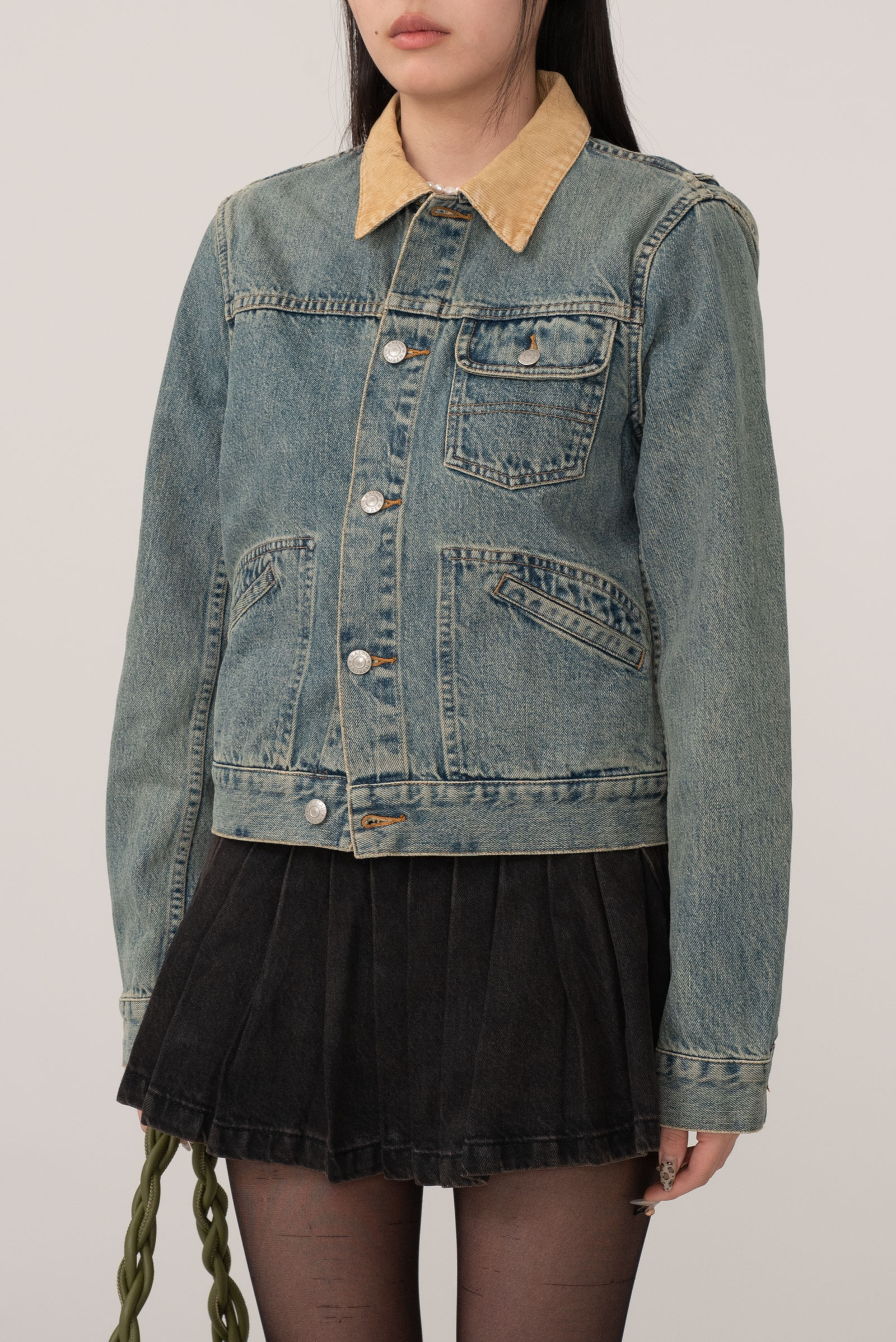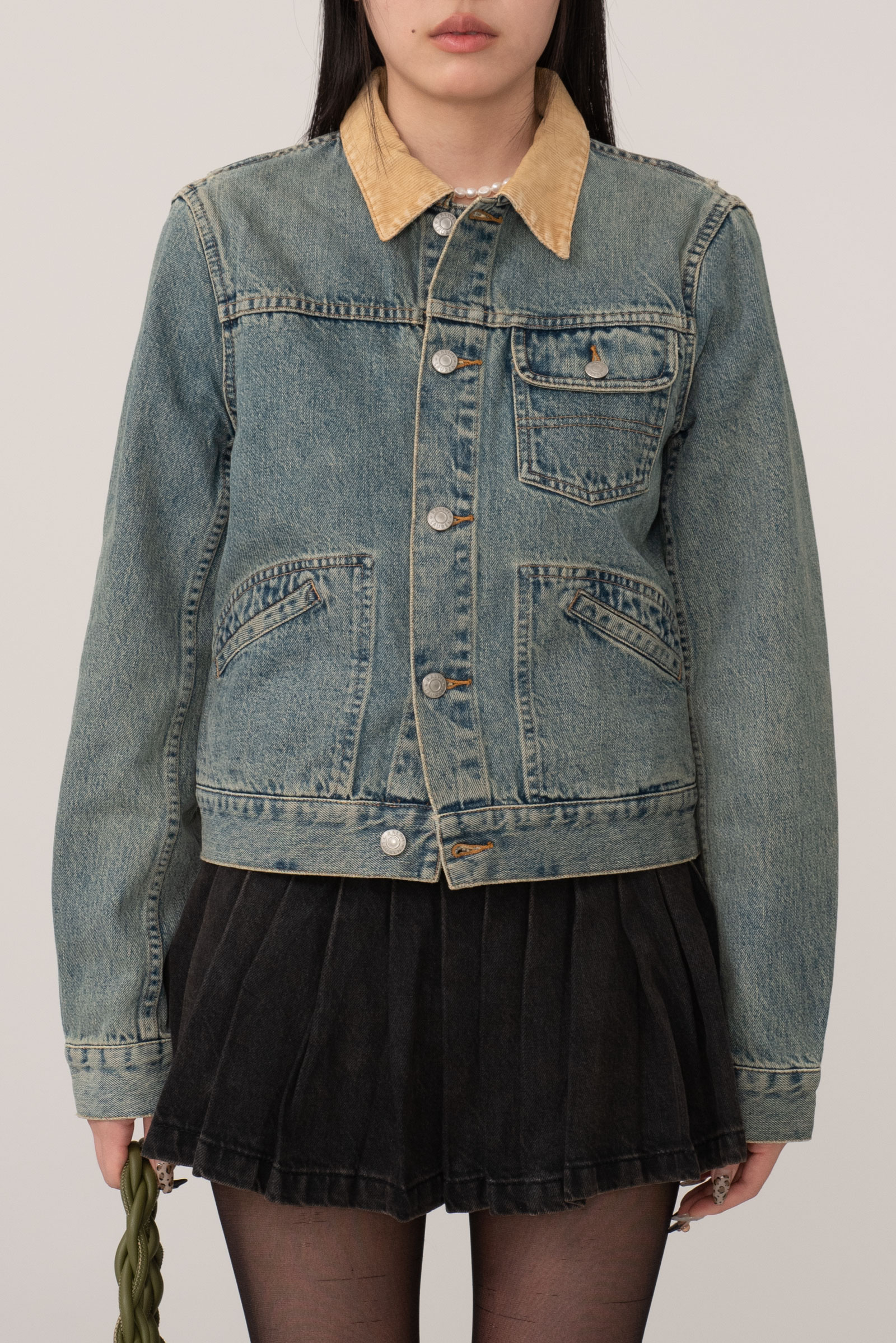 그을린 듯 에이징 된 컬러와 코듀로이 소재의 카라, 허리의 사이드 어저스트 등 재미있는 디테일이 눈에 띄며 1st 타입에 웨스턴 요소를 가미한 피스네요.